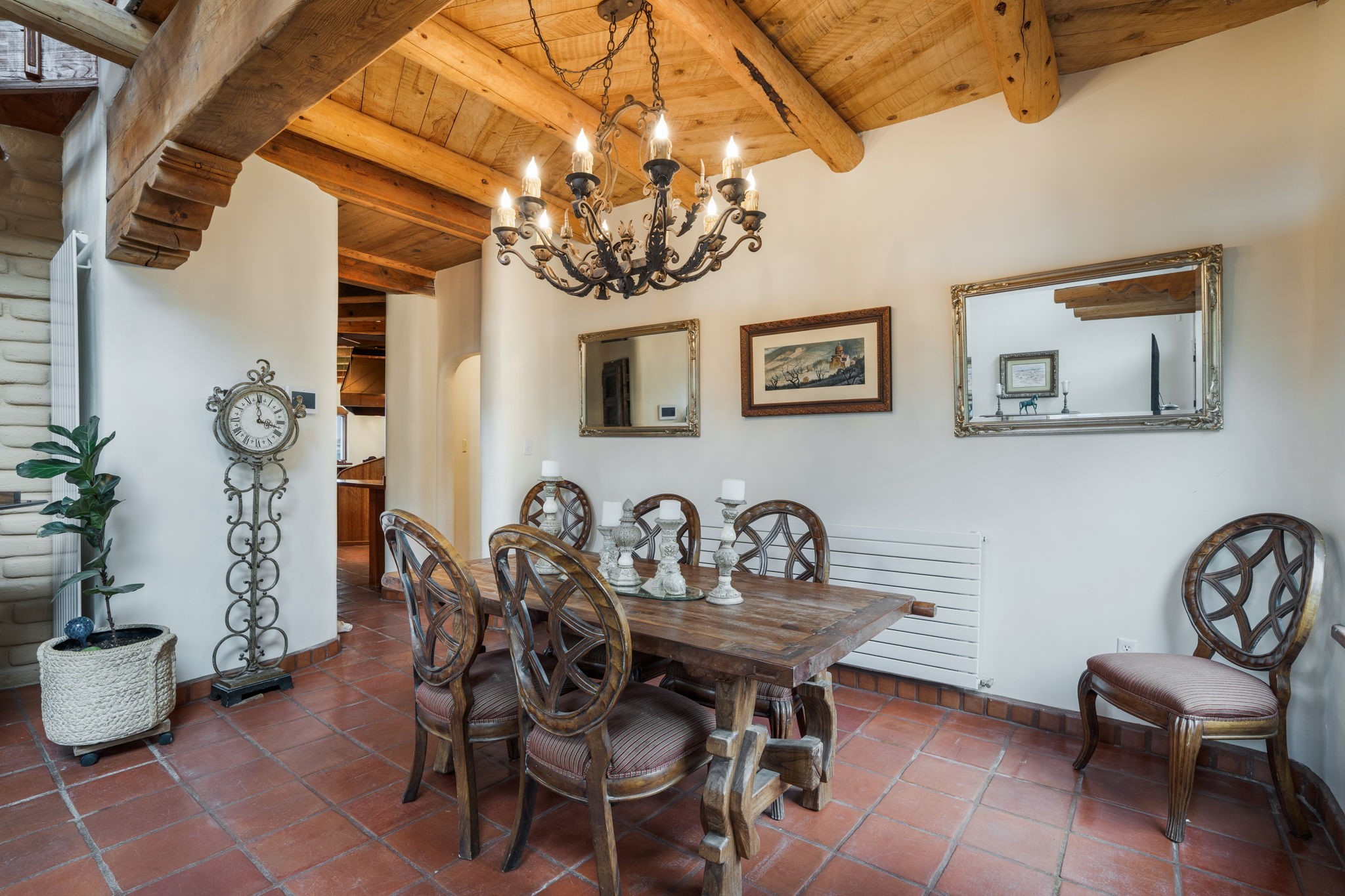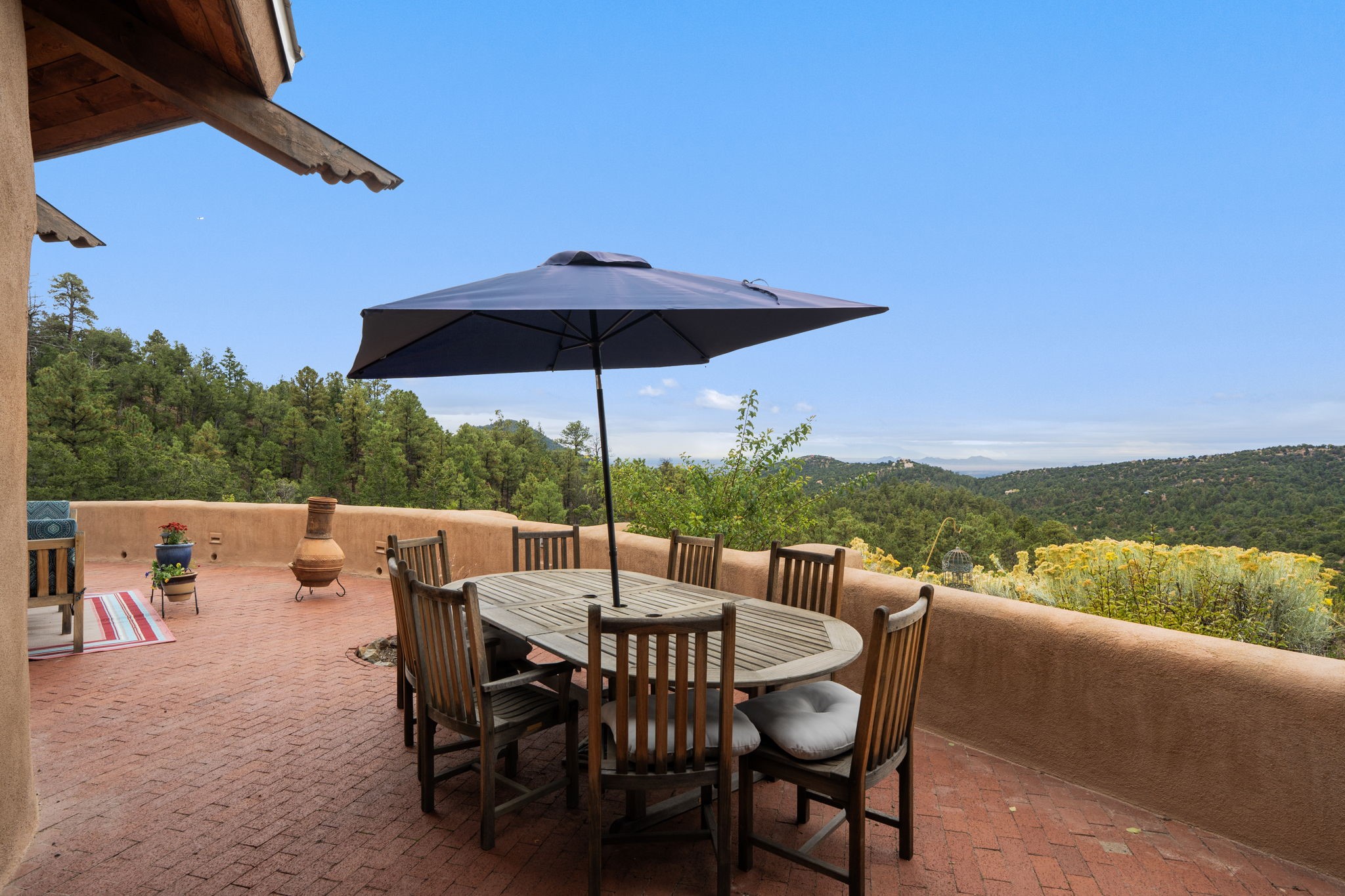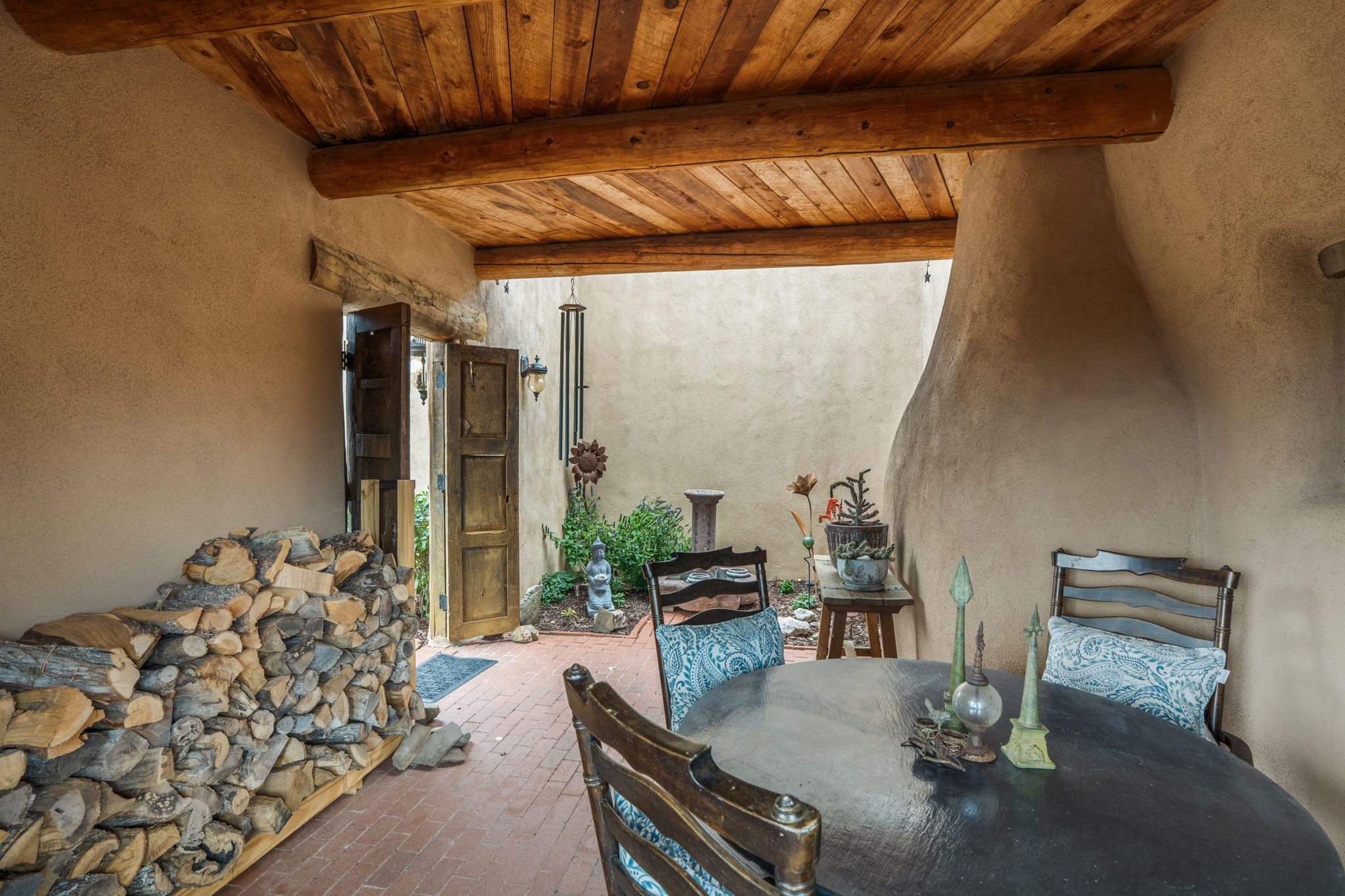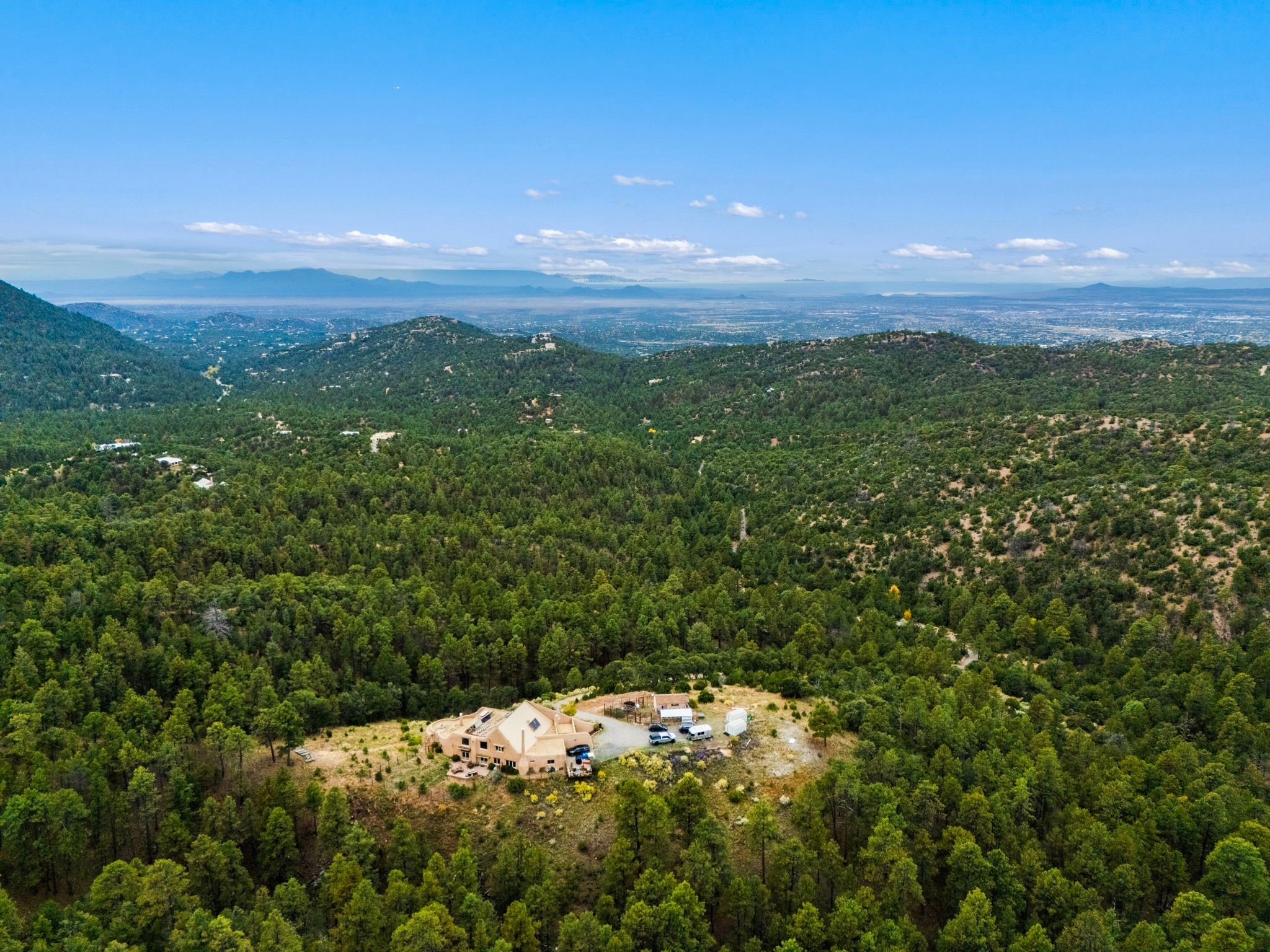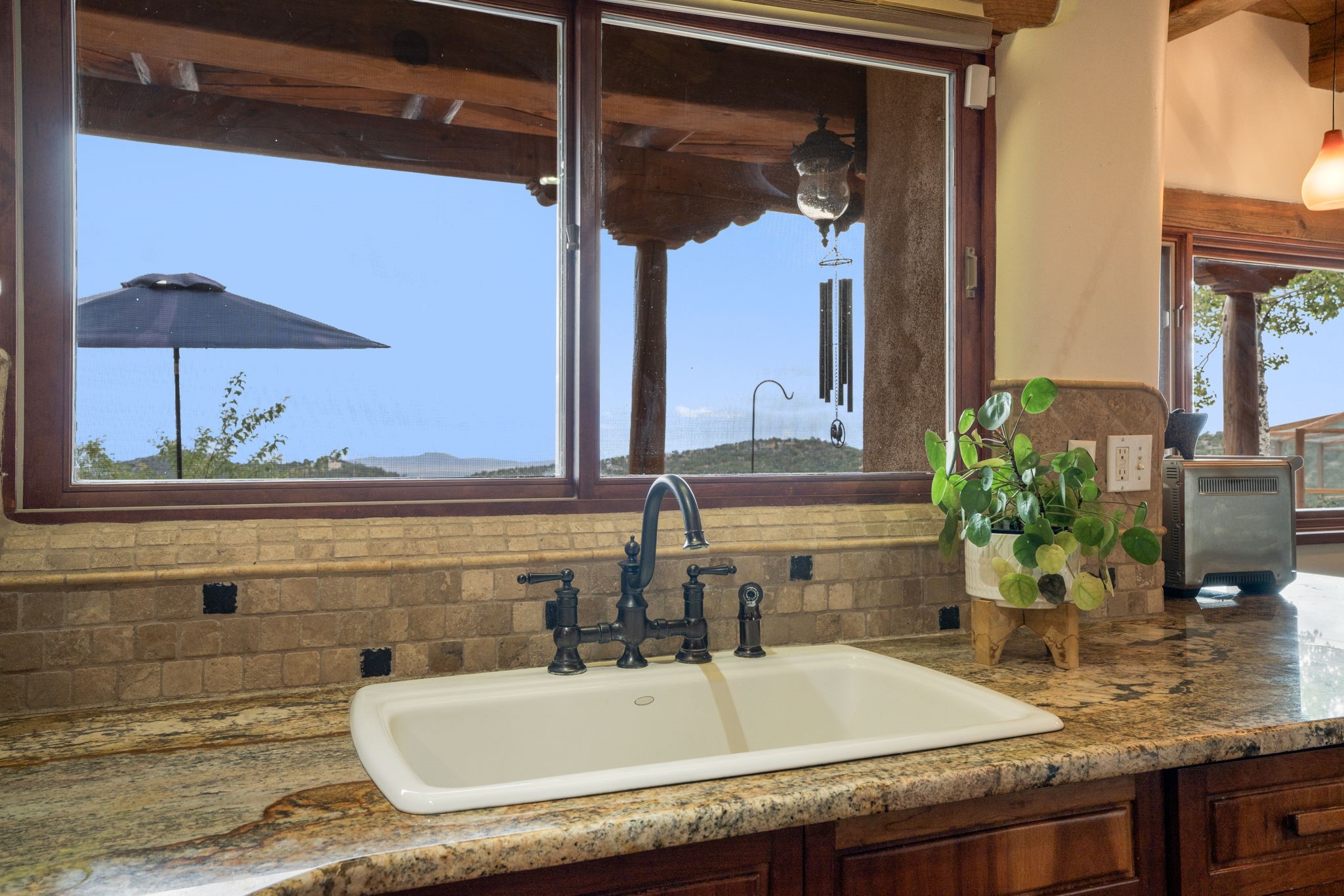 Nestled on 78 pristine acres spread across four deeded lots, this extraordinary estate blends seclusion, artistry, and timeless Southwestern charm--all just 25 minutes from downtown Santa Fe.The 4,400-square-foot adobe home is a masterpiece of craftsmanship and comfort. Solid adobe construction provides natural insulation, keeping interiors warm in winter and cool in summer. Inside, four ensuite bedrooms and 4.5 baths offer comfort and privacy, while 30 hand-carved doors and accents from Seret & Sons lend a one-of-a-kind artistic touch throughout.The great room is the heart of this residence--anchored by a dramatic stone fireplace, high viga ceilings, and a custom antler chandelier that radiates rustic elegance. French doors open to a spacious front portal, framing sweeping Sangre de Cristo Mountain views.A graceful curved staircase leads to the upper level, where two ensuite bedrooms and a balcony overlooking the great room create an inviting sense of openness and connection. The kitchen is both functional and charming, featuring granite counters, abundant cabinetry, and a cozy breakfast nook warmed by its own fireplace. Saltillo tile floors flow throughout the main level, while hardwood floors add warmth upstairs.The primary suite is a private retreat with panoramic views, a luxurious bath with jetted tub, tiled shower, and granite counters--a true spa experience at home.Step outside to a fenced backyard and patio, perfect for savoring dramatic weather shifts, peaceful wildlife, and star-filled nights. Additional features include solar hot water, four fireplaces, a two-car garage, two sheds, and a delightful chicken coop with eight hens providing fresh eggs daily.This property is more than a home--it's a work of art nestled in nature, offering tranquility, authenticity, and soul. Experience the best of Santa Fe living, where art, architecture, and landscape unite in harmony.