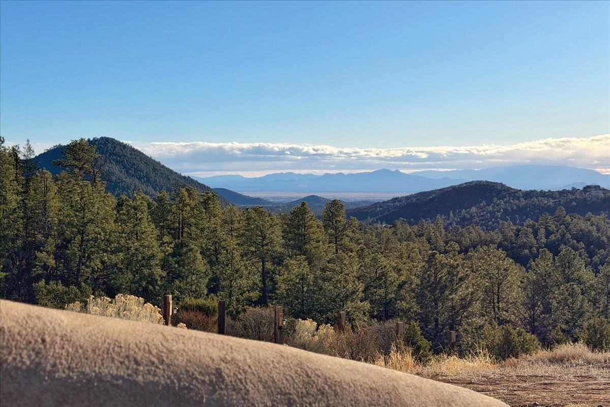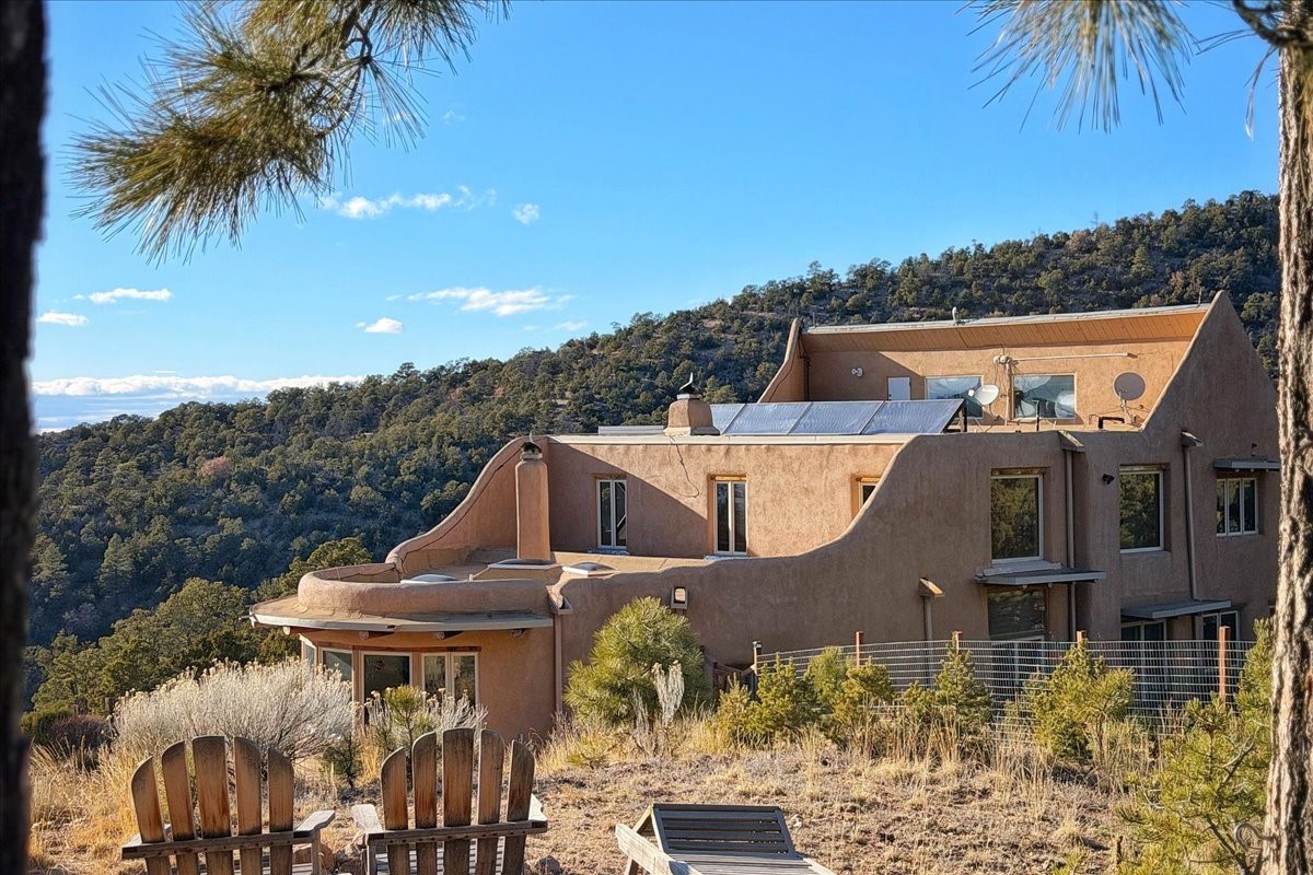 Nestled on 78 pristine private acres spread across four deeded lots, this extraordinary estate offers a blend of seclusion, artistry and timeless Southwestern charm just 25 minutes from downtown Santa Fe.The 4,400 square foot adobe home is a masterpiece of craftsmanship and comfort. Solid adobe construction provides natural insulation that keeps interiors warm in winter and cool in summer. Inside, four ensuite bedrooms and 4.5 baths offer comfort and privacy while 30 hand carved doors and accents from Seret and Sons lend a one of a kind artistic touch throughout the home.The great room is the heart of this residence anchored by a dramatic stone fireplace, high viga ceilings and a custom antler chandelier that adds rustic elegance. French doors open to a spacious front portal framing sweeping views of the Sangre de Cristo Mountains.A graceful circular staircase leads to the upper level where two ensuite bedrooms and a balcony overlooking the great room create an inviting sense of openness and connection. The kitchen is both functional and charming with granite counters, abundant cabinetry and a cozy breakfast nook warmed by its own fireplace. Saltillo tile floors flow throughout the main level while hardwood floors add warmth upstairs.The primary suite is a private retreat with panoramic mountain views and a luxurious bath with a jetted tub, tiled shower and granite counters.Step outside to a fenced backyard and patio perfect for watching the weather in the distance, peaceful wildlife and star filled nights. Additional features include solar hot water, four fireplaces, a two car garage, two sheds and a chicken coop with eight hens that provide fresh eggs daily.This property is more than a home. It is a work of art set deep in nature offering tranquility, authenticity and soul. Experience a place where art, architecture and landscape come together in harmony.