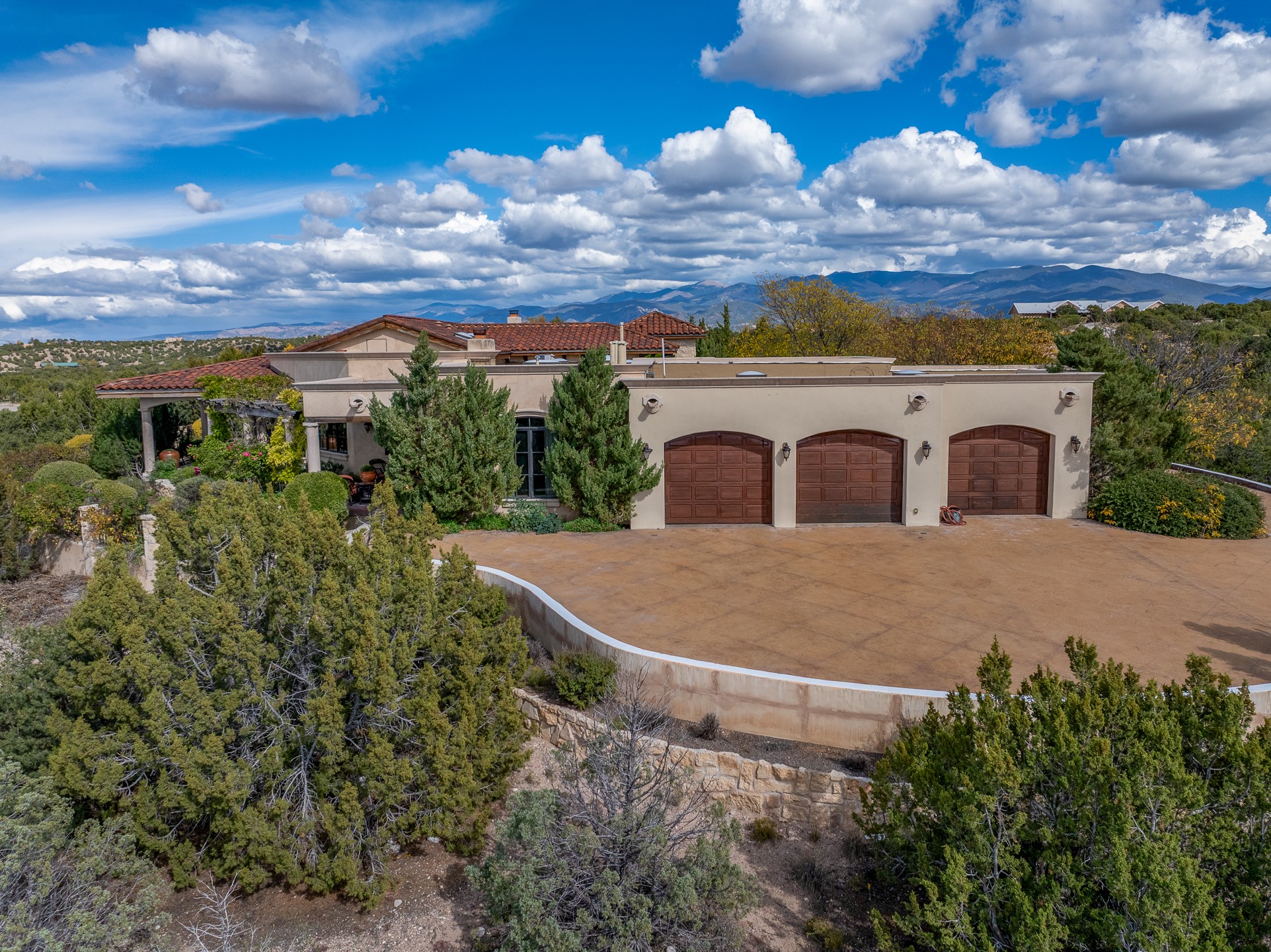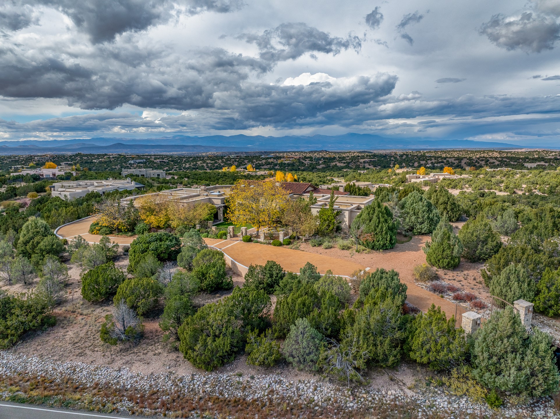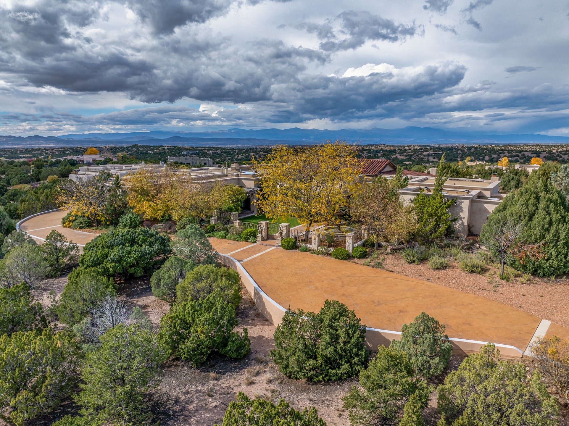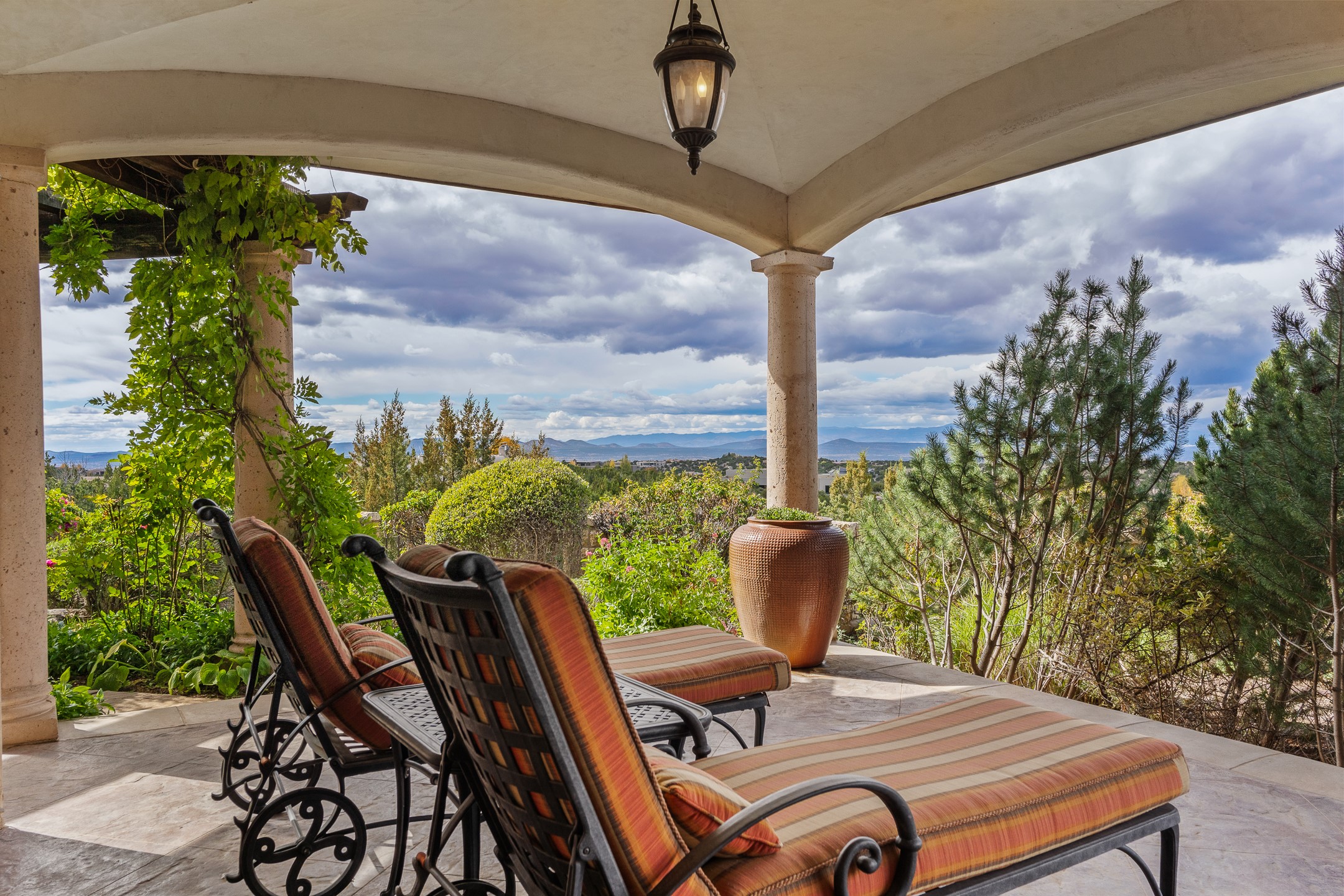 For those drawn to the romance of Italy, this extraordinary residence captures the essence of a Tuscan villa translated beautifully into the high desert landscape of Santa Fe. Nestled on 2.5 acres in the coveted Sundance Estates, this home with 4 bedrooms plus an office, 4.5 baths, and a 3-car garage offers 5,013 square feet of refined living, crafted with exquisite detail and timeless materials. Beyond stately wrought-iron gates, cupid sculptures and a stamped and colored concrete drive lead to a grand arrival with limestone walls, a graceful fountain, and hand-hewn double doors. Inside, rich walnut and travertine floors create a harmonious blend of warmth and sophistication. Diamond plaster walls, coved plaster ceilings, and rustic wood trestle beams evoke the artistry of old-world Europe, while expansive windows and French doors frame breathtaking mountain and sunset vistas. The chef's kitchen is a showpiece--adorned with alder cabinetry, granite countertops, a Wolf range, a Subzero refrigerator, a built-in Miele coffee center, and a wine cooler. Here you'll be romanced by a generous island, casual dining area, and adjoining family room with a fireplace, creating an inviting central gathering space. The kitchen and living room open to a deep covered portal designed for alfresco entertaining, featuring an outdoor kitchen, limestone fireplace, and rose garden.The east wing hosts the elegant primary suite with its own fireplace, private portal, and in-ground spa with a waterfall. The spa-like bath offers dual vanities, a soaking tub, and a large walk-in shower, while the custom closet provides both beauty and functionality. On the west side of the home, you will find 2 guest suites providing separation and privacy. There is also a handsome study with a built-in desk and shelves, and a view to the front garden and fountain. Additionally, there is a private casita with its own entrance, kitchenette, and ensuite bath offers comfort and independence for guests.
