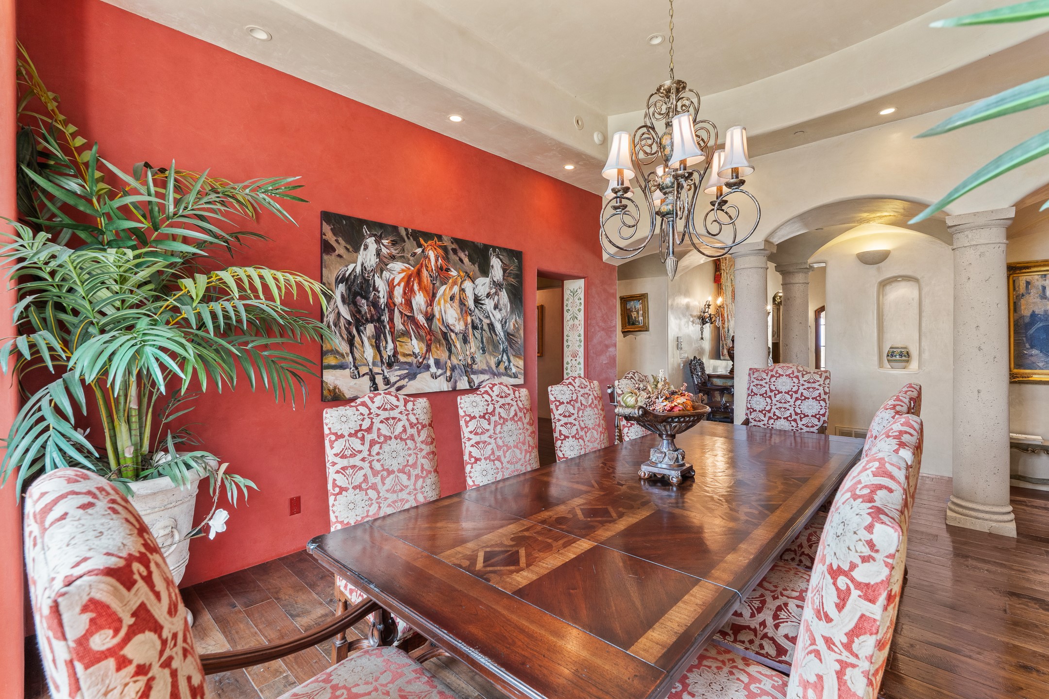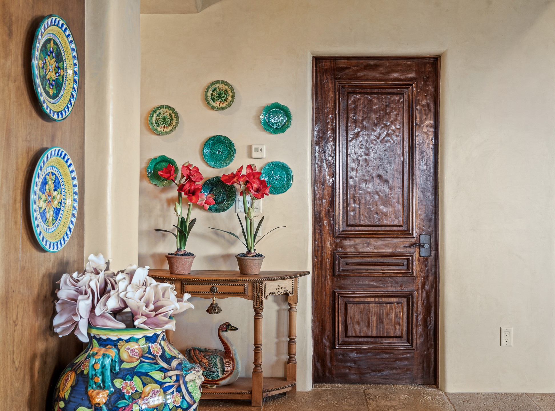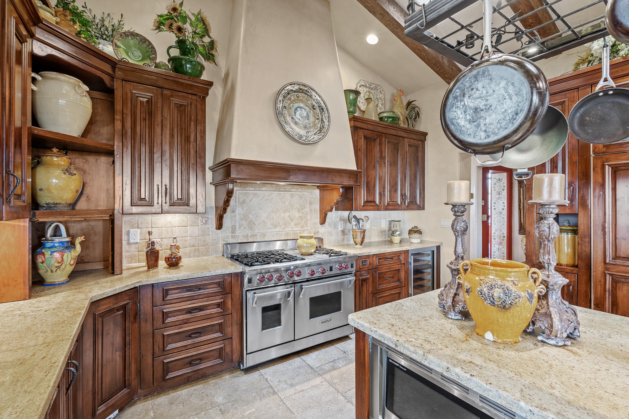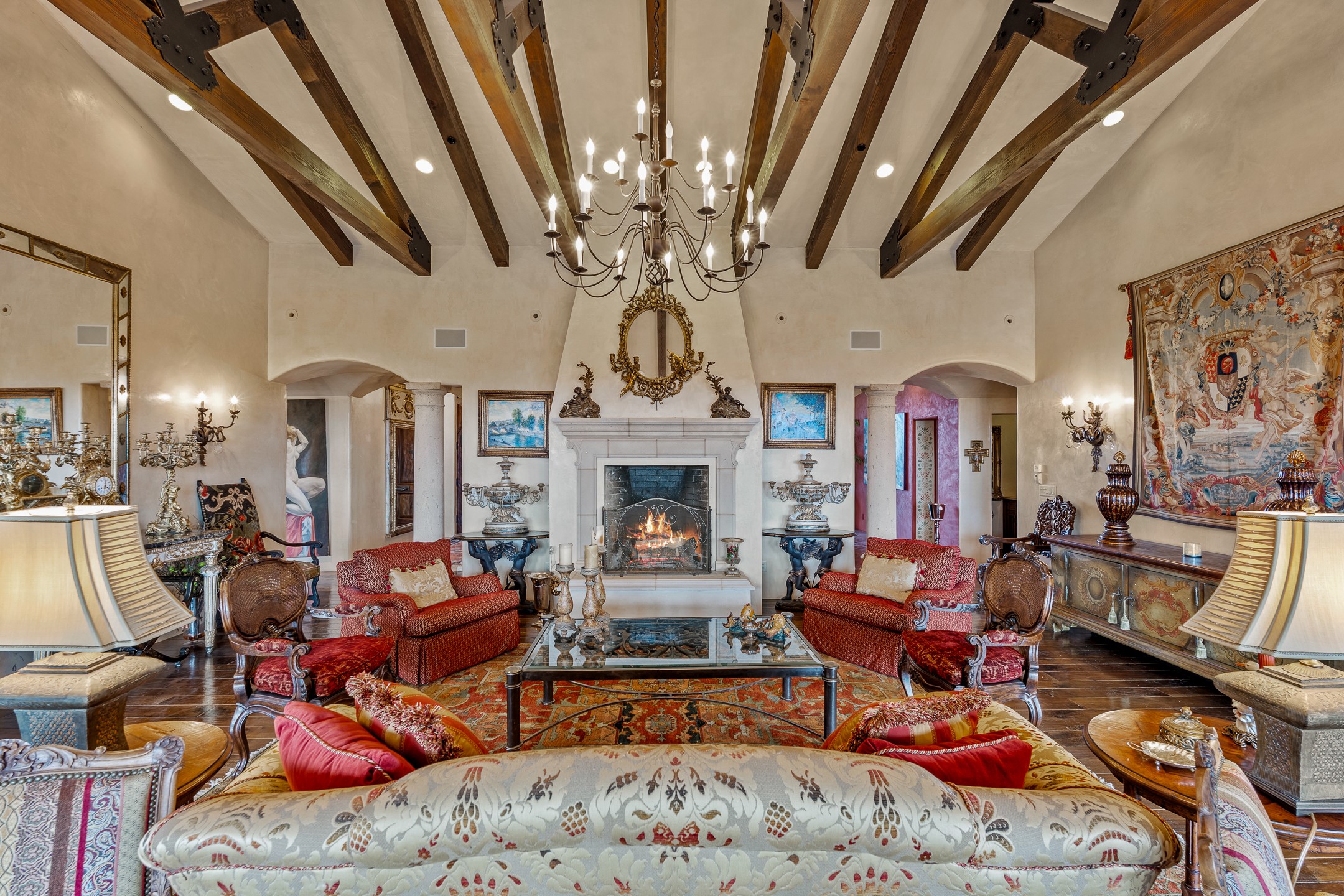 For those drawn to the romance of Italy, this extraordinary residence captures the essence of a Tuscan villa translated beautifully into the high desert landscape of Santa Fe. Nestled on 2.5 acres in the coveted Sundance Estates, this home with 4 bedrooms plus an office, 4.5 baths, and a 3-car garage offers 5,013 square feet of refined living, crafted with exquisite detail and timeless materials. Beyond stately wrought-iron gates, cupid sculptures and a stamped and colored concrete drive lead to a grand arrival with limestone walls, a graceful fountain, and hand-hewn double doors. Inside, rich walnut and travertine floors create a harmonious blend of warmth and sophistication. Diamond plaster walls, coved plaster ceilings, and rustic wood trestle beams evoke the artistry of old-world Europe, while expansive windows and French doors frame breathtaking mountain and sunset vistas. The chef's kitchen is a showpiece--adorned with alder cabinetry, granite countertops, a Wolf range, a Subzero refrigerator, a built-in Miele coffee center, and a wine cooler. Here you'll be romanced by a generous island, casual dining area, and adjoining family room with a fireplace, creating an inviting central gathering space. The kitchen and living room open to a deep covered portal designed for alfresco entertaining, featuring an outdoor kitchen, limestone fireplace, and rose garden.The east wing hosts the elegant primary suite with its own fireplace, private portal, and in-ground spa with a waterfall. The spa-like bath offers dual vanities, a soaking tub, and a large walk-in shower, while the custom closet provides both beauty and functionality. On the west side of the home, you will find 2 guest suites providing separation and privacy. There is also a handsome study with a built-in desk and shelves, and a view to the front garden and fountain. Additionally, there is a private casita with its own entrance, kitchenette, and ensuite bath offers comfort and independence for guests.