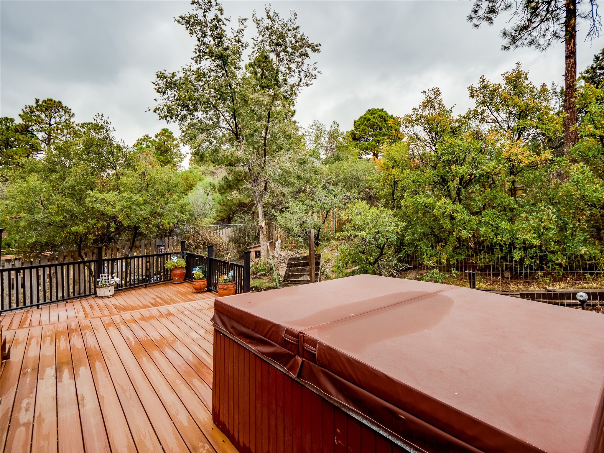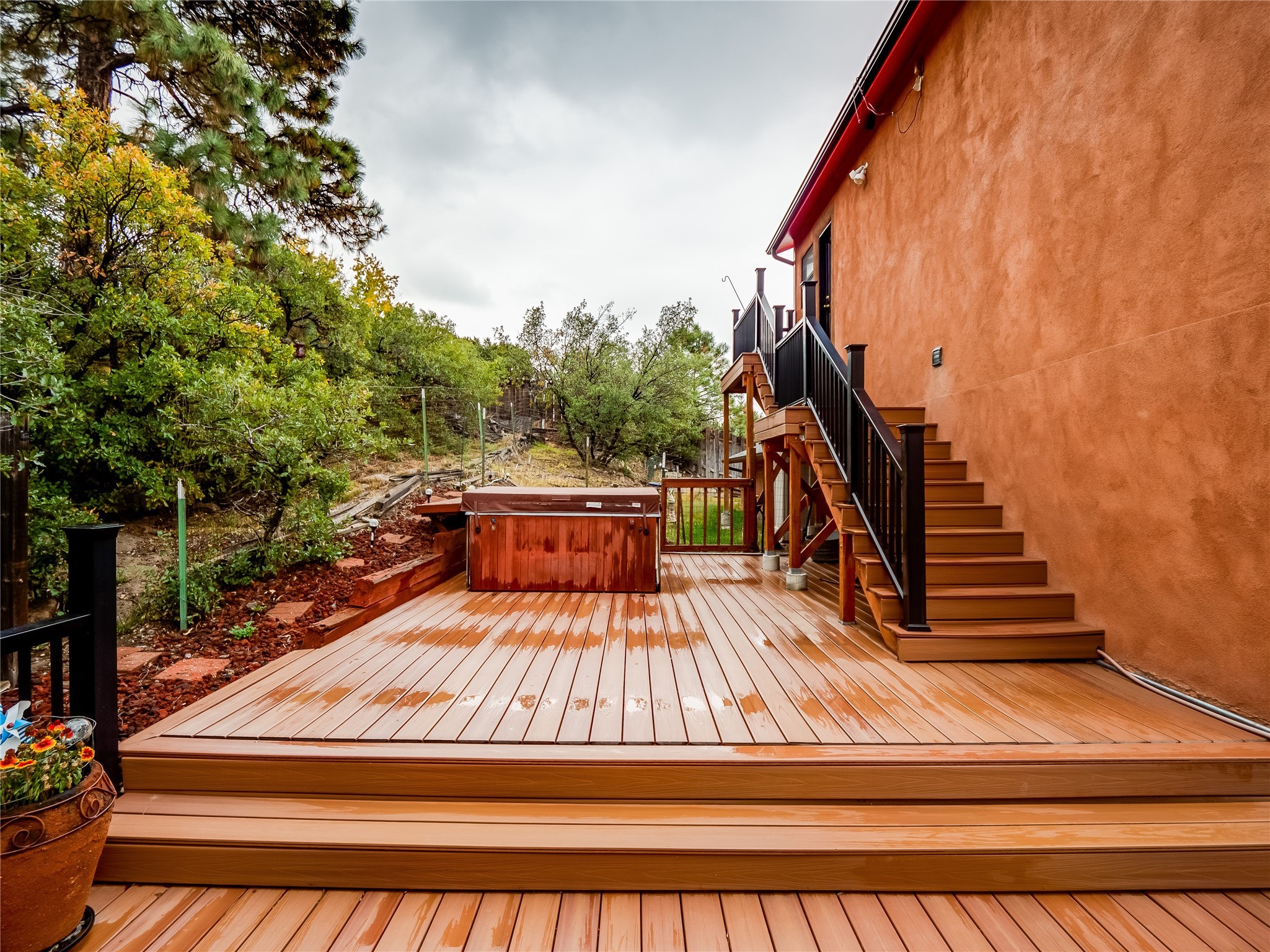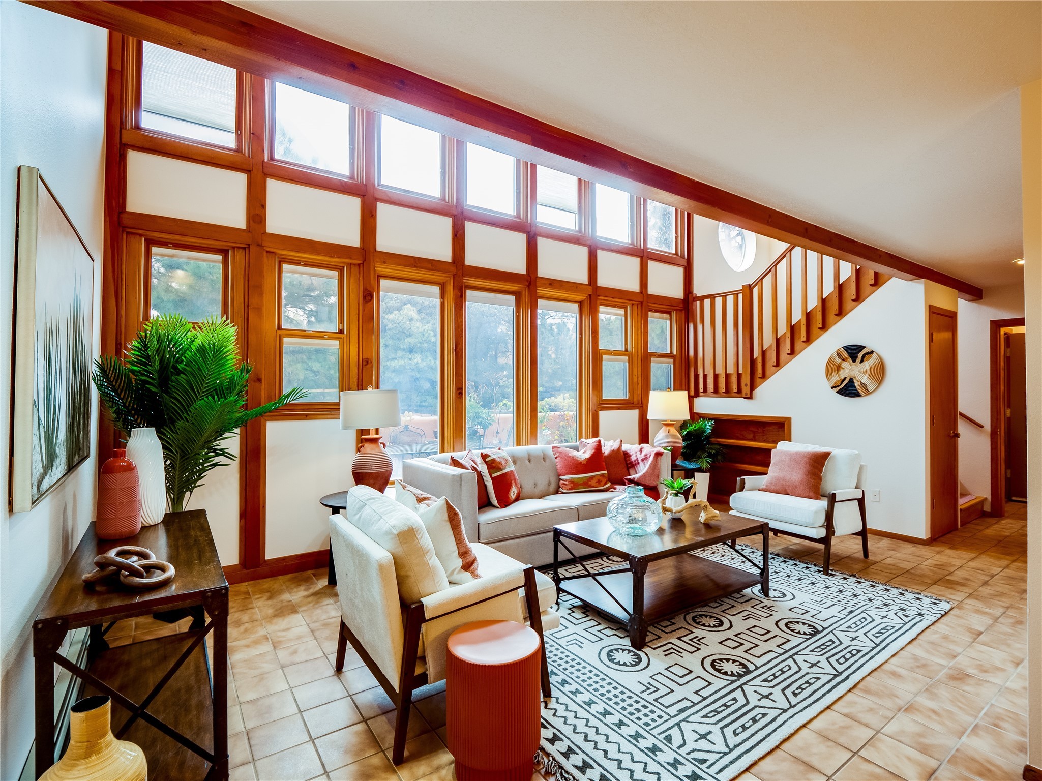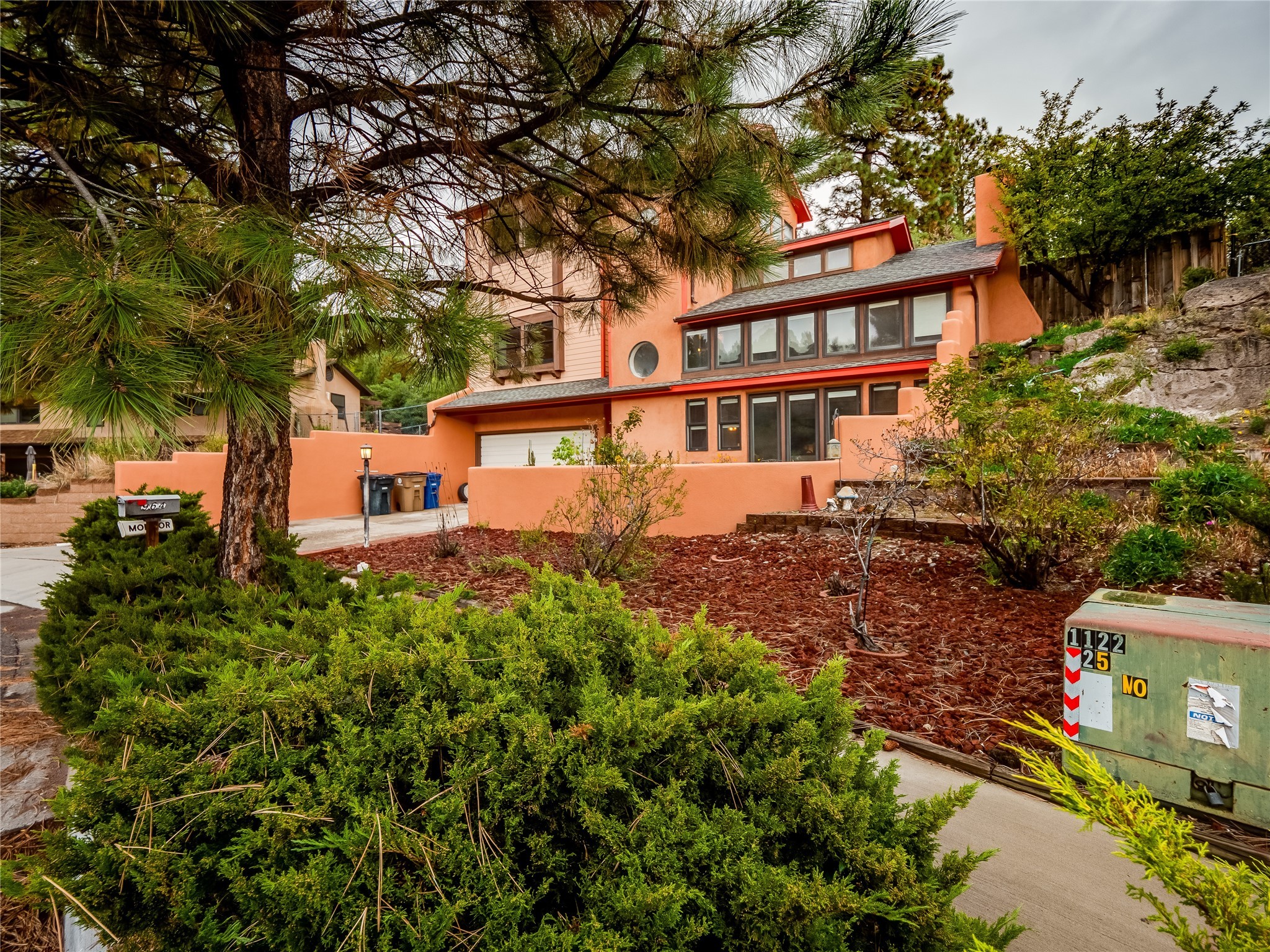 Tucked away in a peaceful North Mesa neighborhood, this one-of-a-kind multi-level home offers a perfect blend of character, functionality, and inviting outdoor living spaces. The large front yard leading to a stone patio--a great spot to work on your green thumb. Enter into the front entrance with tile flooring that leads into the main living area. The bright and open living room features soaring vaulted ceilings and a wall of floor-to-ceiling windows that fill the space with natural light. A cozy wood-burning stove sits perfectly between the living and dining areas, creating a warm and inviting atmosphere. The kitchen is both stylish and practical, featuring a peninsula bar, rich wood cabinetry, stainless steel appliances, and abundant built-in cabinets and pantry storage. Also on this floor is a powder room and access to the two-car garage. Upstairs, the second floor showcases beautiful wood flooring throughout. Two comfortable guest bedrooms share a full bathroom with tile flooring and a tiled shower/tub surround. Also on this level is a spacious guest en-suite with access to the back deck that includes its own bathroom with a walk-in tiled shower with glass doors, a long single sink vanity. A laundry closet is conveniently located inside the suite for added ease. The third floor offers flexible living with an additional guest bedroom that makes a perfect office or studio space and includes direct access to the backyard deck. The spacious primary suite feels like a private retreat, complete with a wood-burning stove, treetop views, and two closets--one being a generous walk-in. The en-suite bathroom features tile throughout, a double sink vanity, and a luxurious walk-in double-headed tiled shower. Entertainers backyard with a multi-tiered composite deck surrounded by mature trees and shrubs for privacy. Enjoy relaxing evenings in the included hot tub or host gatherings under the stars in this serene outdoor setting. Experience this truly unique home for yourself!