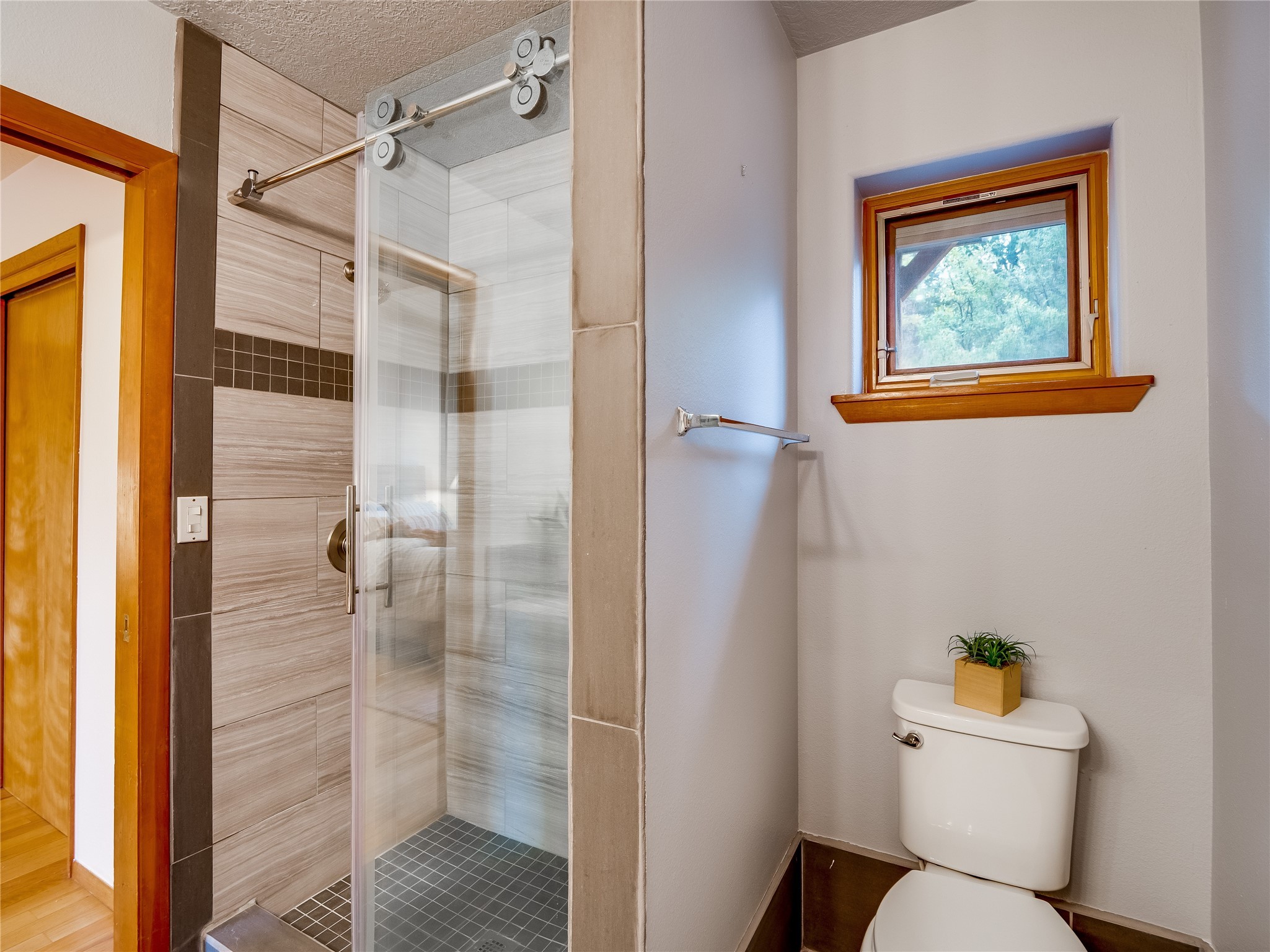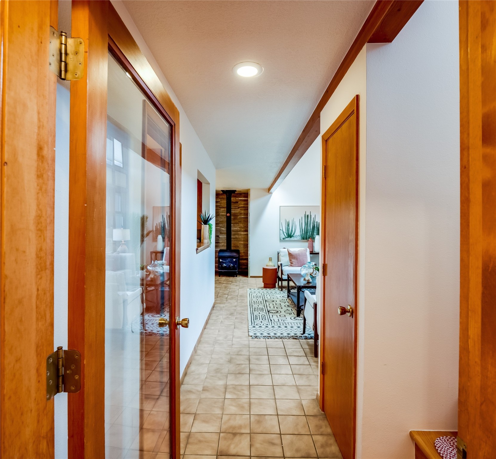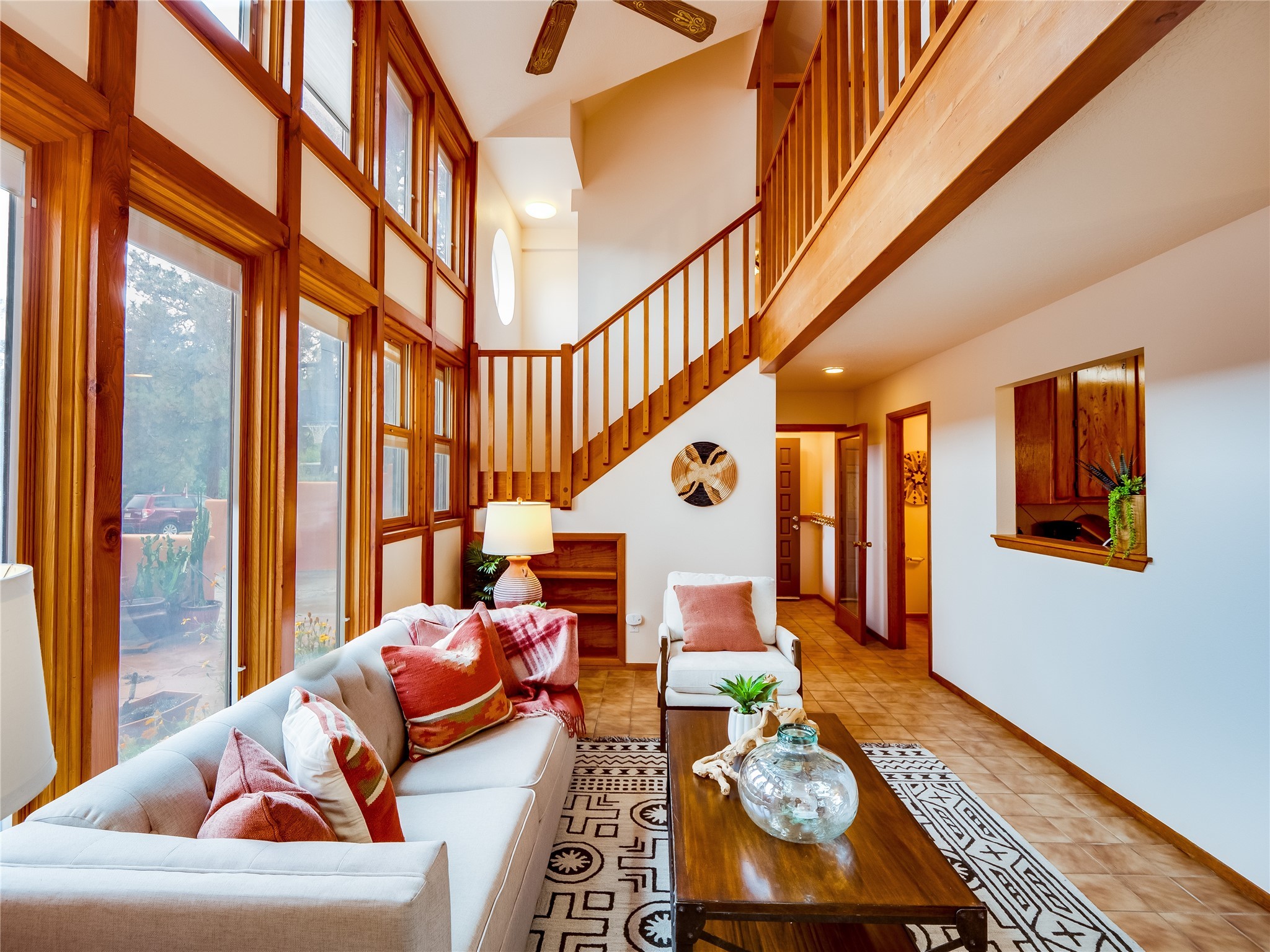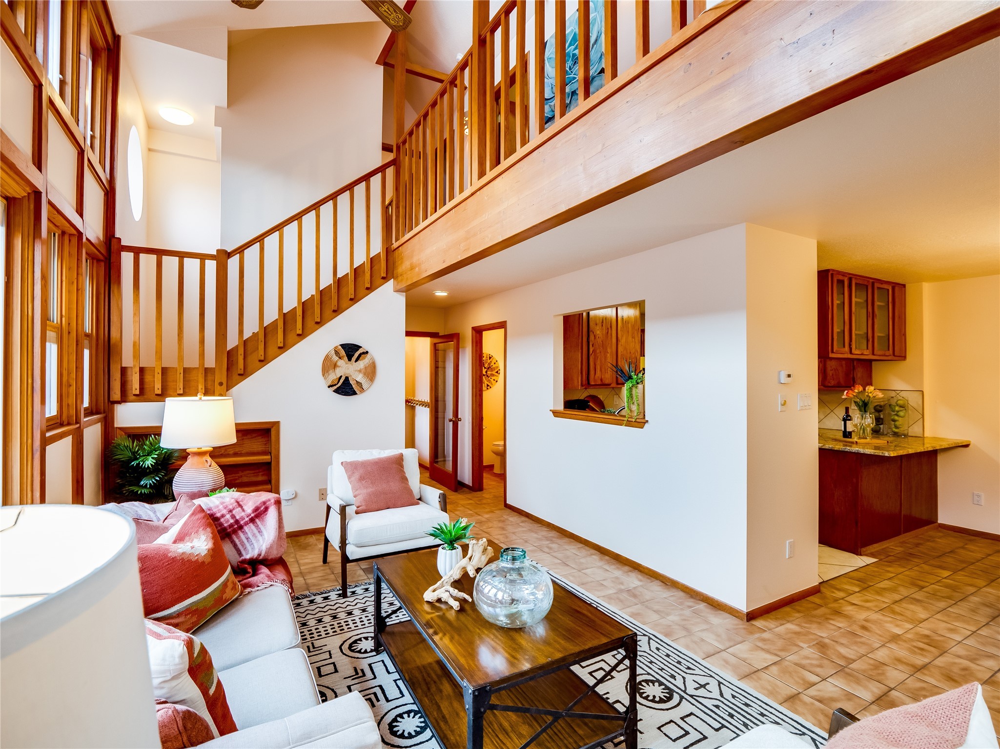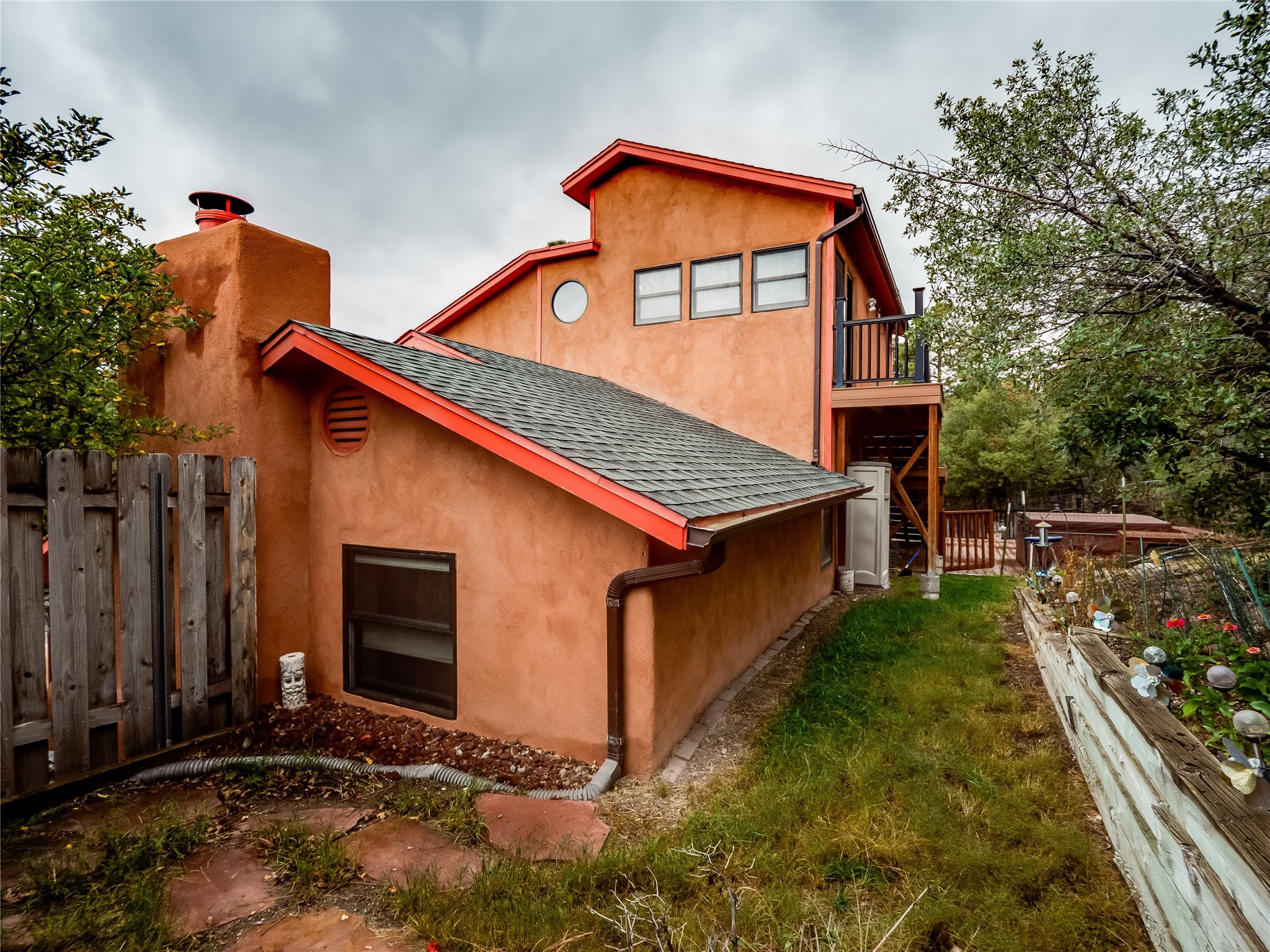 Tucked away in a peaceful North Mesa neighborhood, this one-of-a-kind multi-level home offers a perfect blend of character, functionality, and inviting outdoor living spaces. The large front yard leading to a stone patio--a great spot to work on your green thumb. Enter into the front entrance with tile flooring that leads into the main living area. The bright and open living room features soaring vaulted ceilings and a wall of floor-to-ceiling windows that fill the space with natural light. A cozy wood-burning stove sits perfectly between the living and dining areas, creating a warm and inviting atmosphere. The kitchen is both stylish and practical, featuring a peninsula bar, rich wood cabinetry, stainless steel appliances, and abundant built-in cabinets and pantry storage. Also on this floor is a powder room and access to the two-car garage. Upstairs, the second floor showcases beautiful wood flooring throughout. Two comfortable guest bedrooms share a full bathroom with tile flooring and a tiled shower/tub surround. Also on this level is a spacious guest en-suite with access to the back deck that includes its own bathroom with a walk-in tiled shower with glass doors, a long single sink vanity. A laundry closet is conveniently located inside the suite for added ease. The third floor offers flexible living with an additional guest bedroom that makes a perfect office or studio space and includes direct access to the backyard deck. The spacious primary suite feels like a private retreat, complete with a wood-burning stove, treetop views, and two closets--one being a generous walk-in. The en-suite bathroom features tile throughout, a double sink vanity, and a luxurious walk-in double-headed tiled shower. Entertainers backyard with a multi-tiered composite deck surrounded by mature trees and shrubs for privacy. Enjoy relaxing evenings in the included hot tub or host gatherings under the stars in this serene outdoor setting. Experience this truly unique home for yourself!