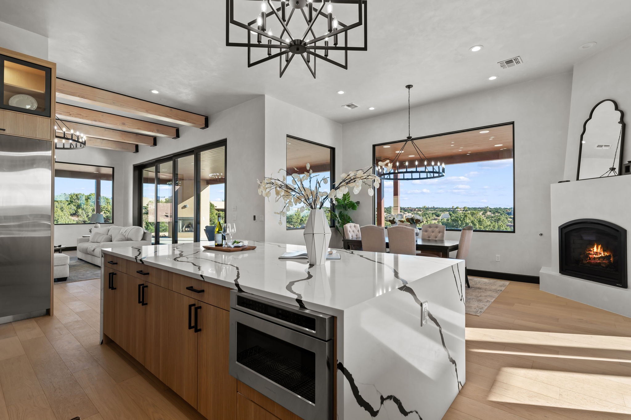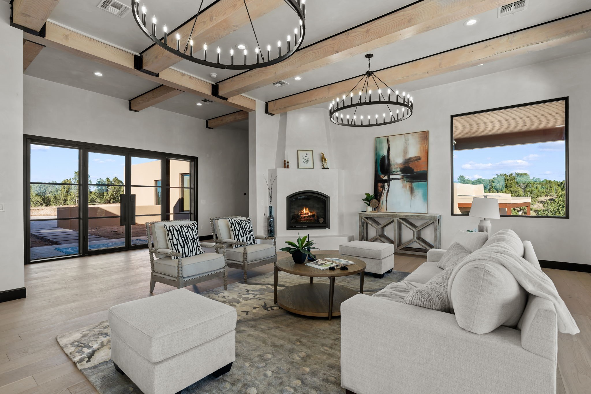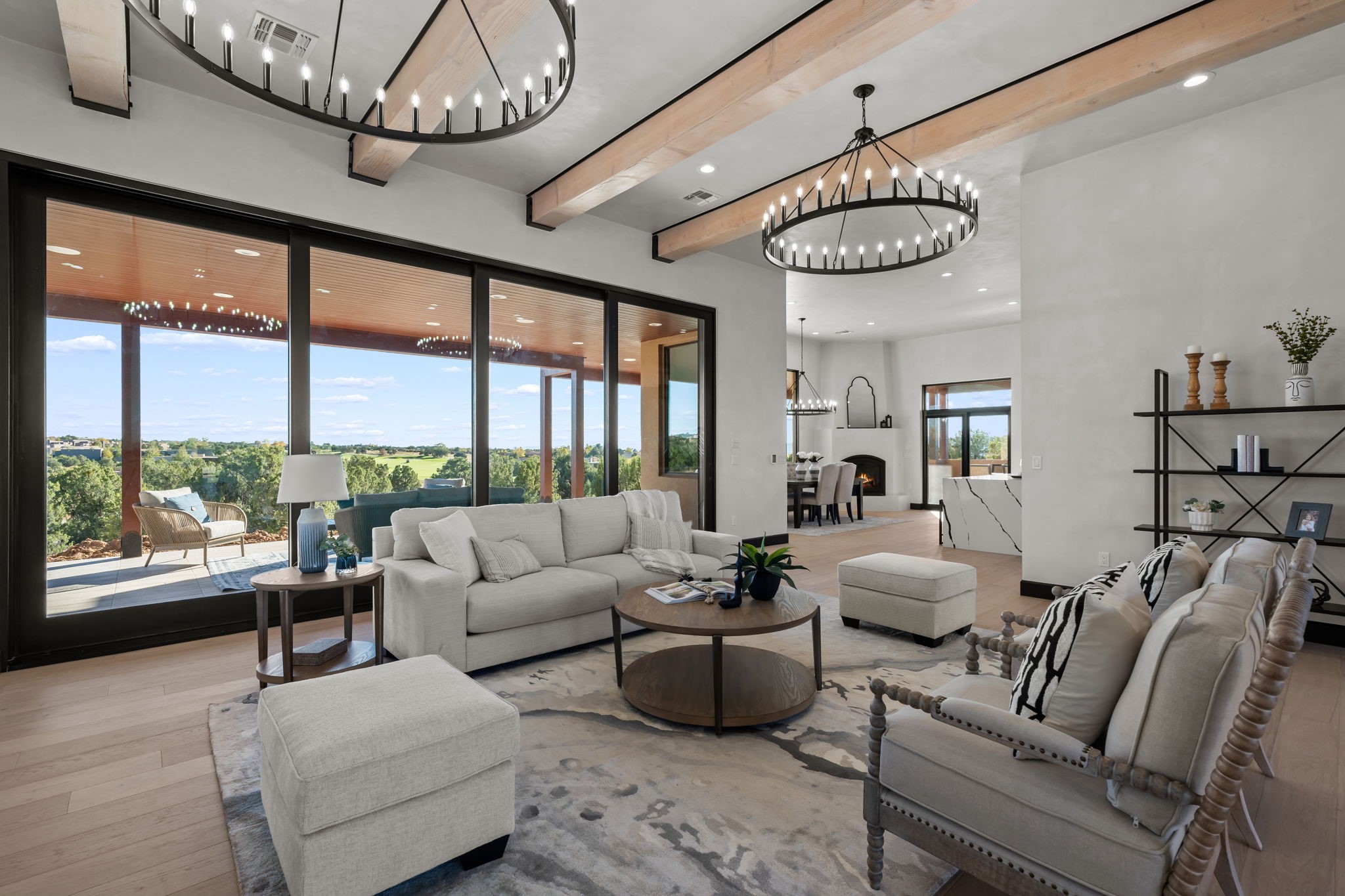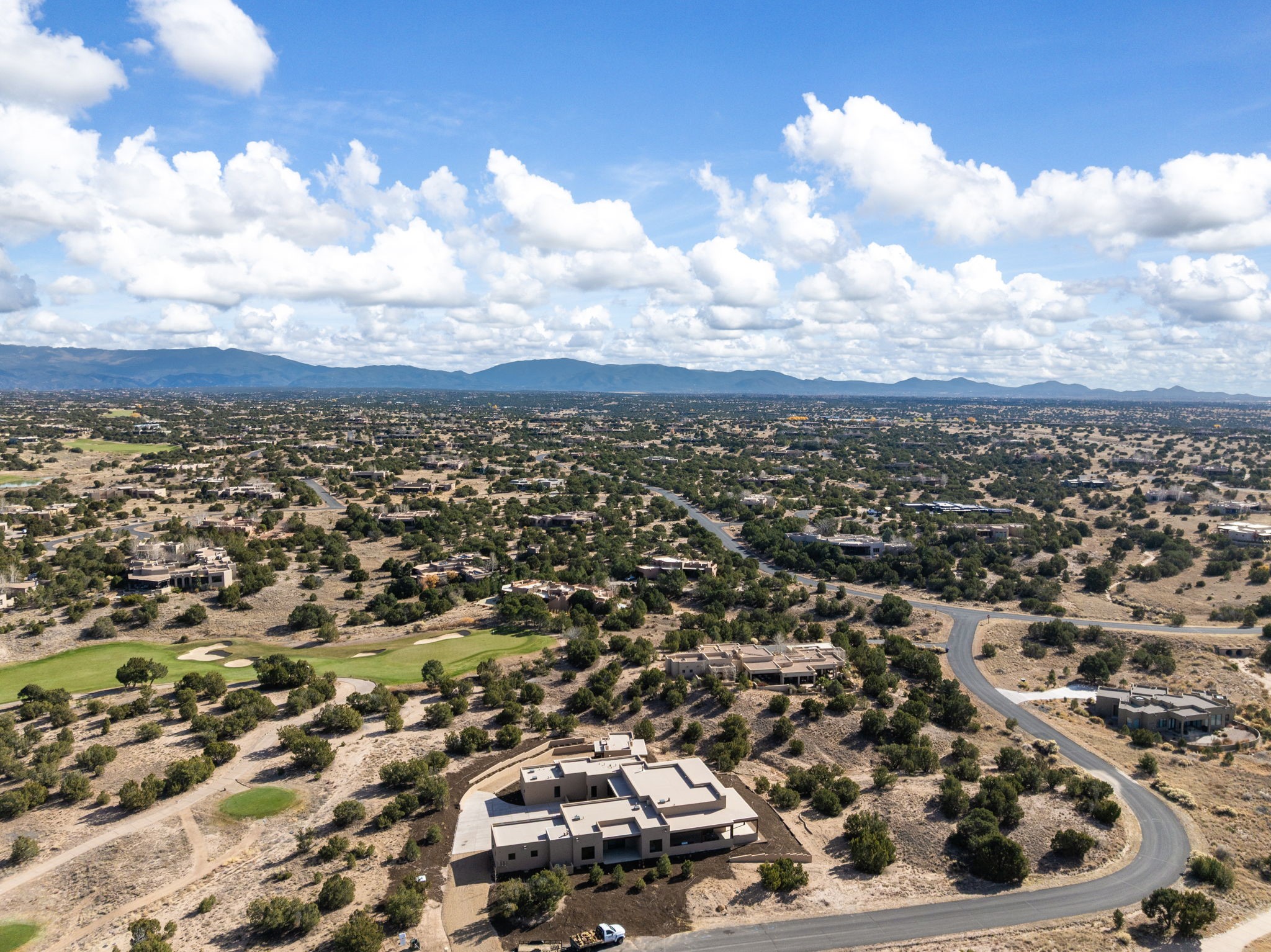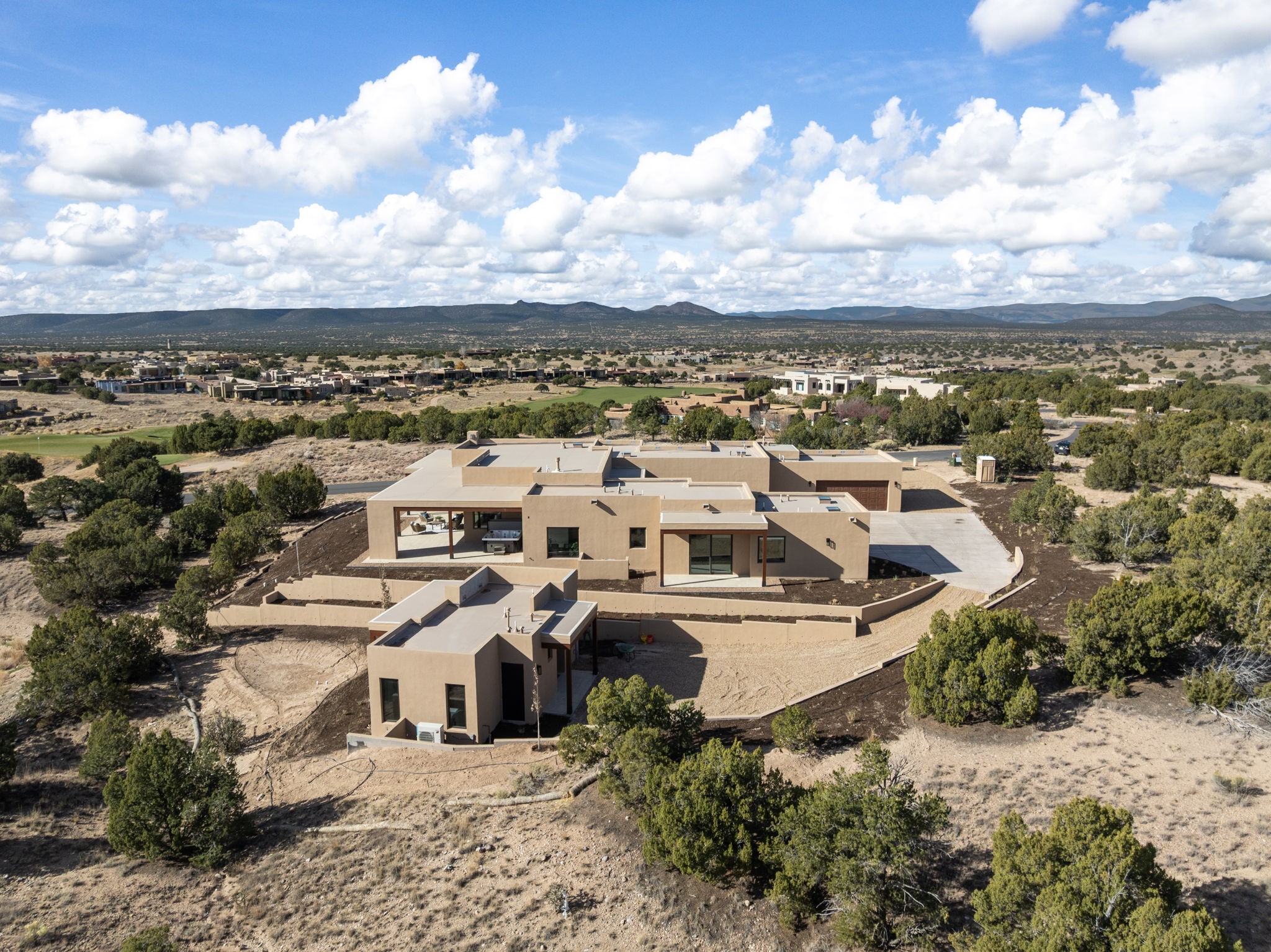 Nestled in the prestigious Las Campanas community of Santa Fe, this newly built custom estate blends modern architecture with timeless New Mexican charm. Situated on a 1.64-acre homesite overlooking two picturesque golf holes, the home captures breathtaking views of both the fairways and surrounding mountains.Built by Candelaria Homes, one of New Mexico's most respected luxury builders, this residence reflects exceptional craftsmanship and attention to detail in every corner--from its open floor plan to its refined finishes.Designed for comfort and sophistication, the single-story layout features heated floors throughout the main living and family areas, creating warmth and luxury in every season. A beautifully designed detached one-bedroom Casita offers the perfect retreat for guests, extended family, or a private studio.The gourmet kitchen impresses with bold dark finishes, high-end Sub-Zero appliances, a spacious center island, and a large butler's pantry, seamlessly combining style and function.A versatile bonus living area provides flexibility as a children's playroom, home library, or secondary living space. Expansive picture windows fill the home with natural light, framing Santa Fe's stunning landscape and creating a seamless indoor-outdoor connection.With its open-concept great room, spacious patios, and sweeping golf course and mountain views, this Las Campanas masterpiece defines elevated desert living. Golf course views are of holes 14 and 15.