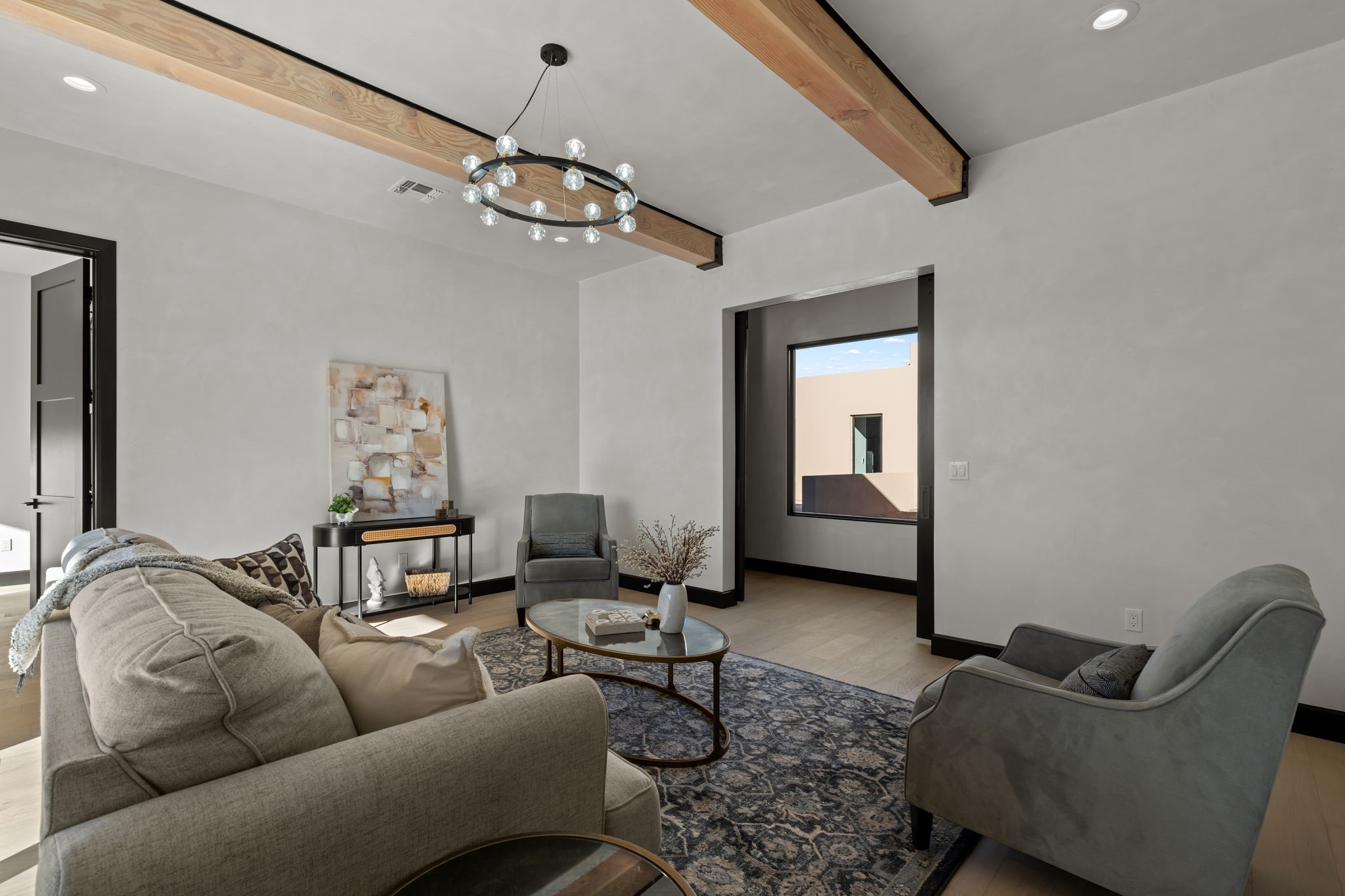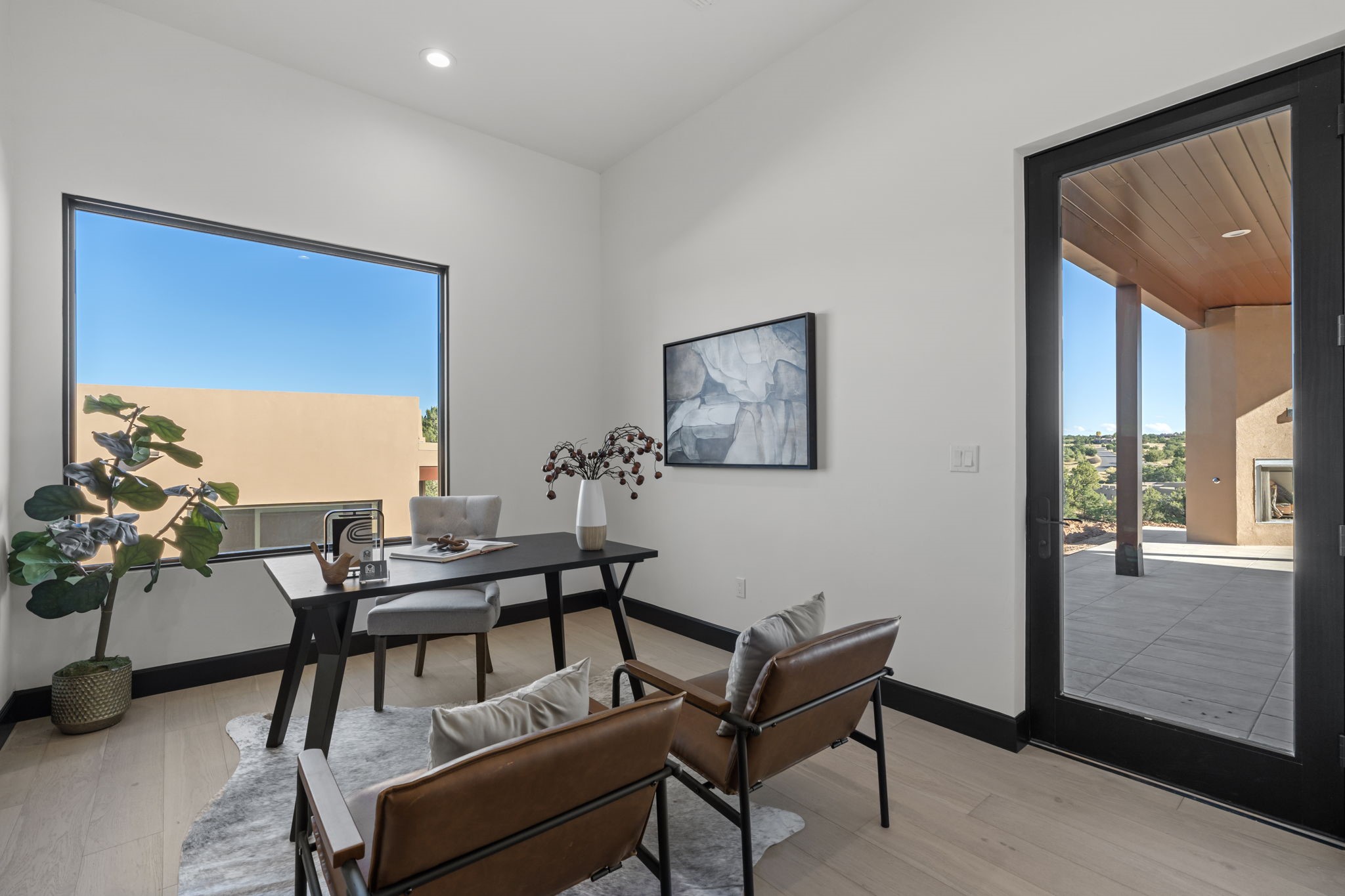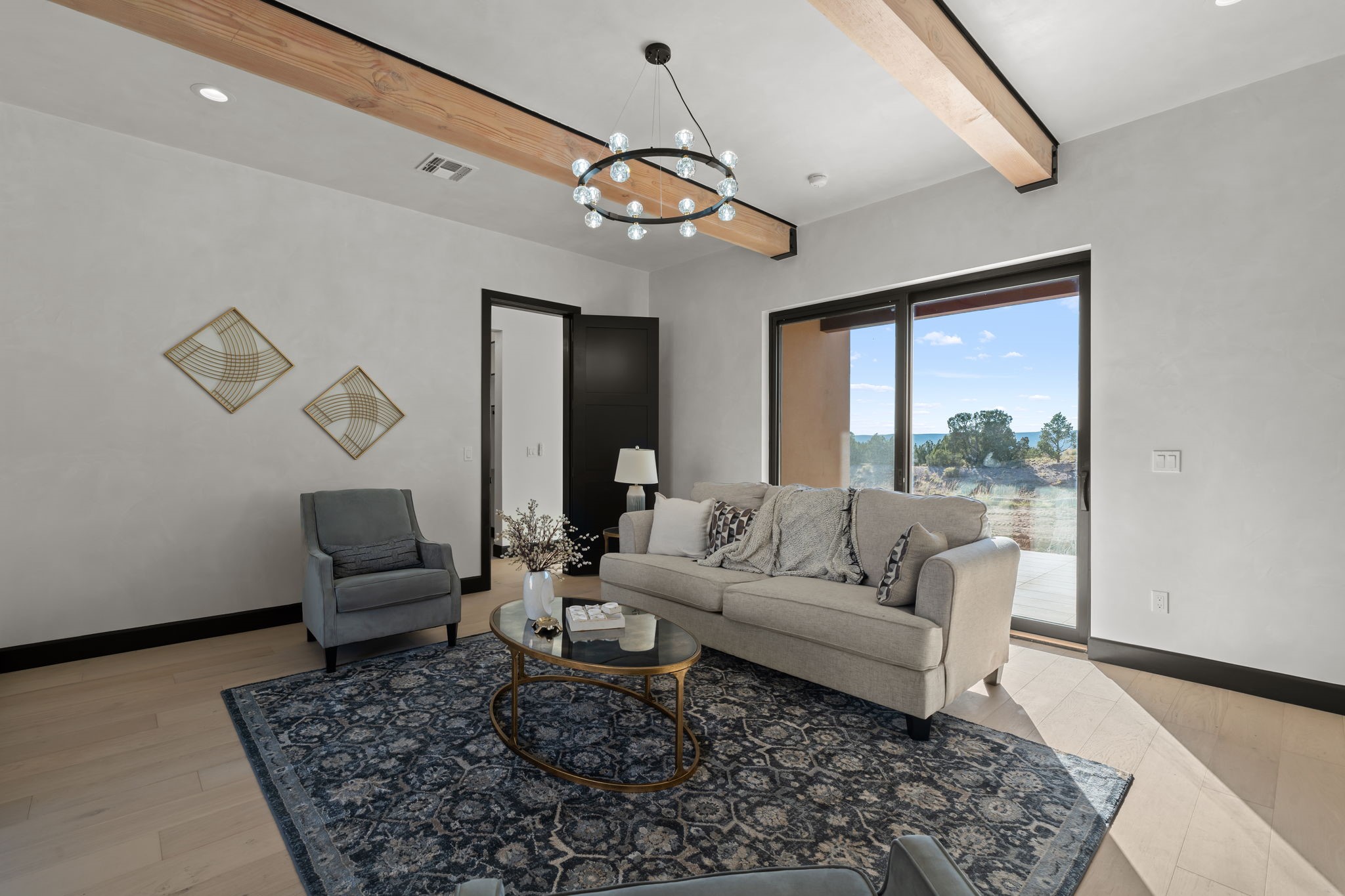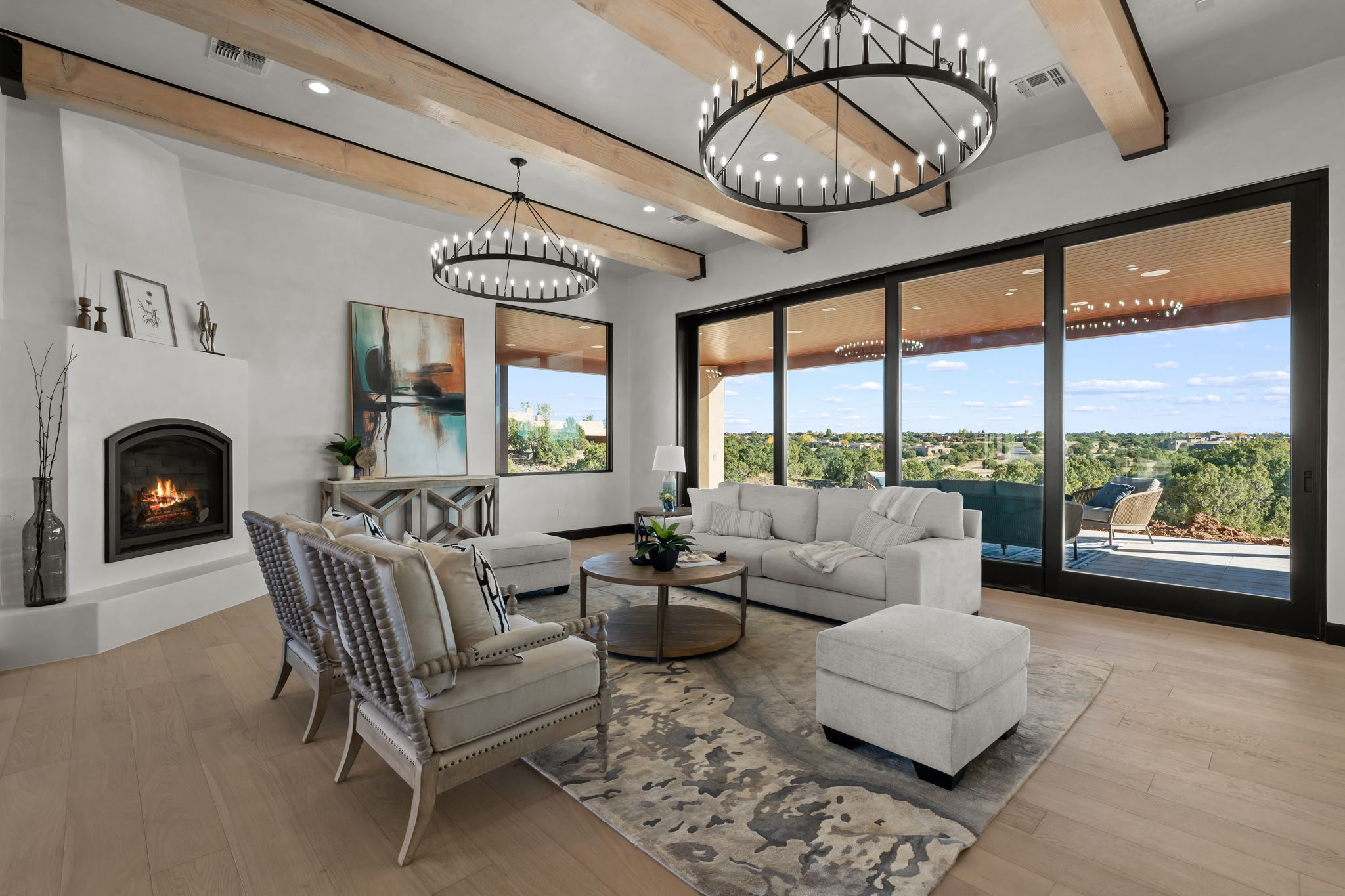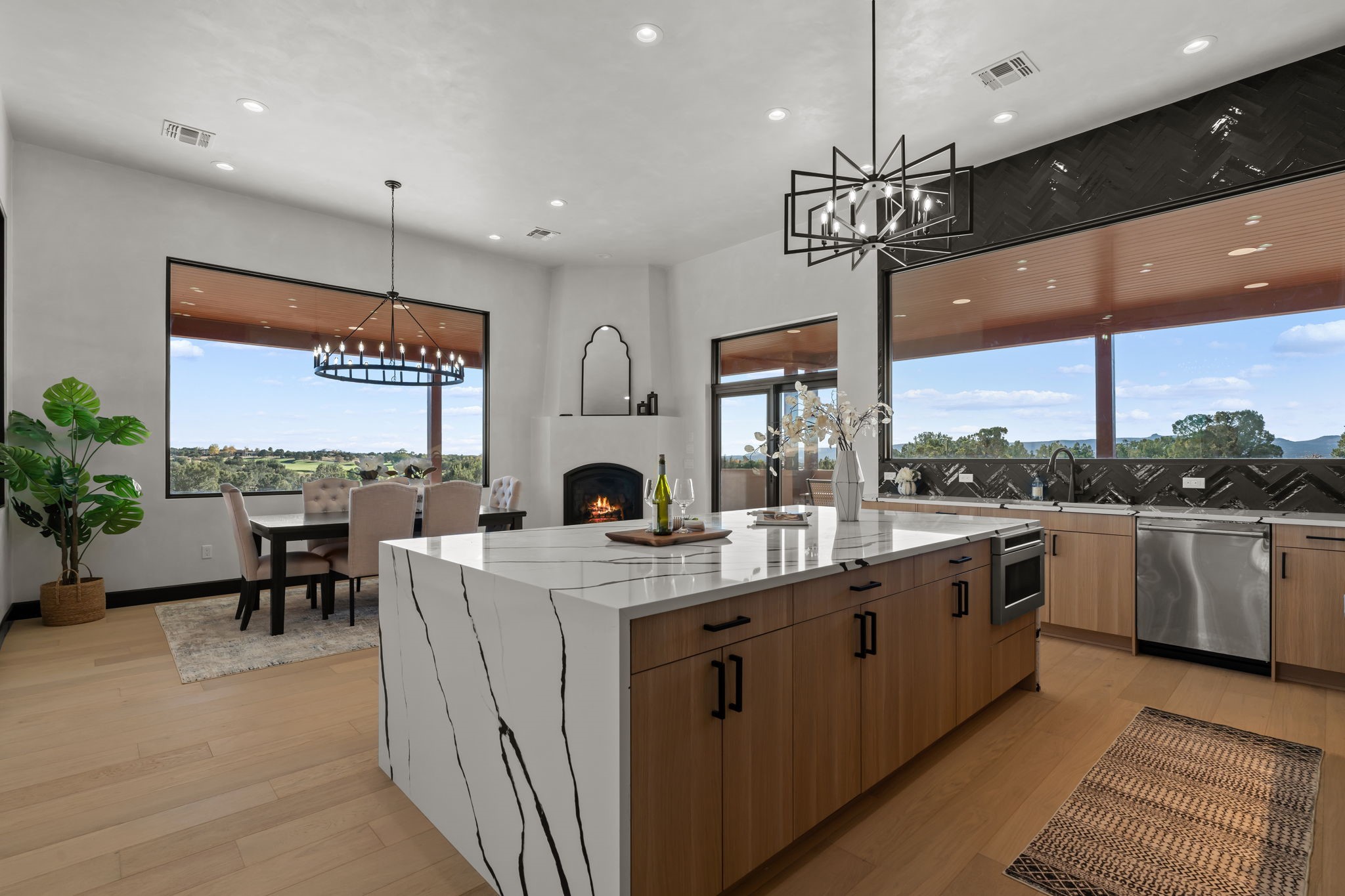 Nestled in the prestigious Las Campanas community of Santa Fe, this newly built custom estate blends modern architecture with timeless New Mexican charm. Situated on a 1.64-acre homesite overlooking two picturesque golf holes, the home captures breathtaking views of both the fairways and surrounding mountains.Built by Candelaria Homes, one of New Mexico's most respected luxury builders, this residence reflects exceptional craftsmanship and attention to detail in every corner--from its open floor plan to its refined finishes.Designed for comfort and sophistication, the single-story layout features heated floors throughout the main living and family areas, creating warmth and luxury in every season. A beautifully designed detached one-bedroom Casita offers the perfect retreat for guests, extended family, or a private studio.The gourmet kitchen impresses with bold dark finishes, high-end Sub-Zero appliances, a spacious center island, and a large butler's pantry, seamlessly combining style and function.A versatile bonus living area provides flexibility as a children's playroom, home library, or secondary living space. Expansive picture windows fill the home with natural light, framing Santa Fe's stunning landscape and creating a seamless indoor-outdoor connection.With its open-concept great room, spacious patios, and sweeping golf course and mountain views, this Las Campanas masterpiece defines elevated desert living. Golf course views are of holes 14 and 15.