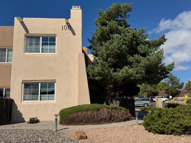 Rare corner two story town-home style found in Dos Santos! It has a beautiful treed courtyard offering privacy and lounging space any time of the year. Once inside you will find a two tiered wood burning fireplace accented with shelving and wood floors and light filtering shades. Inside the coat closet, a pantry has been created for all the extras. Beautifully remodeled stainless kitchen with high tech microwave and quartz countertops with updated tile. Upstairs you will find a newer washer dryer that leads to bedroom with magnificent views and functionally equipped with a walk in closet. Upstairs bath has been updated with an oversized walk in shower with vanity and flooring.