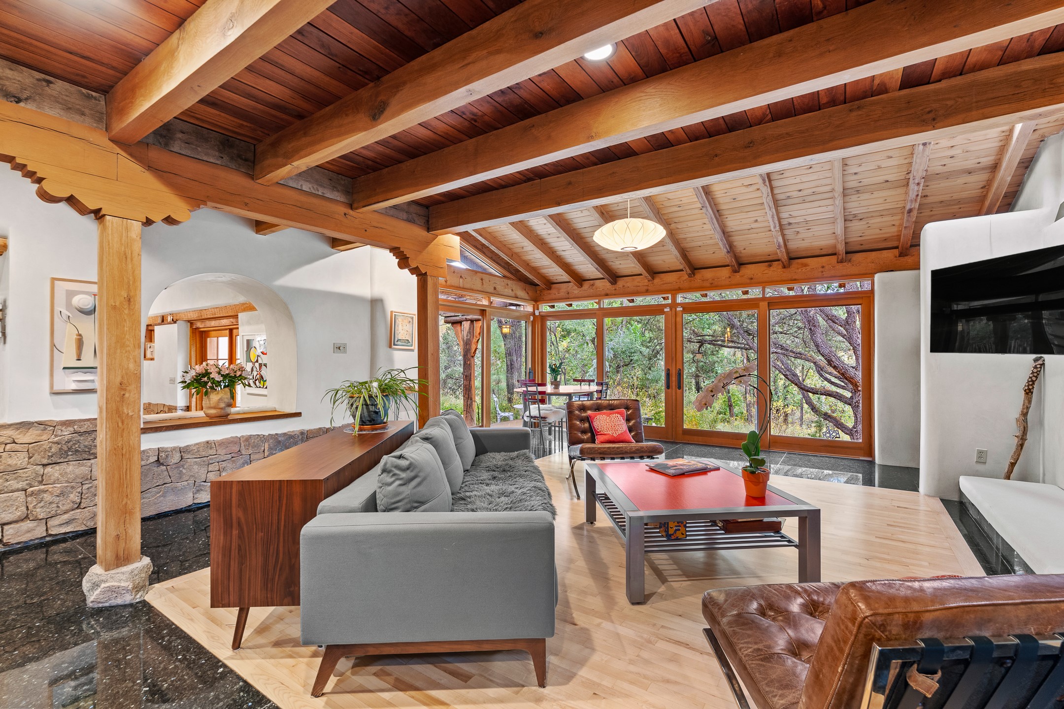 Location, location! A quick 8 minutes to Santa Fe Plaza and 5 minutes from the beloved Tesuque Village Market, this extraordinary 3,366 sq ft adobe sanctuary is nestled on .77 lush, tree-covered acre and adjacent to the seasonal Tesuque Creek. This 3 bdrm/3.5 bath residence blends soulful Santa Fe architecture built by notable local craftsmen, with regenerative land stewardship to support biodiversity. Flagstone floors, vigas, split cedar ceilings, and walls that transition organically from adobe to stone create a uniquely grounded and artistic living experience. The renovated kitchen features natural stone countertops and open dining area perfect for entertaining. Dining area opens to a covered portal with a natural gas firepit ideal for outdoor gatherings beneath the stars, rain or shine. There are two living areas: The original living room was designed for Japanese tea ceremony with glass wall that opens to views of the garden and creek side forest. The North living room features a dramatic fireplace, high ceilings, and connects to a serene ground-level primary suite with cedar lined closet, as well as a fenced garden area abundant with fruit trees and pollinator-friendly plants. The handcrafted staircase is built with no nails and leads to the upper level, where you'll find a guest suite and a second primary suite with a private deck and an infrared sauna - an immersive retreat in the treetops of Tesuque. Both have en suite bathrooms.Additional amenities include an automatic gated entry, labyrinth, private well with pristine water, EV charger, and a handcrafted workshop. There is so much more to say about this poetic property, but if you're seeking a Santa Fe home that honors nature, creativity, and intentional living, this eco-sanctuary in Tesuque is for you. Hiking access via arroyo from back yard and up the road .75 miles to the Lower Windsor Trailhead offer instant connection to the Sangre de Cristomountains and the coveted ecology of the Tesuque Valley.