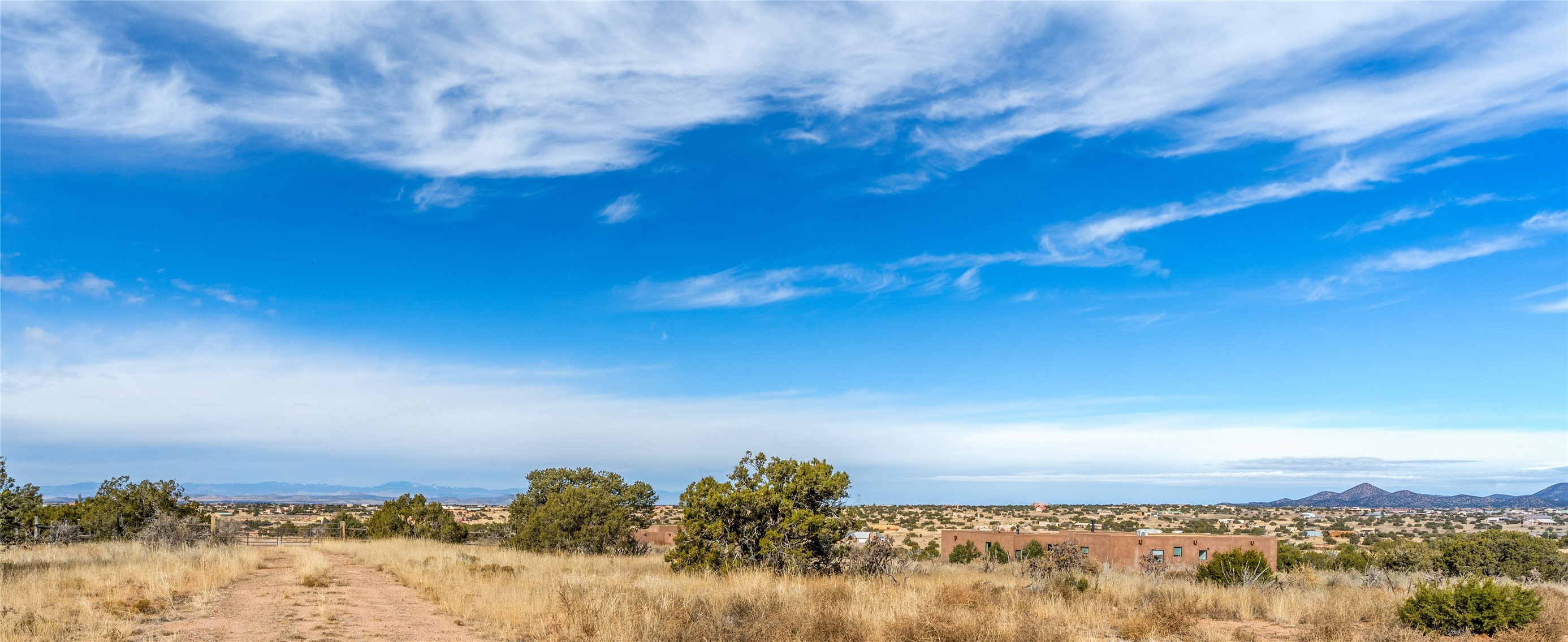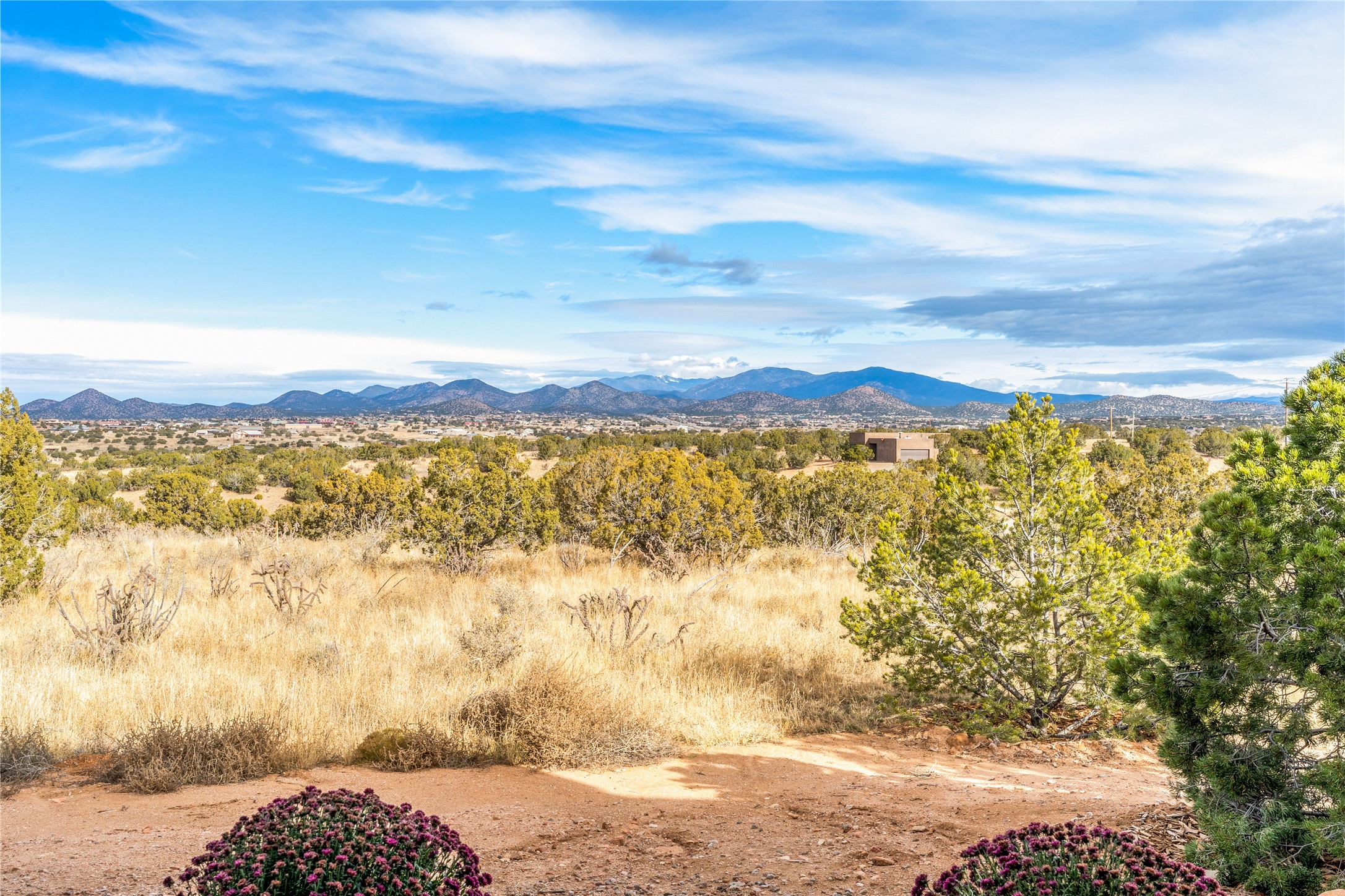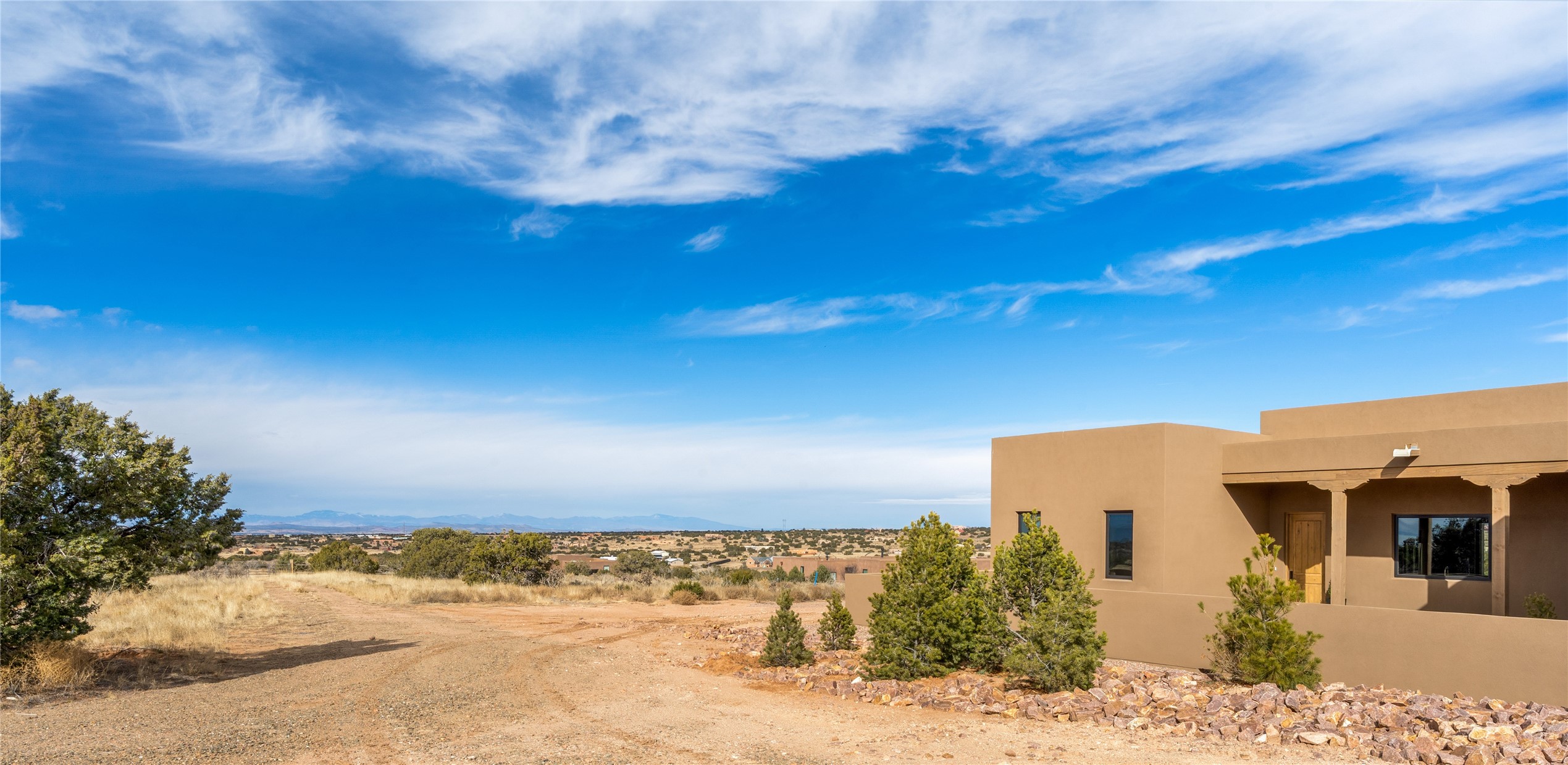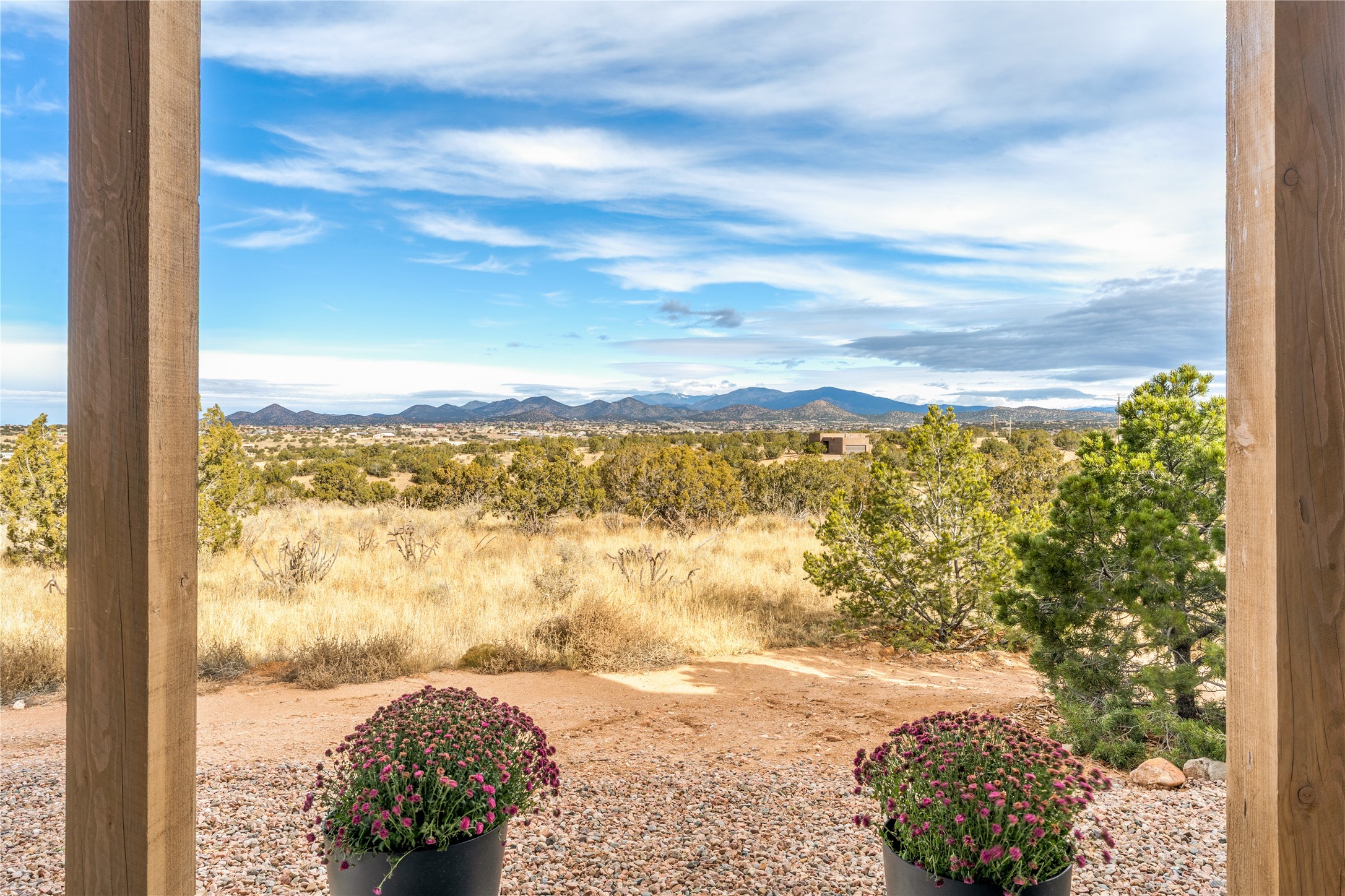 What an incredible place! The views are outstanding! Here you have 6.19+/- acres on a hilltop with views that reach far to the north and far to the west. At this property you can have an art studio or a business right at your home. There is plumbing and septic, and electric all set up to build another building on this lot. You can build an additional casita or guest house! This home is complete and ready to move into. It has the landscaping done with irrigation. The windows were placed to maximize light as well as mountain views. This modern home has gorgeous elements that also tie in the traditional styles of Santa Fe. There are viga beams in the main open concept living/dining/kitchen area. Both the front and back porches have Fir posts and beams with plenty of space to entertain or just relax and take in the beauty of this place. Watch the weather with a cup of coffee or tea on the back porch. There is a Douglas Fir custom-built modern vanity in the guest bathroom as well. The floors are a gorgeous, real wood engineered white oak. The doors are all a beautiful alder wood. Here you have a certified Green design home with Energy Star appliances, a HERS rating certification, and a very well-insulated house with highly insulated windows. This home comes with A/C and forced air heating, which is great when you want the temperature to adjust right away. Every detail was thought out and selected with a discriminating eye.You must come check this beautiful home out to feel what it will be like to live here.