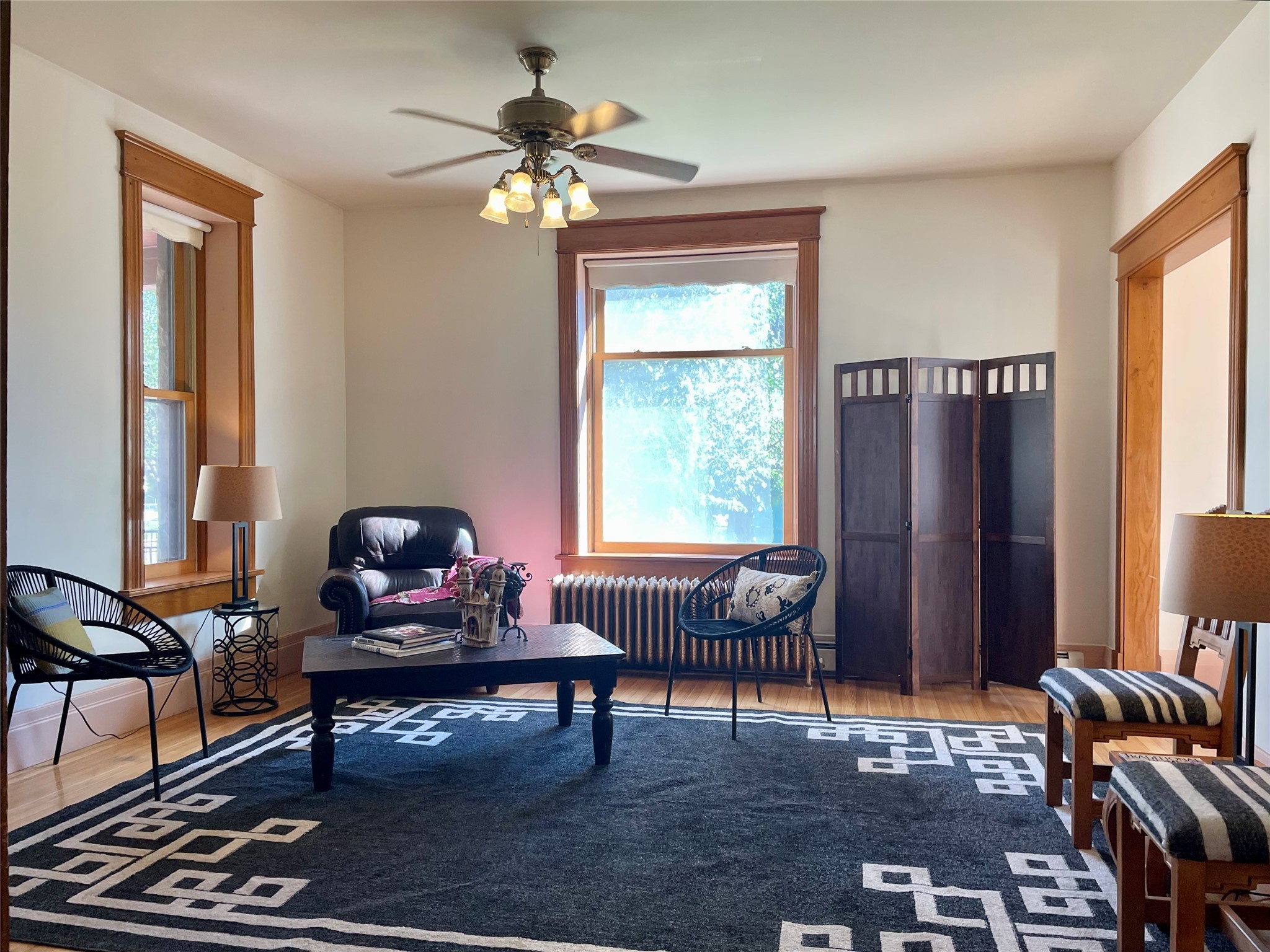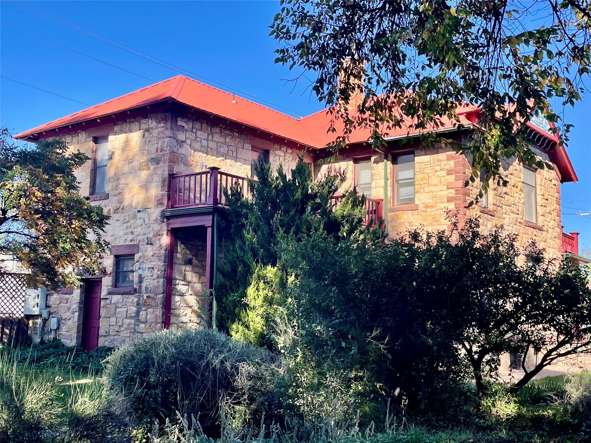 Stunning 1898 stone Queen Anne style home has a history of being the residence and office of the first female doctor in New Mexico, Dr. Alice Rice. The main part of the house has 3 bedrooms and one and a half bathrooms, with hard wood floors, built in display cabinets, transom windows, large pocket doors, a spacious living room and eat-in kitchen, as well as a little dining room/office. The downstairs bedroom has a laundry area in the closet. The attached home has a living room, large kitchen, office/den, two bedrooms, one and a half bathrooms, and was formerly the office space for Dr. Alice Rice, but was converted to an accessory dwelling unit in the 1990s when the home was completely updated, including double paned windows, new wiring, new plumbing, new insulation, and drywall. The ADU is currently rented on a month to month basis and comes complete with separate electric meter, separate water heater, and laundry in the half bathroom, Charm abounds with a truly park like yard with numerous covered porches and balconies, antique style metal fencing, covered grape trellis, many perennials, pathways, and stone patio. The basement is easily accessible and spacious. And with a Propanel roof, 3 car garage, and large alley access what more could you ask for?