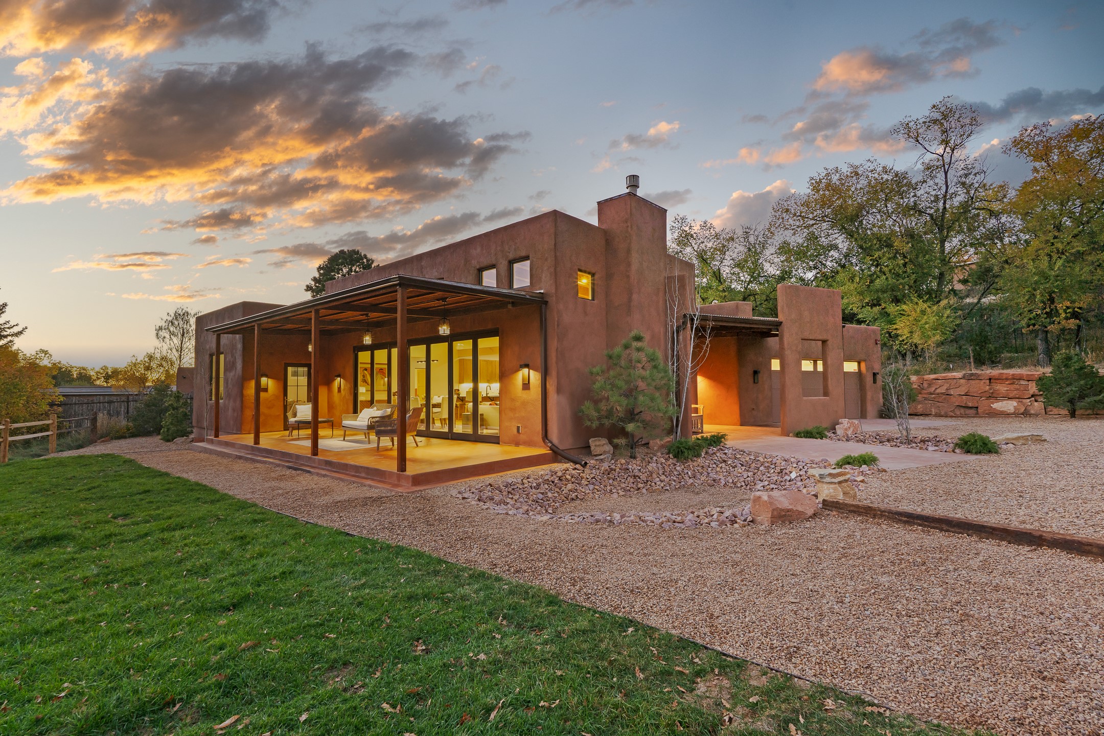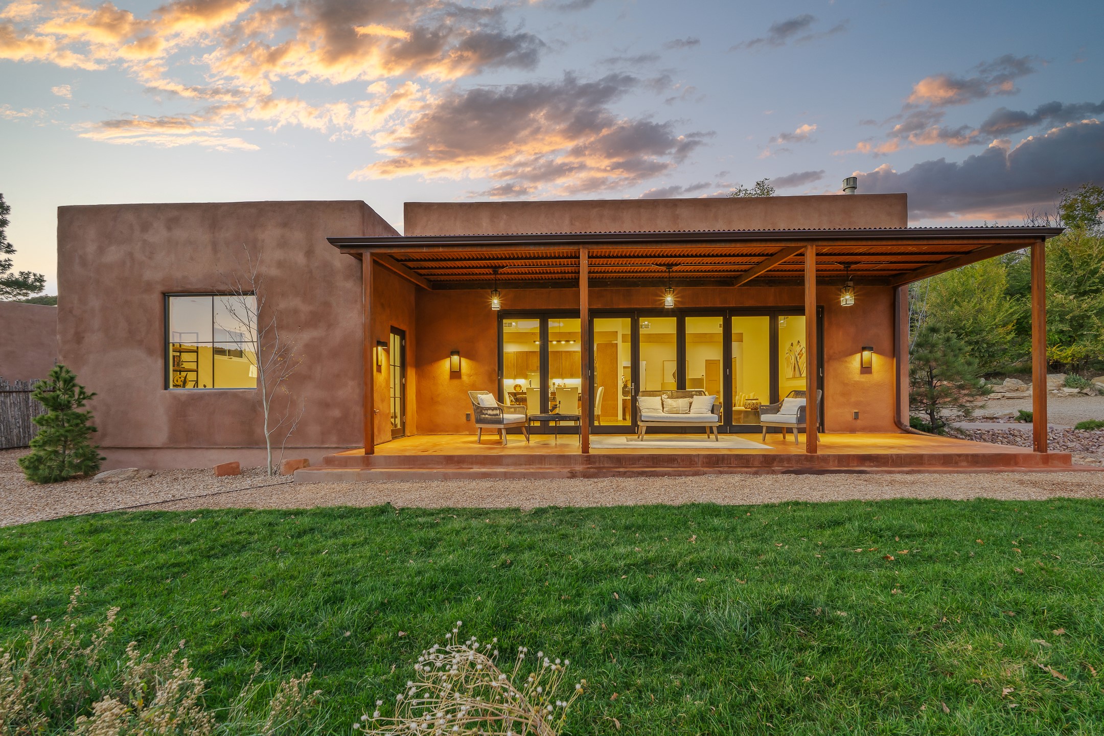 Contemporary Elegance Above the Santa Fe River Nature Preserve. Perched above the Santa Fe River Nature Preserve, with breathtaking views of Picacho Peak, this brand-new, all-single-level 2025 contemporary residence is a masterful blend of architecture, nature, and modern comfort--just minutes from Canyon Road, The Teahouse, and downtown Santa Fe.Designed for effortless living and entertaining, the main residence offers three bedrooms and two baths, an open-concept living space with soaring ceilings, wood flooring, a sleek gas fireplace with a built-in banco, and a wall of glass articulating doors that frame Picacho Peak and the surrounding foothills, inviting the outdoors in with seamless flow onto the southeast-facing, view-filled portal--perfect for entertaining or quiet moments of reflection. The open, well-designed chef's kitchen features Nocturne quartz countertops, soft-hued cabinetry, and stainless-steel appliances.Set on over half an acre, the landscaped property features lush green grass framed by a graceful grove of native oak trees and is graced by the historic Acequia, its gentle spring-fed waters flowing near the primary suite. The spa-like primary bath offers a freestanding soaking tub and a separate walk-in shower, creating a serene retreat inspired by nature.A TPO roof and two-car garage speak to both form and function, while mindful touches--fire suppression system, drip irrigation, and central air conditioning--ensure lasting peace of mind. The detached one-bedroom, one-bath casita with a full kitchen provides the ideal retreat for guests, an art studio, an office, or a rental opportunity.All a five-minute drive from Canyon Road and moments from the Dale Ball Trails, the Beaver Pond, and the Audubon, this location offers endless opportunities to connect with Santa Fe's natural beauty and culture--an inspired sanctuary for those who live beautifully.