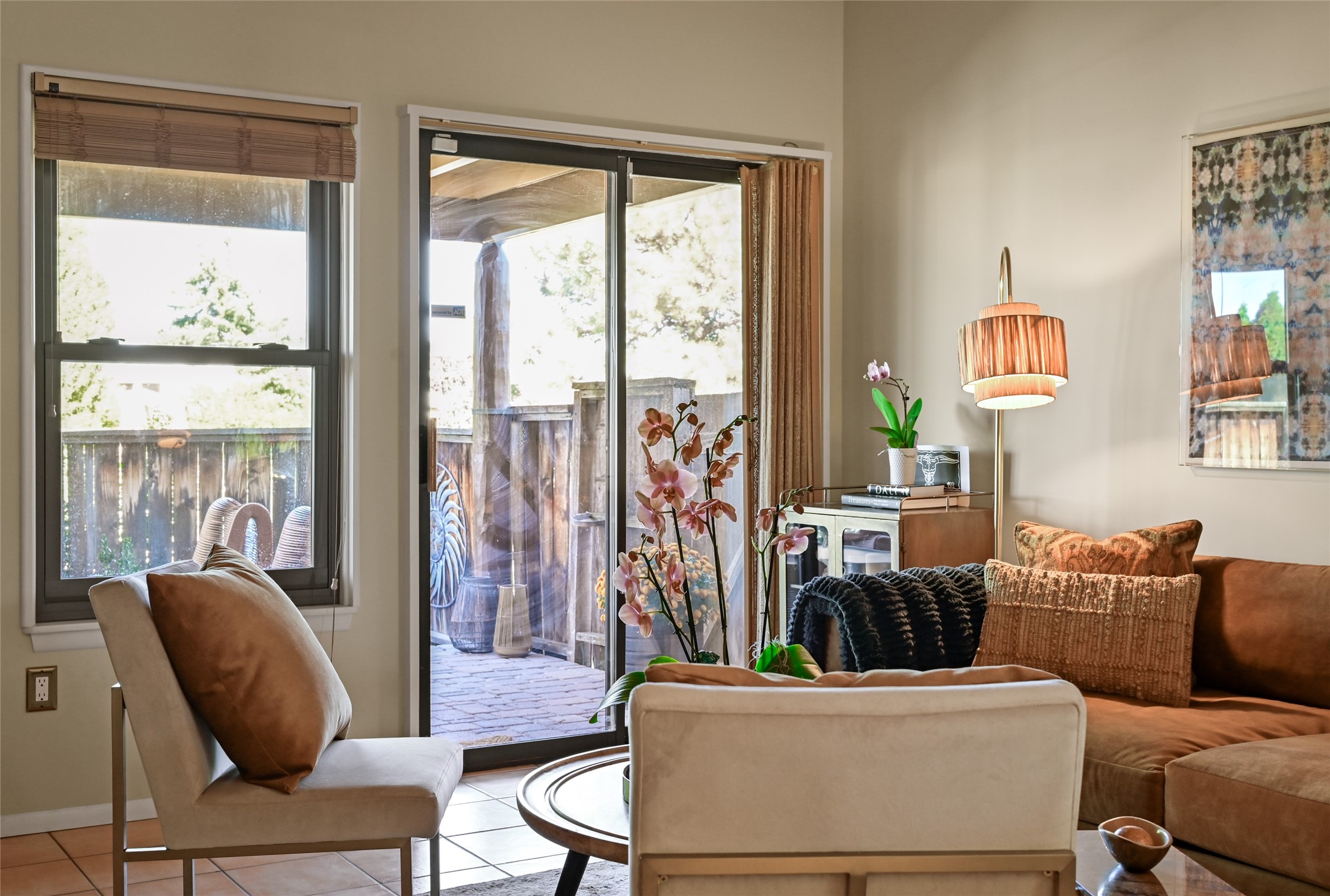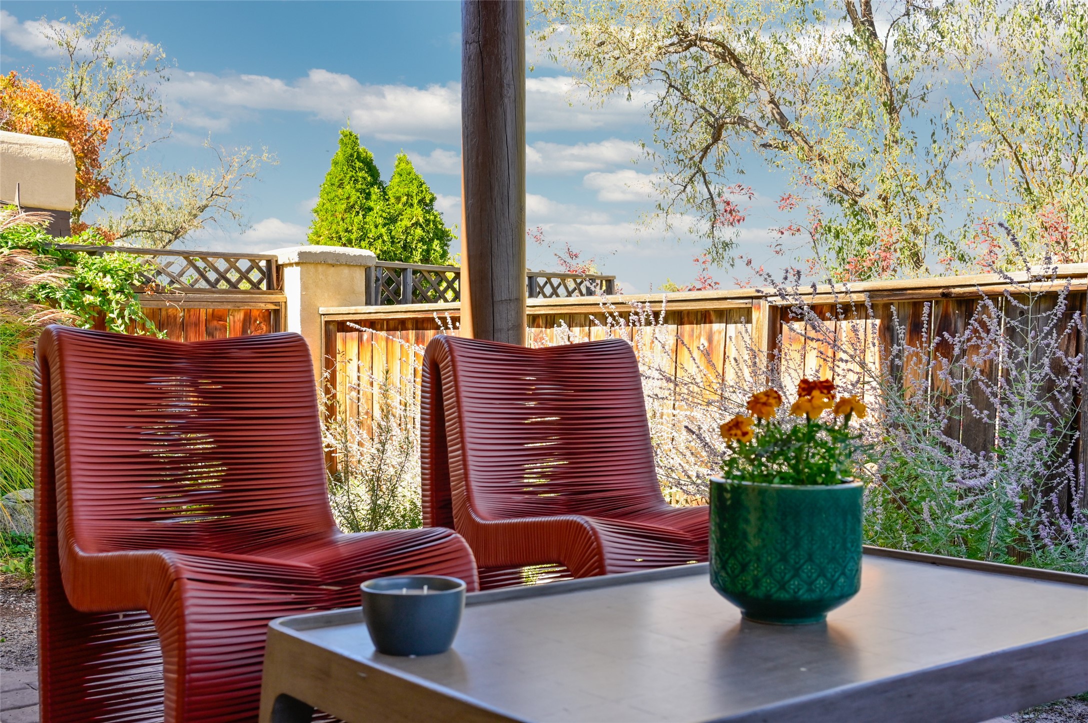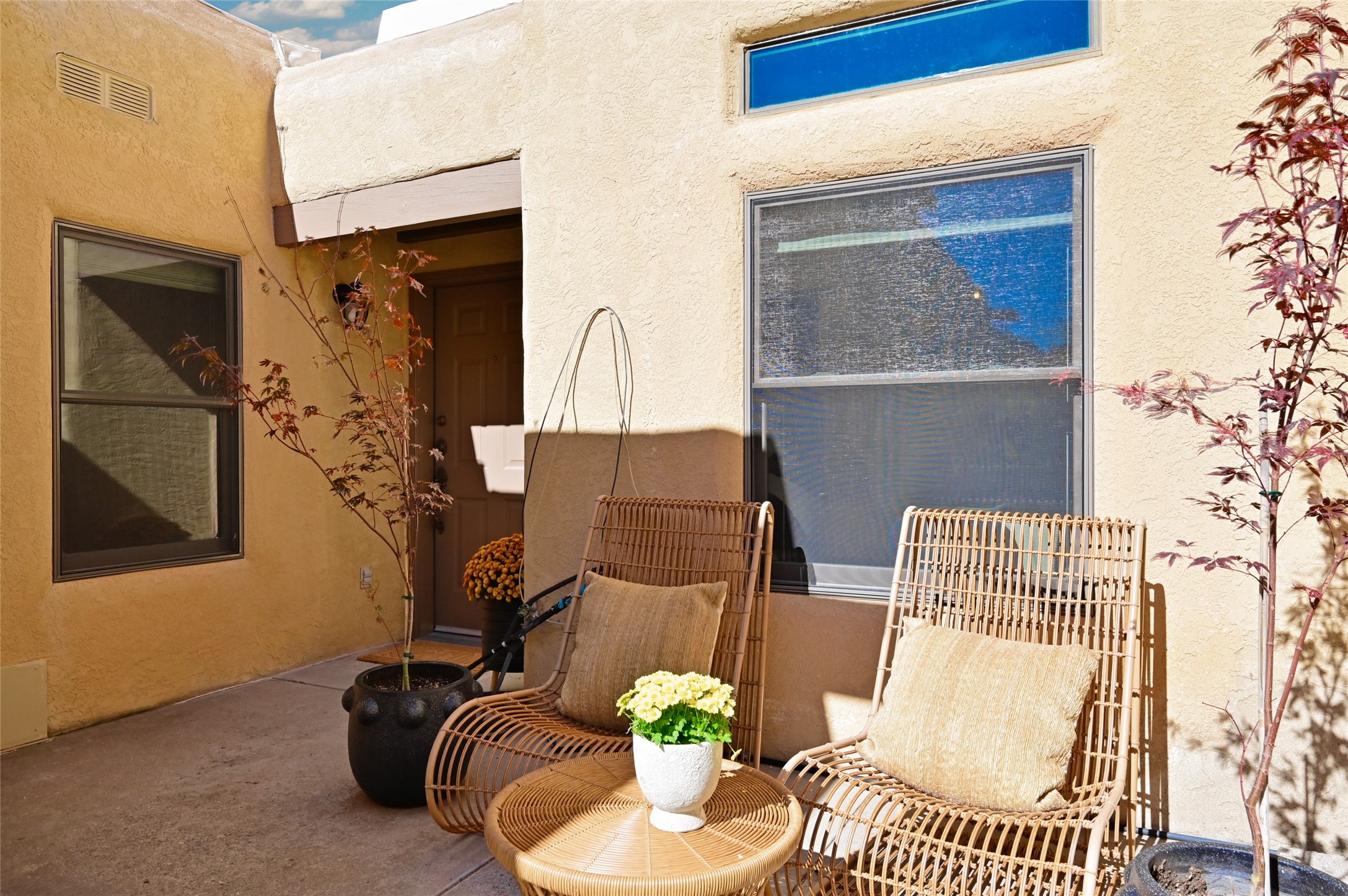Beautifully maintained and move-in ready, this 2-bedroom, 2-bath home captures the relaxed Santa Fe lifestyle. Warm natural light, modern Southwestern touches, and an easy, open floor plan create a welcoming atmosphere throughout. Two private, landscaped patio areas offer peaceful spaces to unwind or entertain under Santa Fe's big skies. With ample storage and a true lock-and-leave design, this home is perfect for those seeking comfort and convenience. Centrally located near walking trails, pickleball courts, a dog park, and surrounded by mature trees.