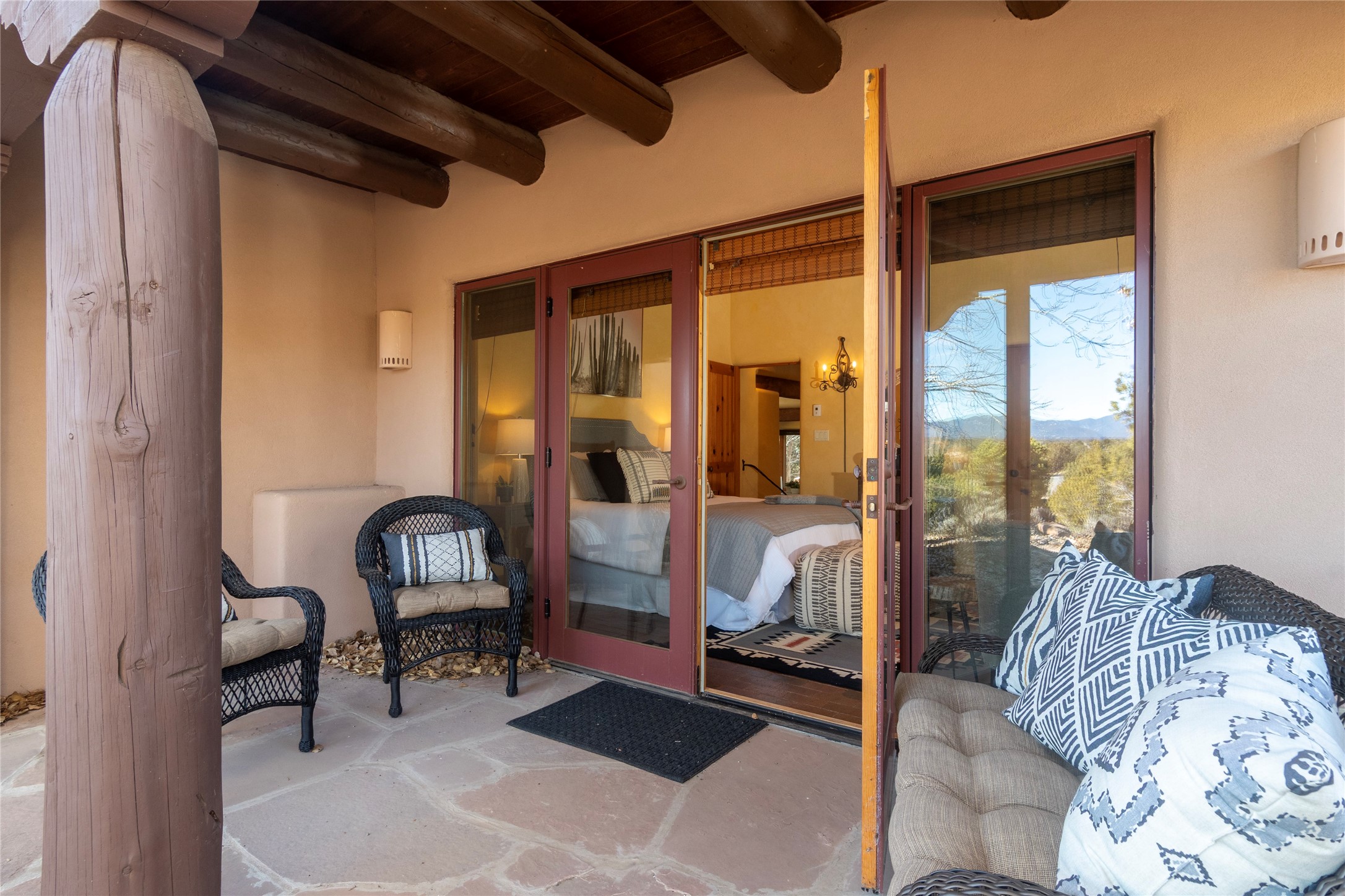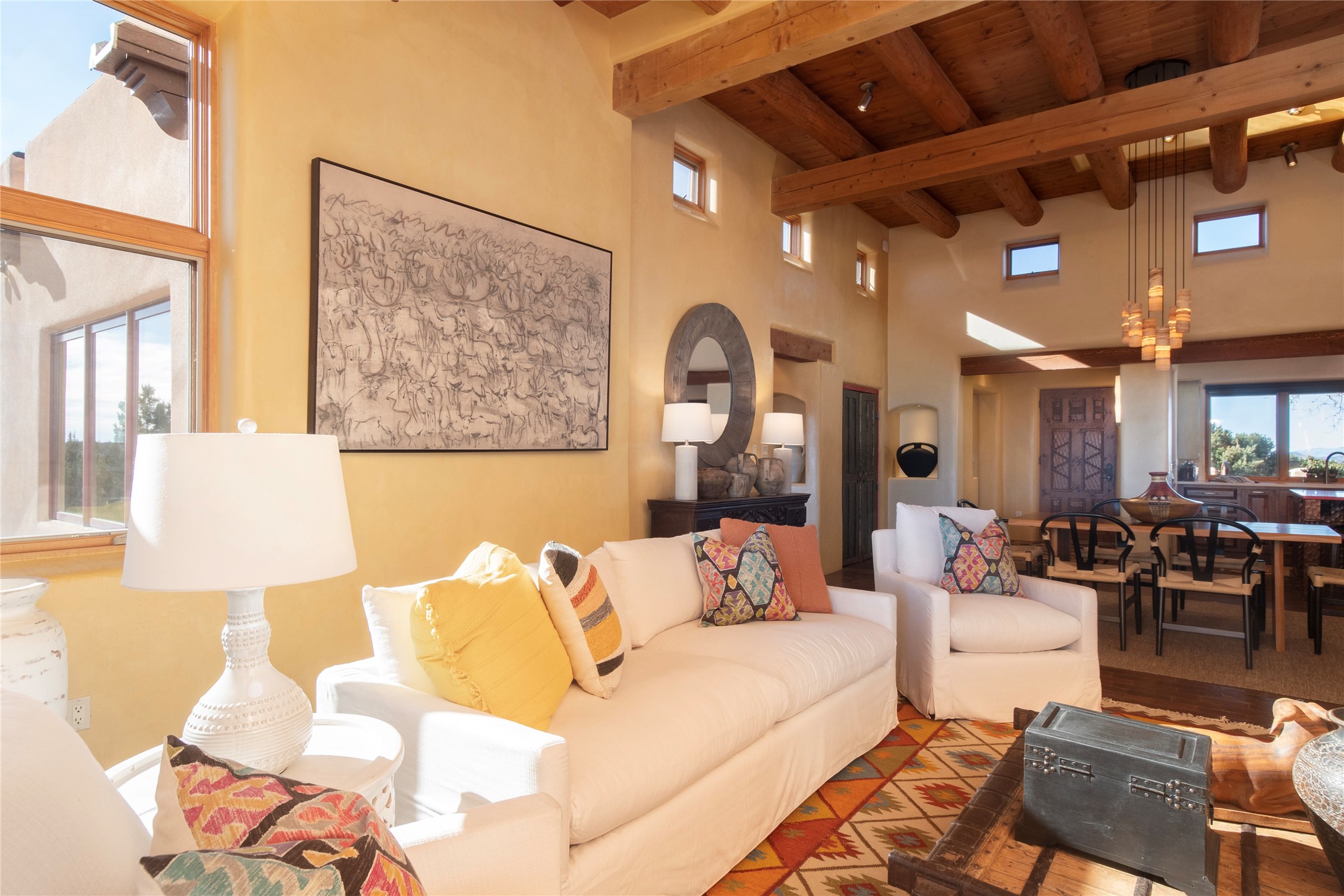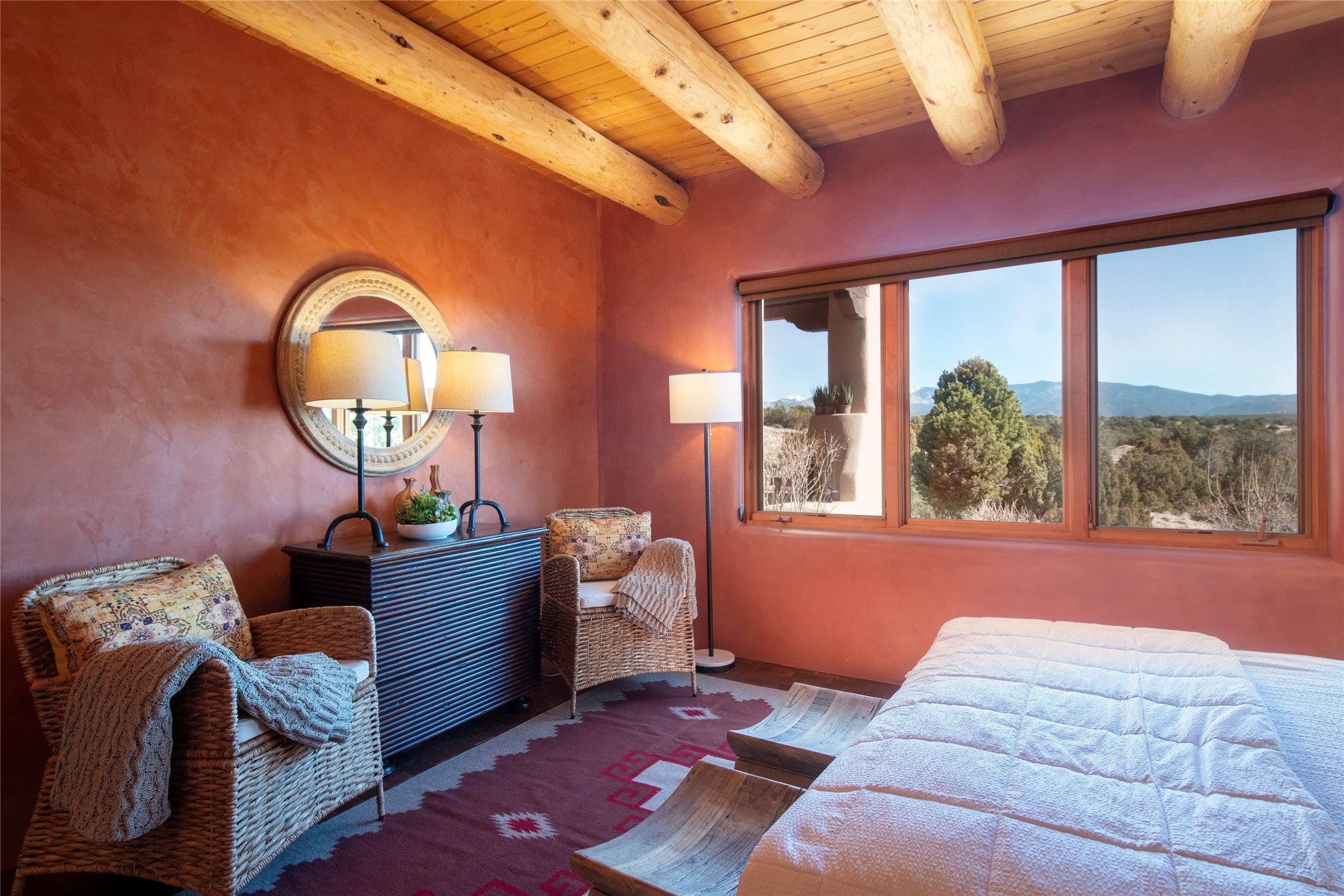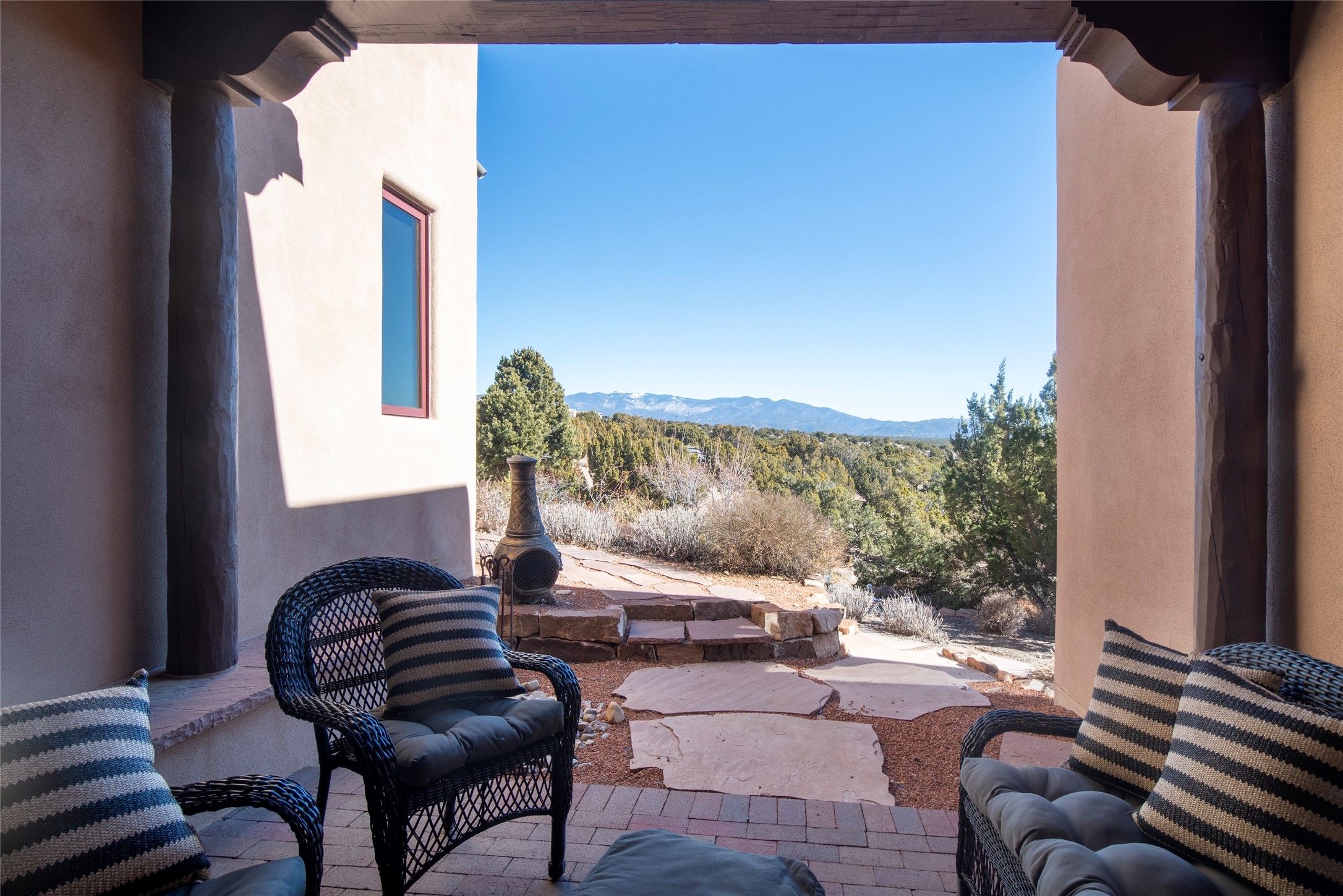 Exceptional pueblo-style home offering picturesque mountain views from a 5.01-acre setting. This beautifully crafted 3,179 sq ft residence features 3 bedrooms (possibly 4 with the studio/den room) and 3 baths, showcases Southwestern architecture with hand-troweled plaster walls, exposed vigas and beams, stone accents, and warm wood detailing throughout. The light-filled great room boasts soaring ceilings and expansive windows that frame the surrounding landscape and open to inviting portals, creating seamless indoor-outdoor living ideal for entertaining or quiet relaxation. A welcoming entry courtyard sets a tranquil tone, while gracious living and dining spaces provide comfort and flexibility. Mature native landscaping blends effortlessly with the natural terrain, offering privacy and a strong connection to the land. Perfectly positioned to enjoy Santa Fe's renowned skies, mountain views, and architectural heritage, this delightful property delivers timeless style, serenity, and a true sense of place to call home.