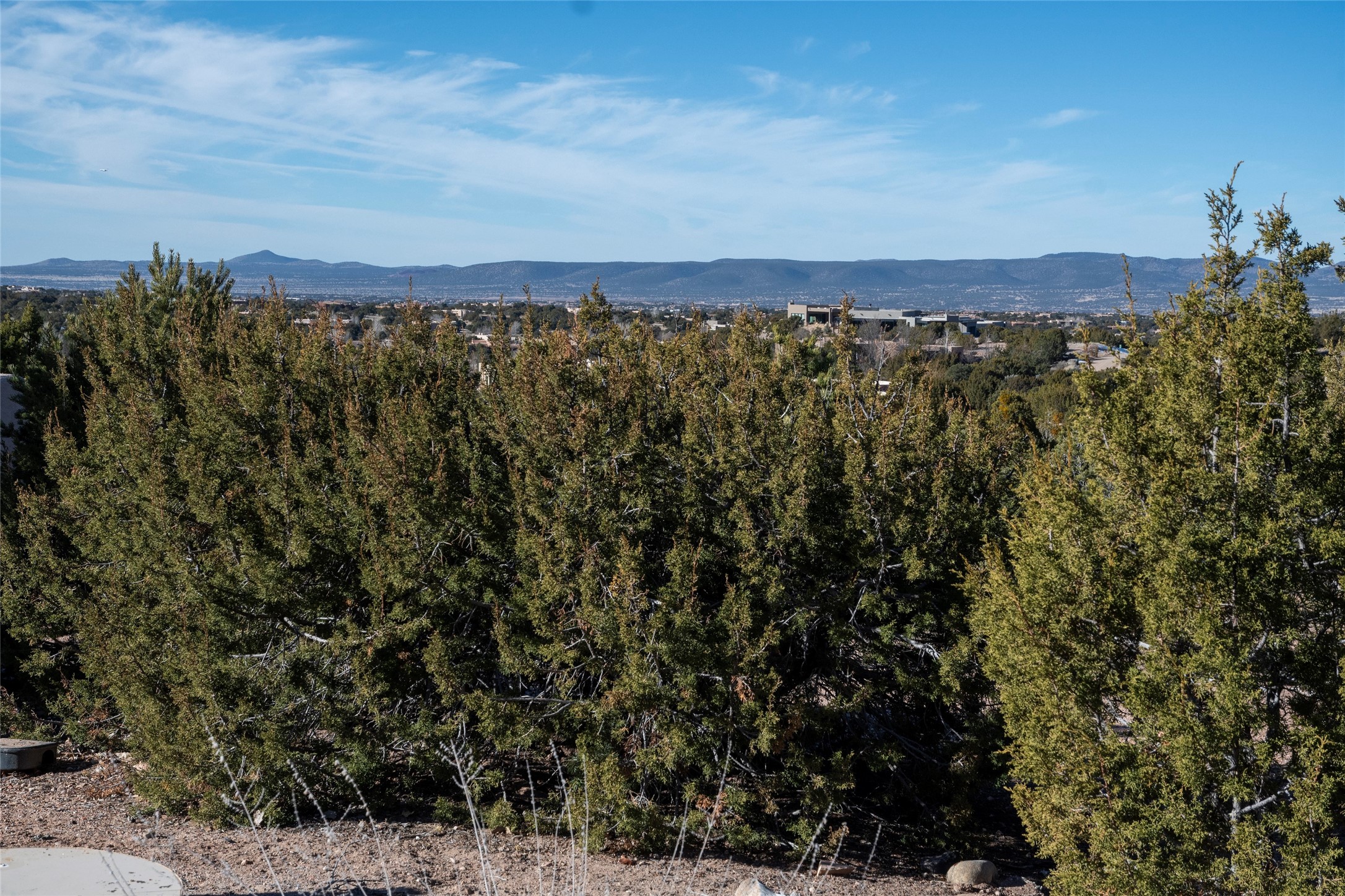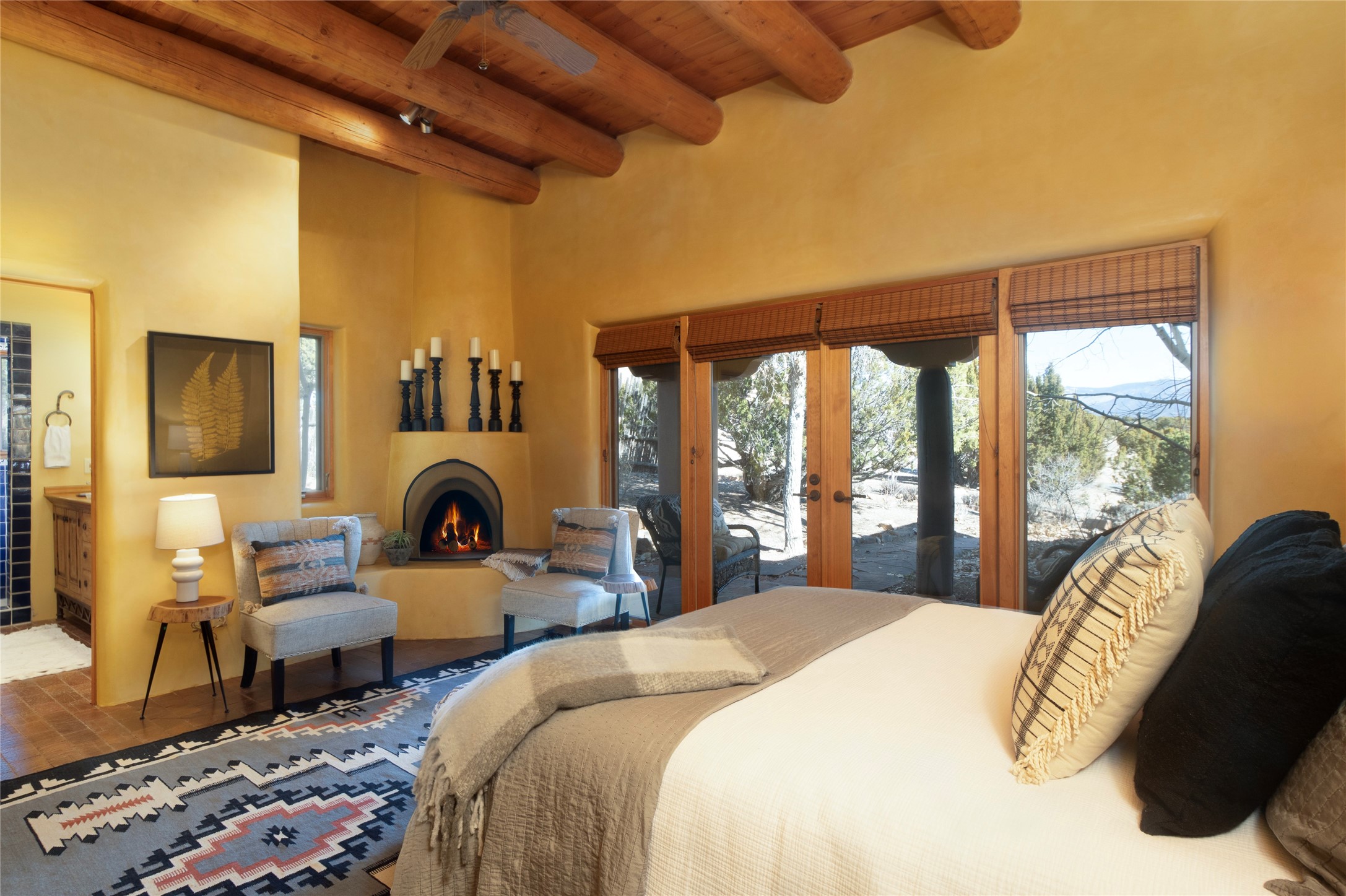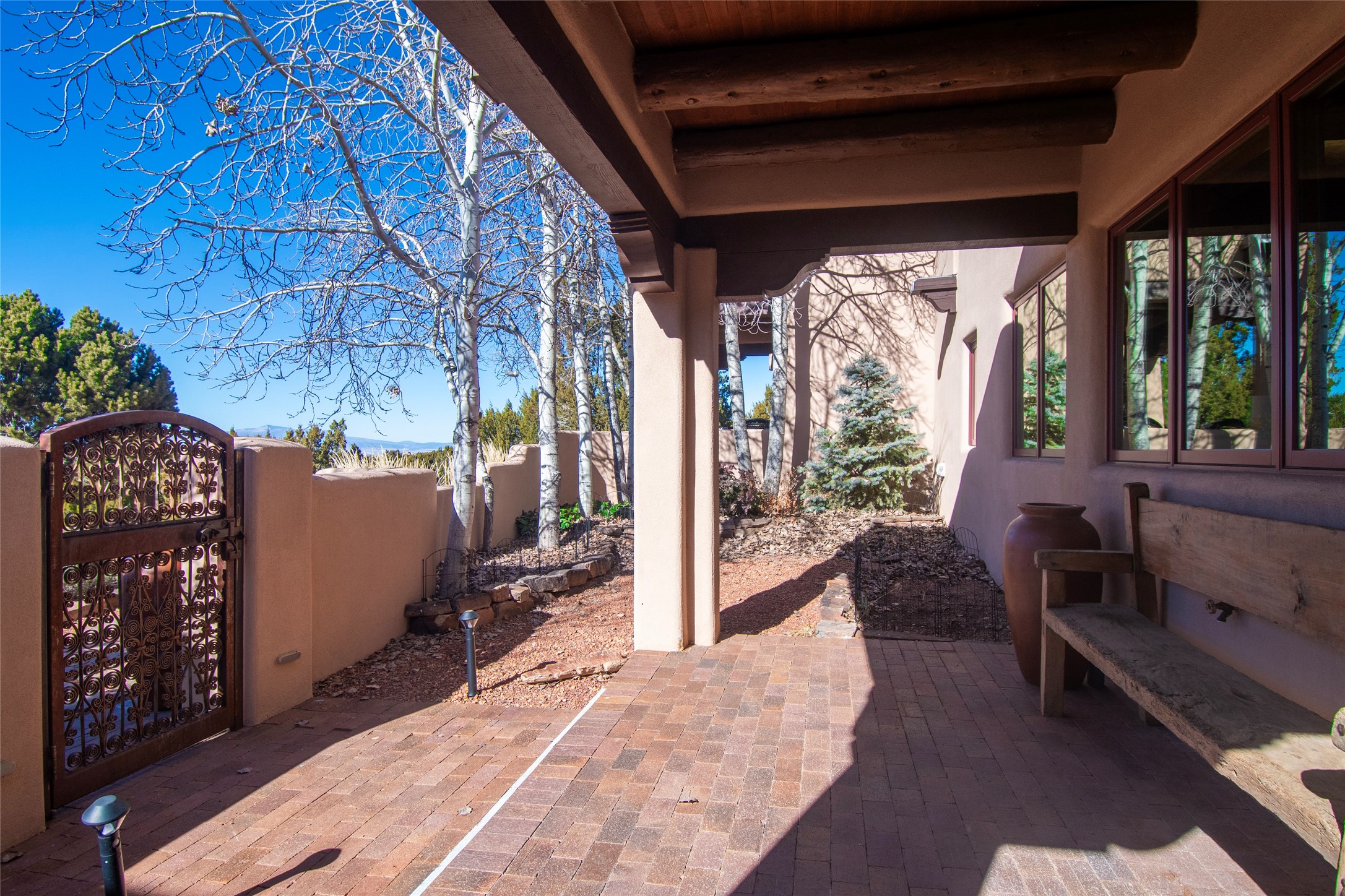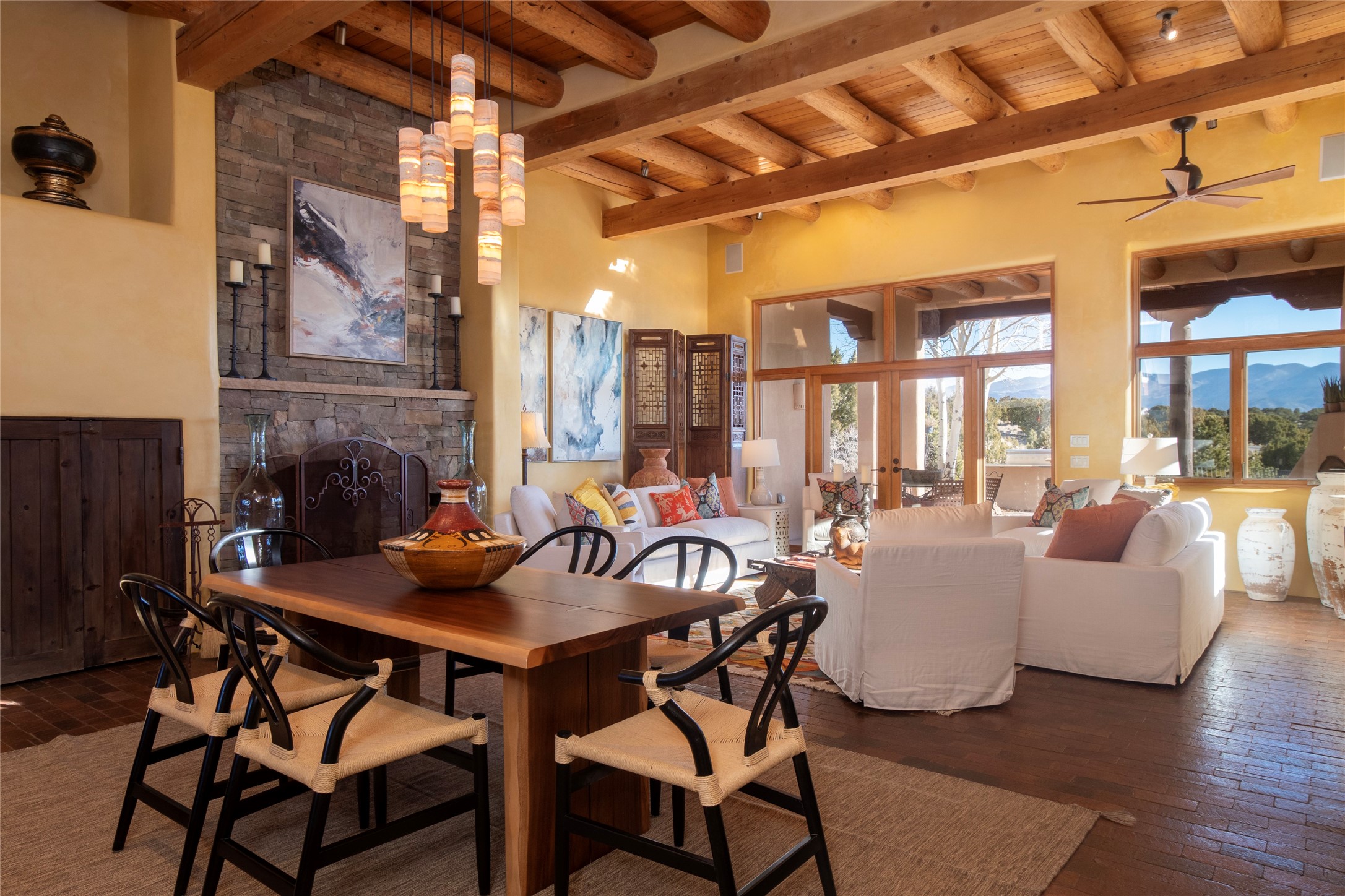 Exceptional pueblo-style home offering picturesque mountain views from a 5.01-acre setting. This beautifully crafted 3,179 sq ft residence features 3 bedrooms (possibly 4 with the studio/den room) and 3 baths, showcases Southwestern architecture with hand-troweled plaster walls, exposed vigas and beams, stone accents, and warm wood detailing throughout. The light-filled great room boasts soaring ceilings and expansive windows that frame the surrounding landscape and open to inviting portals, creating seamless indoor-outdoor living ideal for entertaining or quiet relaxation. A welcoming entry courtyard sets a tranquil tone, while gracious living and dining spaces provide comfort and flexibility. Mature native landscaping blends effortlessly with the natural terrain, offering privacy and a strong connection to the land. Perfectly positioned to enjoy Santa Fe's renowned skies, mountain views, and architectural heritage, this delightful property delivers timeless style, serenity, and a true sense of place to call home.