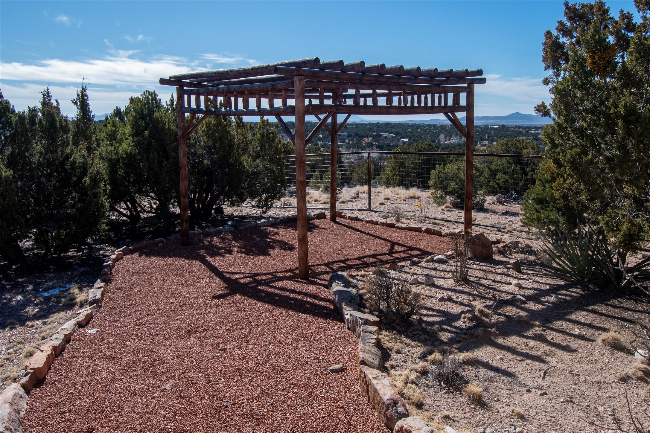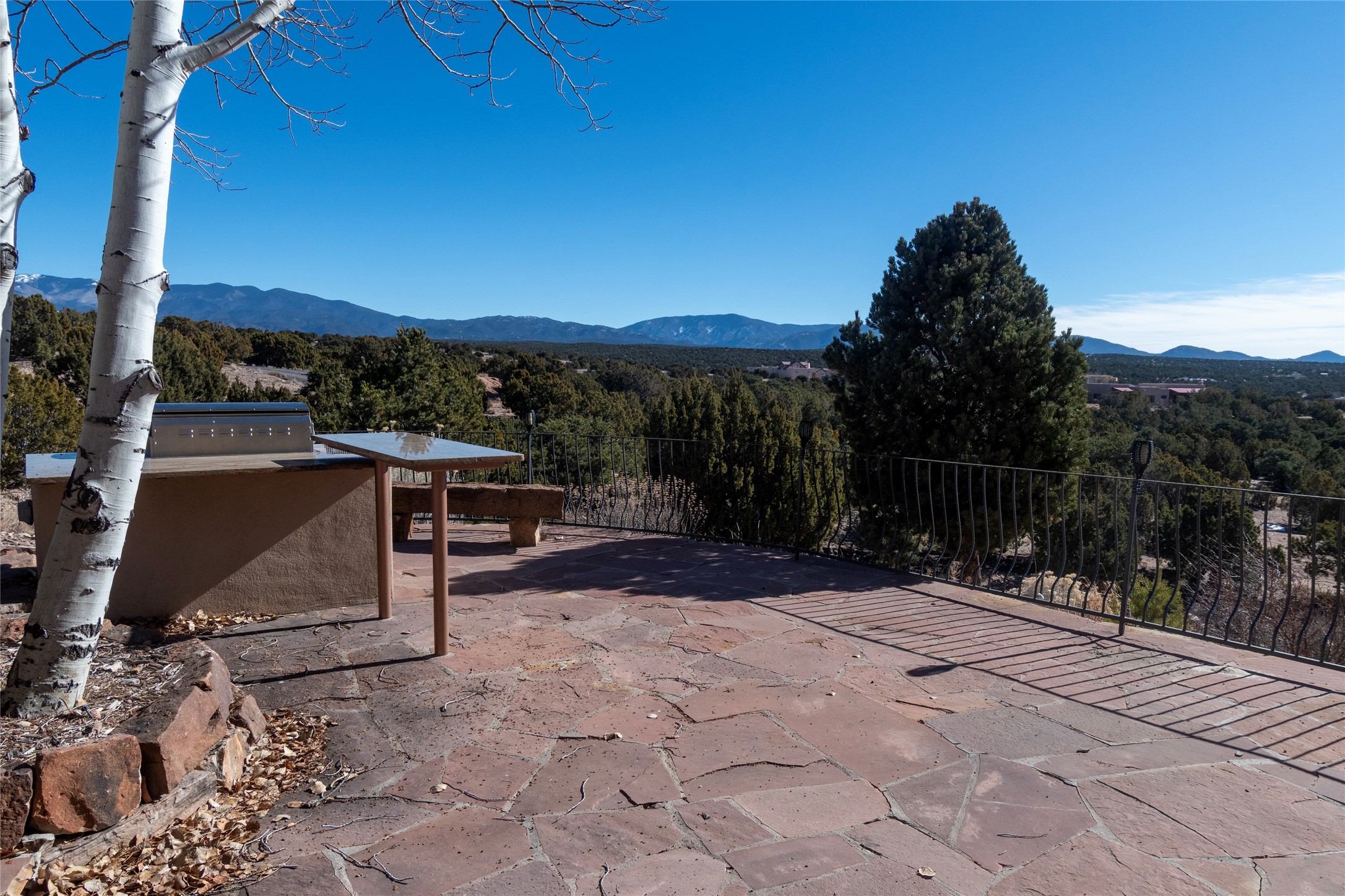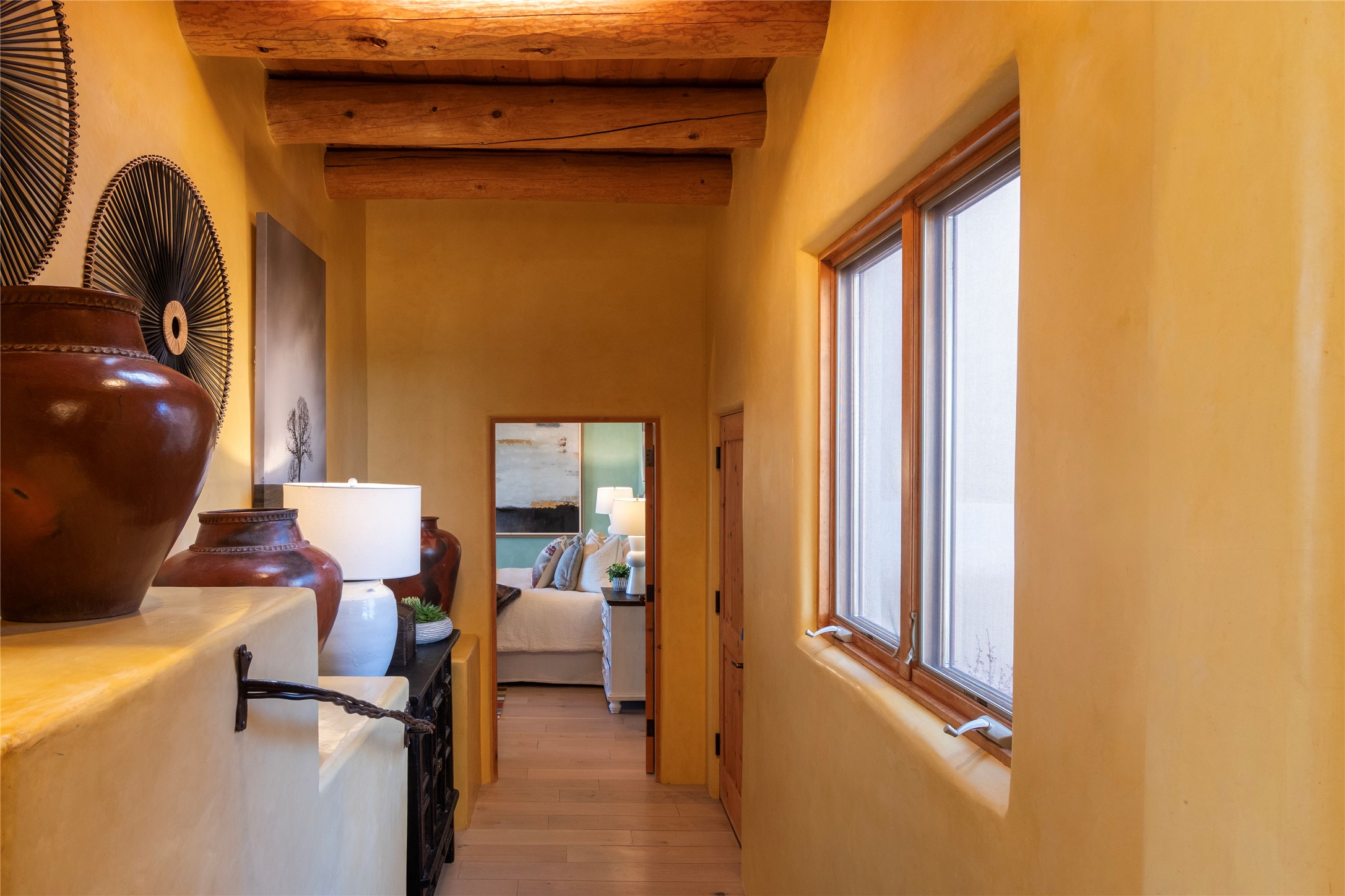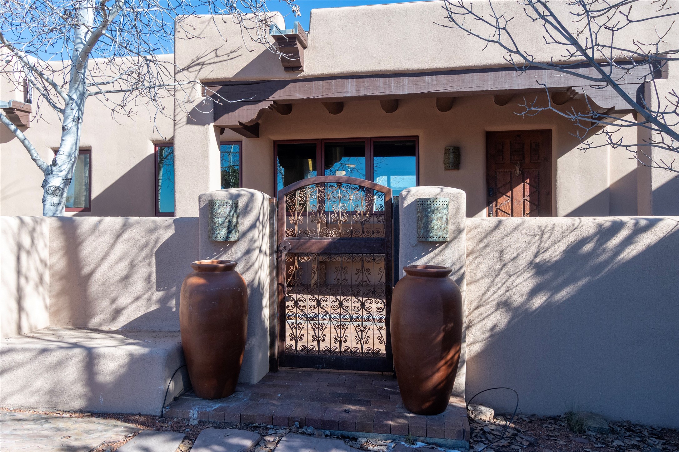 Exceptional pueblo-style home offering picturesque mountain views from a 5.01-acre setting. This beautifully crafted 3,179 sq ft residence features 3 bedrooms (possibly 4 with the studio/den room) and 3 baths, showcases Southwestern architecture with hand-troweled plaster walls, exposed vigas and beams, stone accents, and warm wood detailing throughout. The light-filled great room boasts soaring ceilings and expansive windows that frame the surrounding landscape and open to inviting portals, creating seamless indoor-outdoor living ideal for entertaining or quiet relaxation. A welcoming entry courtyard sets a tranquil tone, while gracious living and dining spaces provide comfort and flexibility. Mature native landscaping blends effortlessly with the natural terrain, offering privacy and a strong connection to the land. Perfectly positioned to enjoy Santa Fe's renowned skies, mountain views, and architectural heritage, this delightful property delivers timeless style, serenity, and a true sense of place to call home.