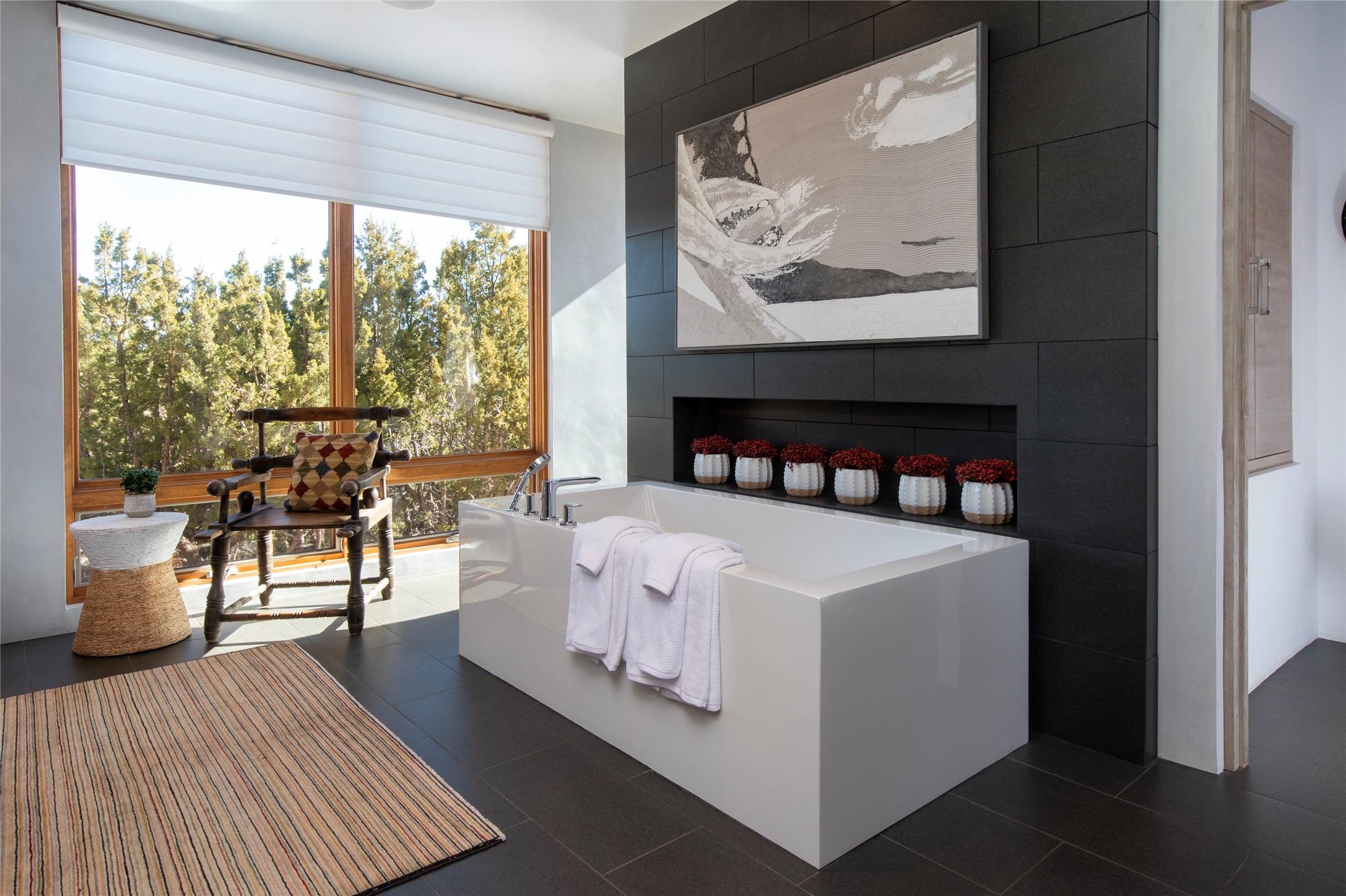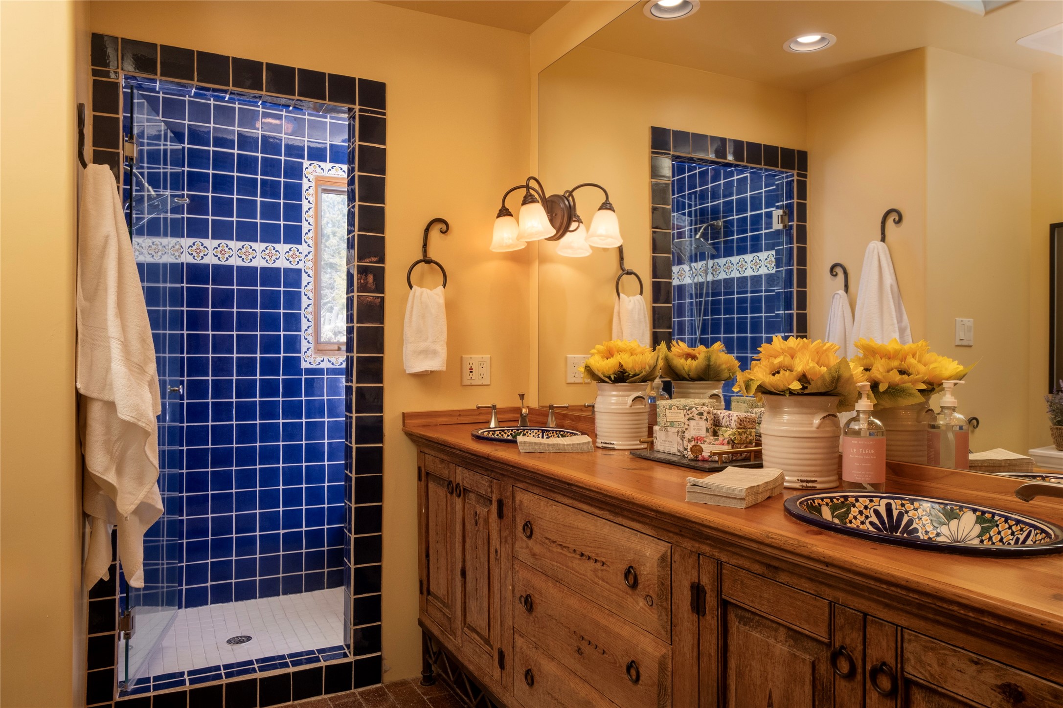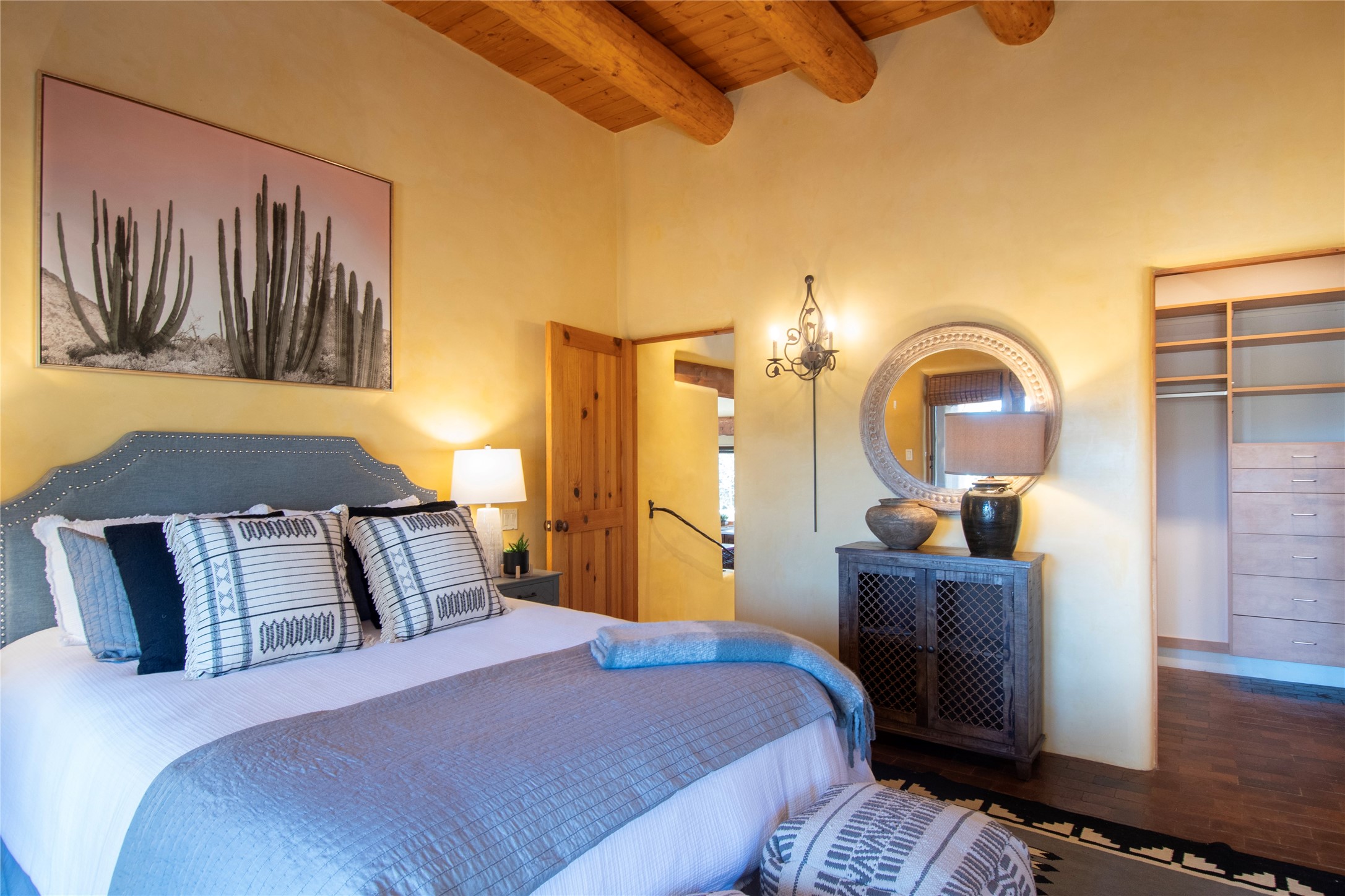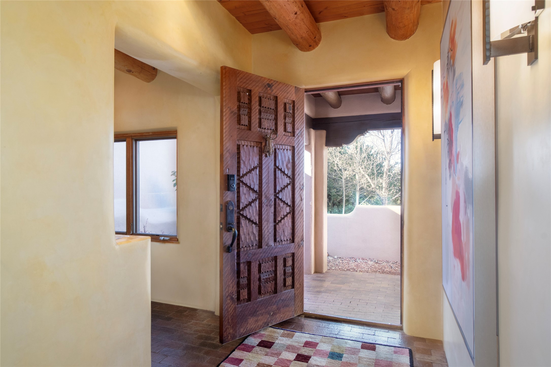 Exceptional pueblo-style home offering picturesque mountain views from a 5.01-acre setting. This beautifully crafted 3,179 sq ft residence features 3 bedrooms (possibly 4 with the studio/den room) and 3 baths, showcases Southwestern architecture with hand-troweled plaster walls, exposed vigas and beams, stone accents, and warm wood detailing throughout. The light-filled great room boasts soaring ceilings and expansive windows that frame the surrounding landscape and open to inviting portals, creating seamless indoor-outdoor living ideal for entertaining or quiet relaxation. A welcoming entry courtyard sets a tranquil tone, while gracious living and dining spaces provide comfort and flexibility. Mature native landscaping blends effortlessly with the natural terrain, offering privacy and a strong connection to the land. Perfectly positioned to enjoy Santa Fe's renowned skies, mountain views, and architectural heritage, this delightful property delivers timeless style, serenity, and a true sense of place to call home.