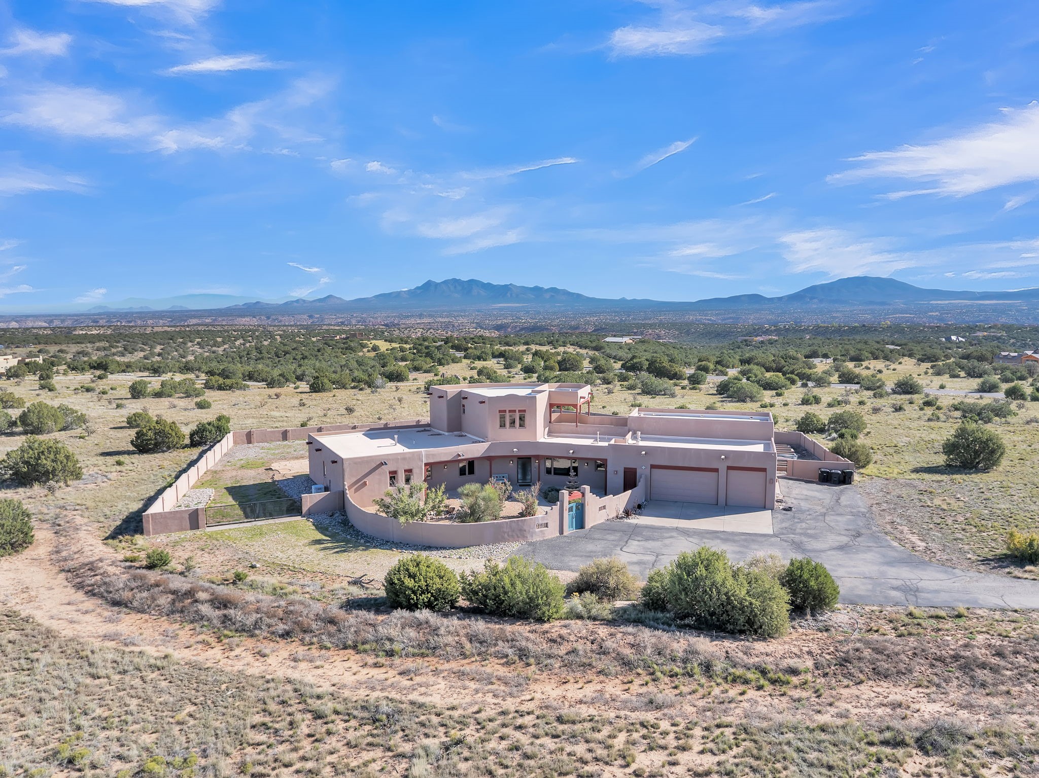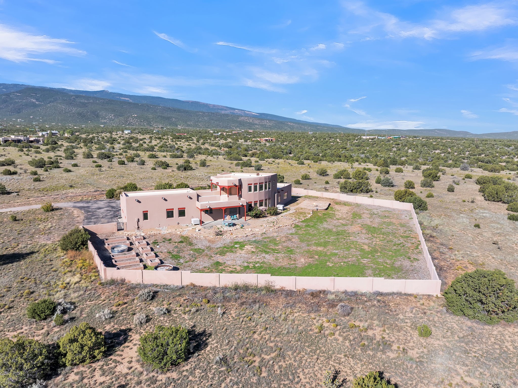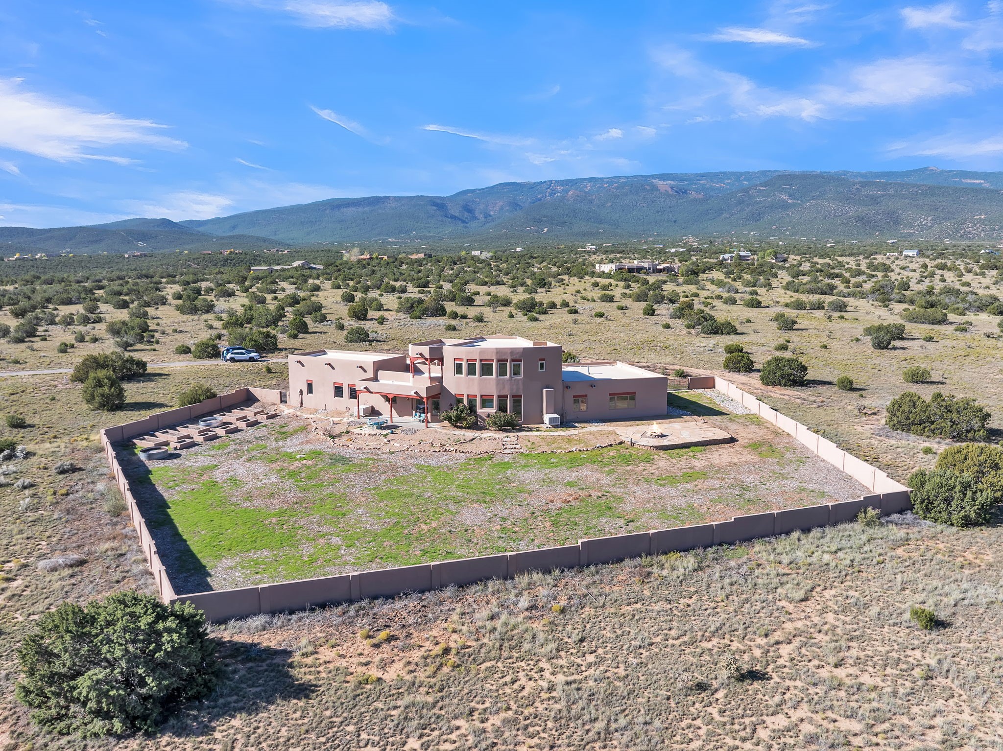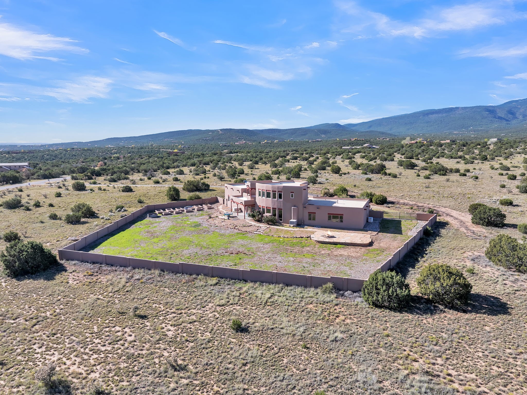 Welcome to 5 La Aguapa, Sandia Park, NM Experience luxury rural living in San Pedro Creek Estates! This custom 4,000+ sq ft home on 10.57 acres offers breathtaking views of five mountain ranges. Featuring 4 bedrooms, 4 baths, and two primary suites, this home combines comfort and elegance. The great room with soaring ceilings, a gas log fireplace, and panoramic views. The gourmet kitchen includes granite countertops, a built-in gas stove, pantry, and access to a workshop and three-car garage. Enjoy radiant heat, travertine tile flooring, a large utility room, and a walled backyard with access to Golden Open Space Los Duendes Trail. This is luxury rural living within reach.Situated on 10.57 acres in the prestigious San Pedro Creek Estates, this impressive 4,000+ square foot home offers refined comfort, privacy, and spectacular views of five separate mountain ranges. Featuring 4 bedroomsincluding two primary suites and 4 bathrooms, this thoughtfully designed home blends elegance with everyday functionality. The spacious great room showcases a gas log fireplace and sweeping views for miles, creating a warm and inviting central gathering space. The downstairs primary suite features a large walk-in closet and a generously sized bathroom, while the upstairs primary suite includes a private balcony the perfect spot to take in the serene landscape. Enjoy cooking in the large kitchen, complete with granite countertops, a built-in gas stove, ample cabinetry, a nice-sized pantry, and access to a spacious workshop and three-car garage perfect for hobbies, projects, or extra storage. The home is equipped with efficient radiant heat and features travertine tile throughout the downstairs, adding both beauty and functionality. A spacious utility room includes a sink and plenty of storage. Outside, you'll find a large walled-in backyard, ideal for relaxing, entertaining, or pets. The property also includes private gate access (key fob provided) to the Golden Open Space Los Duendes Trail, offering opportunities for hiking, biking, and horseback riding. Ideally located, this home is just 32 miles from Albuquerque, offering all the amenities of city living, 21 miles from Madrid, known for its artistic charm, and 50 miles from Santa Fe, celebrated for its rich culture and dining.POVEvery window frames a different view five mountain ranges that change colors with the seasons. It's peaceful, quiet, and filled with natural light. Mornings start with coffee on the balcony, and evenings end by the fire watching the sunset roll across the hills. There's room to breathe, create, and enjoy life at a slower pace yet you're still close enough to everything you need. It's truly the best of both worlds.