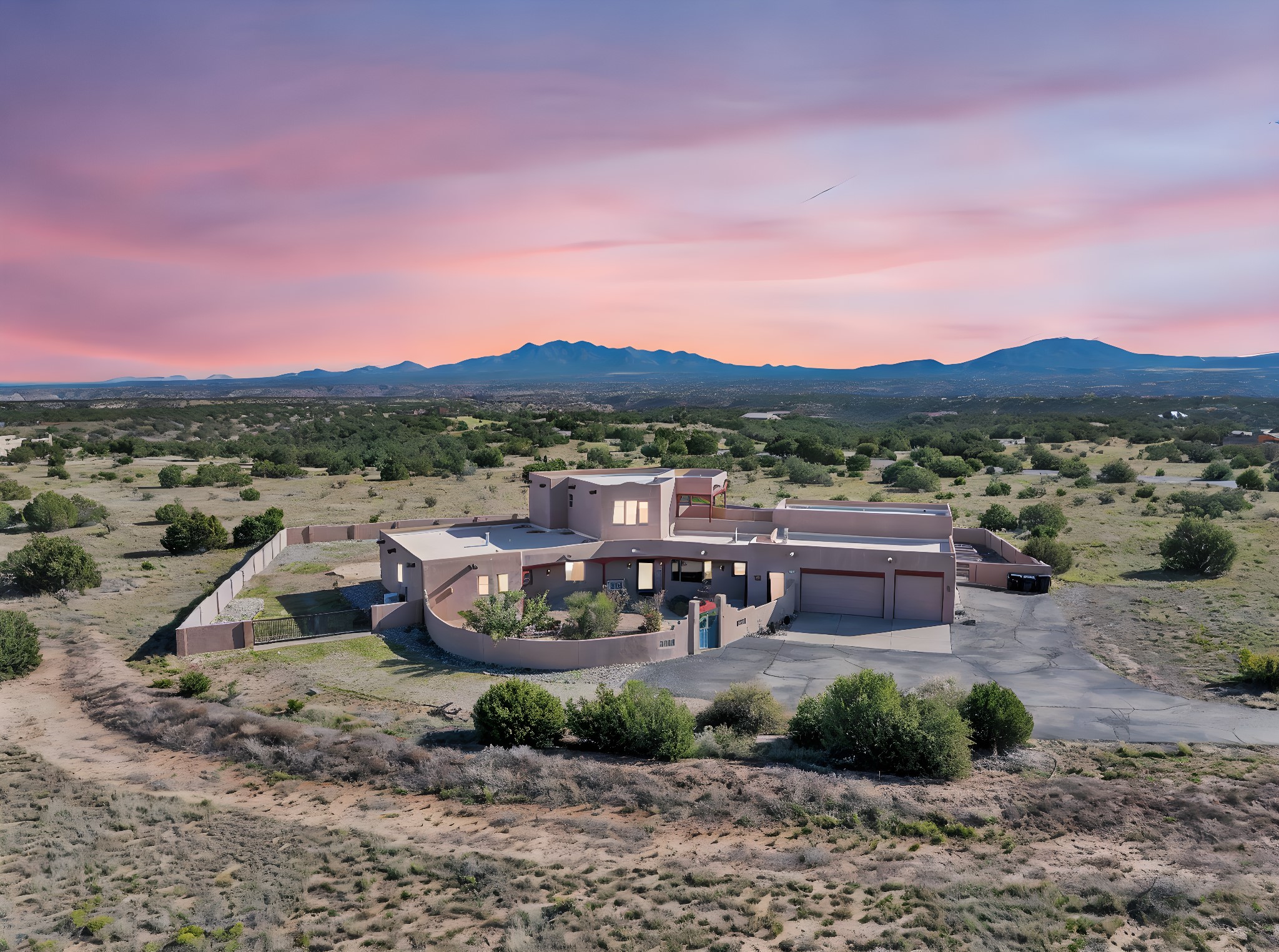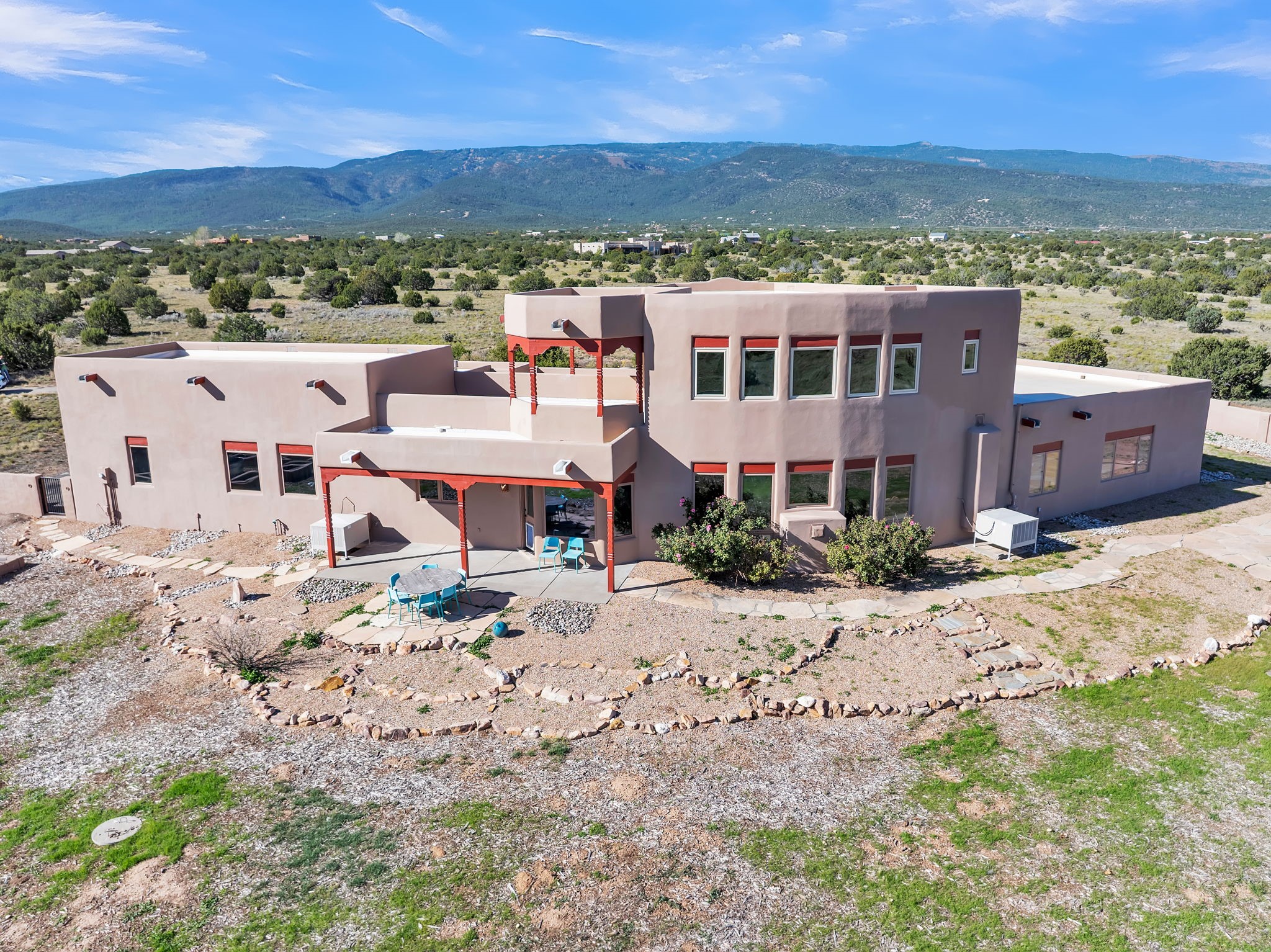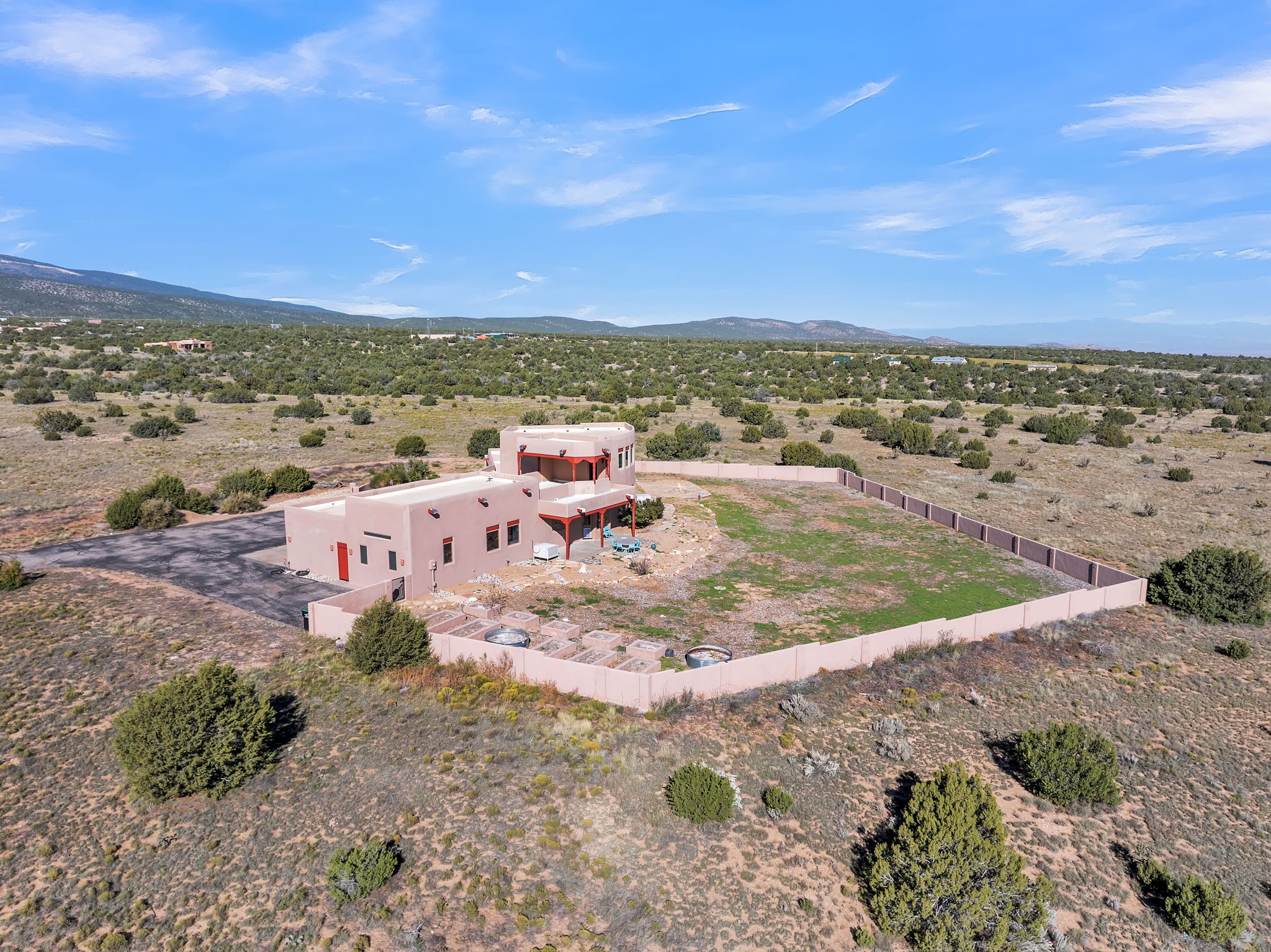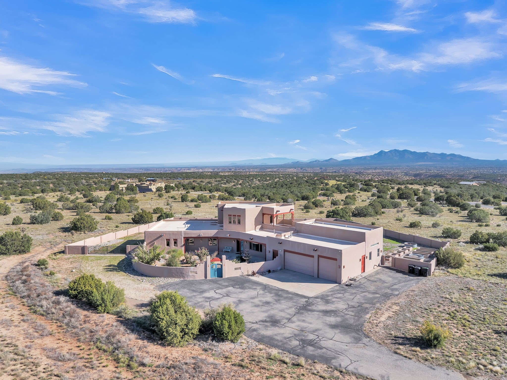 Welcome to 5 La Aguapa, Sandia Park, NM Experience luxury rural living in San Pedro Creek Estates! This custom 4,000+ sq ft home on 10.57 acres offers breathtaking views of five mountain ranges. Featuring 4 bedrooms, 4 baths, and two primary suites, this home combines comfort and elegance. The great room with soaring ceilings, a gas log fireplace, and panoramic views. The gourmet kitchen includes granite countertops, a built-in gas stove, pantry, and access to a workshop and three-car garage. Enjoy radiant heat, travertine tile flooring, a large utility room, and a walled backyard with access to Golden Open Space Los Duendes Trail. This is luxury rural living within reach.Situated on 10.57 acres in the prestigious San Pedro Creek Estates, this impressive 4,000+ square foot home offers refined comfort, privacy, and spectacular views of five separate mountain ranges. Featuring 4 bedroomsincluding two primary suites and 4 bathrooms, this thoughtfully designed home blends elegance with everyday functionality. The spacious great room showcases a gas log fireplace and sweeping views for miles, creating a warm and inviting central gathering space. The downstairs primary suite features a large walk-in closet and a generously sized bathroom, while the upstairs primary suite includes a private balcony the perfect spot to take in the serene landscape. Enjoy cooking in the large kitchen, complete with granite countertops, a built-in gas stove, ample cabinetry, a nice-sized pantry, and access to a spacious workshop and three-car garage perfect for hobbies, projects, or extra storage. The home is equipped with efficient radiant heat and features travertine tile throughout the downstairs, adding both beauty and functionality. A spacious utility room includes a sink and plenty of storage. Outside, you'll find a large walled-in backyard, ideal for relaxing, entertaining, or pets. The property also includes private gate access (key fob provided) to the Golden Open Space Los Duendes Trail, offering opportunities for hiking, biking, and horseback riding. Ideally located, this home is just 32 miles from Albuquerque, offering all the amenities of city living, 21 miles from Madrid, known for its artistic charm, and 50 miles from Santa Fe, celebrated for its rich culture and dining.POVEvery window frames a different view five mountain ranges that change colors with the seasons. It's peaceful, quiet, and filled with natural light. Mornings start with coffee on the balcony, and evenings end by the fire watching the sunset roll across the hills. There's room to breathe, create, and enjoy life at a slower pace yet you're still close enough to everything you need. It's truly the best of both worlds.