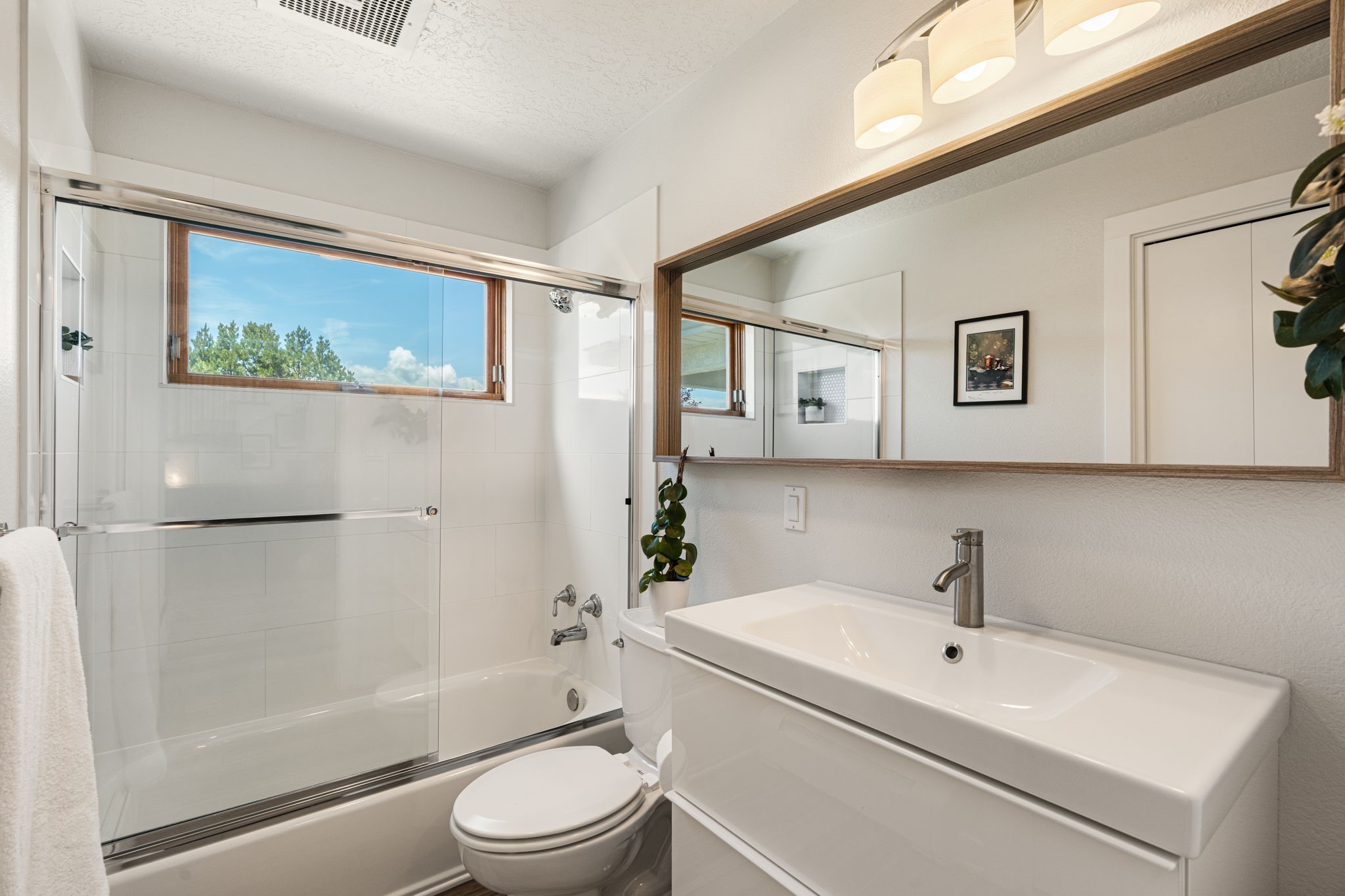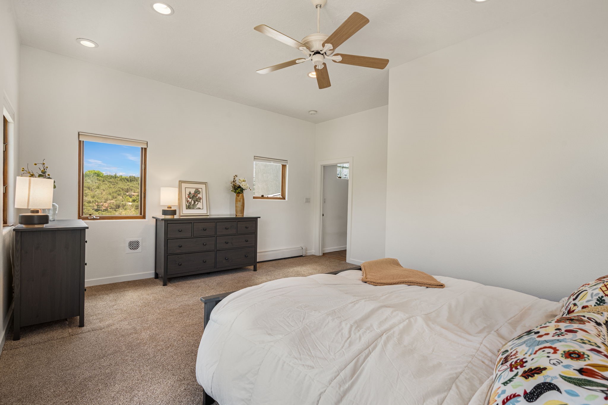 This updated home situated on 4.68 acres & 2 lots, zoned A-2, NO HOA & additional 820 sq. ft Bunker like basement is one of the most unique in the east mountains. It features an oversized 33.9x24 tandem style garage, automatic gate, vaulted ceilings, natural light, exposed wood beams, large casement windows, multiple outdoor seating areas, hot tub purchased 11/1/24, community water-no well. 3 sources of heat: Radiant baseboard, 6 Mini Splits& Wood stove. Solar panels that will be paid off by the Seller with acceptable offer. The views are stunning! The home is open & inviting. The property will take your breath away. Outdoor features include an oversized chair facing the Sandias for a beautiful sunset view, access through back gate, chicken coop and goat pen and much more