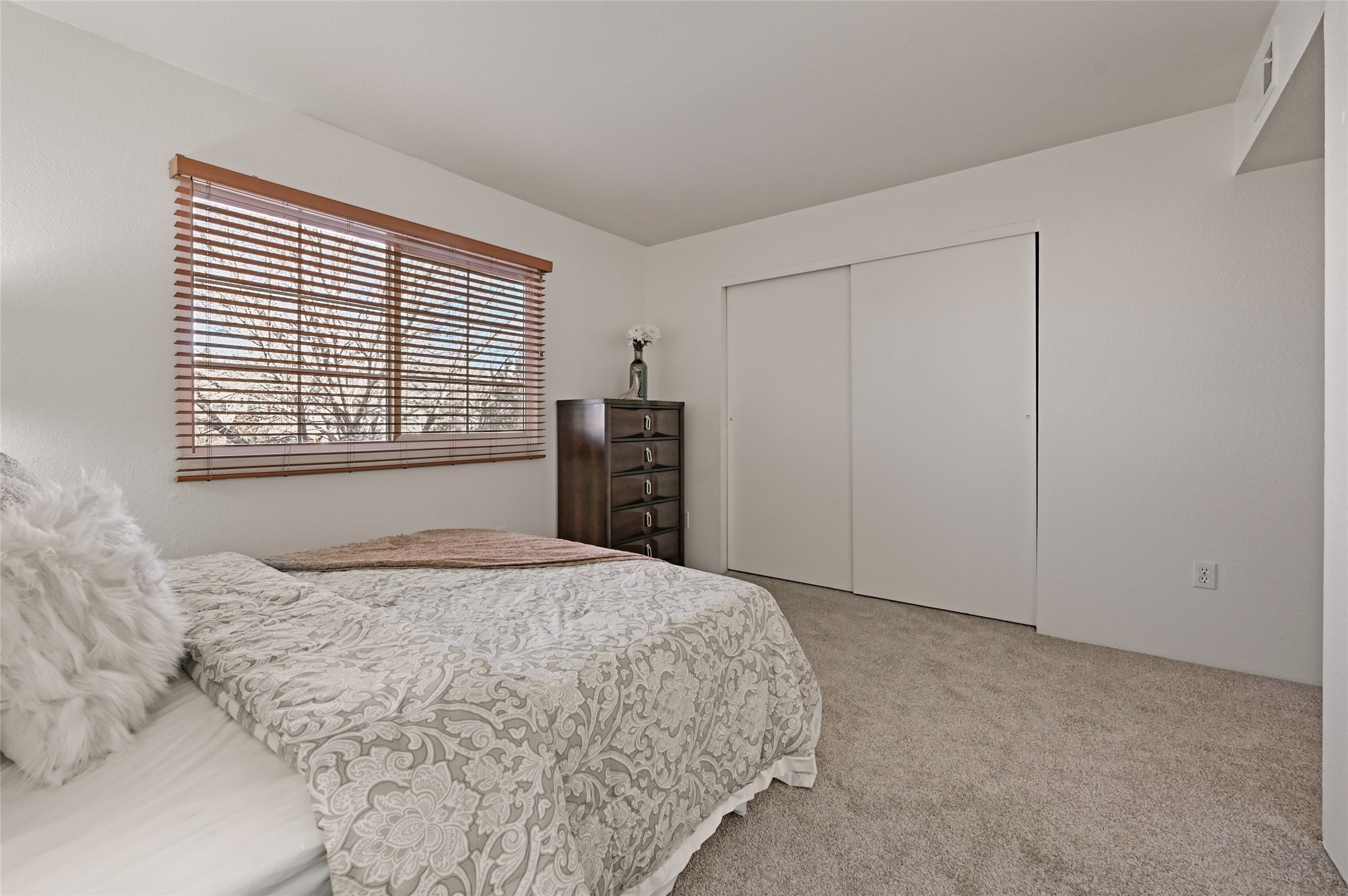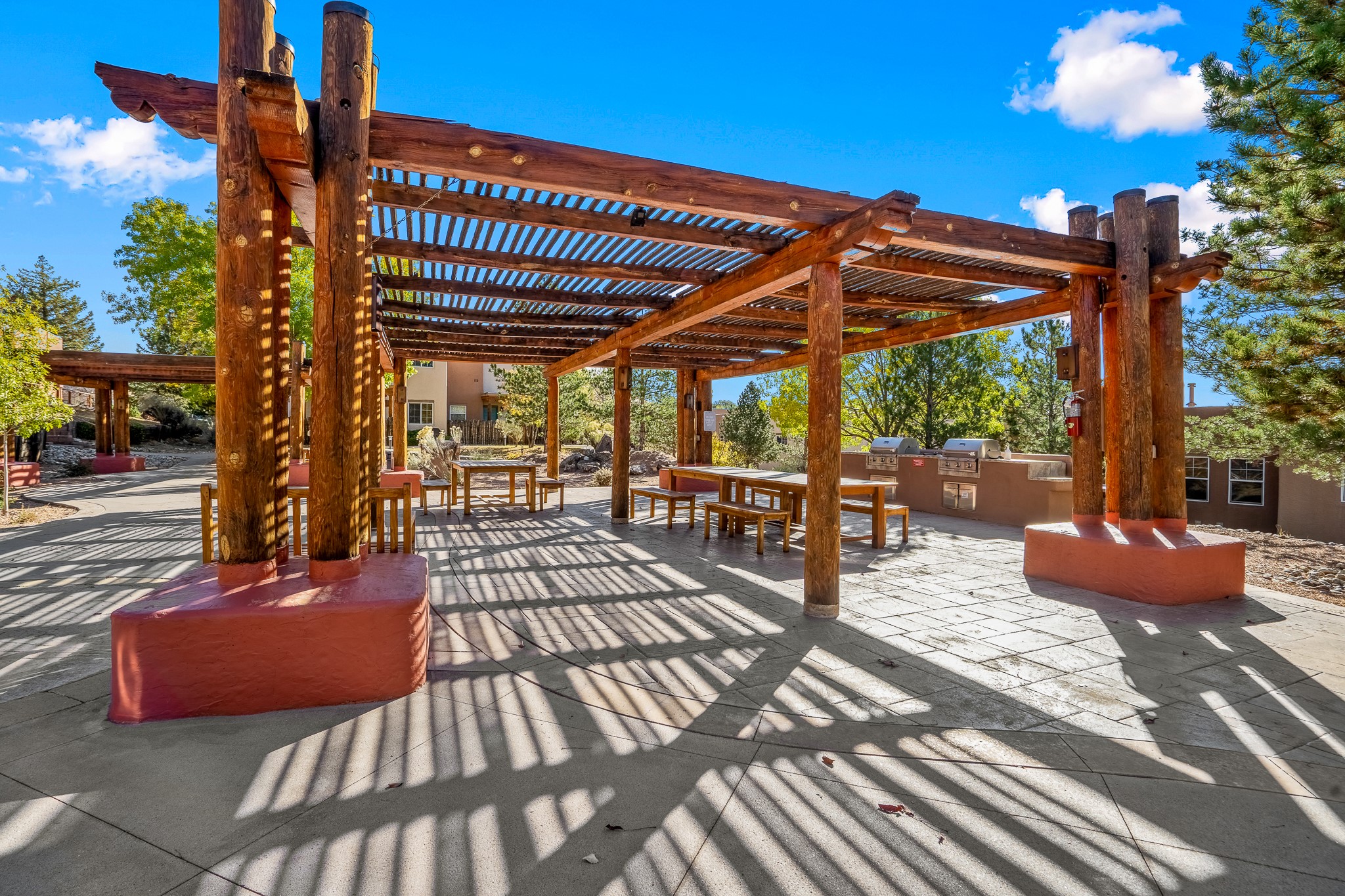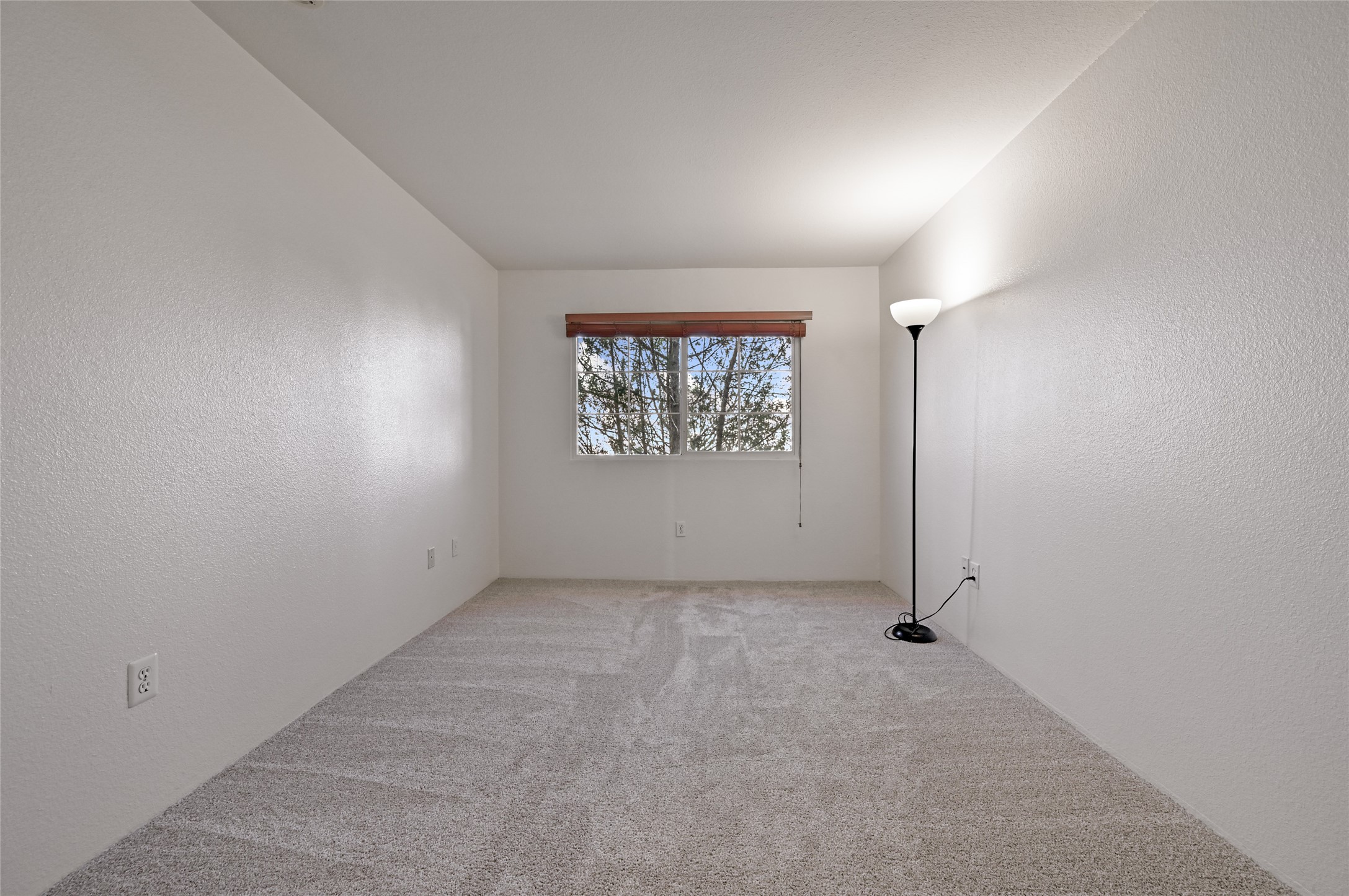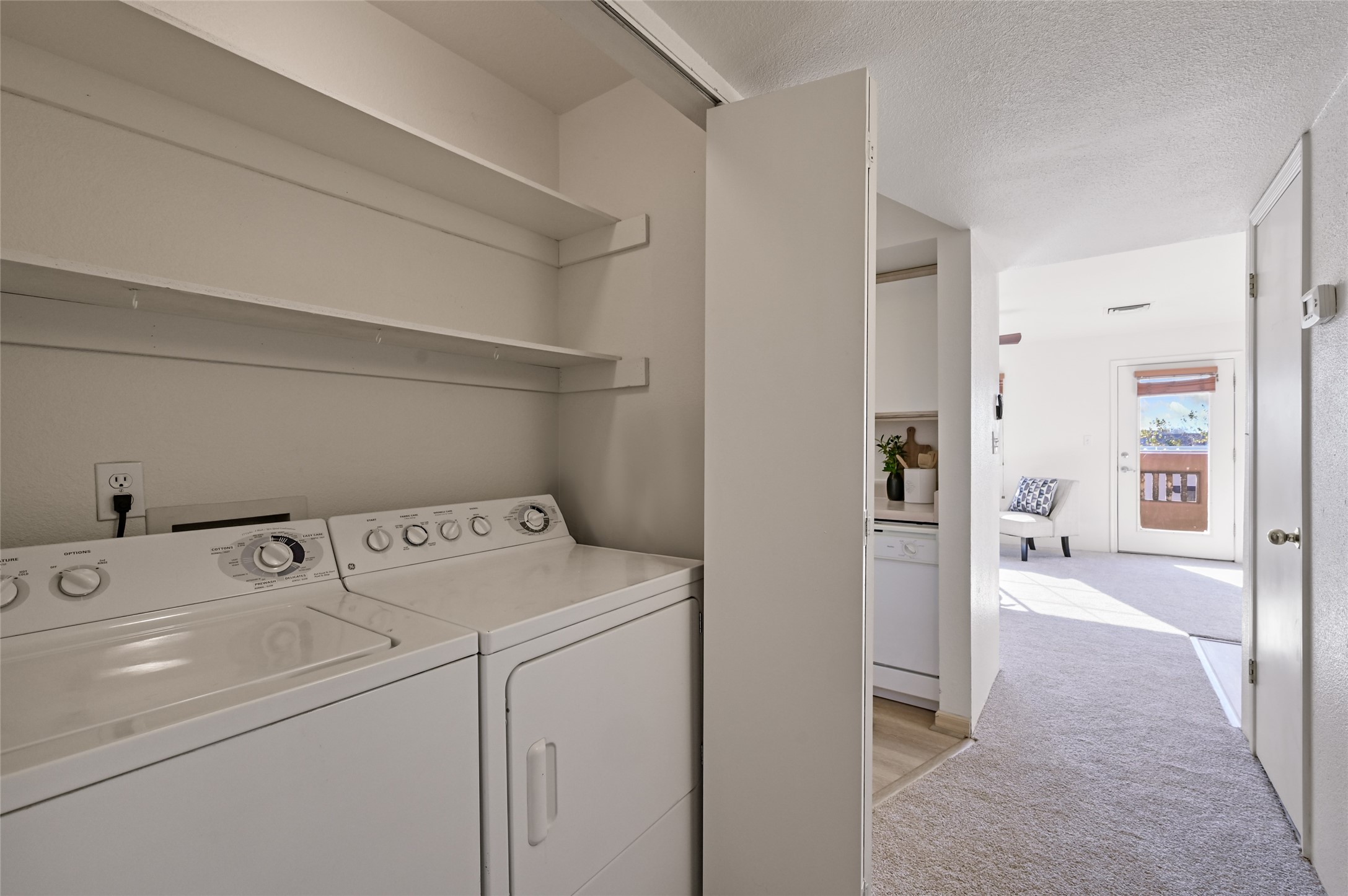 Deluxe 900+sf 2 bed/2 bath condo in highly sought after, centrally located, high amenity Dos Santos complex! This 2nd floor unit has a bright South facing living room w/direct access to balcony that has plenty of space for a table and chairs to drink in the forever skies and mountain vistas. Classic kitchen with strong counter space, dishwasher, and space for stools. Brand new carpet + tile flooring throughout including in primary bedroom. In unit washer/dryer. Unit could be great for live/work setup, investment property, part time Santa Fe getaway, or your forever home. On site parking available. Tons of amenities including clubhouse, gym, pool, outdoor grills, and much more!