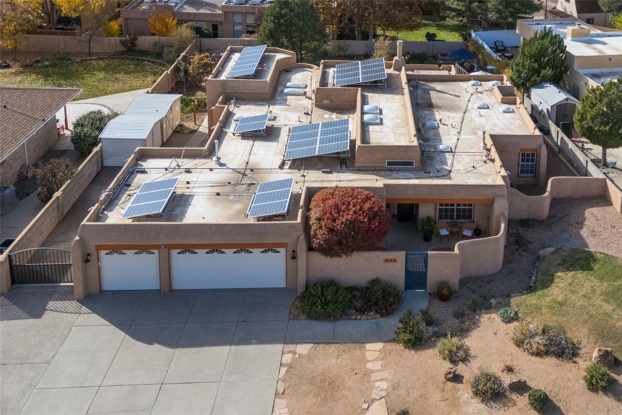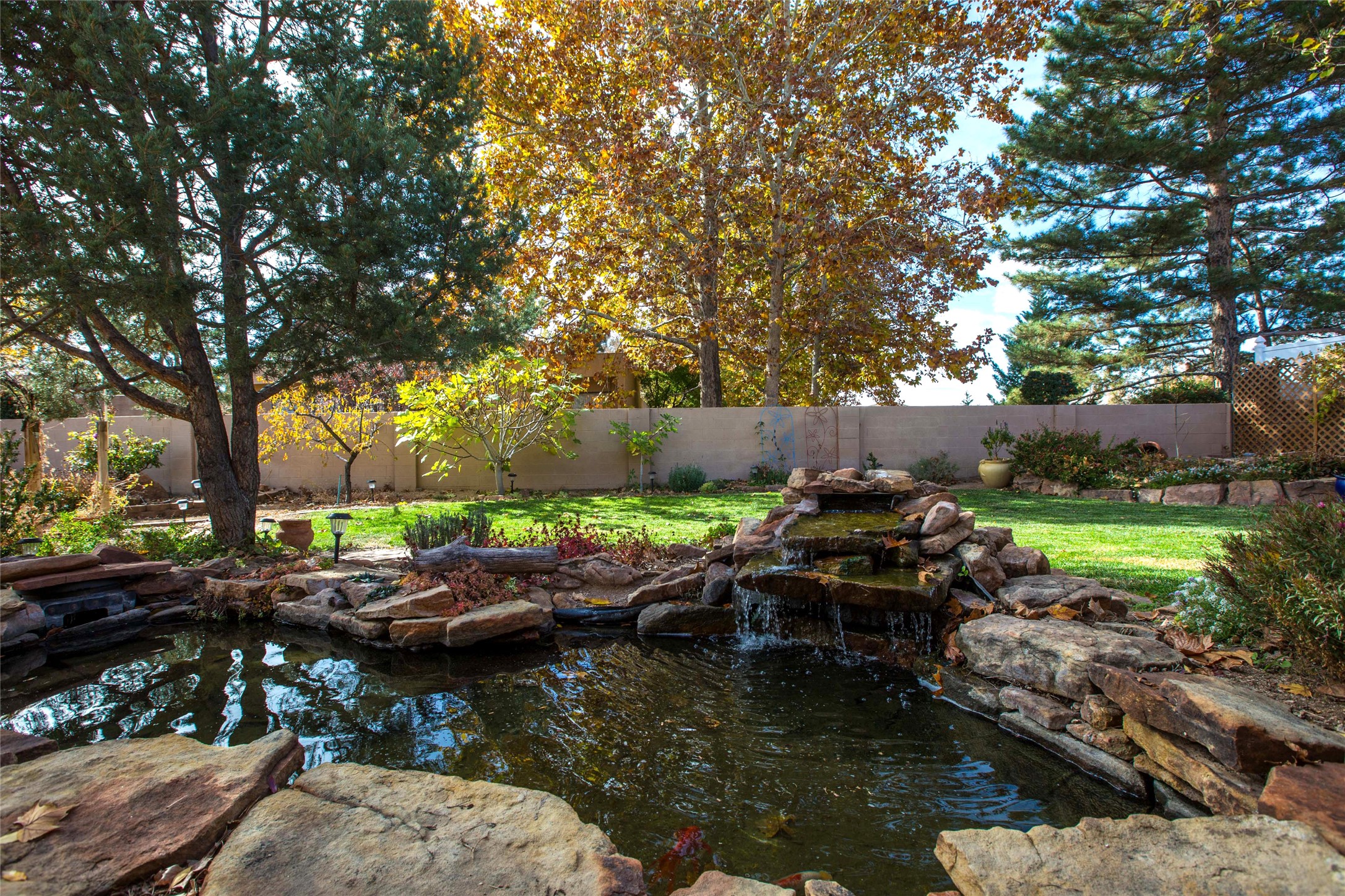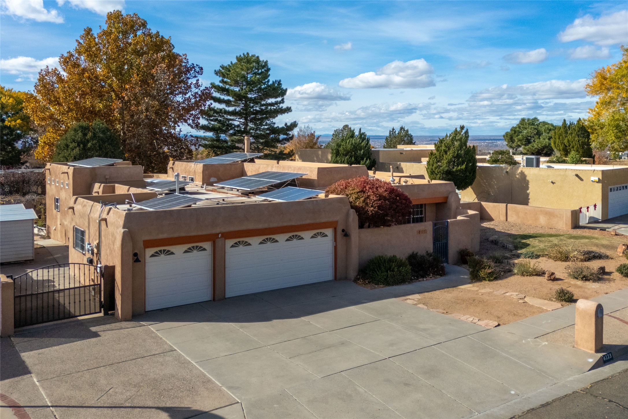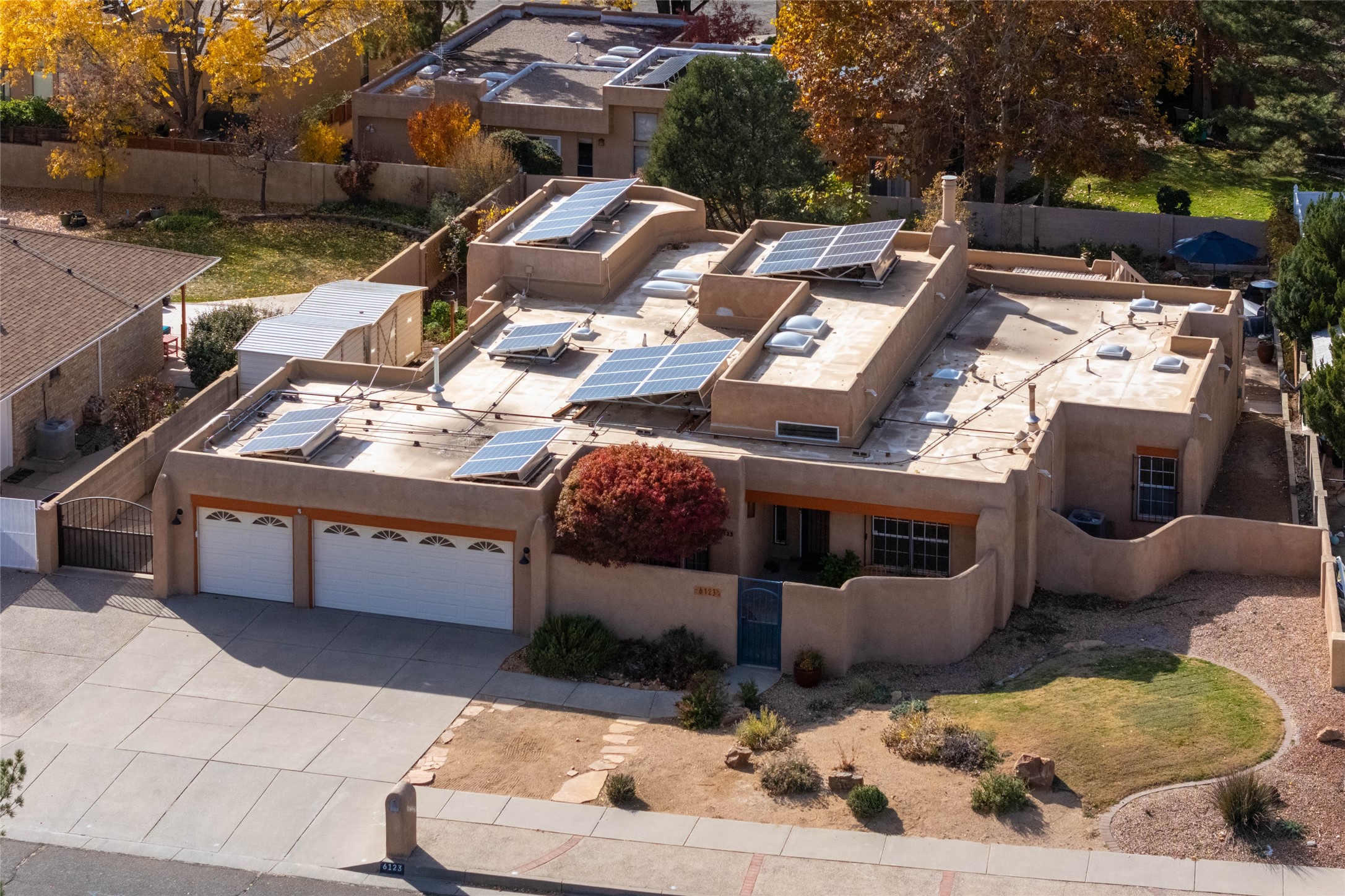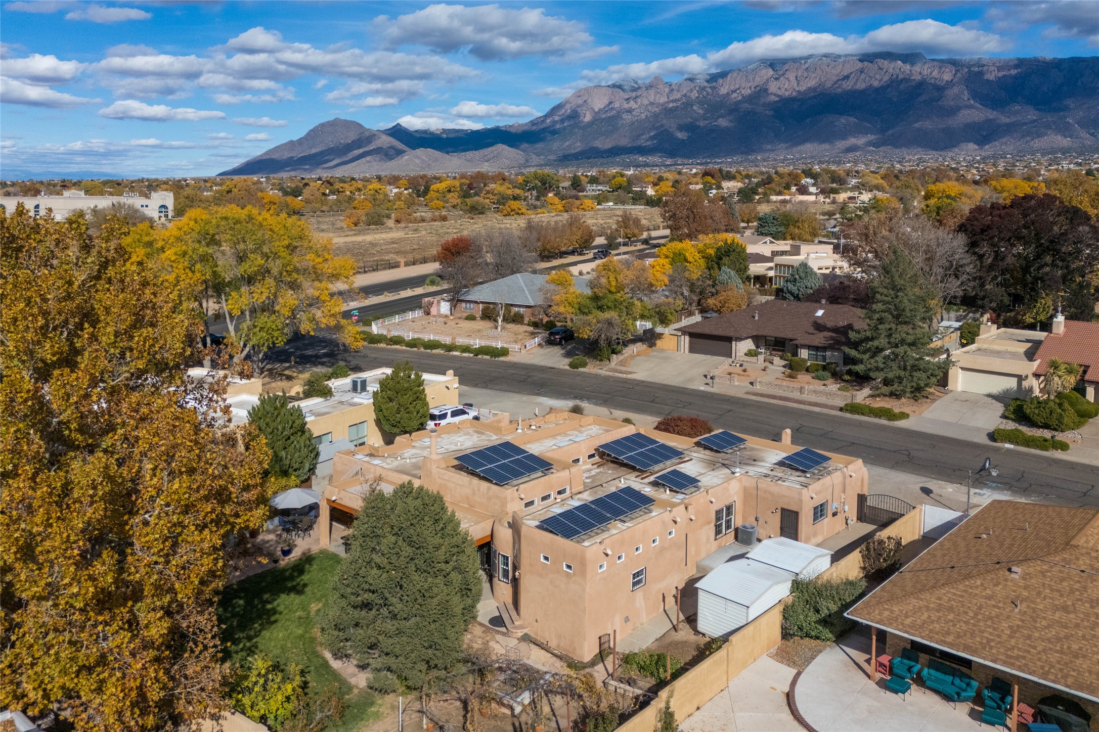 Southwestern beauty in coveted Academy Estates--spacious, single-story, updated, and powered by 30+panel, fully-owned solar for exceptional efficiency. Bright, inviting home offering 4 bedrooms (2 with ensuite baths) plus a dedicated office/2nd living/possible 5th bedroom, and formal dining. High beamed ceilings, clerestory windows, 12 skylights, and a classic kiva fireplace create warm New Mexico character throughout. The updated kitchen features modern finishes, abundant counter space, and seamless flow to the breakfast area and great room. The primary suite includes a beautifully updated bath and generous walk-in closet. Step outside to an oasis-like backyard w/ mature pear, peach, and fig trees, grapes, rock garden, pond with waterfall, and shaded covered patio perfect for entertaining. A raised view deck, accessed from the backyard, offers a peaceful spot for morning coffee or sunset unwinding with gorgeous mountain views. Major upgrades include new refrigerated air, and two new heat pump systems. A 3-car garage, rare for this area, and spacious laundry room, plus NO HOA complete this exceptional offering in Albuquerque's desirable Far North East Heights.