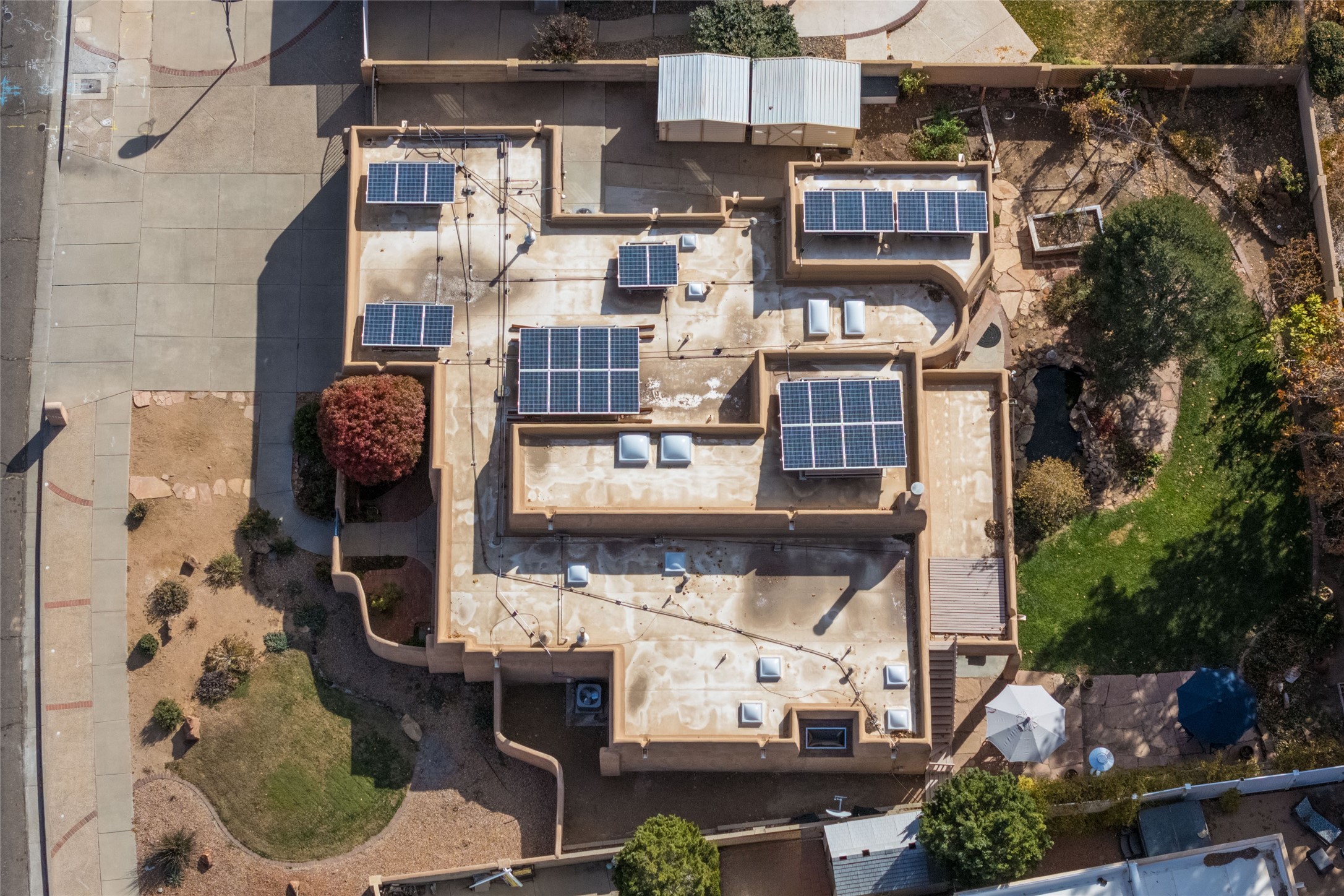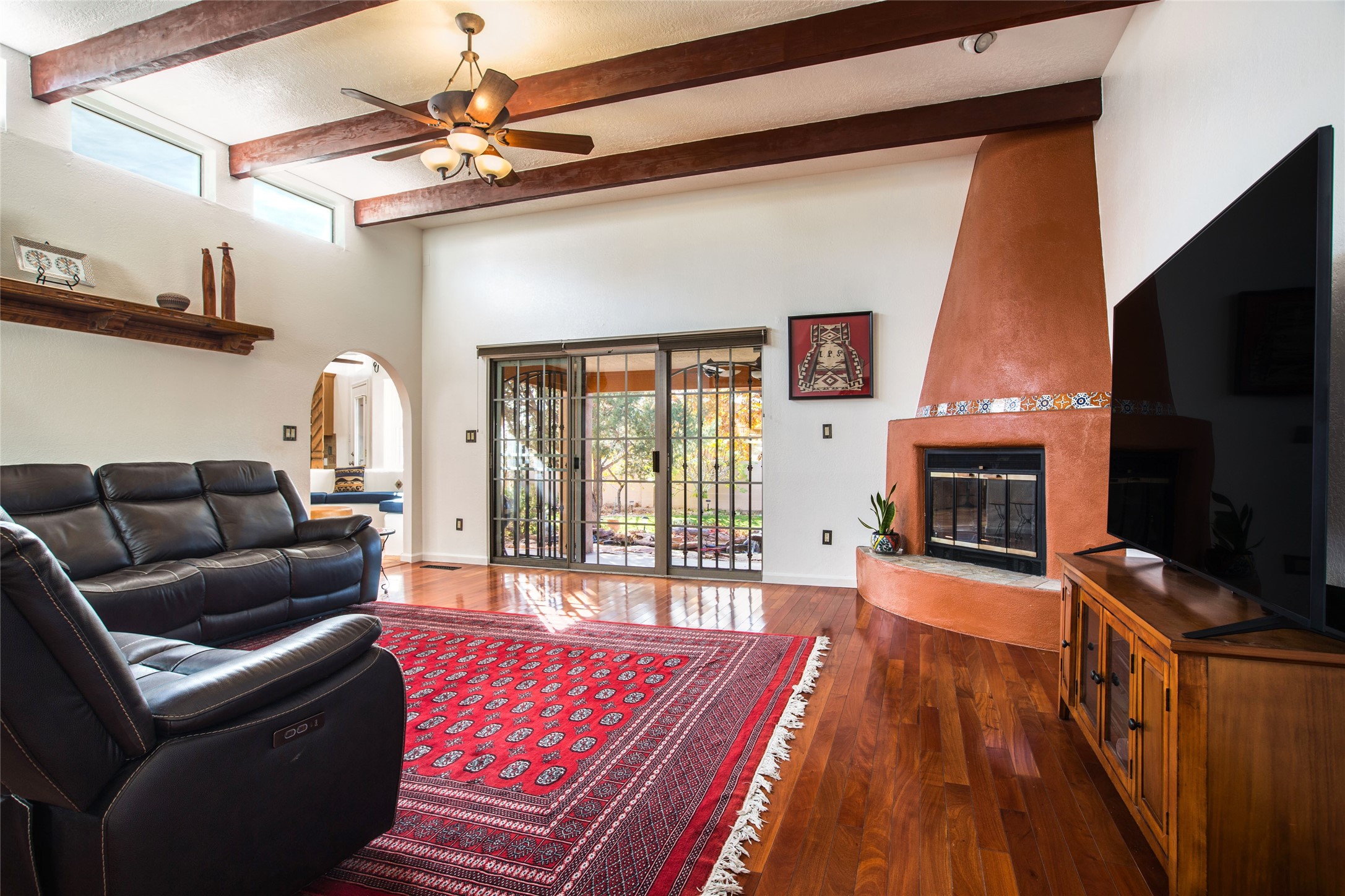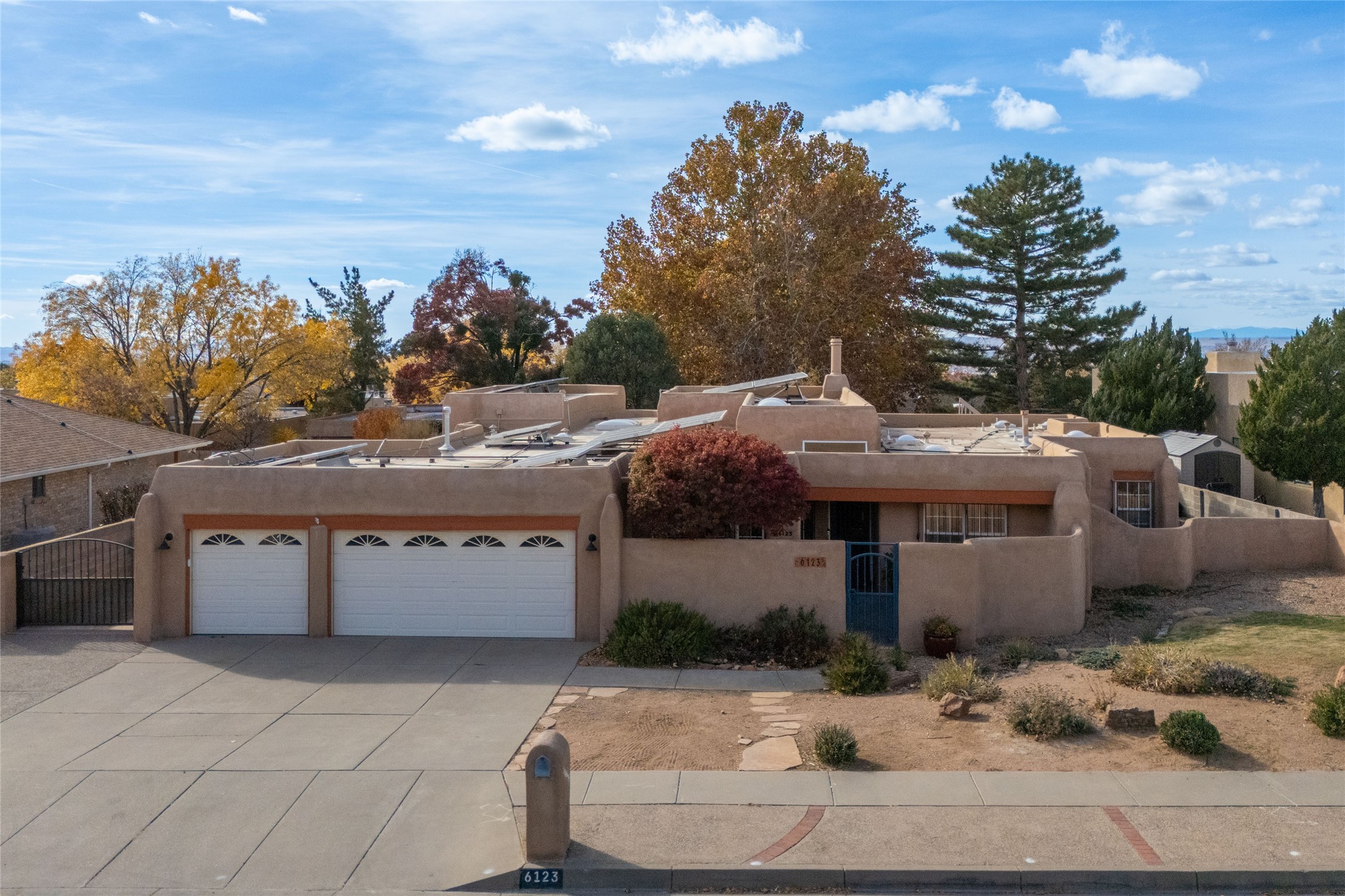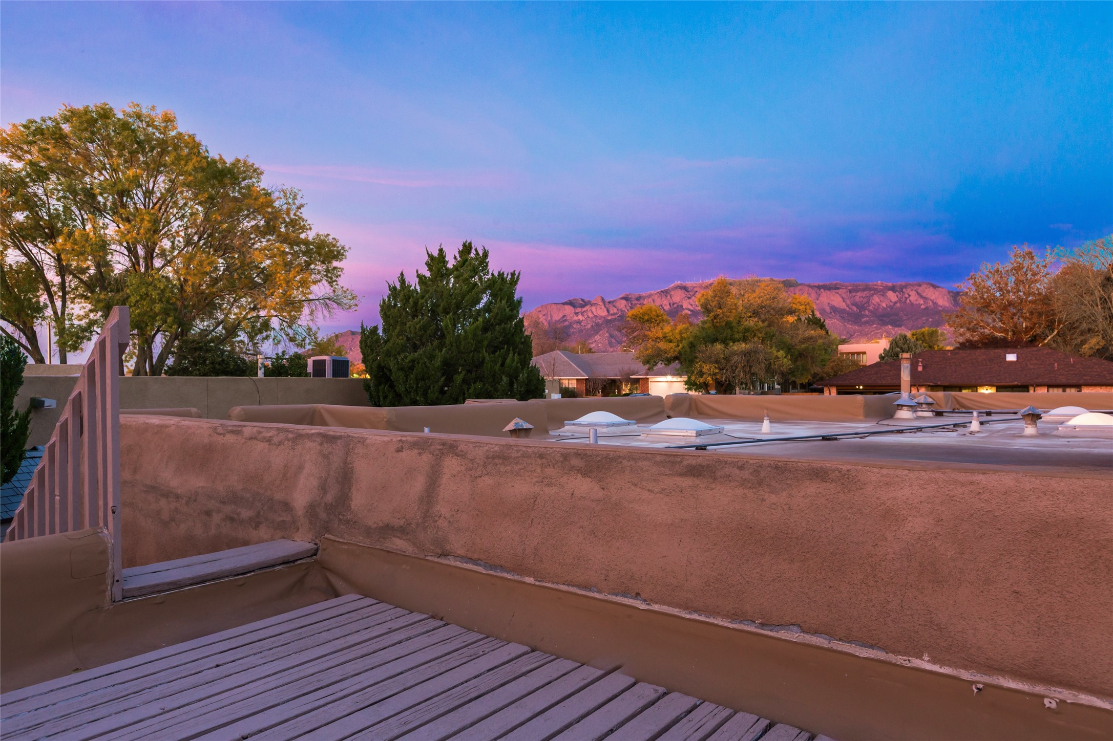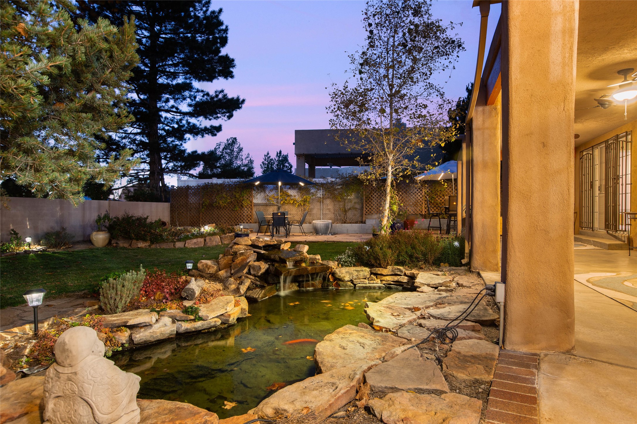 Southwestern beauty in coveted Academy Estates--spacious, single-story, updated, and powered by 30+panel, fully-owned solar for exceptional efficiency. Bright, inviting home offering 4 bedrooms (2 with ensuite baths) plus a dedicated office/2nd living/possible 5th bedroom, and formal dining. High beamed ceilings, clerestory windows, 12 skylights, and a classic kiva fireplace create warm New Mexico character throughout. The updated kitchen features modern finishes, abundant counter space, and seamless flow to the breakfast area and great room. The primary suite includes a beautifully updated bath and generous walk-in closet. Step outside to an oasis-like backyard w/ mature pear, peach, and fig trees, grapes, rock garden, pond with waterfall, and shaded covered patio perfect for entertaining. A raised view deck, accessed from the backyard, offers a peaceful spot for morning coffee or sunset unwinding with gorgeous mountain views. Major upgrades include new refrigerated air, and two new heat pump systems. A 3-car garage, rare for this area, and spacious laundry room, plus NO HOA complete this exceptional offering in Albuquerque's desirable Far North East Heights.