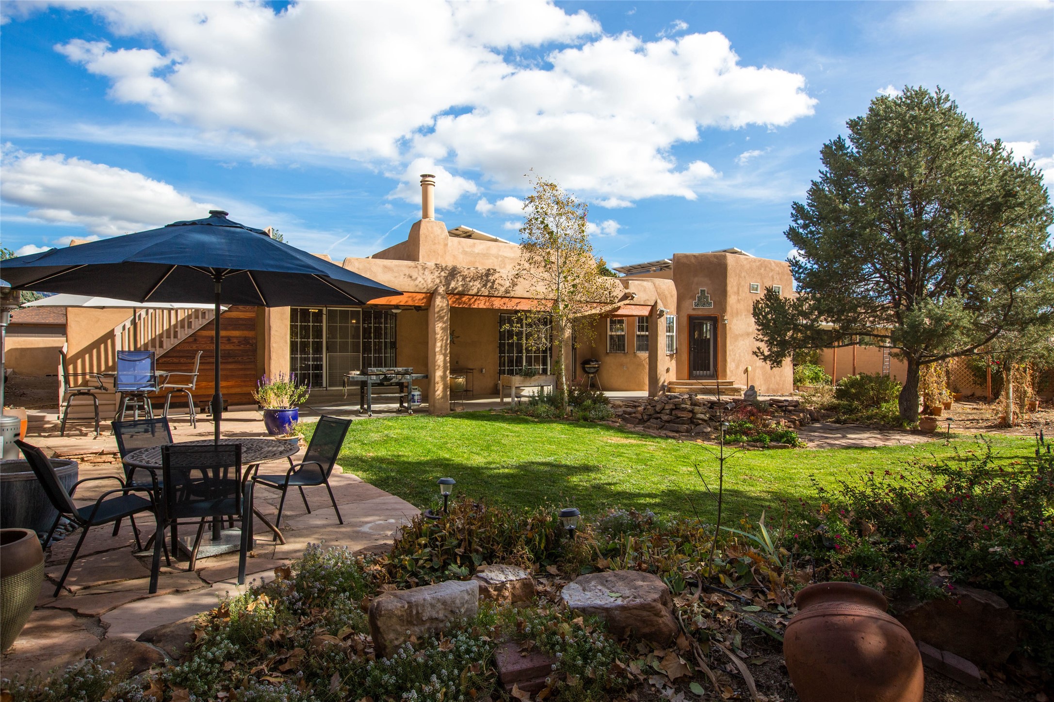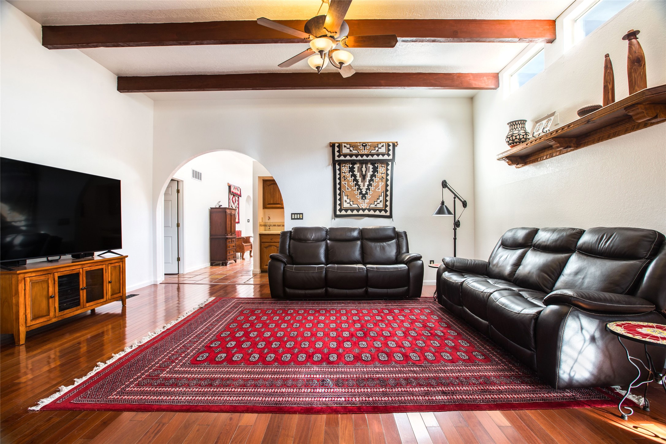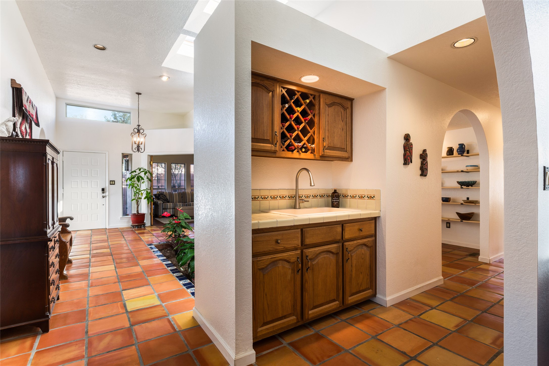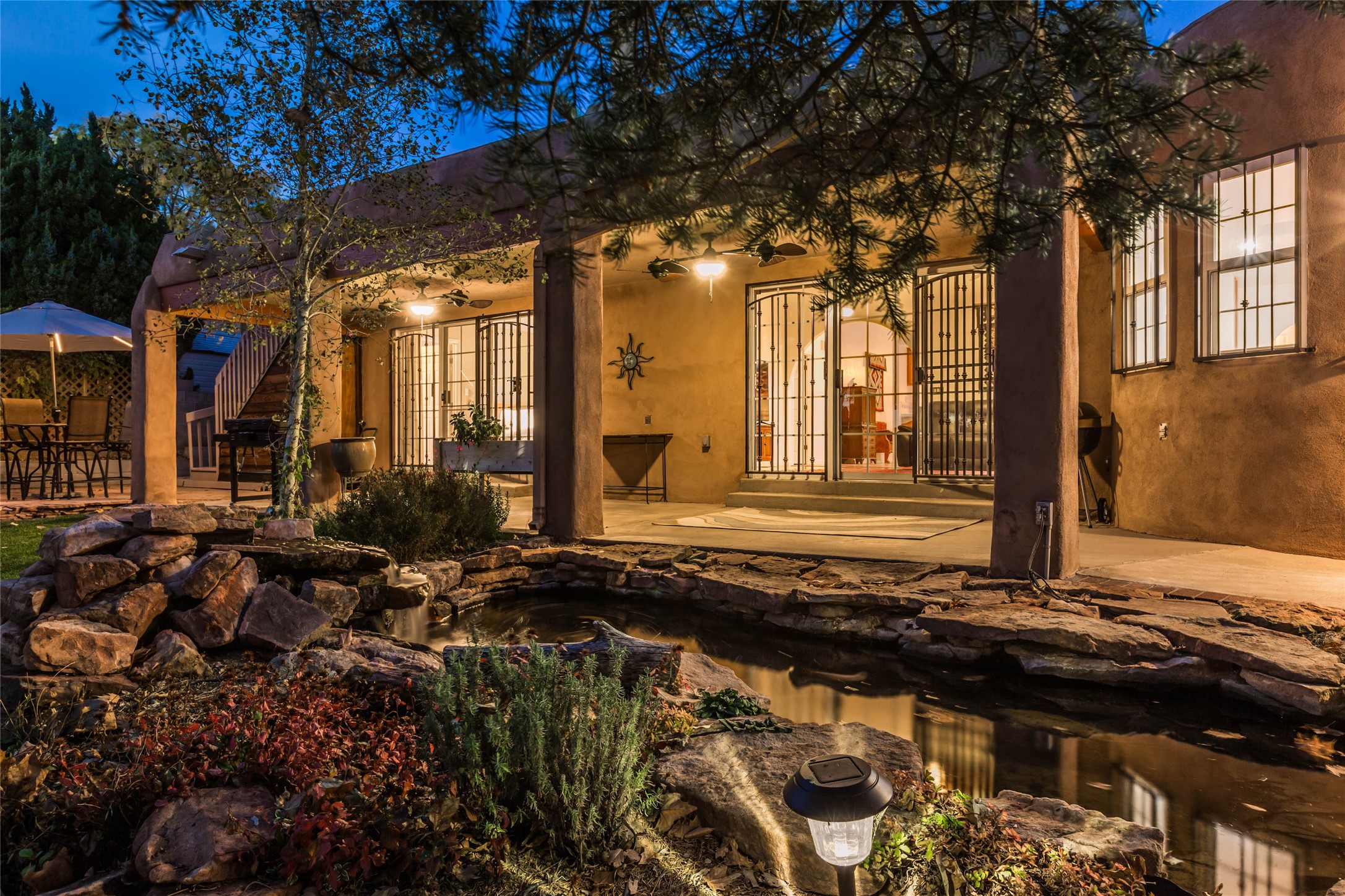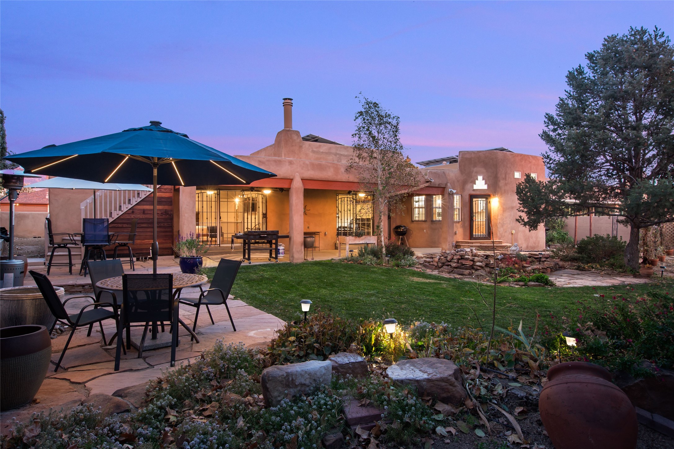 Southwestern beauty in coveted Academy Estates--spacious, single-story, updated, and powered by 30+panel, fully-owned solar for exceptional efficiency. Bright, inviting home offering 4 bedrooms (2 with ensuite baths) plus a dedicated office/2nd living/possible 5th bedroom, and formal dining. High beamed ceilings, clerestory windows, 12 skylights, and a classic kiva fireplace create warm New Mexico character throughout. The updated kitchen features modern finishes, abundant counter space, and seamless flow to the breakfast area and great room. The primary suite includes a beautifully updated bath and generous walk-in closet. Step outside to an oasis-like backyard w/ mature pear, peach, and fig trees, grapes, rock garden, pond with waterfall, and shaded covered patio perfect for entertaining. A raised view deck, accessed from the backyard, offers a peaceful spot for morning coffee or sunset unwinding with gorgeous mountain views. Major upgrades include new refrigerated air, and two new heat pump systems. A 3-car garage, rare for this area, and spacious laundry room, plus NO HOA complete this exceptional offering in Albuquerque's desirable Far North East Heights.