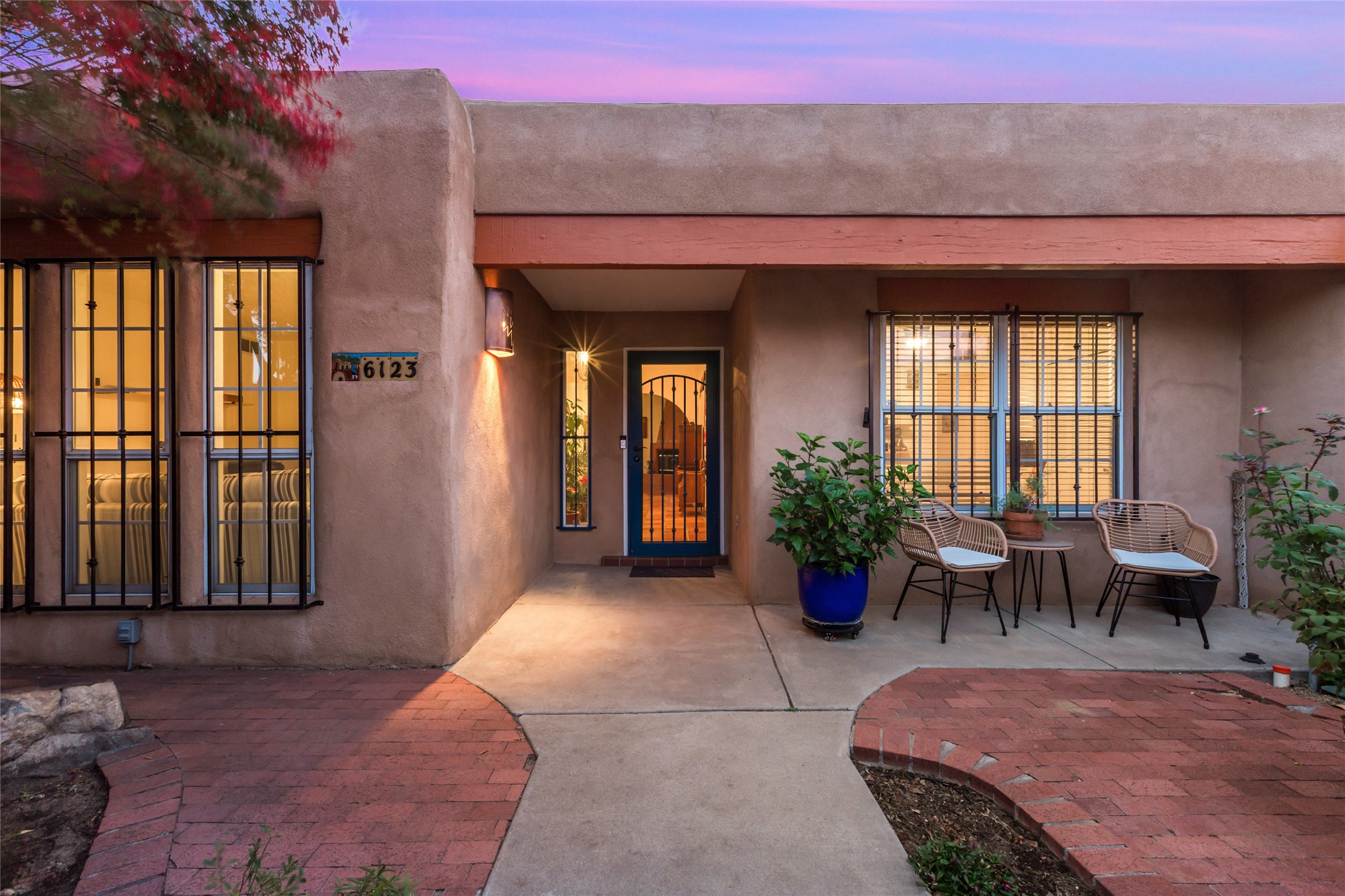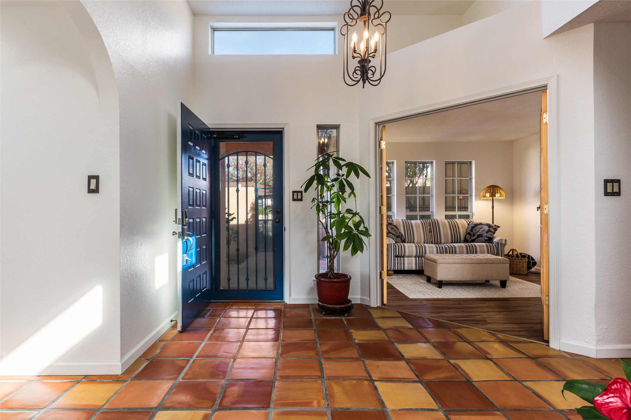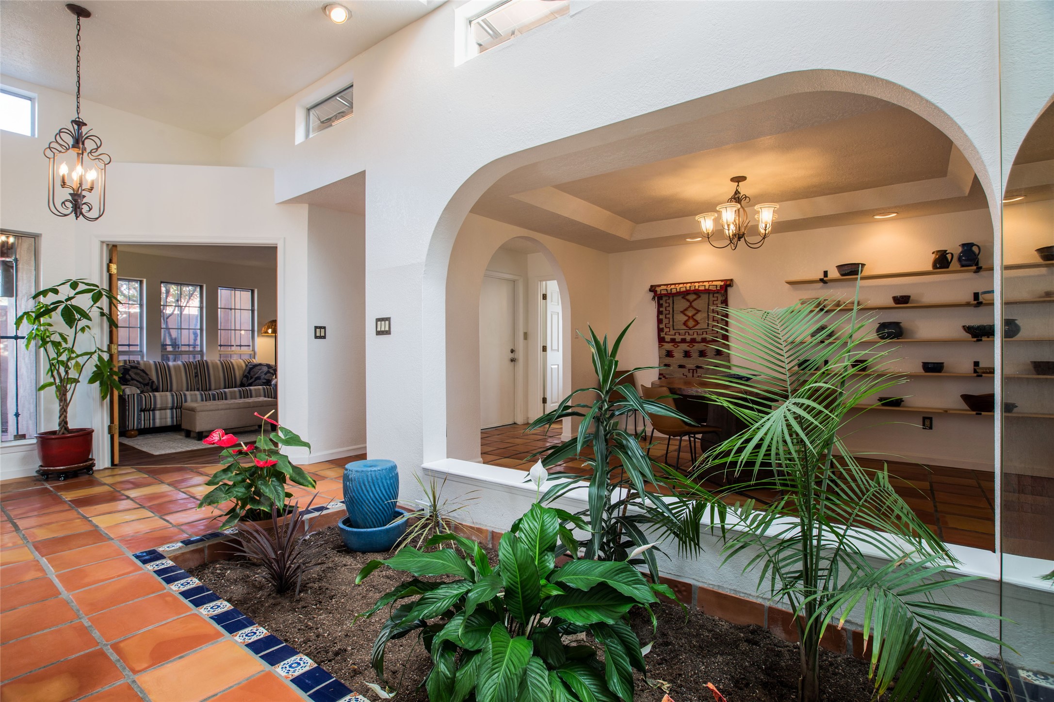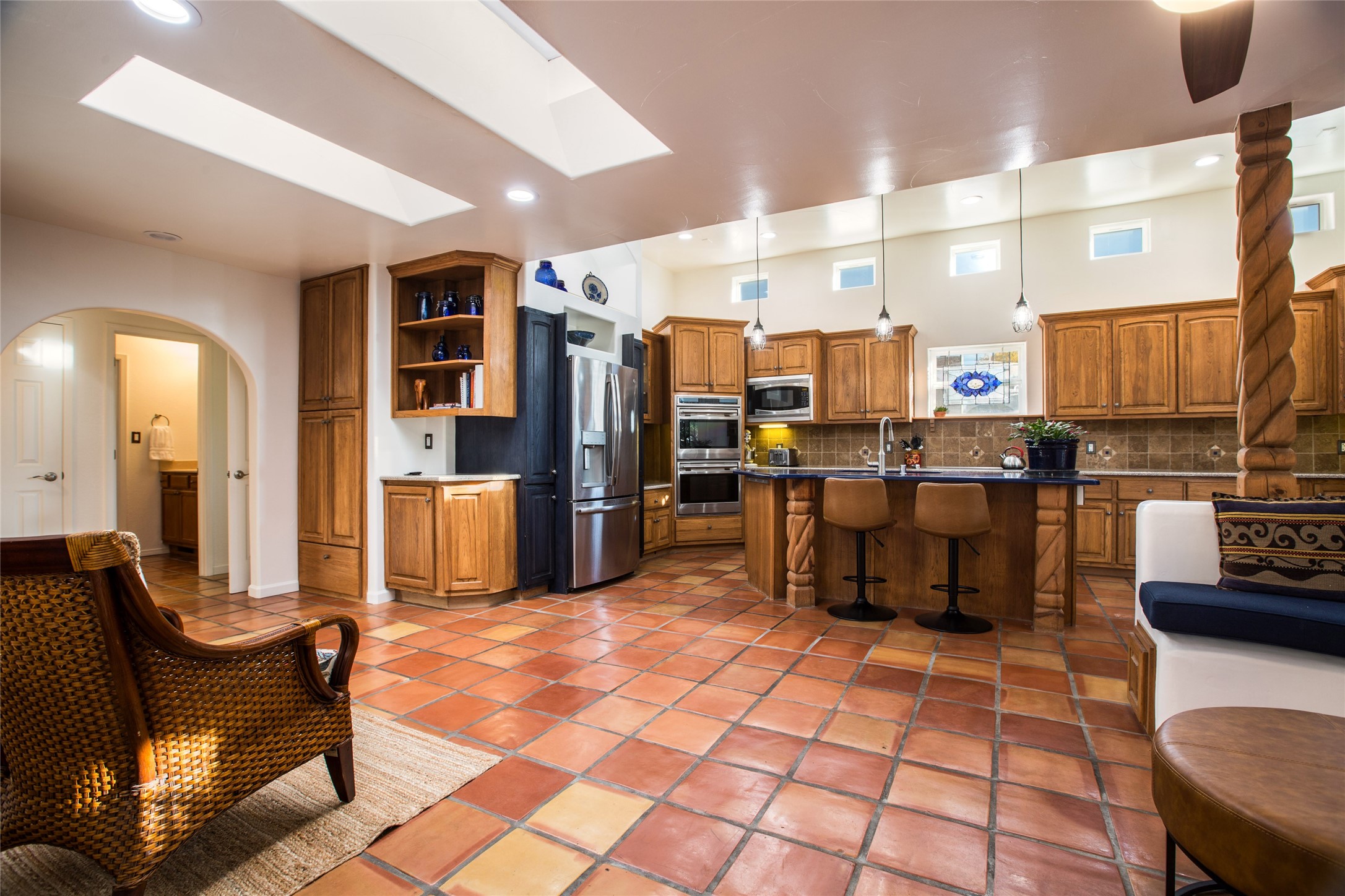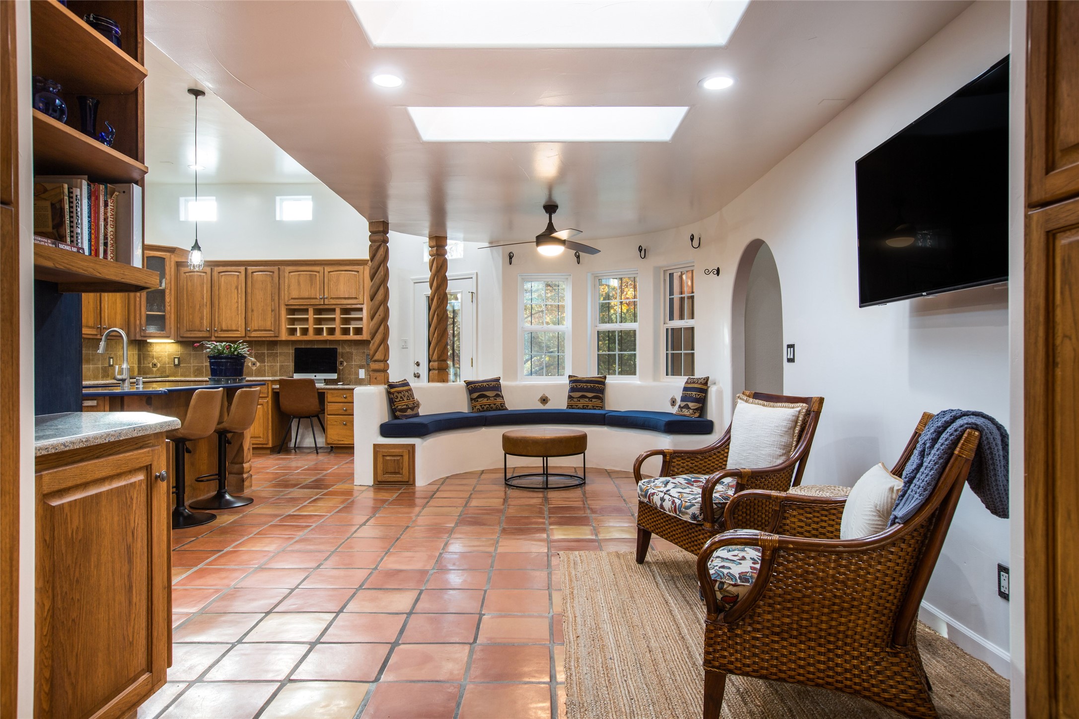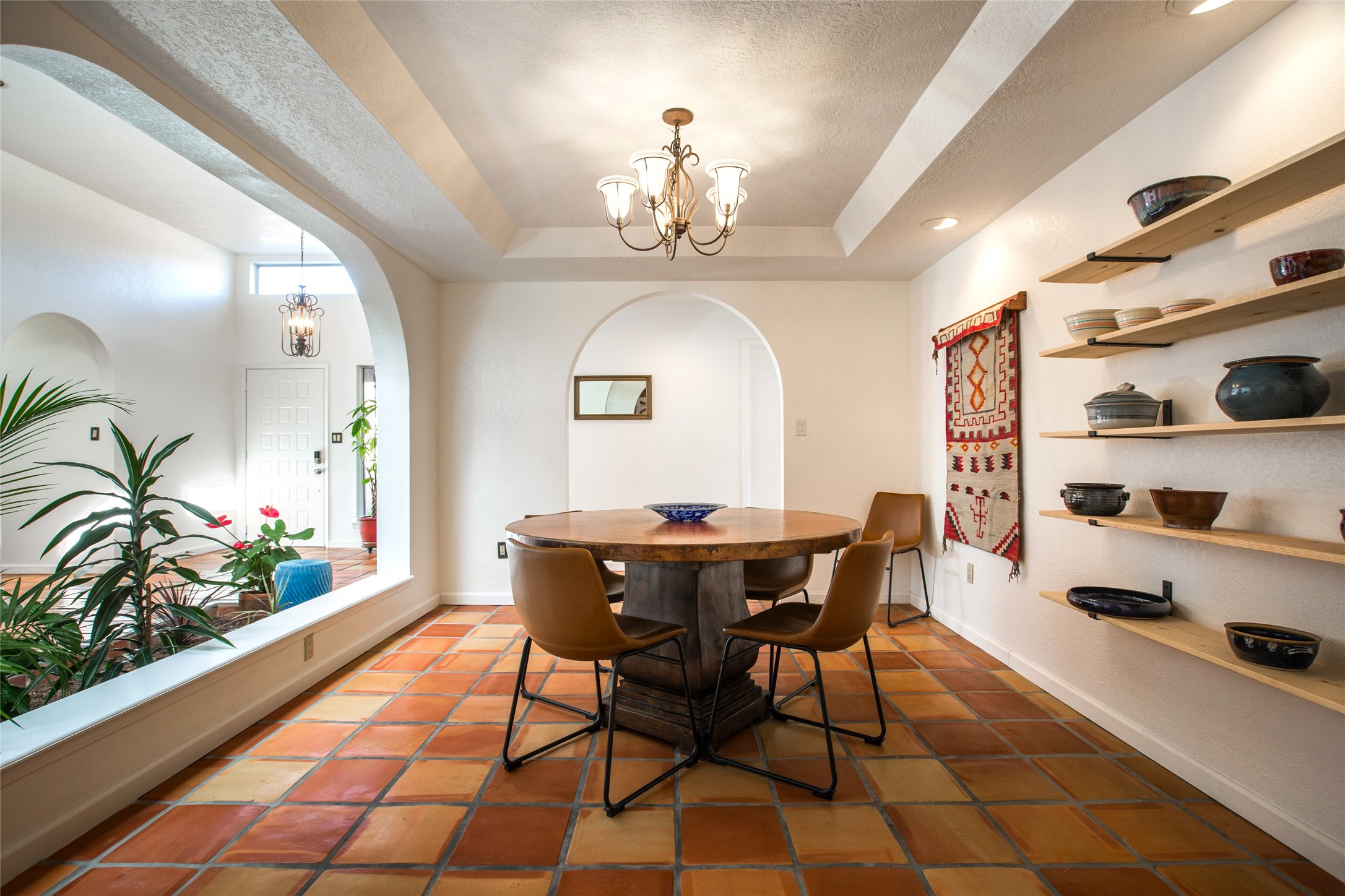 Southwestern beauty in coveted Academy Estates--spacious, single-story, updated, and powered by 30+panel, fully-owned solar for exceptional efficiency. Bright, inviting home offering 4 bedrooms (2 with ensuite baths) plus a dedicated office/2nd living/possible 5th bedroom, and formal dining. High beamed ceilings, clerestory windows, 12 skylights, and a classic kiva fireplace create warm New Mexico character throughout. The updated kitchen features modern finishes, abundant counter space, and seamless flow to the breakfast area and great room. The primary suite includes a beautifully updated bath and generous walk-in closet. Step outside to an oasis-like backyard w/ mature pear, peach, and fig trees, grapes, rock garden, pond with waterfall, and shaded covered patio perfect for entertaining. A raised view deck, accessed from the backyard, offers a peaceful spot for morning coffee or sunset unwinding with gorgeous mountain views. Major upgrades include new refrigerated air, and two new heat pump systems. A 3-car garage, rare for this area, and spacious laundry room, plus NO HOA complete this exceptional offering in Albuquerque's desirable Far North East Heights.