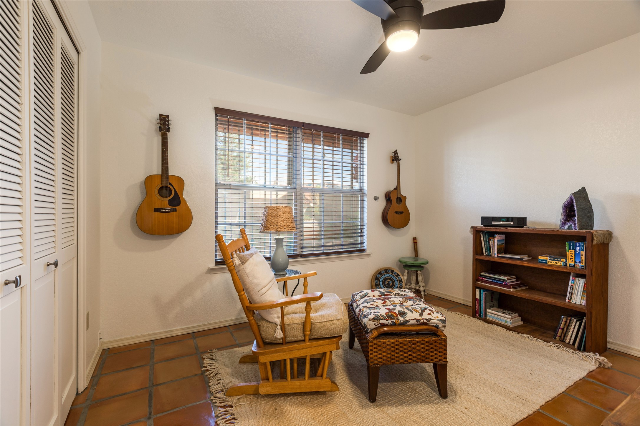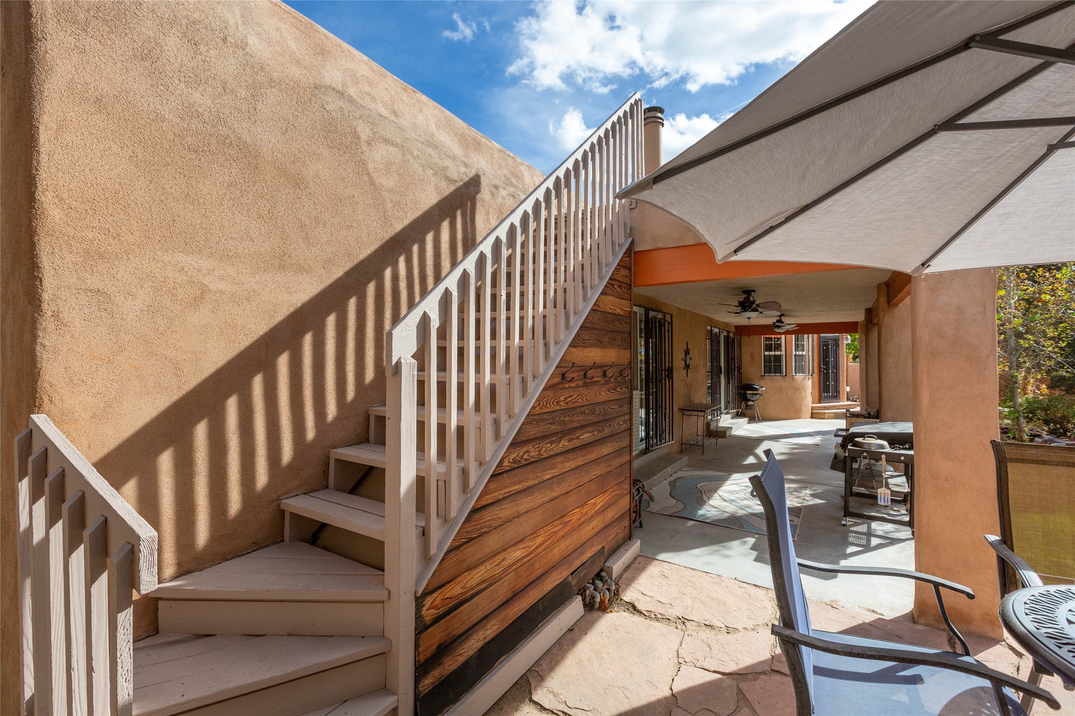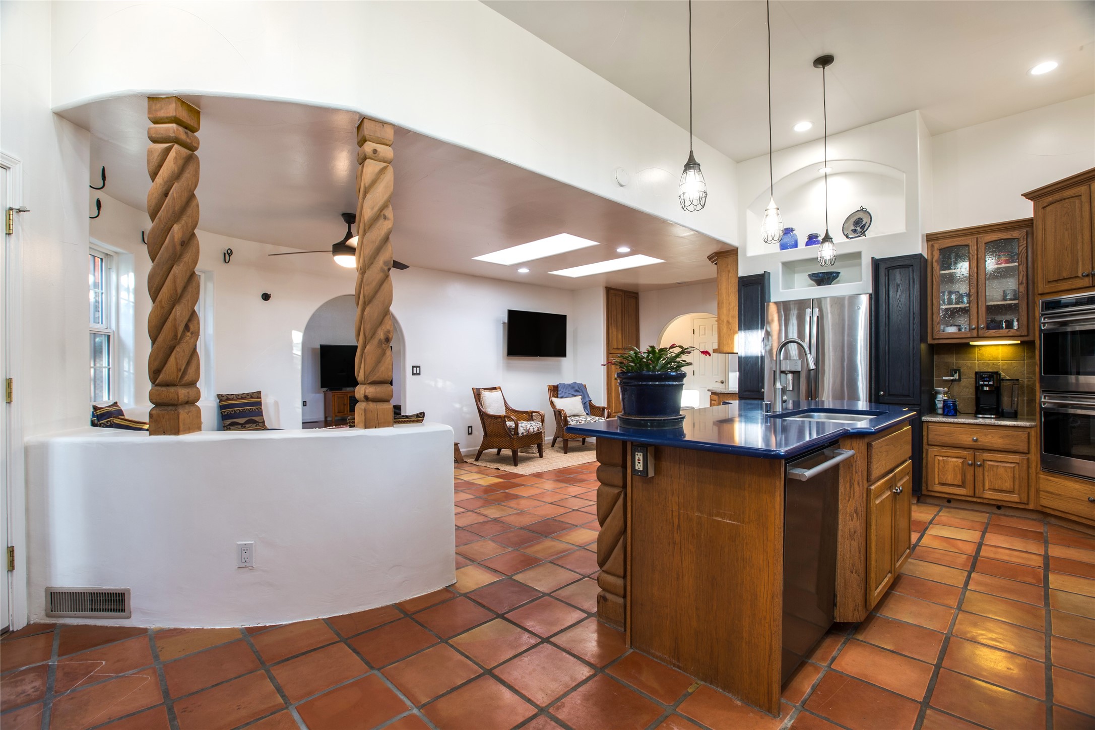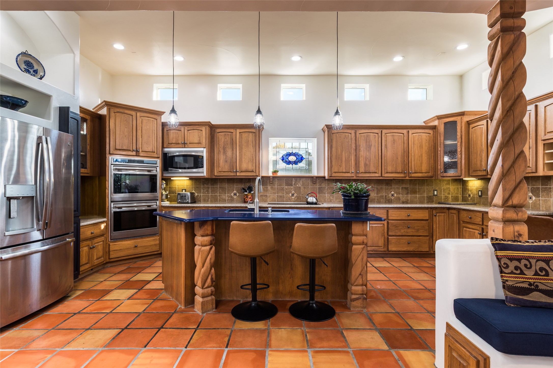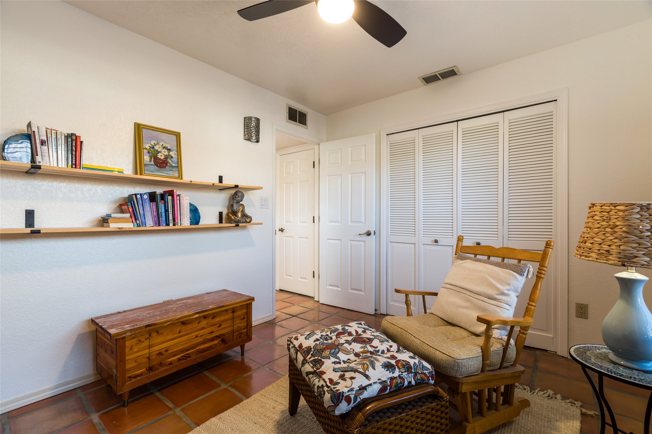 Southwestern beauty in coveted Academy Estates--spacious, single-story, updated, and powered by 30+panel, fully-owned solar for exceptional efficiency. Bright, inviting home offering 4 bedrooms (2 with ensuite baths) plus a dedicated office/2nd living/possible 5th bedroom, and formal dining. High beamed ceilings, clerestory windows, 12 skylights, and a classic kiva fireplace create warm New Mexico character throughout. The updated kitchen features modern finishes, abundant counter space, and seamless flow to the breakfast area and great room. The primary suite includes a beautifully updated bath and generous walk-in closet. Step outside to an oasis-like backyard w/ mature pear, peach, and fig trees, grapes, rock garden, pond with waterfall, and shaded covered patio perfect for entertaining. A raised view deck, accessed from the backyard, offers a peaceful spot for morning coffee or sunset unwinding with gorgeous mountain views. Major upgrades include new refrigerated air, and two new heat pump systems. A 3-car garage, rare for this area, and spacious laundry room, plus NO HOA complete this exceptional offering in Albuquerque's desirable Far North East Heights.