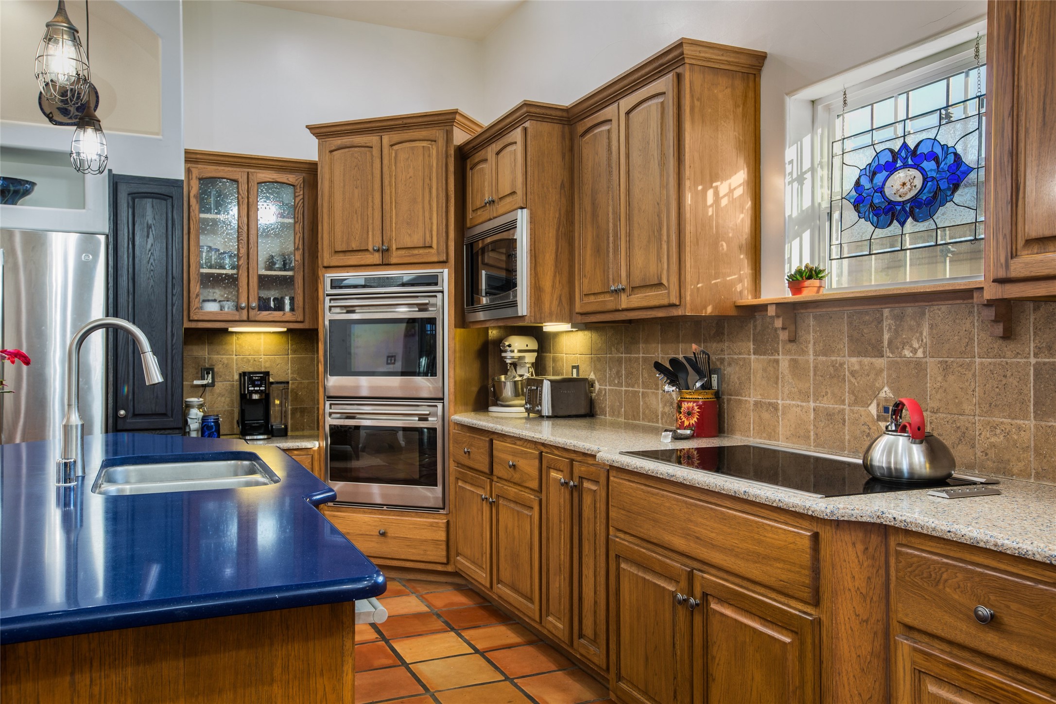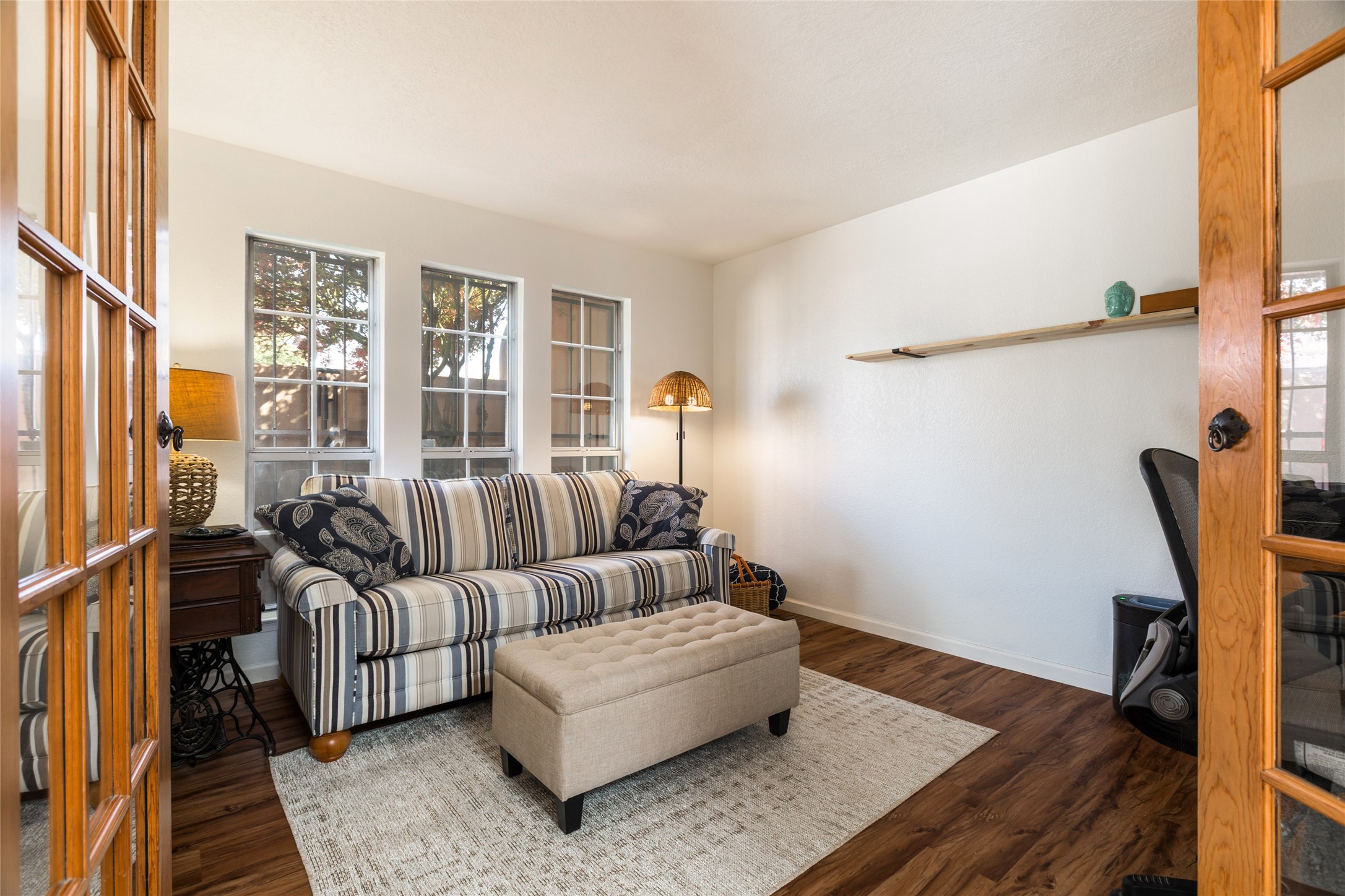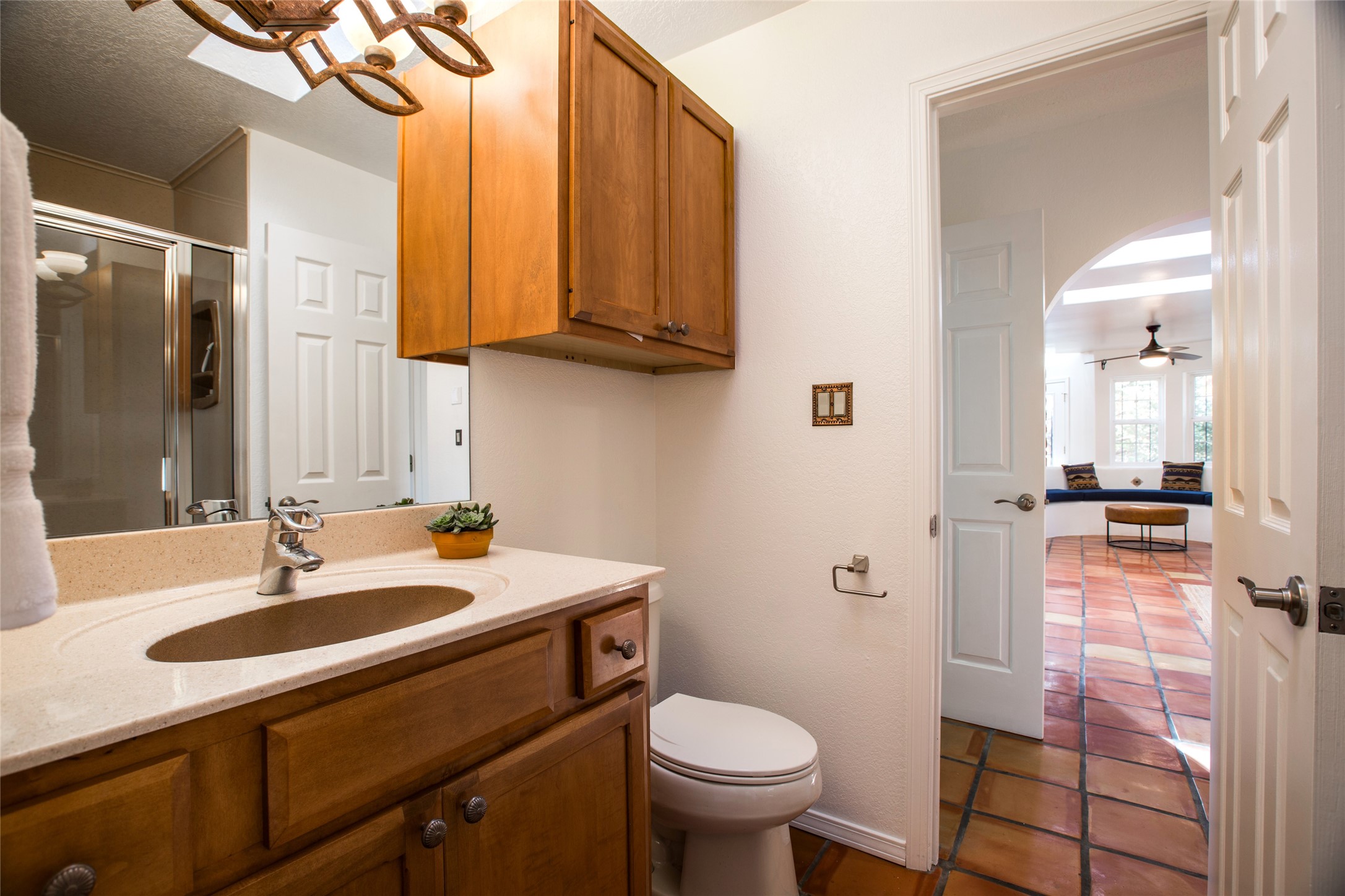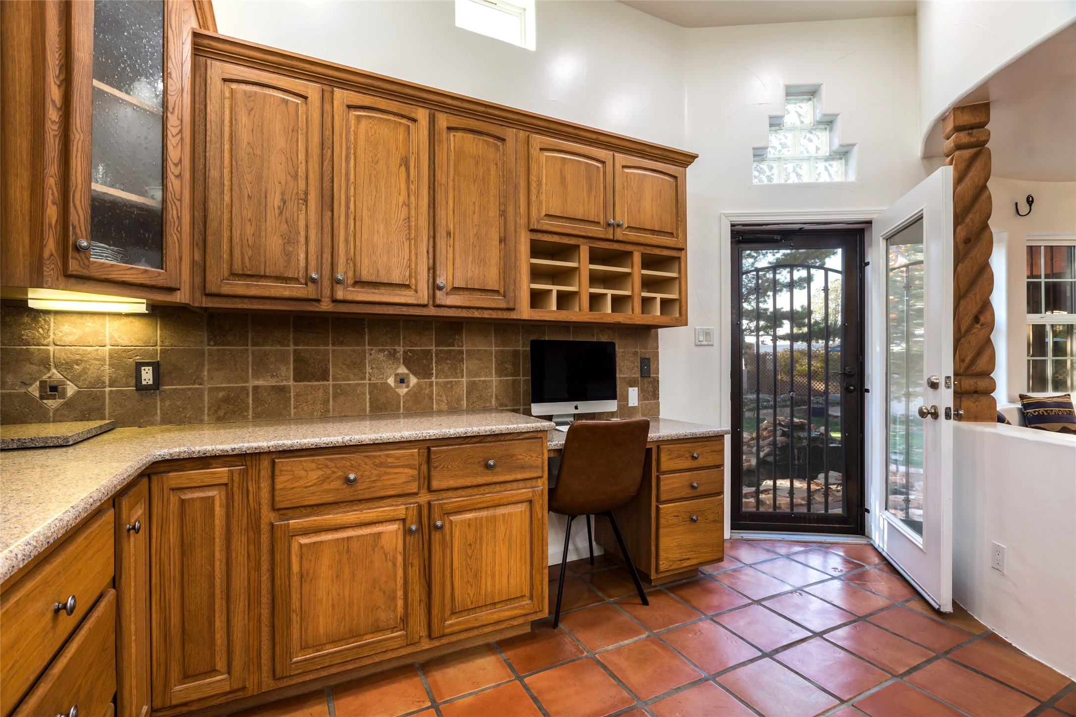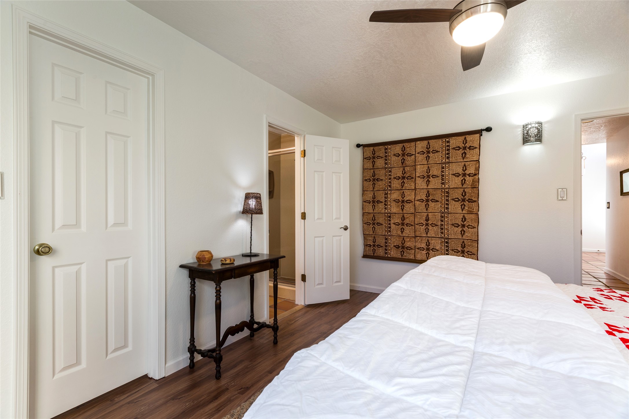 Southwestern beauty in coveted Academy Estates--spacious, single-story, updated, and powered by 30+panel, fully-owned solar for exceptional efficiency. Bright, inviting home offering 4 bedrooms (2 with ensuite baths) plus a dedicated office/2nd living/possible 5th bedroom, and formal dining. High beamed ceilings, clerestory windows, 12 skylights, and a classic kiva fireplace create warm New Mexico character throughout. The updated kitchen features modern finishes, abundant counter space, and seamless flow to the breakfast area and great room. The primary suite includes a beautifully updated bath and generous walk-in closet. Step outside to an oasis-like backyard w/ mature pear, peach, and fig trees, grapes, rock garden, pond with waterfall, and shaded covered patio perfect for entertaining. A raised view deck, accessed from the backyard, offers a peaceful spot for morning coffee or sunset unwinding with gorgeous mountain views. Major upgrades include new refrigerated air, and two new heat pump systems. A 3-car garage, rare for this area, and spacious laundry room, plus NO HOA complete this exceptional offering in Albuquerque's desirable Far North East Heights.
