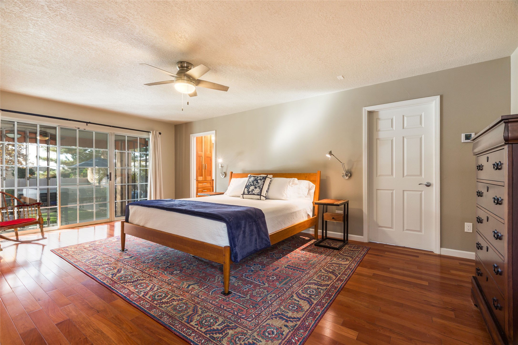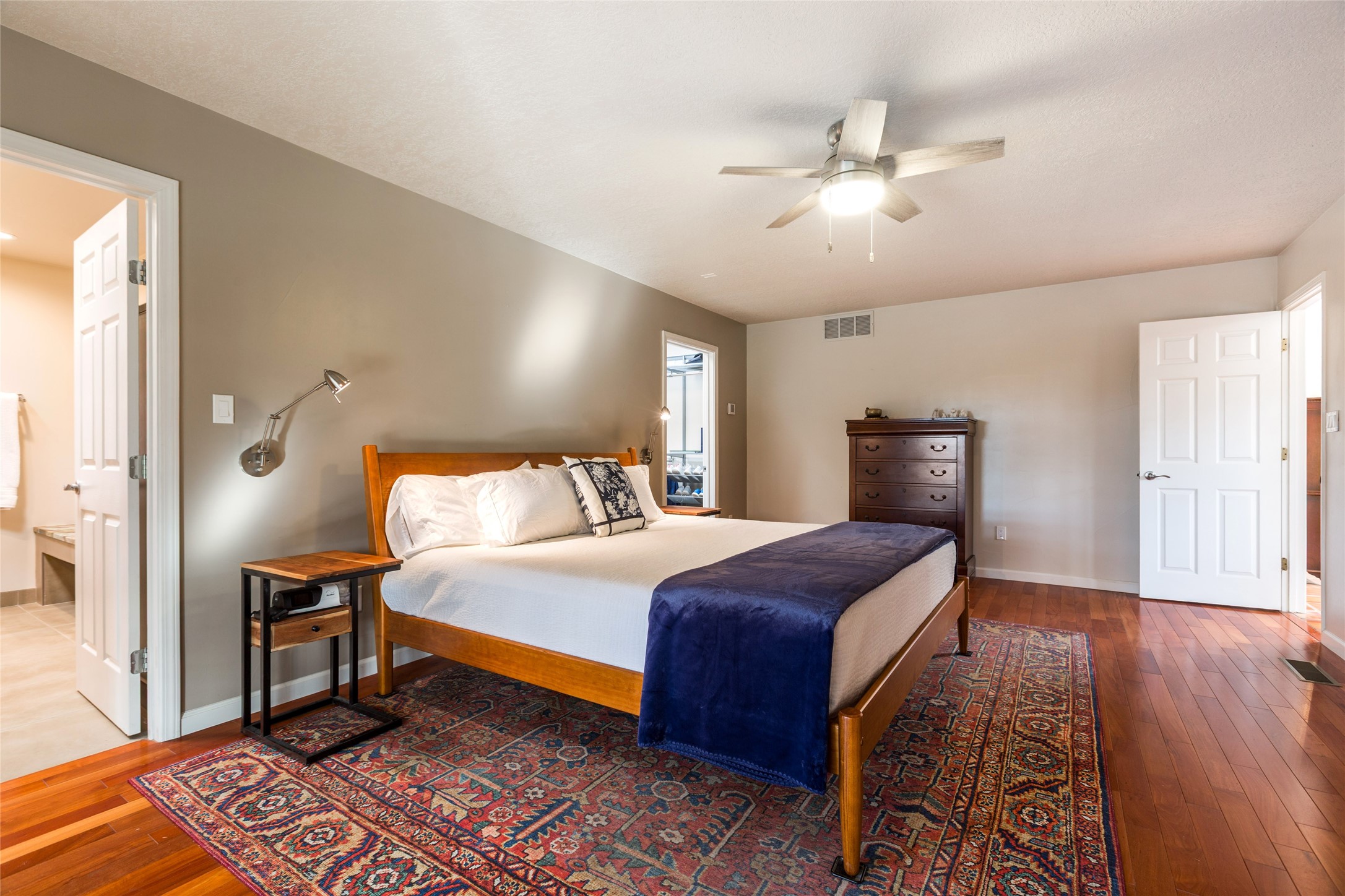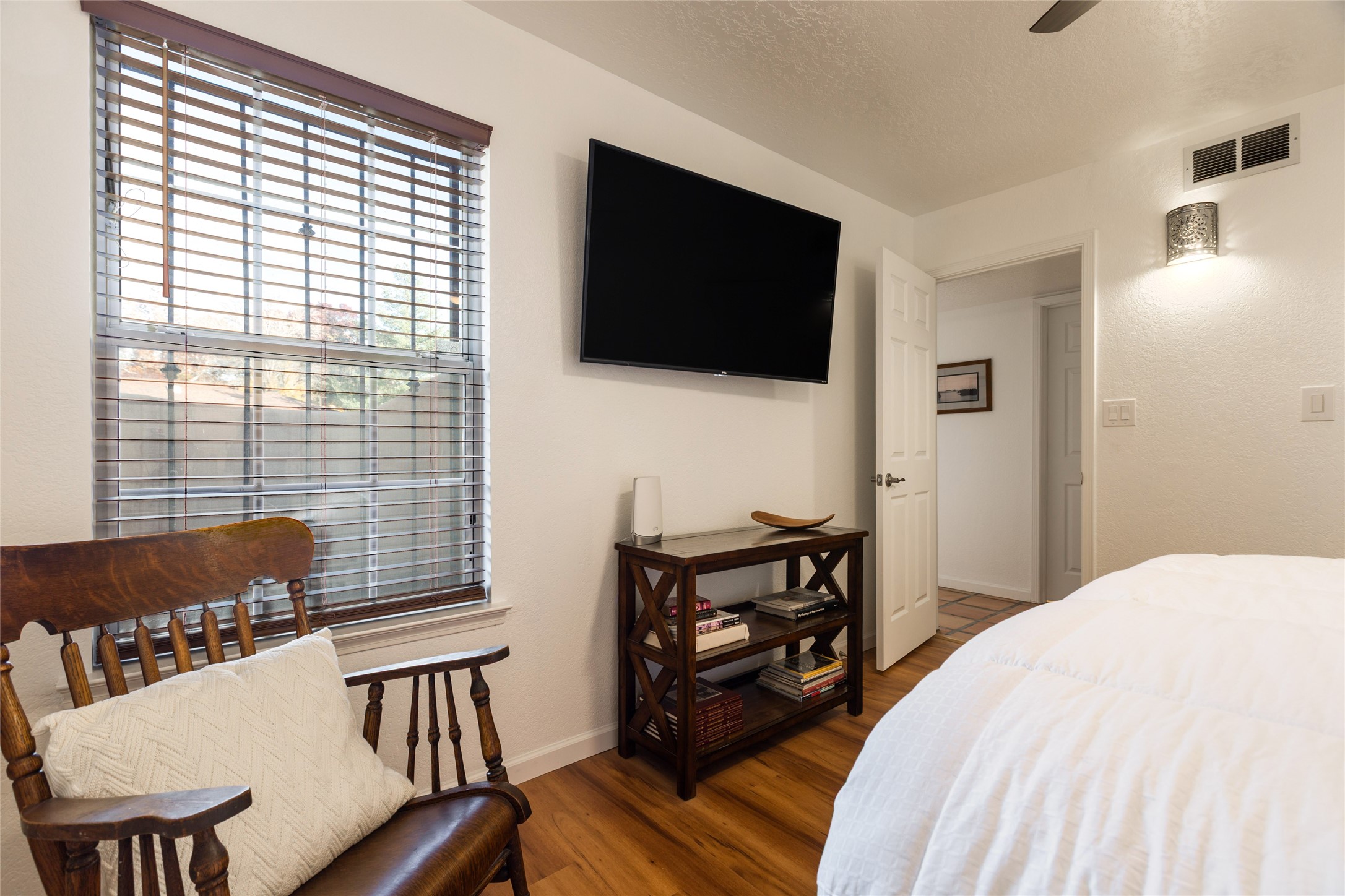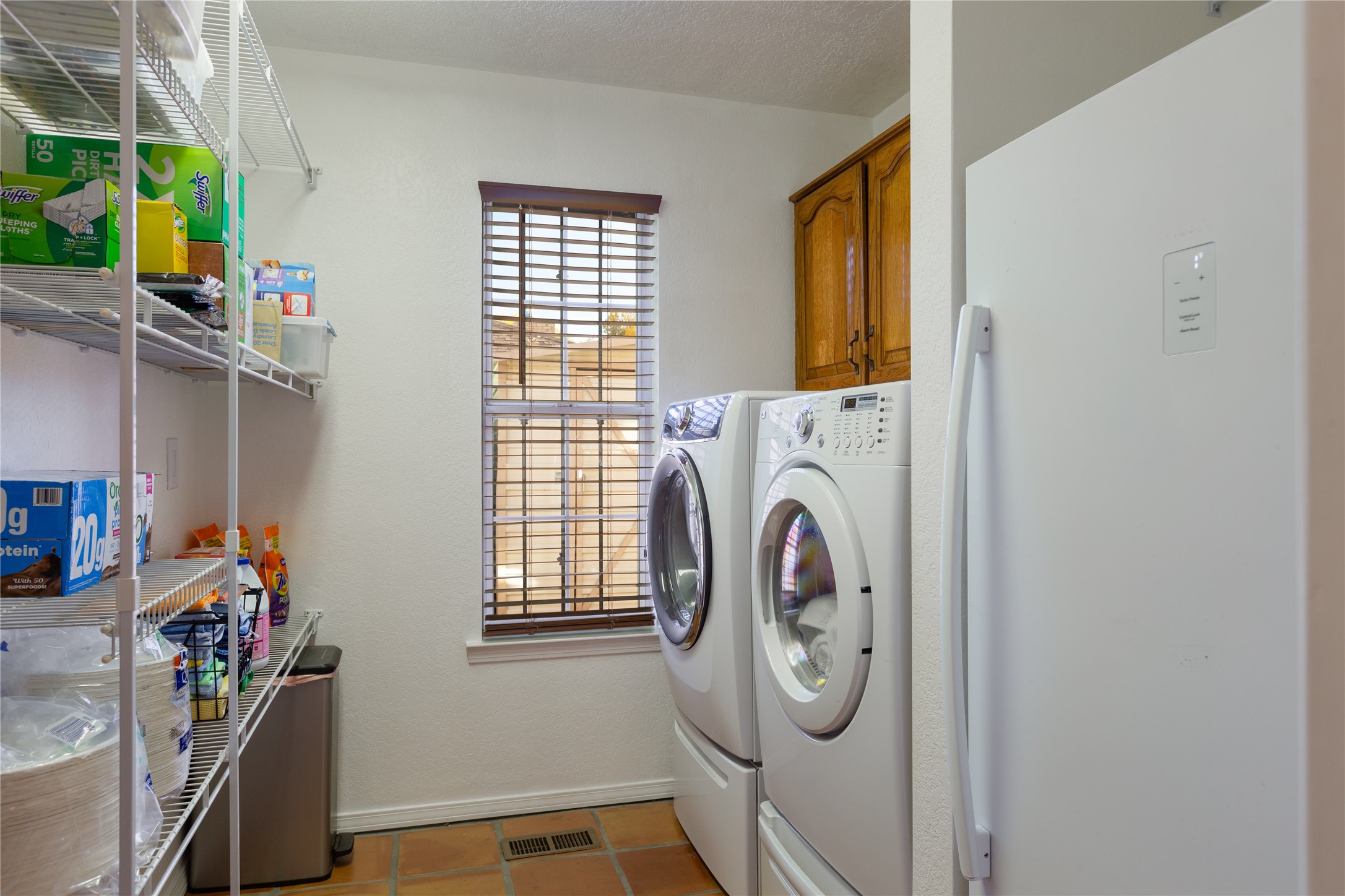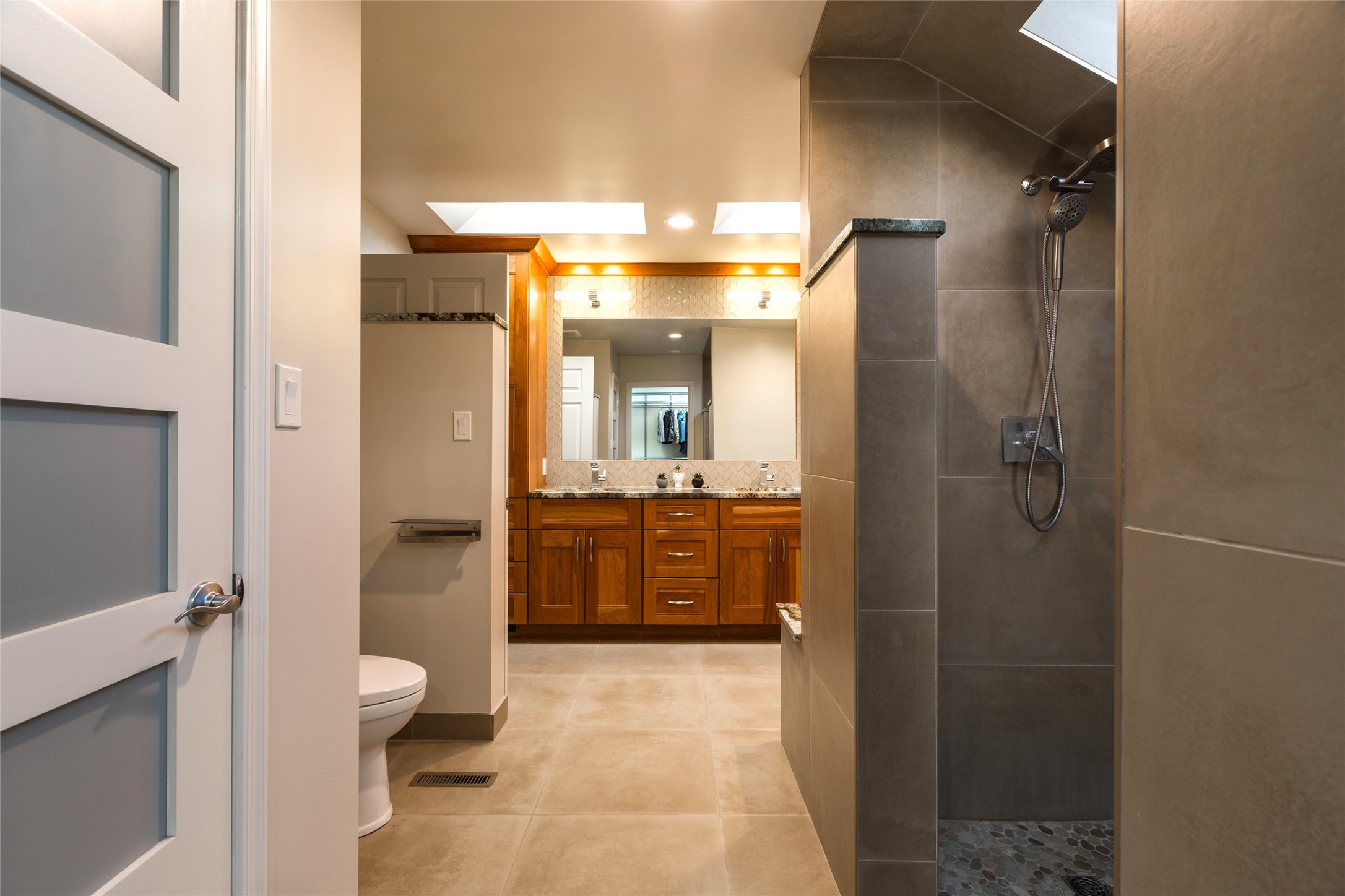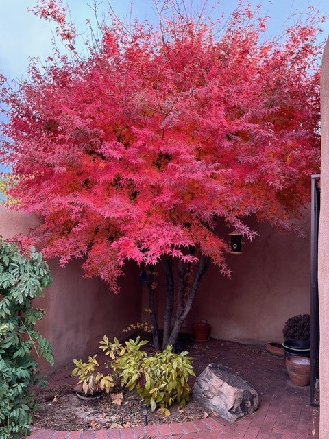 Southwestern beauty in coveted Academy Estates--spacious, single-story, updated, and powered by 30+panel, fully-owned solar for exceptional efficiency. Bright, inviting home offering 4 bedrooms (2 with ensuite baths) plus a dedicated office/2nd living/possible 5th bedroom, and formal dining. High beamed ceilings, clerestory windows, 12 skylights, and a classic kiva fireplace create warm New Mexico character throughout. The updated kitchen features modern finishes, abundant counter space, and seamless flow to the breakfast area and great room. The primary suite includes a beautifully updated bath and generous walk-in closet. Step outside to an oasis-like backyard w/ mature pear, peach, and fig trees, grapes, rock garden, pond with waterfall, and shaded covered patio perfect for entertaining. A raised view deck, accessed from the backyard, offers a peaceful spot for morning coffee or sunset unwinding with gorgeous mountain views. Major upgrades include new refrigerated air, and two new heat pump systems. A 3-car garage, rare for this area, and spacious laundry room, plus NO HOA complete this exceptional offering in Albuquerque's desirable Far North East Heights.