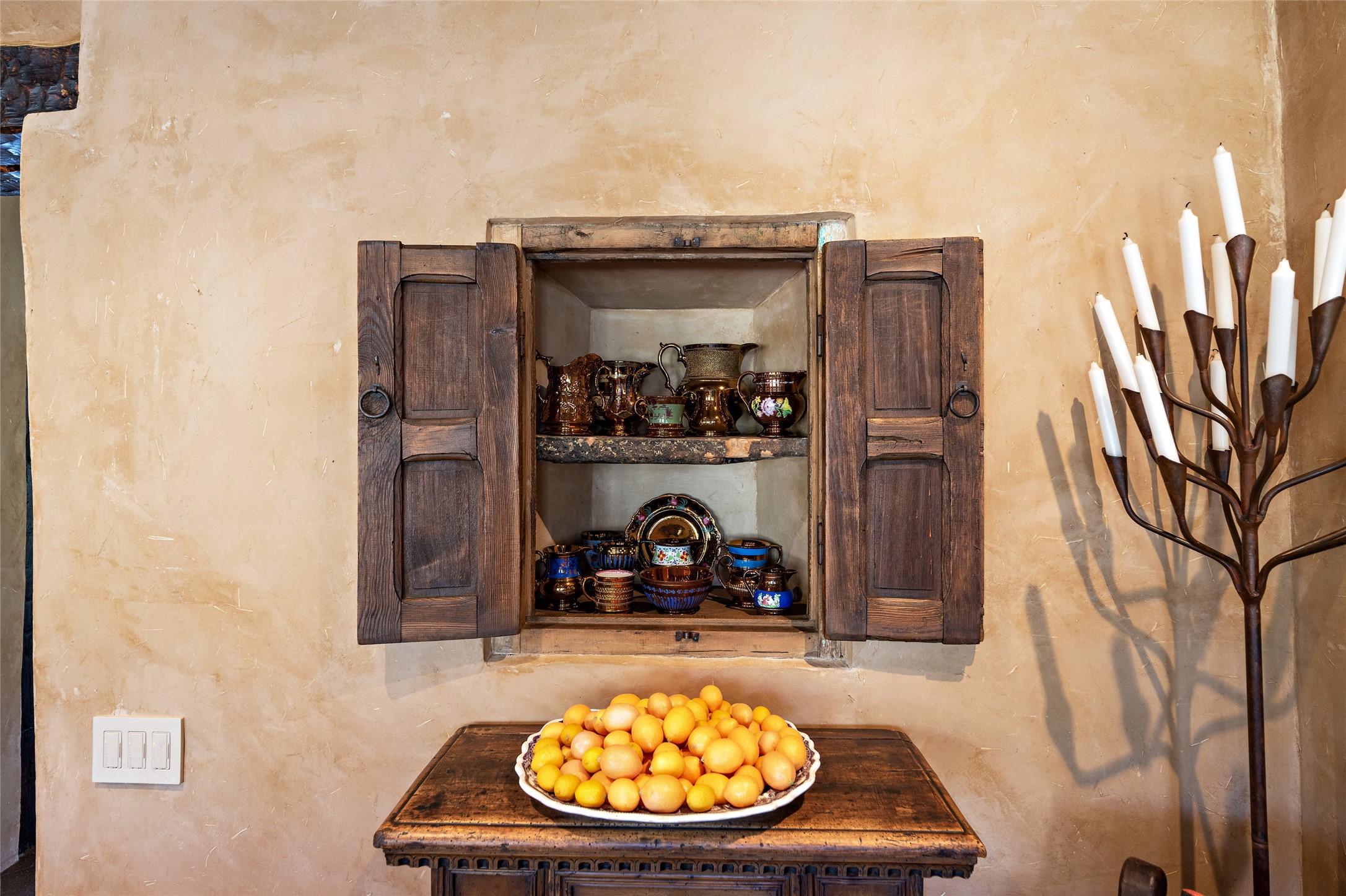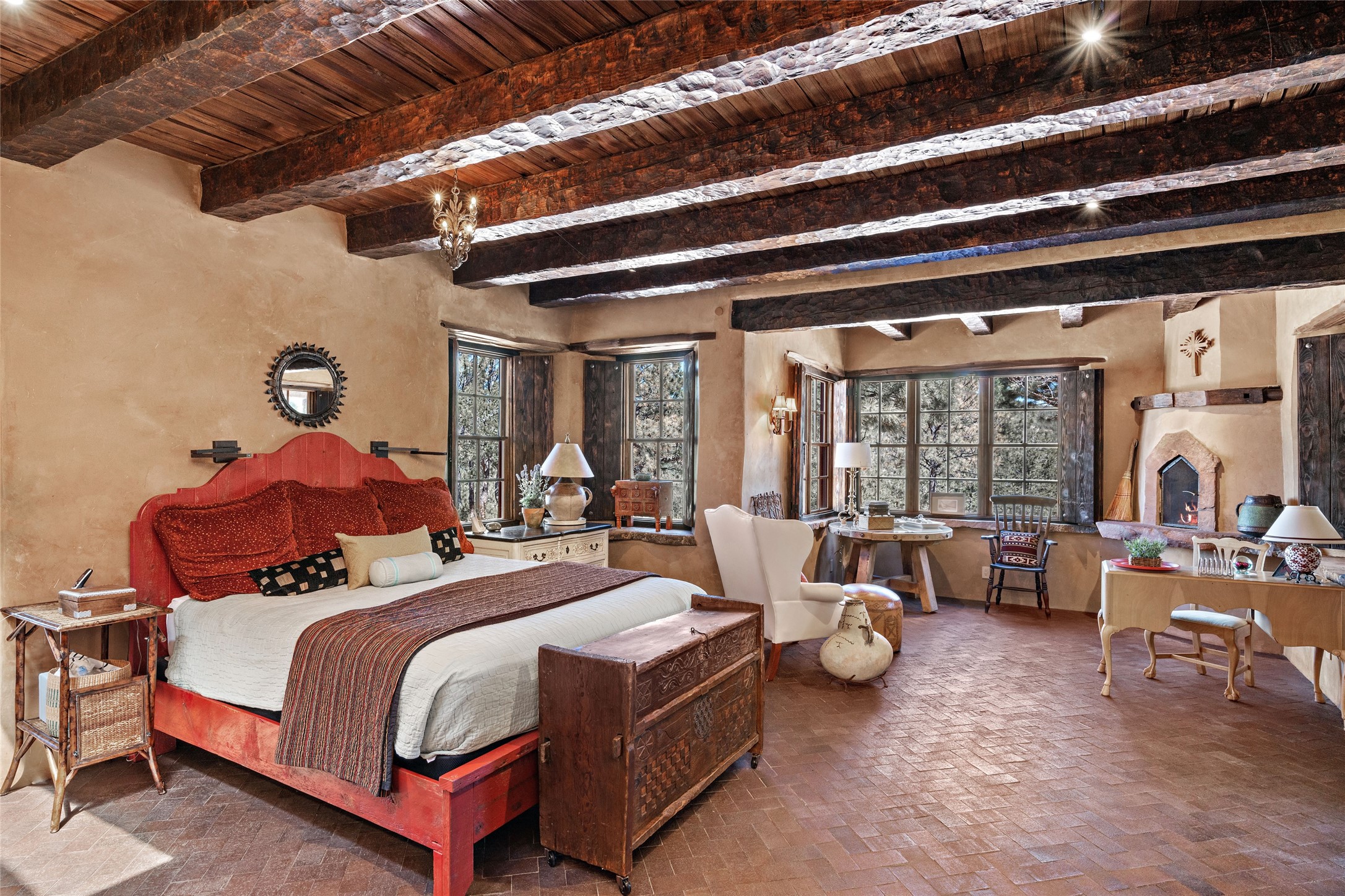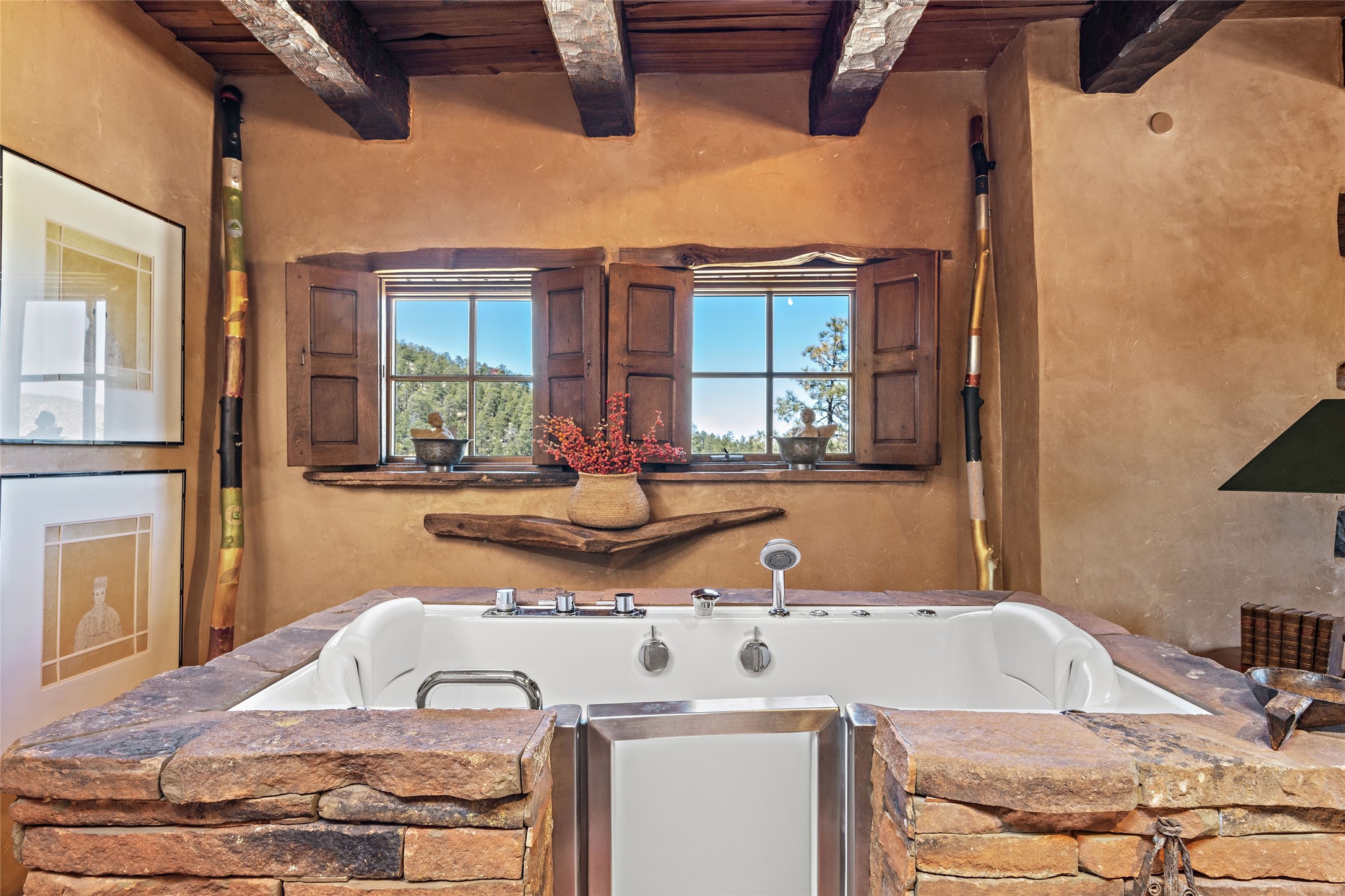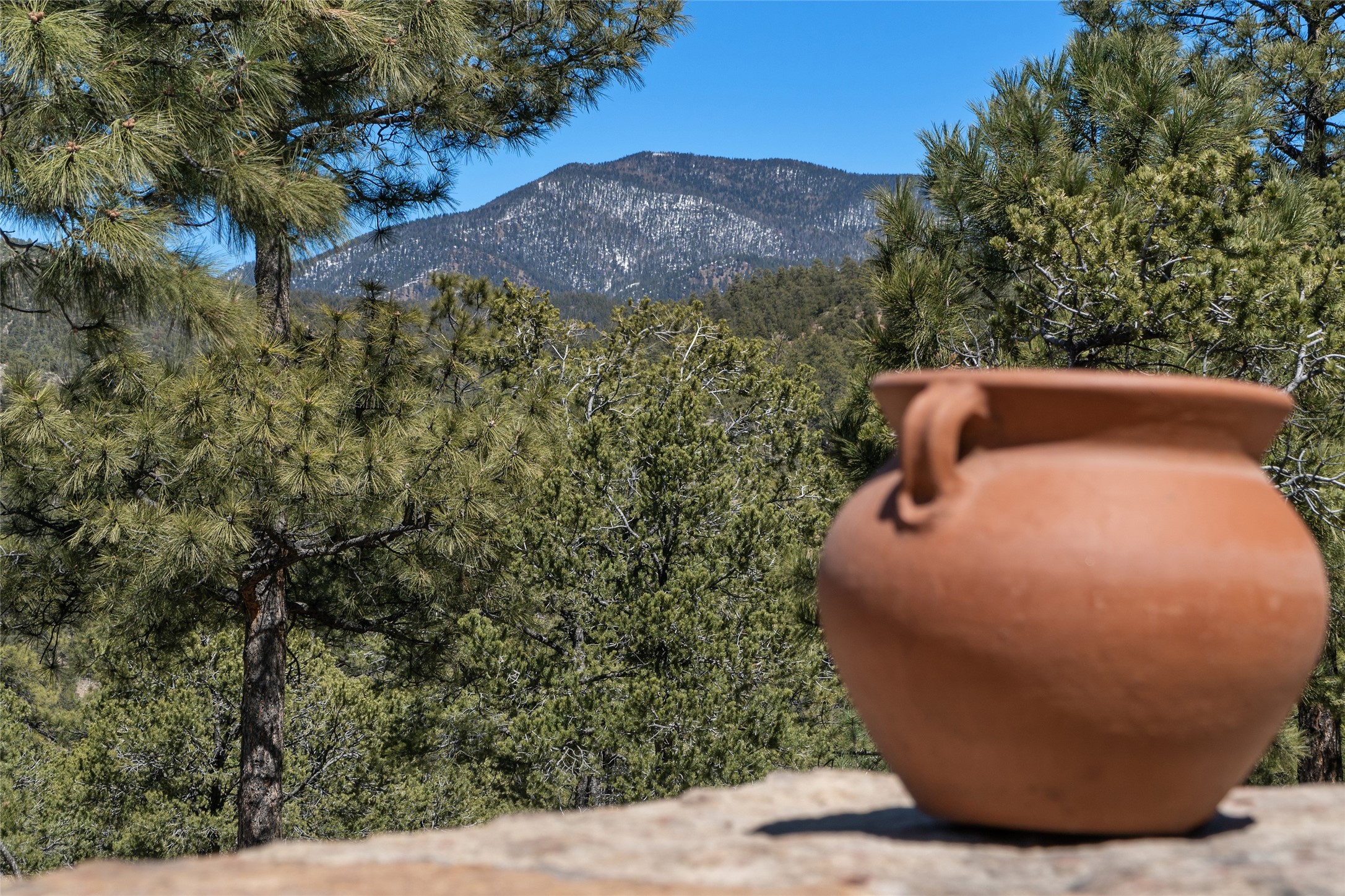 The ultimate hideaway home in Santa Fe High in the pines, fresh flower blooms, verdant grape vines and full apricots fruits beckon you to discover the bit of paradise. Set above the JUNIPER tree line, juniper allergies, crowds and pollution here not found here. Through these doors, discover what is arguably the finest example of a Colonial Pueblo home in New Mexico atop very private mountain location with all the stars at night and your days filled with beautiful views. Thoughtfully designed, it boasts the finest finishes, hand-plastered double thick adobe walls, hand-carved beams with a massive 36 foot long 160-year-old Amish beam and hand carved 3 1/2 " thick doors from around the world. Windows trimmed with massive native rock, 8 heart-warming fireplaces and radiant-heated brick flooring. The spacious open floor plan features a chef's kitchen with 16 Sub-Zero drawers, Wolf appliances and an 18-foot island. Two elegant bedroom suites are well separated for privacy. An attached casita office/third en-suite bedroom offers work or guest accommodations. Spacious portals are everywhere. Gated access provides privacy and security. Three lucky vehicles are sheltered in an oversized garage with adaptable work areas. Enjoy nature and wildlife on the hiking and walking trails. This is a magical Santa Fe escape and an opportunity not to be missed just 15 minutes from the town center. Truly special.