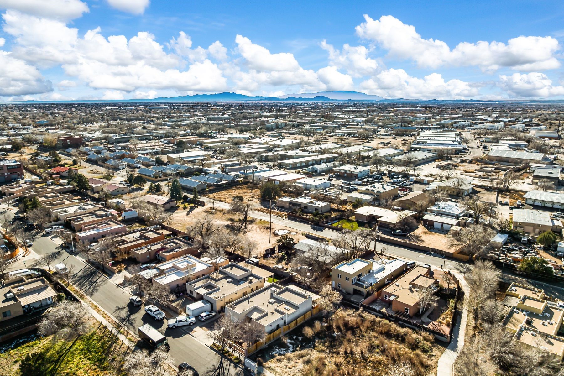 Discover this charming home in a quiet midtown location across from Los Hermanos Rodriguez Park and bordering undeveloped common area on one side for added privacy. This single-level, no-steps home offers abundant natural light and excellent separation between the primary suite and two guest bedrooms. The inviting living room features tile flooring and a wood-burning kiva fireplace, while the kitchen and dining area offer easy flow for everyday living. A standout feature is the screened-in portal, providing additional outdoor living space and direct access to the fully fenced rear yard. The backyard includes low-maintenance landscaping, mature shade trees, turf, river rock accents, and room for gardening or pets. The front garden is a lush seasonal oasis with blooming perennials and established plantings that enhance curb appeal. The home includes laminate and tile flooring throughout (no carpet), in-floor radiant heat, and evaporative cooling for year-round comfort. The extra-wide one-car garage provides valuable storage or workspace. Recent updates include a new dishwasher (2023), new microwave (2024), new tankless boiler, and rainwater management improvements (2025). A radon mitigation system is already in place. This thoughtfully maintained home offers privacy, comfort, and easy indoor-outdoor living in a central Santa Fe location. With park access just across the street and shopping, restaurants, and amenities only 10 minutes away, this home combines quiet neighborhood living with excellent convenience.