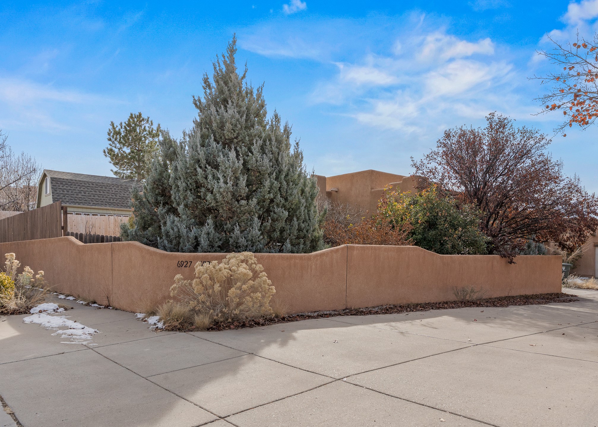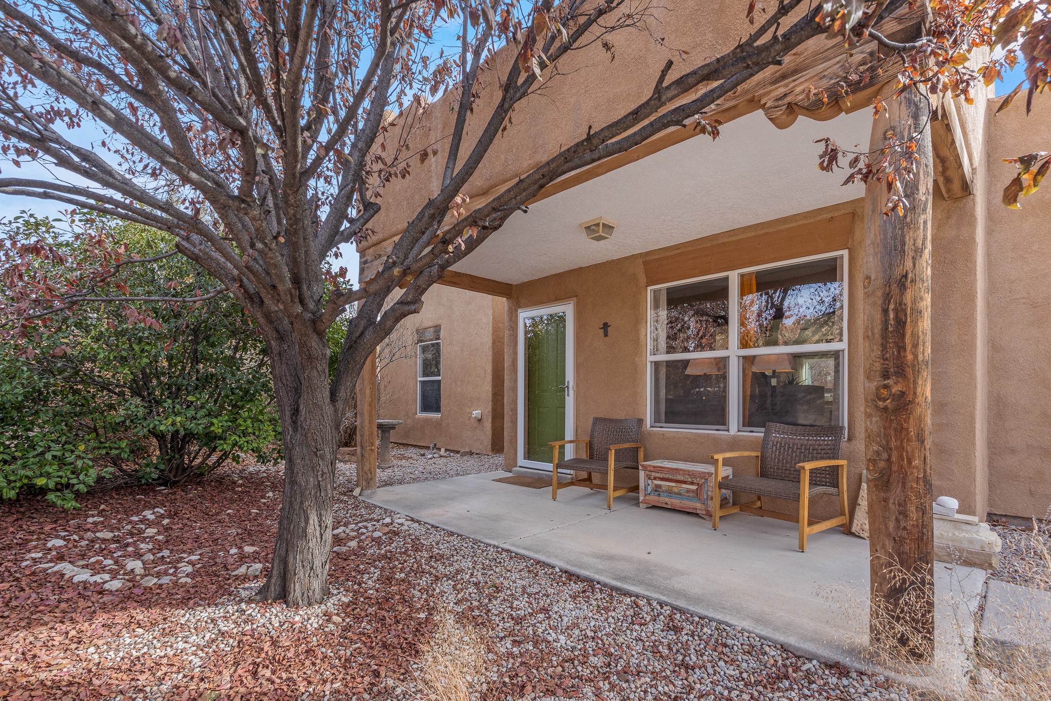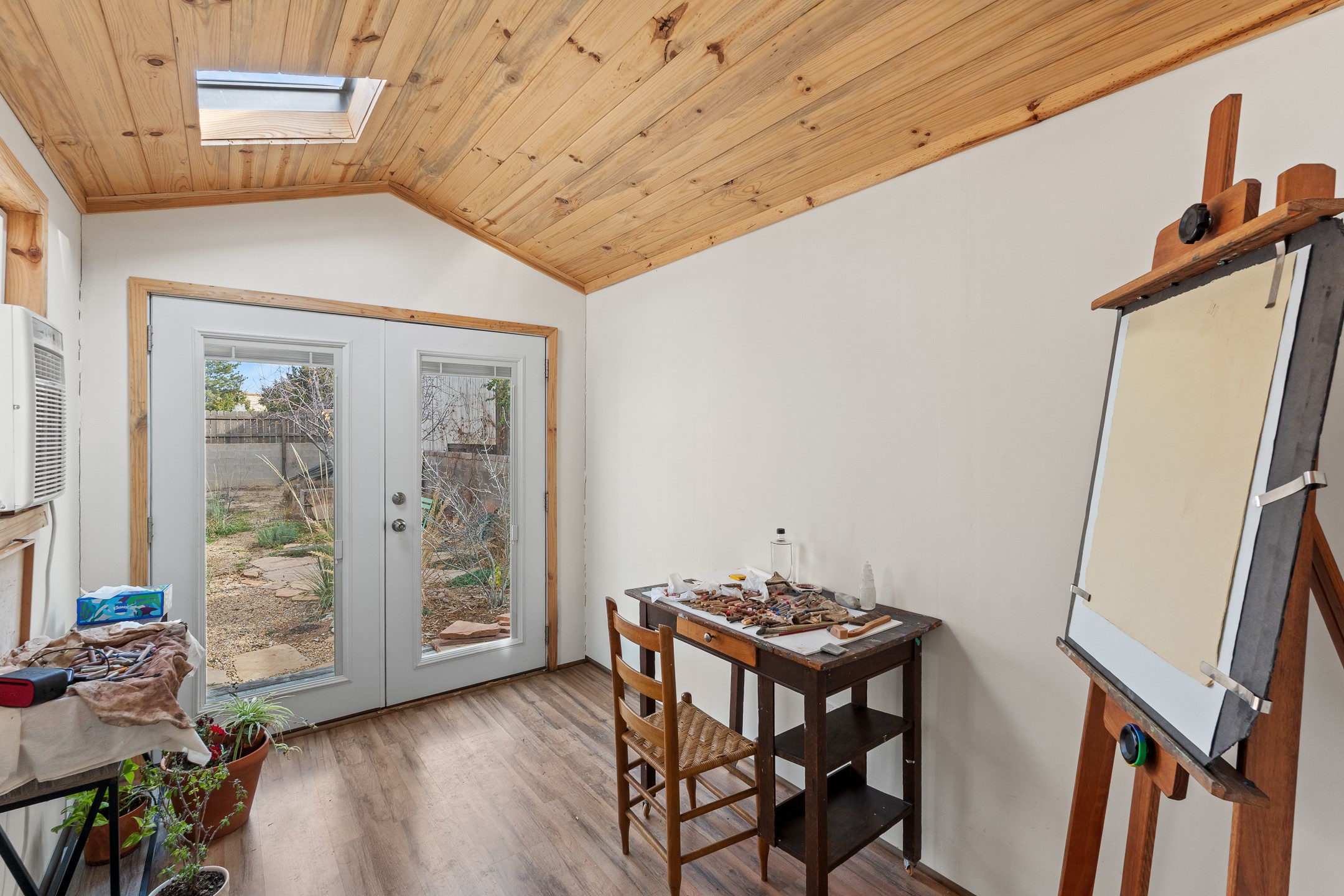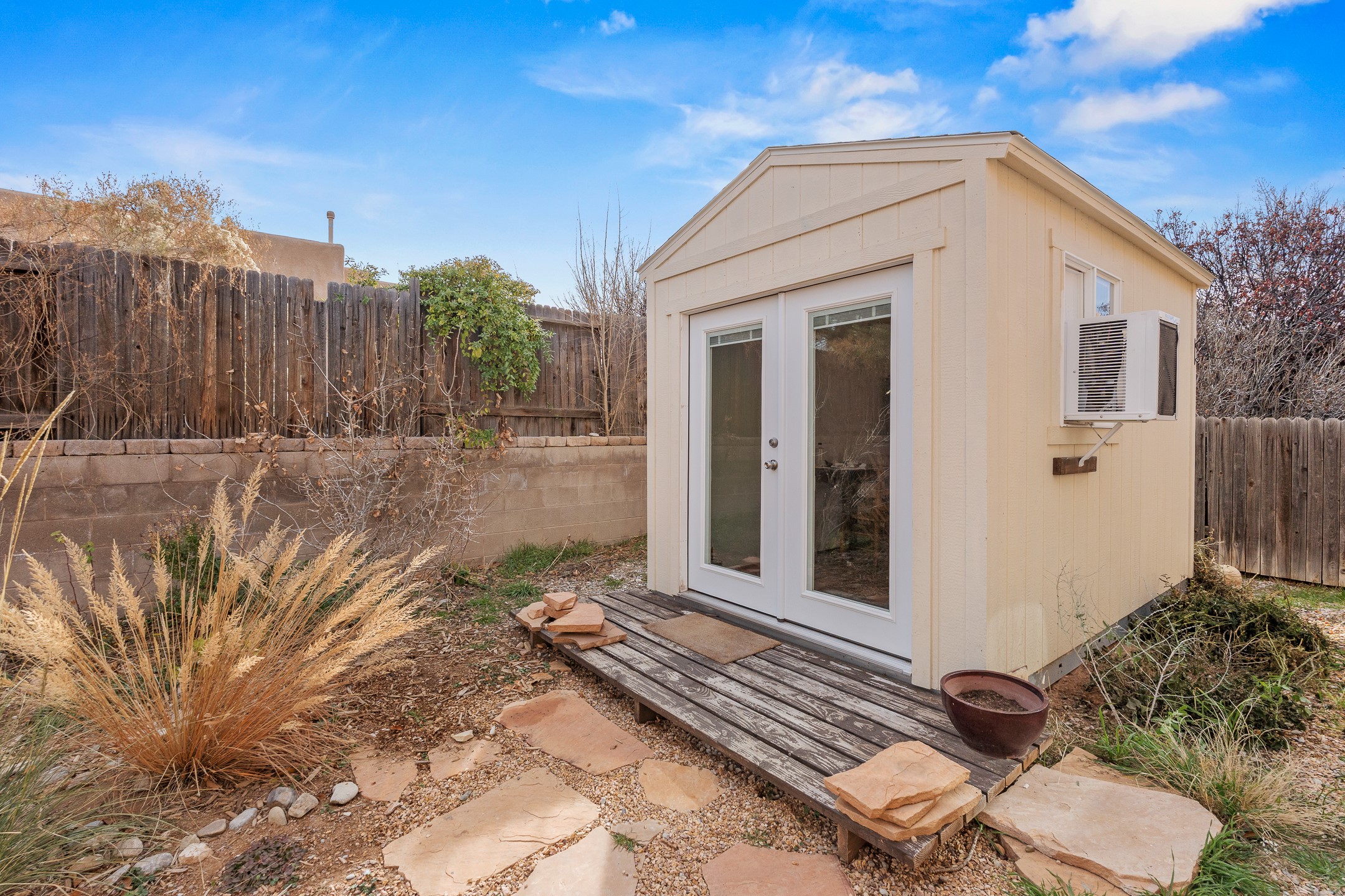 This Pueblo-style home is offered at under $400,000 and is located on an oversized corner lot in the Tierra Contenta community. The property features mature trees, native landscaping, and full fencing/walls that provide additional privacy. Inside, the home includes modern light fixtures, contemporary ceiling fans, and newer plank-style flooring. The bright eat-in kitchen includes a spacious farm sink, filtered water system, dishwasher, stove, refrigerator, stone flooring, abundant cabinetry, and room for a generously sized dining table. The insulated double garage includes a 5' double-pane window that brings in natural north light, offering versatility for various types of work or creative use. The home also features double-pane windows throughout and a membrane roof. The backyard wraps around the home and includes a flagstone patio, lavender plants, and raised beds suitable for gardening. A finished shed with a pitched roof, skylights, and French doors provides additional usable space. The shed is insulated, air-conditioned, and designed for year-round functionality. Nearby community amenities include walking and hiking trails, recreational areas, and local facilities such as the Southside Library, Swan Park, and a nearby golf course. Access to these features is convenient from the property. This home offers flexibility for a variety of uses and lifestyles, with thoughtful indoor and outdoor spaces throughout.
