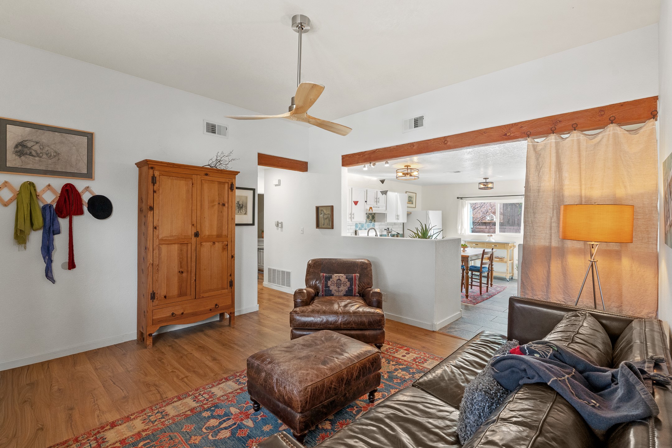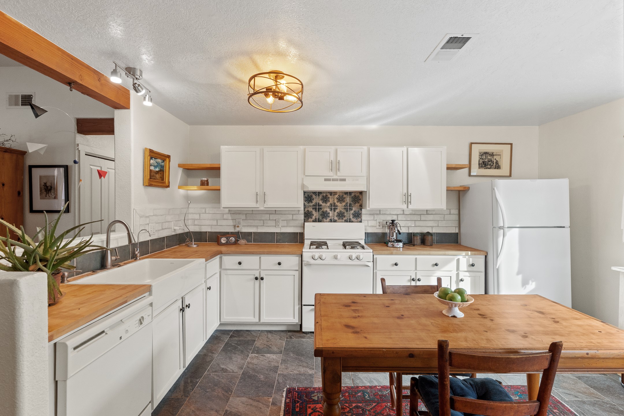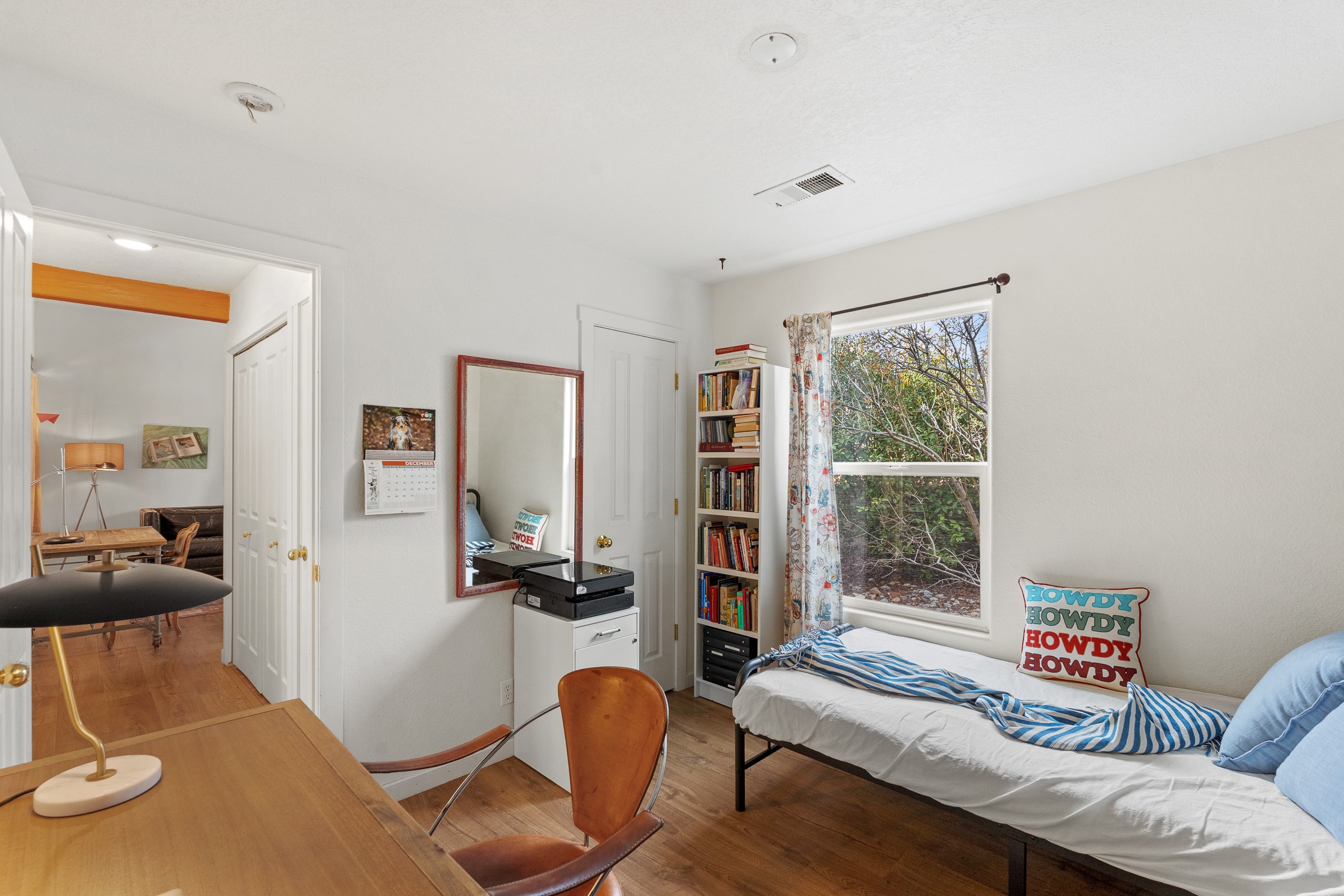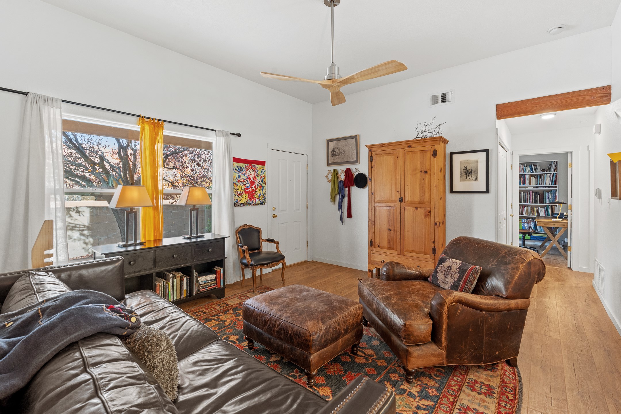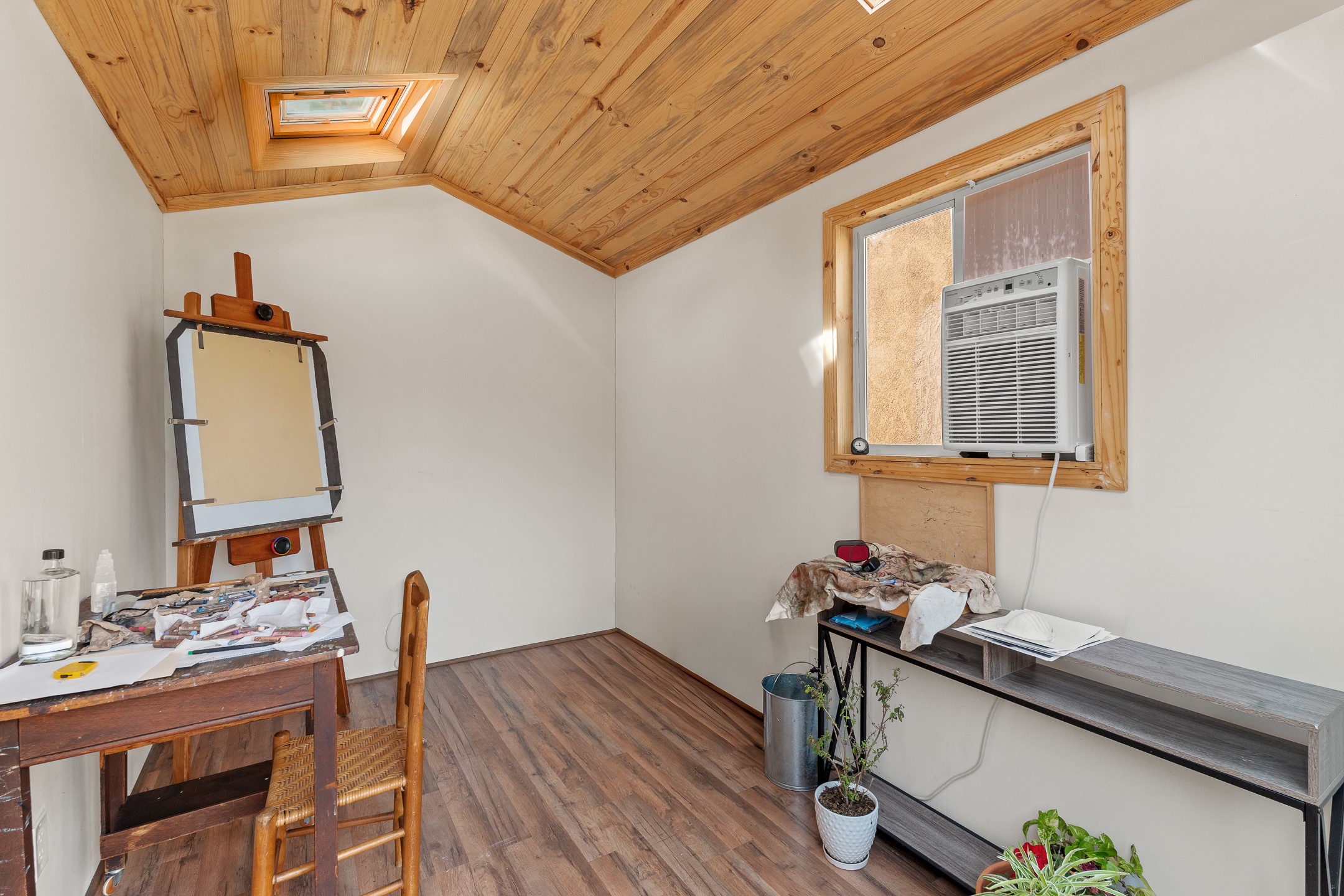 This Pueblo-style home is offered at under $400,000 and is located on an oversized corner lot in the Tierra Contenta community. The property features mature trees, native landscaping, and full fencing/walls that provide additional privacy. Inside, the home includes modern light fixtures, contemporary ceiling fans, and newer plank-style flooring. The bright eat-in kitchen includes a spacious farm sink, filtered water system, dishwasher, stove, refrigerator, stone flooring, abundant cabinetry, and room for a generously sized dining table. The insulated double garage includes a 5' double-pane window that brings in natural north light, offering versatility for various types of work or creative use. The home also features double-pane windows throughout and a membrane roof. The backyard wraps around the home and includes a flagstone patio, lavender plants, and raised beds suitable for gardening. A finished shed with a pitched roof, skylights, and French doors provides additional usable space. The shed is insulated, air-conditioned, and designed for year-round functionality. Nearby community amenities include walking and hiking trails, recreational areas, and local facilities such as the Southside Library, Swan Park, and a nearby golf course. Access to these features is convenient from the property. This home offers flexibility for a variety of uses and lifestyles, with thoughtful indoor and outdoor spaces throughout.