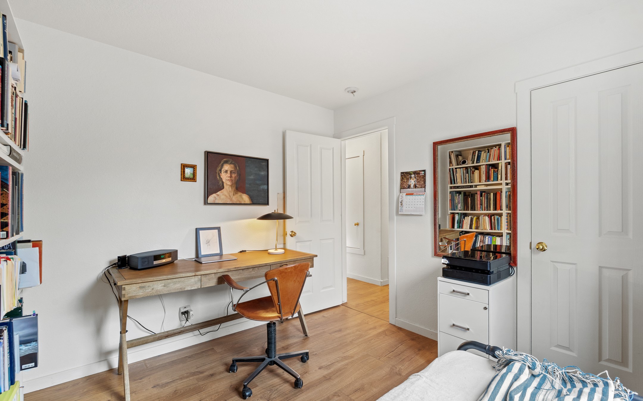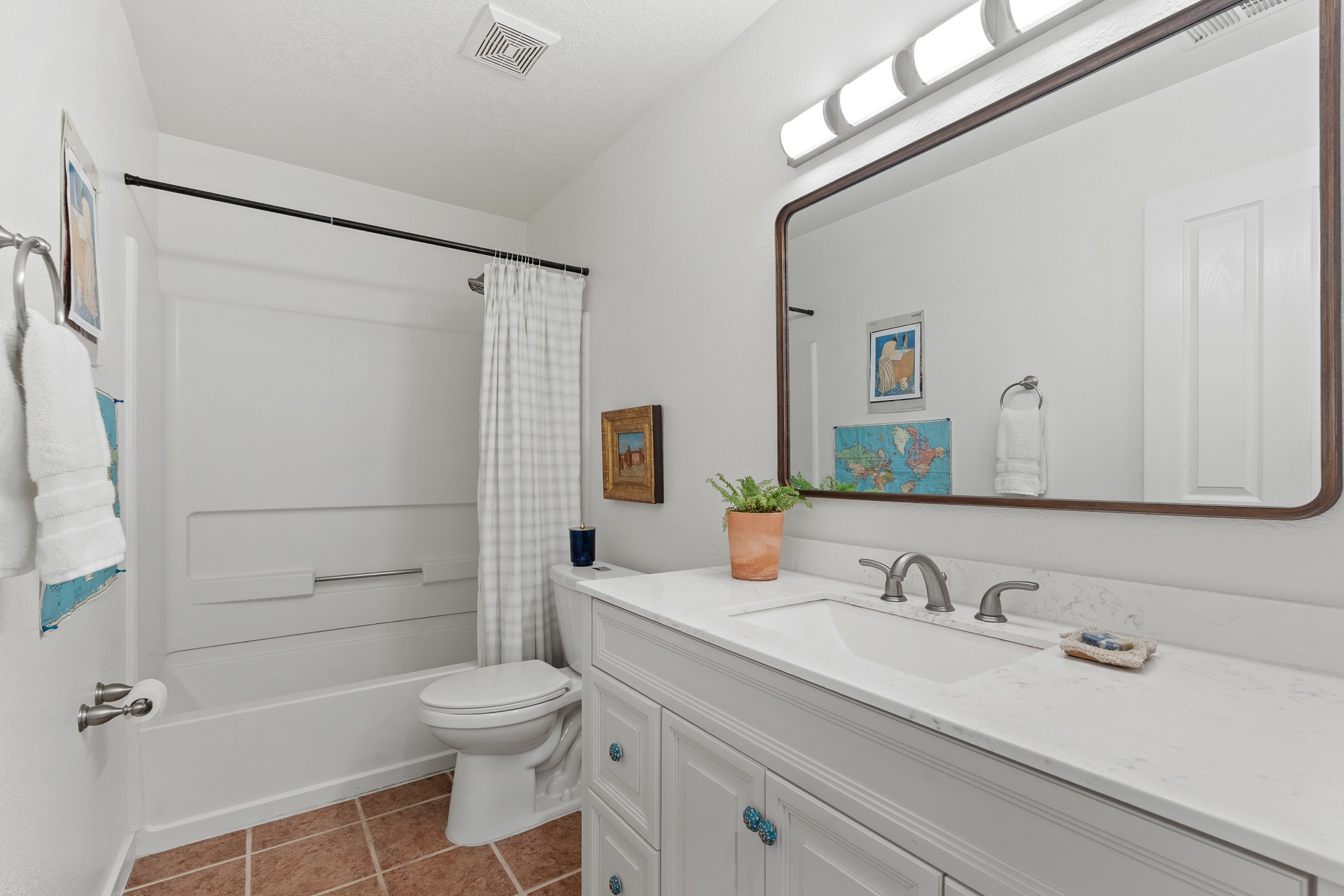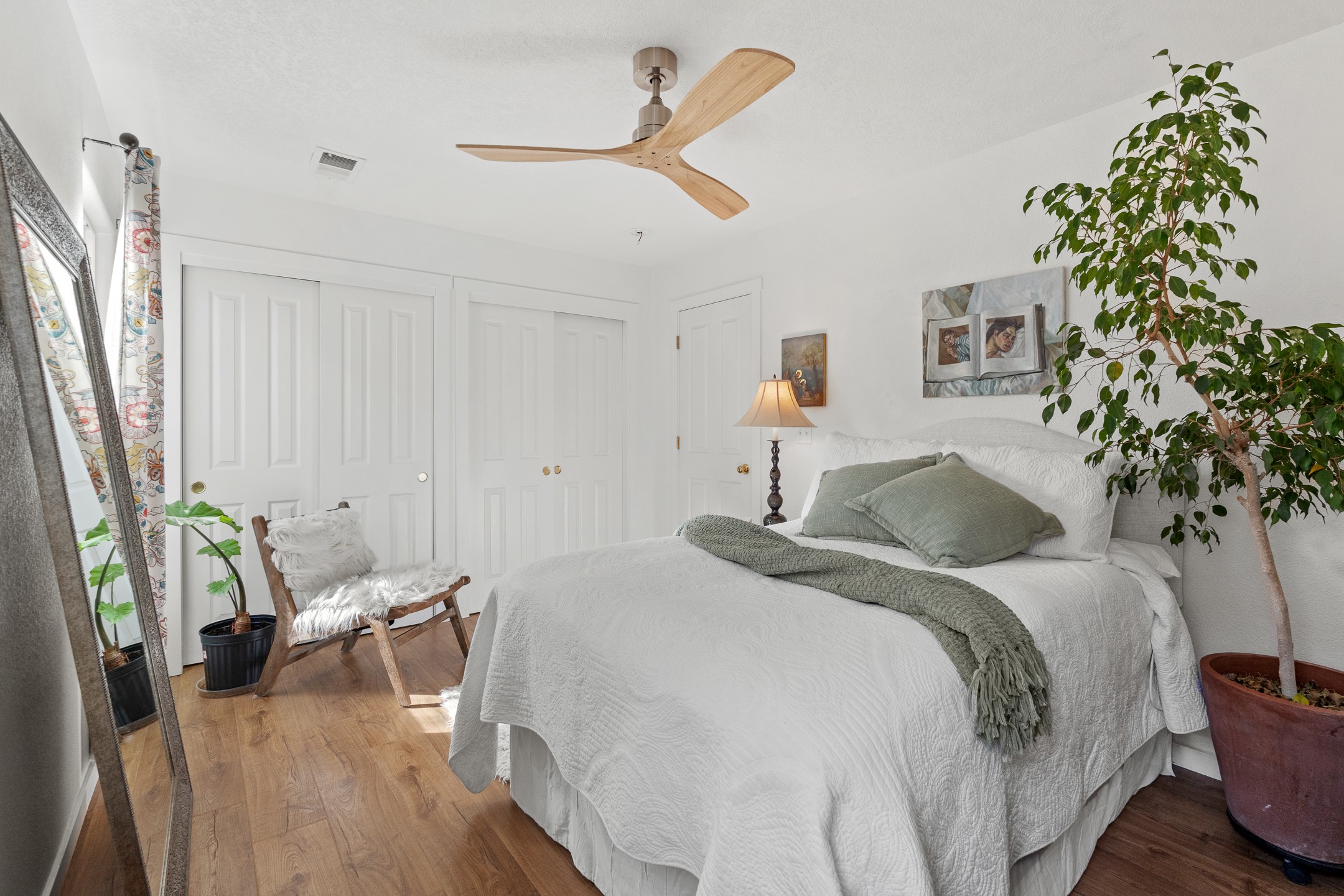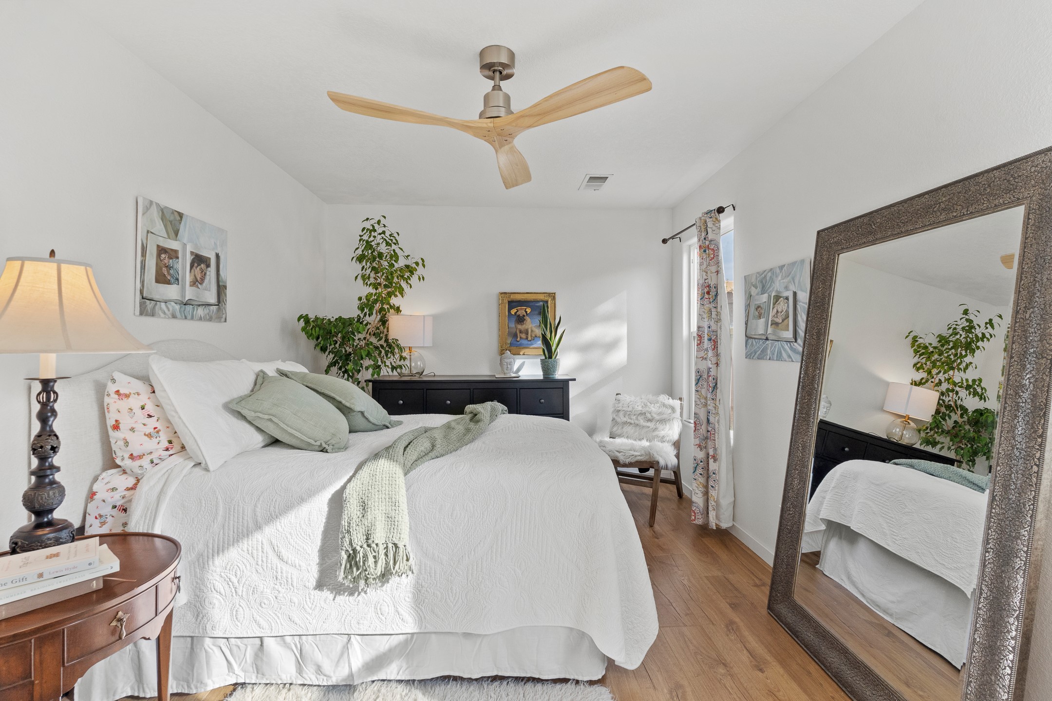 This Pueblo-style home is offered at under $400,000 and is located on an oversized corner lot in the Tierra Contenta community. The property features mature trees, native landscaping, and full fencing/walls that provide additional privacy. Inside, the home includes modern light fixtures, contemporary ceiling fans, and newer plank-style flooring. The bright eat-in kitchen includes a spacious farm sink, filtered water system, dishwasher, stove, refrigerator, stone flooring, abundant cabinetry, and room for a generously sized dining table. The insulated double garage includes a 5' double-pane window that brings in natural north light, offering versatility for various types of work or creative use. The home also features double-pane windows throughout and a membrane roof. The backyard wraps around the home and includes a flagstone patio, lavender plants, and raised beds suitable for gardening. A finished shed with a pitched roof, skylights, and French doors provides additional usable space. The shed is insulated, air-conditioned, and designed for year-round functionality. Nearby community amenities include walking and hiking trails, recreational areas, and local facilities such as the Southside Library, Swan Park, and a nearby golf course. Access to these features is convenient from the property. This home offers flexibility for a variety of uses and lifestyles, with thoughtful indoor and outdoor spaces throughout.