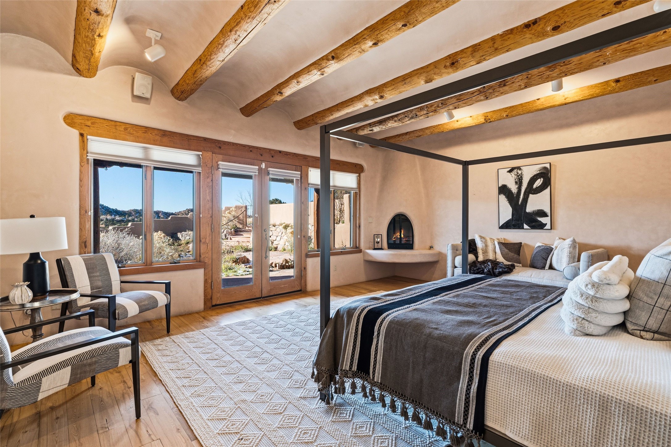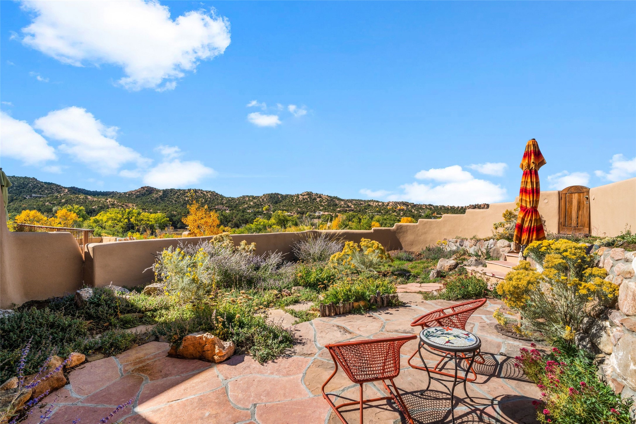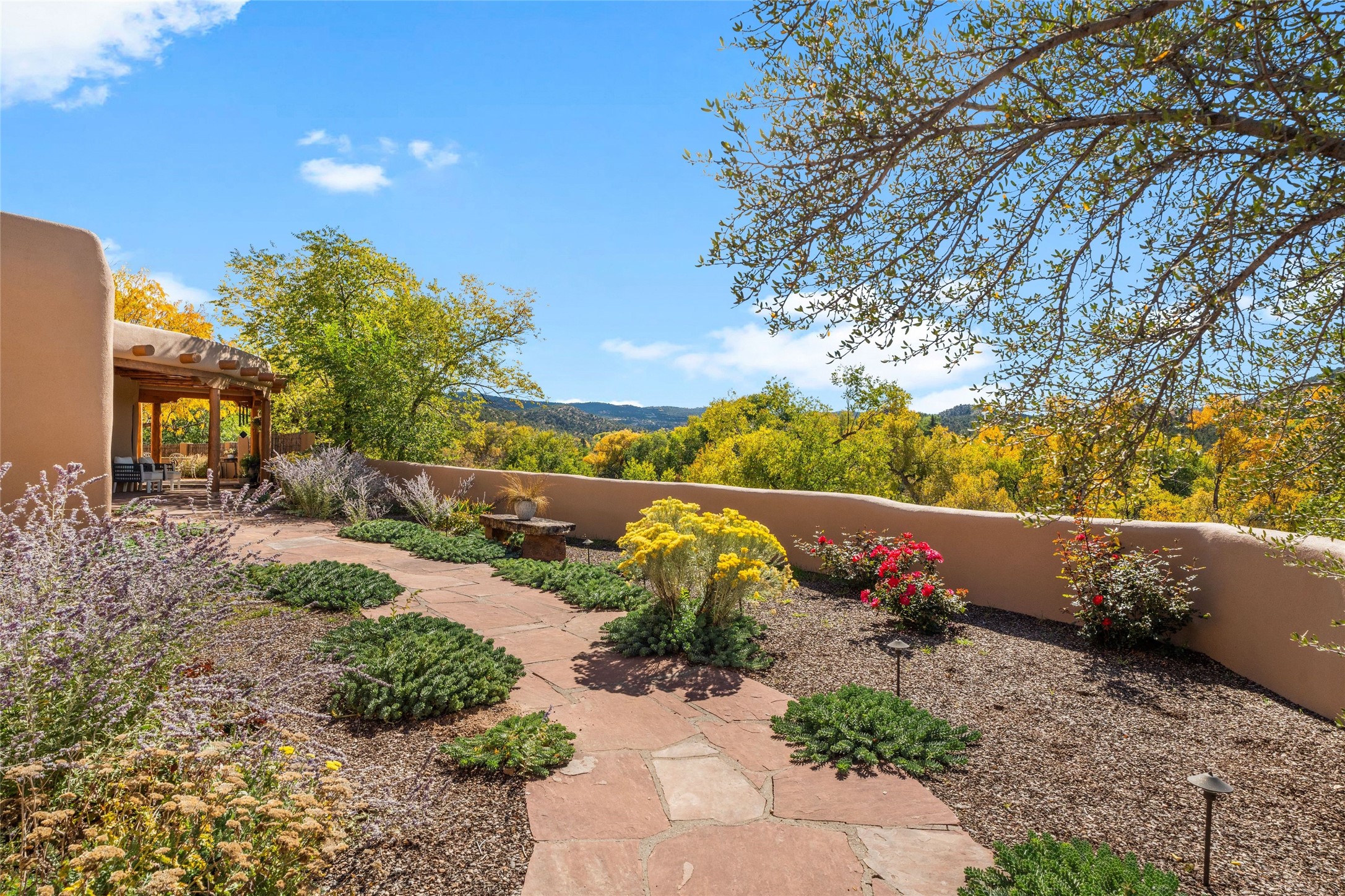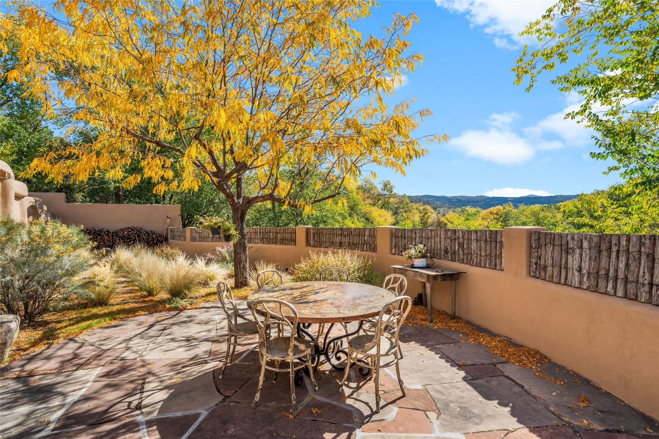 Where History Meets the River. In the heart of the Tesuque foothills, where the river still runs and cottonwoods shade the valley floor, stands a home unlike any other in Santa Fe. At its center: a circular Kiva with three-foot-thick adobe walls, built as a silo by the Tewa people in the 1750s--a full century before the tax assessor's official 1867 date. These massive walls have witnessed the entire arc of New Mexico's history, from Spanish colonial times through statehood and into the present day. The intimate, contemplative space of the Kiva--one of seven fireplaces in this gracious home--contrasts magnificently with the adjacent living room's soaring twenty-foot ceilings. This is architecture as conversation: between old and new, between earth and sky, between the quiet of thick adobe and the drama of light and volume. The Tesuque River runs alongside the property. Multiple portals and outdoor living spaces--carefully designed for four-season use--frame views of the Sangre de Cristo Mountains. The primary suite occupies its own level with expansive living room, dressing room, and bath, opening onto a private outdoor terrace. A fully renovated guest suite (circa 2007) offers its own entrance for visiting family or creative collaborators. A third guest area completes the flexible floor plan. Since 2024, the property has undergone comprehensive renovation: new boiler system, updated plumbing and electrical, complete perimeter adobe wall replacing the original coyote fence, restored and newly constructed portals, custom ironwork throughout, and fresh exterior paint. Modern infrastructure--updated security system, new internet, central air supplemented by mini-splits--supports contemporary life within these historic walls. Ten minutes from the Plaza. A mile from Bishop's Lodge. Adjacent to the river. Rooted in three centuries of history and ready for its next chapter. Tesuque foothills, 10 minutes from Santa Fe Plaza. Adjacent to Tesuque River. Bishop's Lodge approximate