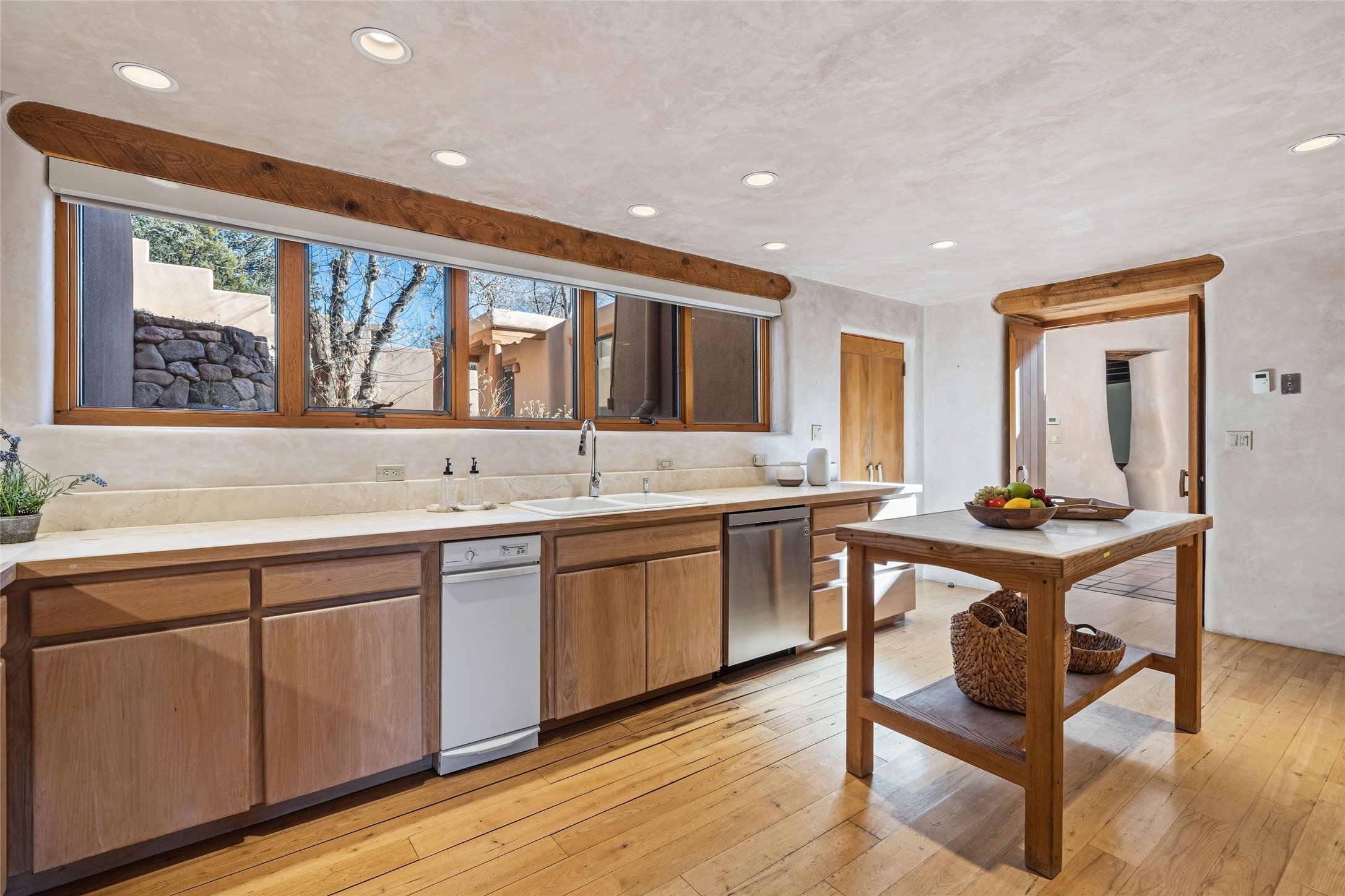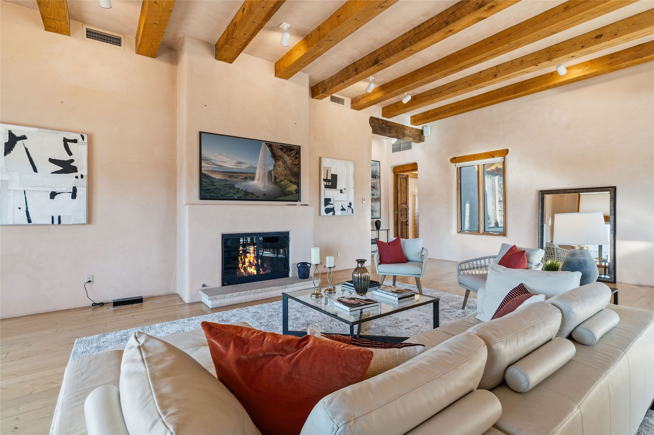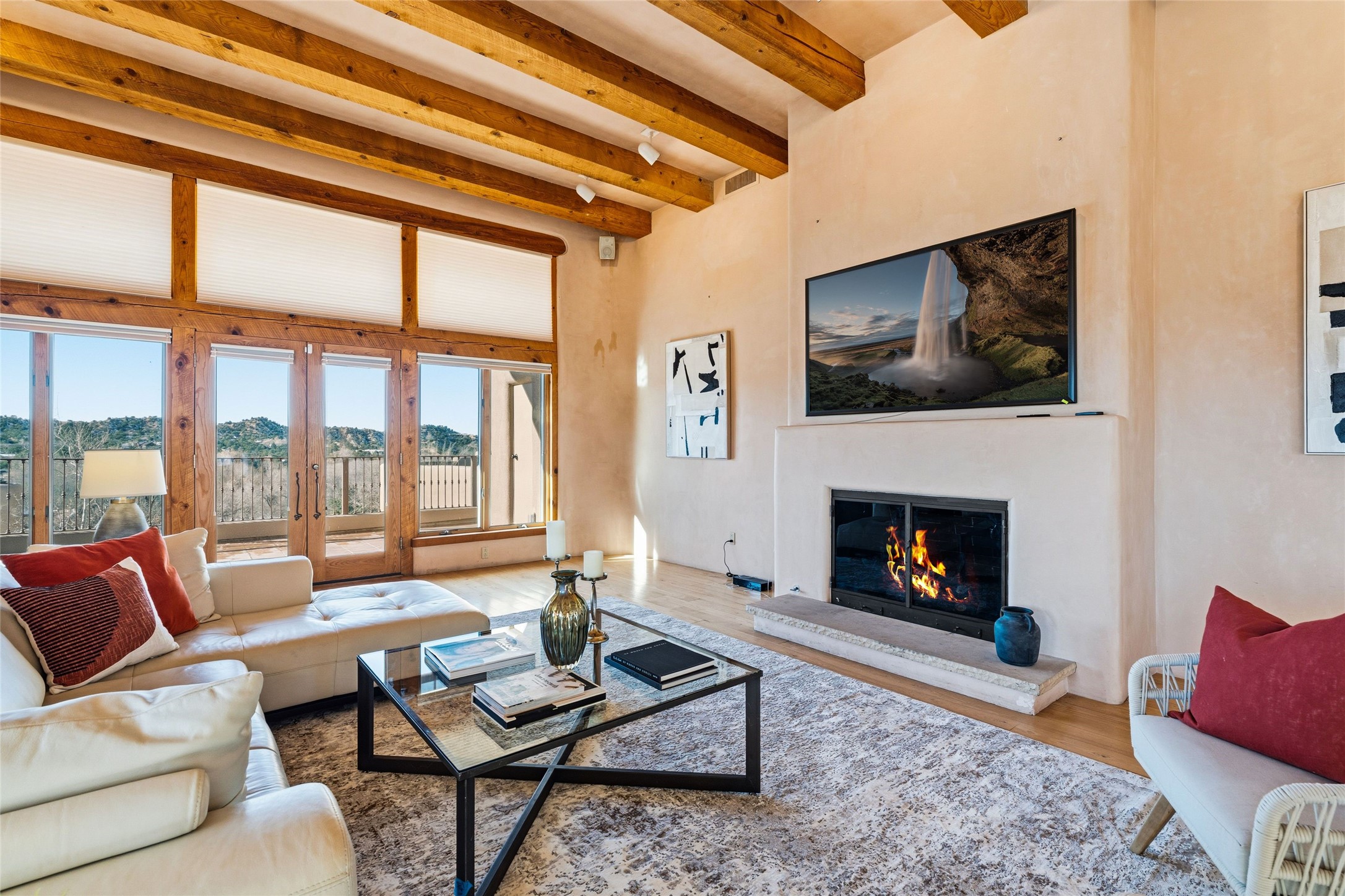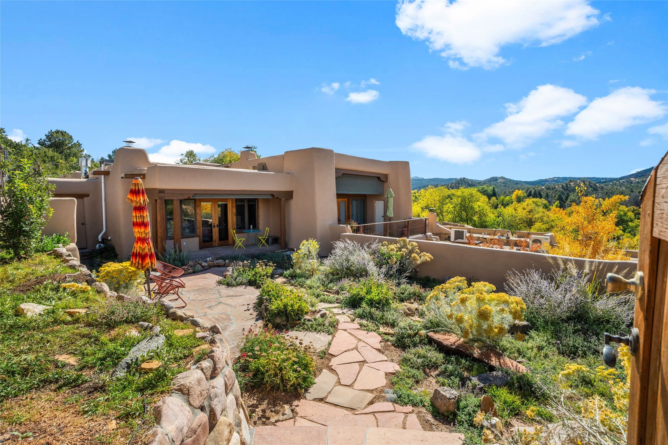 Where History Meets the River. In the heart of the Tesuque foothills, where the river still runs and cottonwoods shade the valley floor, stands a home unlike any other in Santa Fe. At its center: a circular Kiva with three-foot-thick adobe walls, built as a silo by the Tewa people in the 1750s--a full century before the tax assessor's official 1867 date. These massive walls have witnessed the entire arc of New Mexico's history, from Spanish colonial times through statehood and into the present day. The intimate, contemplative space of the Kiva--one of seven fireplaces in this gracious home--contrasts magnificently with the adjacent living room's soaring twenty-foot ceilings. This is architecture as conversation: between old and new, between earth and sky, between the quiet of thick adobe and the drama of light and volume. The Tesuque River runs alongside the property. Multiple portals and outdoor living spaces--carefully designed for four-season use--frame views of the Sangre de Cristo Mountains. The primary suite occupies its own level with expansive living room, dressing room, and bath, opening onto a private outdoor terrace. A fully renovated guest suite (circa 2007) offers its own entrance for visiting family or creative collaborators. A third guest area completes the flexible floor plan. Since 2024, the property has undergone comprehensive renovation: new boiler system, updated plumbing and electrical, complete perimeter adobe wall replacing the original coyote fence, restored and newly constructed portals, custom ironwork throughout, and fresh exterior paint. Modern infrastructure--updated security system, new internet, central air supplemented by mini-splits--supports contemporary life within these historic walls. Ten minutes from the Plaza. A mile from Bishop's Lodge. Adjacent to the river. Rooted in three centuries of history and ready for its next chapter. Tesuque foothills, 10 minutes from Santa Fe Plaza. Adjacent to Tesuque River. Bishop's Lodge approximate