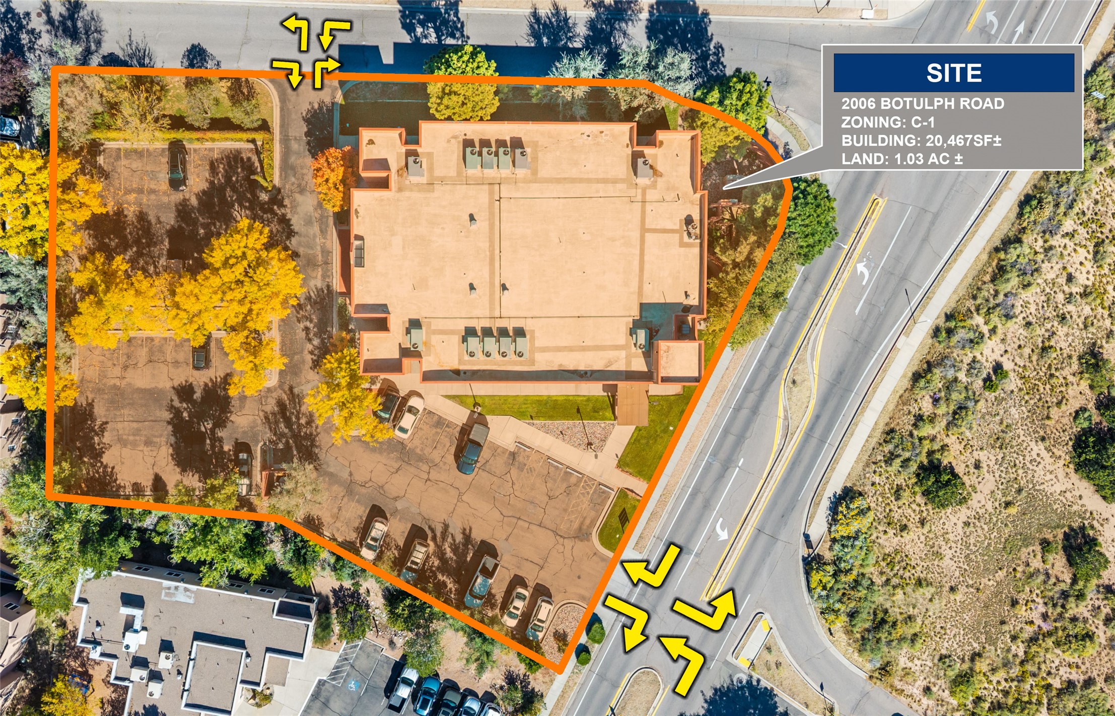 Premium office suites on the second floor with views, accessed by elevator and stairs. The Catron Building at 2006 Botulph Road is a well-located, two-story professional office property in the heart of Santa Fe's medical and business corridor. Offering 20,467 square feet on 0.90 acres, the building provides flexible suite configurations, excellent natural light, ADA-accessible restrooms, and elevator service. The property is ideal for medical, dental, behavioral health, administrative office, or professional services users. Currently, the building offers a balanced mix of leased suites and 11,323 RSF of vacancy, allowing versatile pathways for owner-users, investors, or businesses seeking a full-building HQ near Christus St. Vincent Hospital, St. Michael's Drive, and I-25. A fresh asphalt overlay, restriped 54-space parking lot, and mature landscaping make this an attractive and functional home for a wide range of professional uses. Zoning is C-1, permitting a variety of commercial and office applications. LOCATION: Situated just off St. Michael's Drive, this property offers seamless access to Santa Fe's medical hub, downtown, Hwy 285, and I-25. The immediate area includes medical clinics, law firms, financial services, and professional offices. The location serves both local residents and the region's robust healthcare community.
