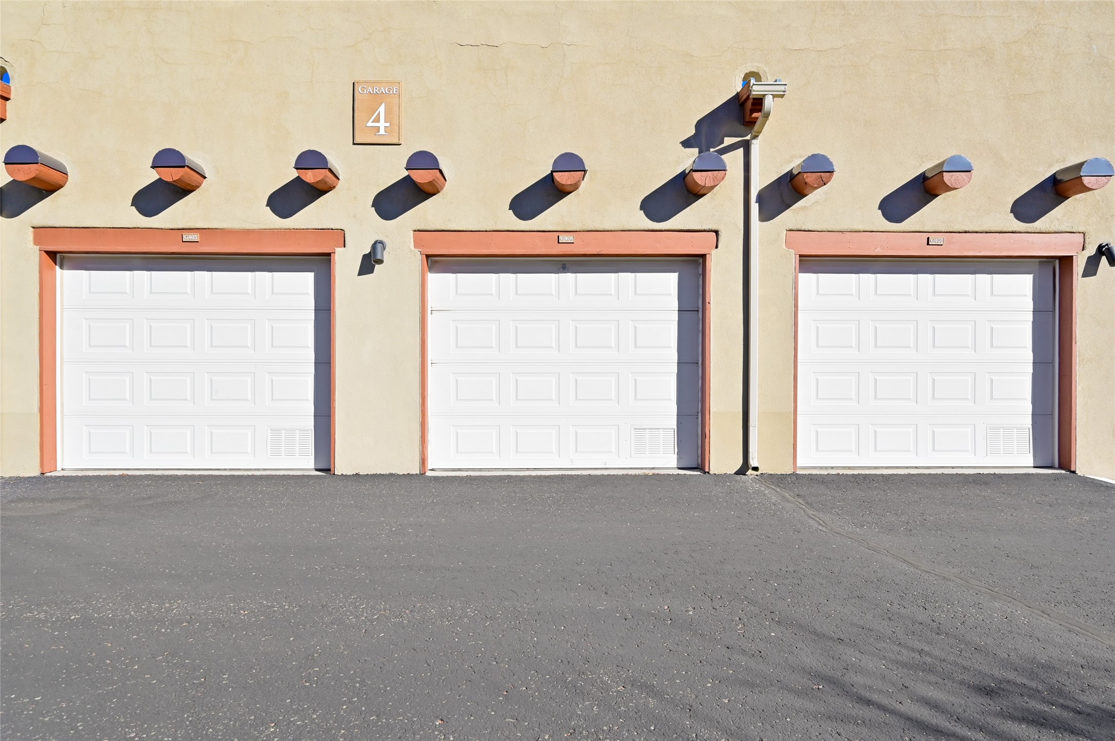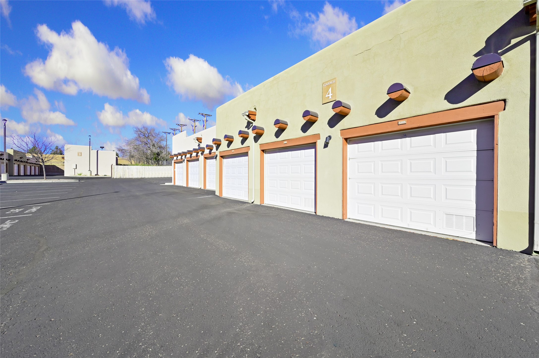 Simple living at The Alameda. This move-in-ready condominium offers one bedroom and one-and-a-half baths, showcasing classic Santa Fe architectural charm with exposed vigas and corbels, along with wood-like and slate tile flooring, granite countertops, and a gas kiva fireplace. A built-in office area provides an ideal work-from-home solution, complemented by an in-unit laundry room for added convenience.Ideally situated near the elevator and the door to the parking area, the location offers exceptional ease for daily living and bringing in groceries or supplies. The open, well-lit floor plan is warmed by the gas kiva fireplace--perfect for winter months--while stainless steel appliances and granite countertops elevate the kitchen's polished finish.The Alameda condominiums offer premier amenities, including a fitness center, community kitchen, multiple lounge and common areas, and a heated outdoor courtyard pool with BBQ grill. Residents enjoy periodic community events and happy hours that enhance the sense of community.Additional features include an extra storage unit conveniently located 2 doors down the hall, a single-car garage, onsite professional management, and 24-hour controlled access. Centrally located near shopping, dining, and entertainment, this residence blends timeless Santa Fe style with modern comfort and convenience.