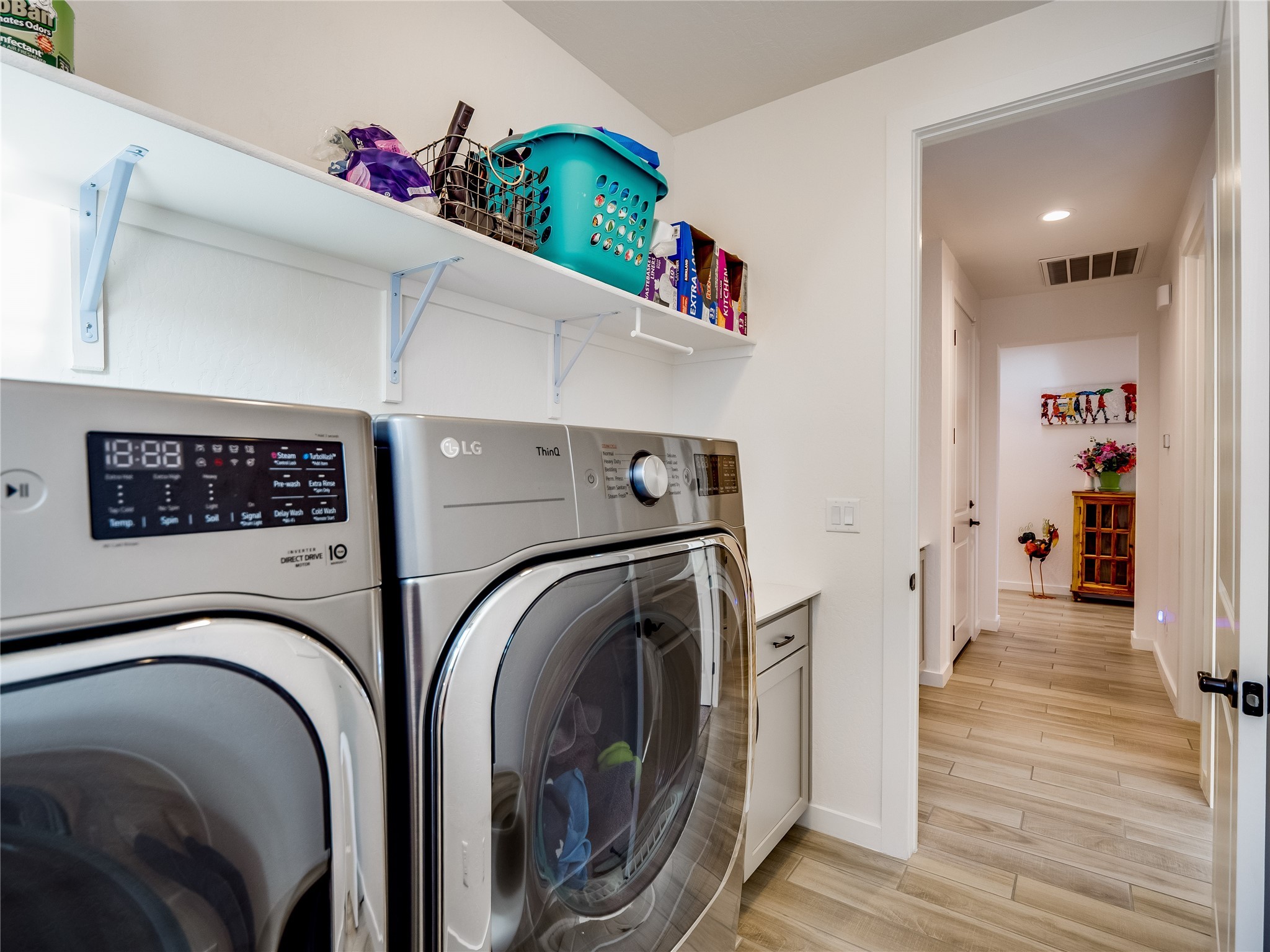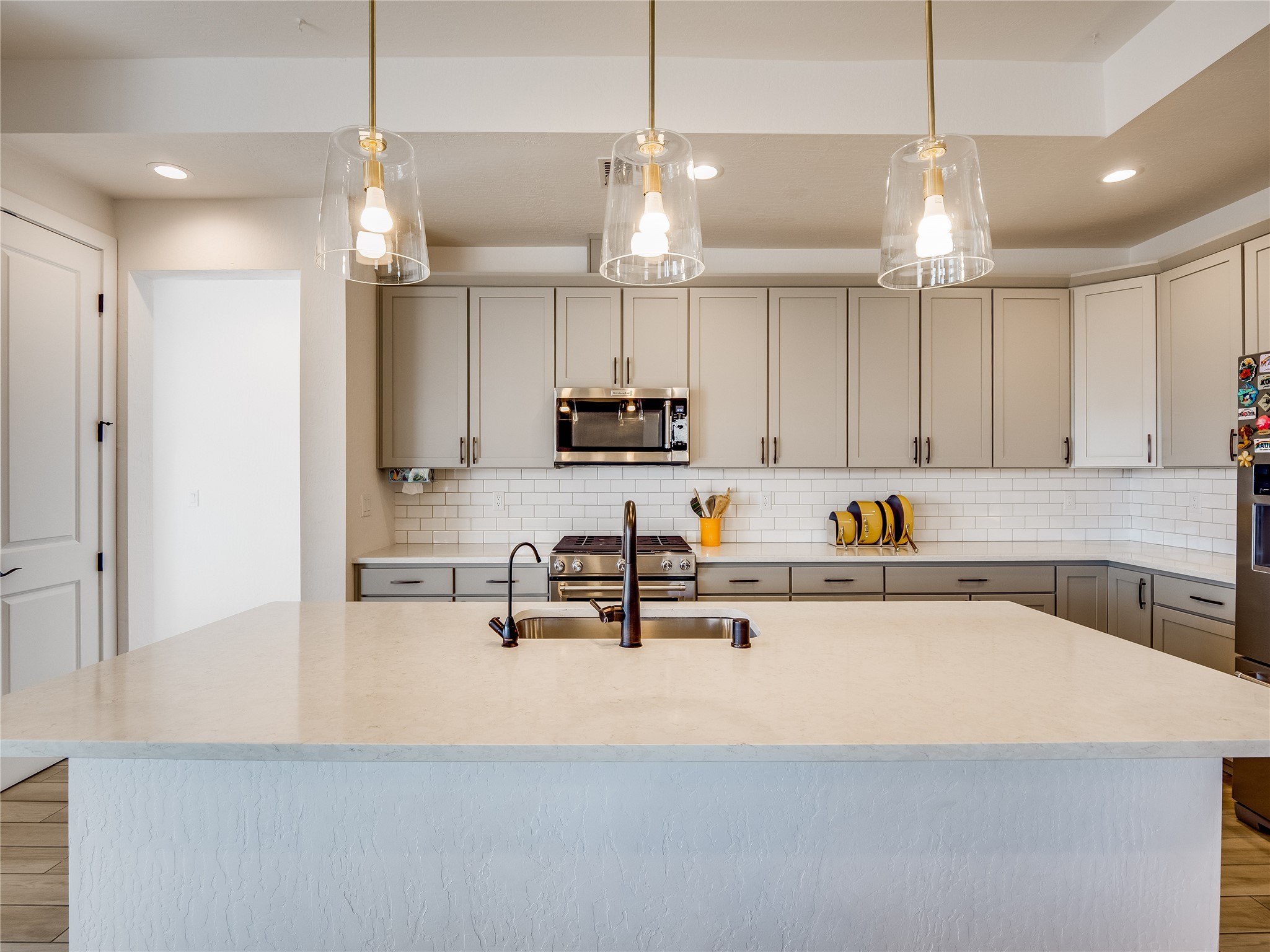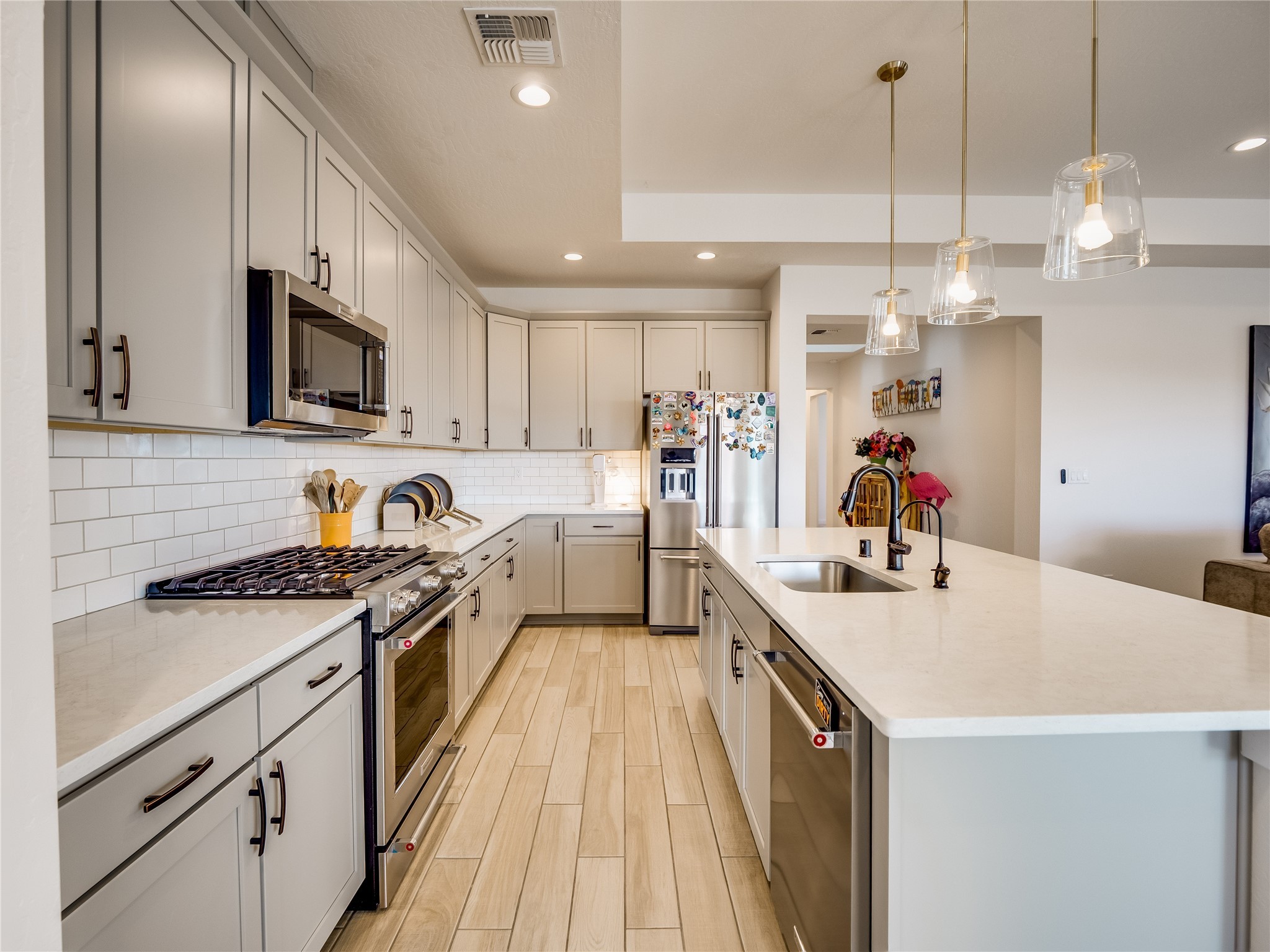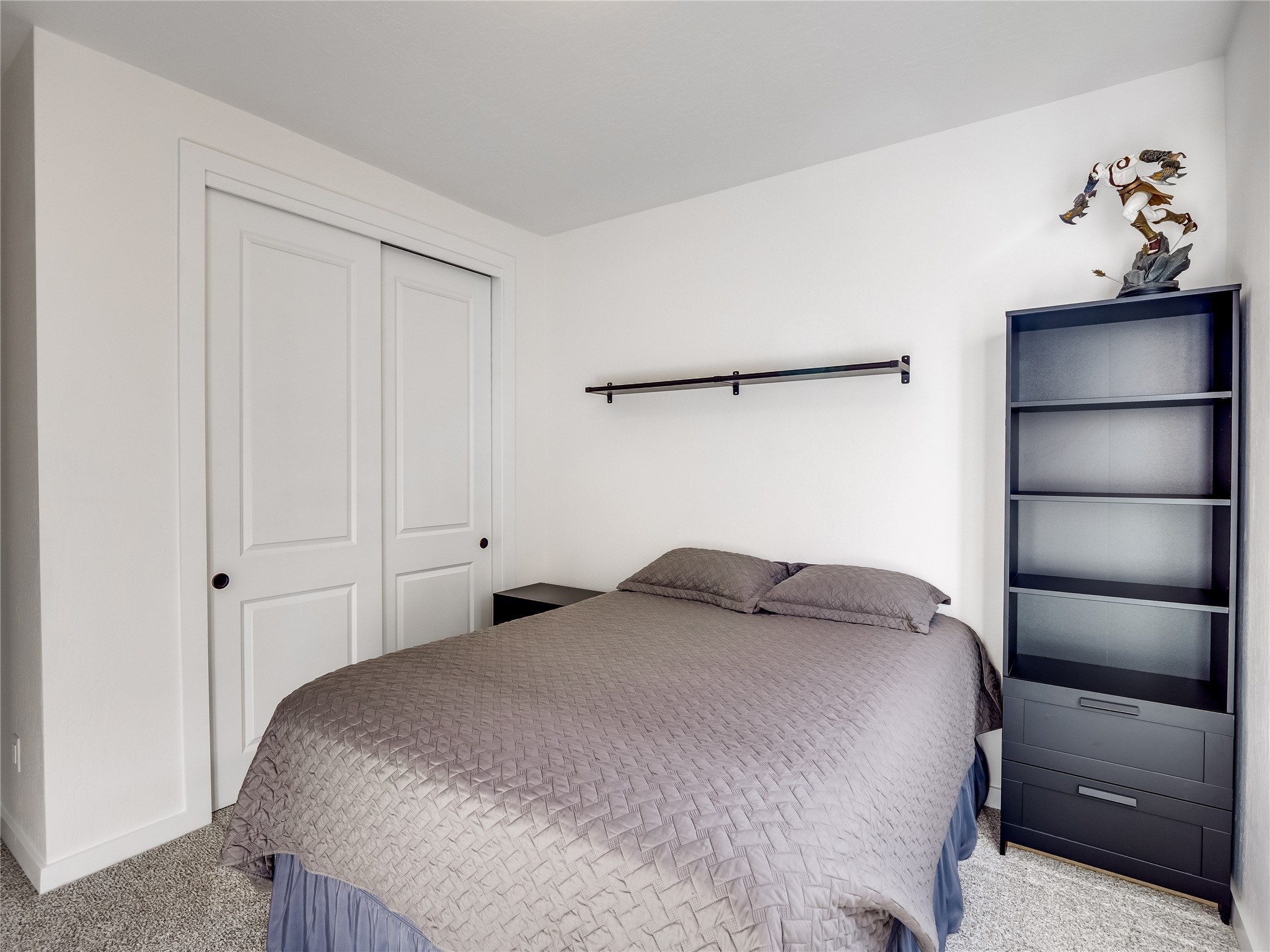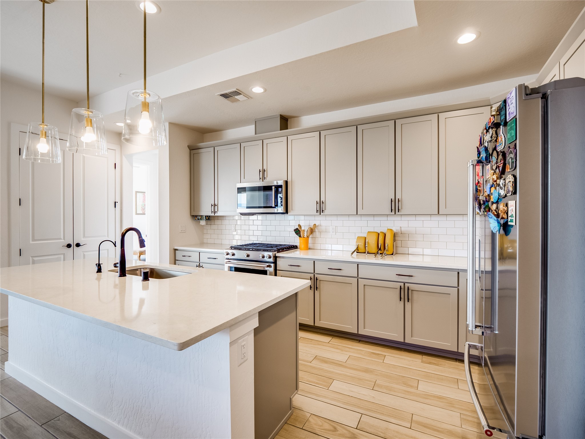 Gorgeous single level modern home blends clean design, natural light, and effortless livability in the desirable White Rock community. A low maintenance front yard invites you to a covered porch, creating welcoming curb appeal without the burden of upkeep. Step inside to a long, skylit foyer with durable tile flooring that flows through the main living areas. Natural light leads you into a bright, great room layout. The spacious living room easily accommodates a large sectional, perfect for movie nights and everyday comfort. Centered is a gas fireplace with decorative tile surround, framed by built-in cabinets for style and storage. The adjacent kitchen offers modern sophistication with warm, cohesive finishes. A large center island provides seating and workspace, highlighted by gold pendant lighting. Taupe cabinets with bronze hardware pair beautifully with a white tile backsplash, quartz counters, and stainless steel appliances. A sizable pantry enhances organization and convenience. The dining area features sliding doors that open to a covered patio and a fully fenced backyard designed for low-maintenance enjoyment. Complete with turf, trees, and mountain views, the space offers room for creativity, ideal for, planters, or personal design. Near the entry, two guest bedrooms with carpet share a Jack-and-Jill full bathroom for a smart, efficient layout. A secondary hallway hosts an additional guest bedroom and bathroom with single sink vanity and tiled walk-in shower with glass enclosure. This hall also includes a laundry room with sink and direct access to the two-car garage for added practicality. Tucked toward the back, the primary suite serves as a peaceful retreat with carpet flooring, expansive windows, and mountain views. The spa like ensuite features tile flooring, double-sink vanity, and a walk-in tiled shower with built-in bench. A custom-organized walk-in closet maximizes storage. Move-in ready and waiting for you to schedule your tour today!