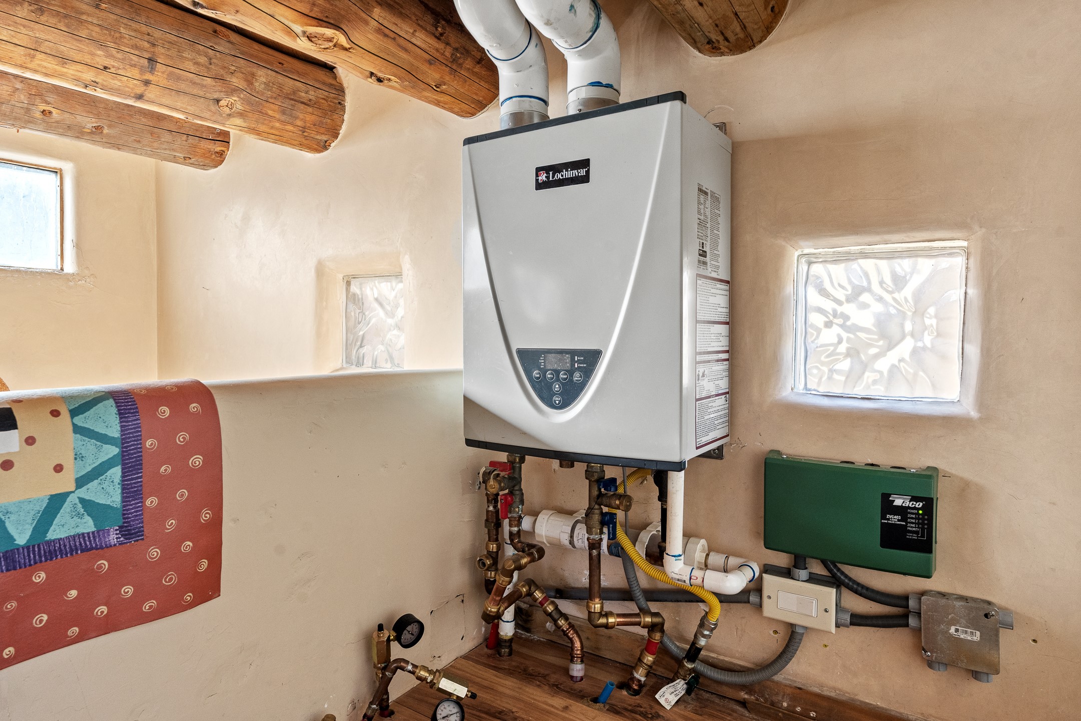 Just minutes from the historic Plaza, this freestanding condo with no shared walls offers the perfect blend of privacy, charm, and location. Situated at 107A Moore, you're ideally positioned near the Casa Solana Shopping Center, the Santa Fe River, and scenic trails that effortlessly lead you downtown. This sweet and sophisticated 1-bedroom residence is rich in authentic Santa Fe character and thoughtful upgrades. The open living space features a cozy kiva fireplace, vigas, tongue-and-groove ceilings, smooth plaster walls, and sleek concrete flooring throughout. The kitchen is appointed with granite countertops and stainless steel appliances, while the spa-like bathroom showcases a striking tiger's eye sink paired with white quartz counter. Comfort is ensured year-round with mini-split heating and cooling, and a washer and dryer convey for added convenience. A compact lofted storage area provides bonus space and is accessed via pull-down stairs through the laundry room. Outside, enjoy your own private courtyard, beautifully enclosed by coyote fencing an ideal setting for outdoor dining, morning coffee, or evening wine under the Santa Fe sky.A rare opportunity to own a private, freestanding condo in a highly desirable and walkable location close to everything Santa Fe has to offer.
