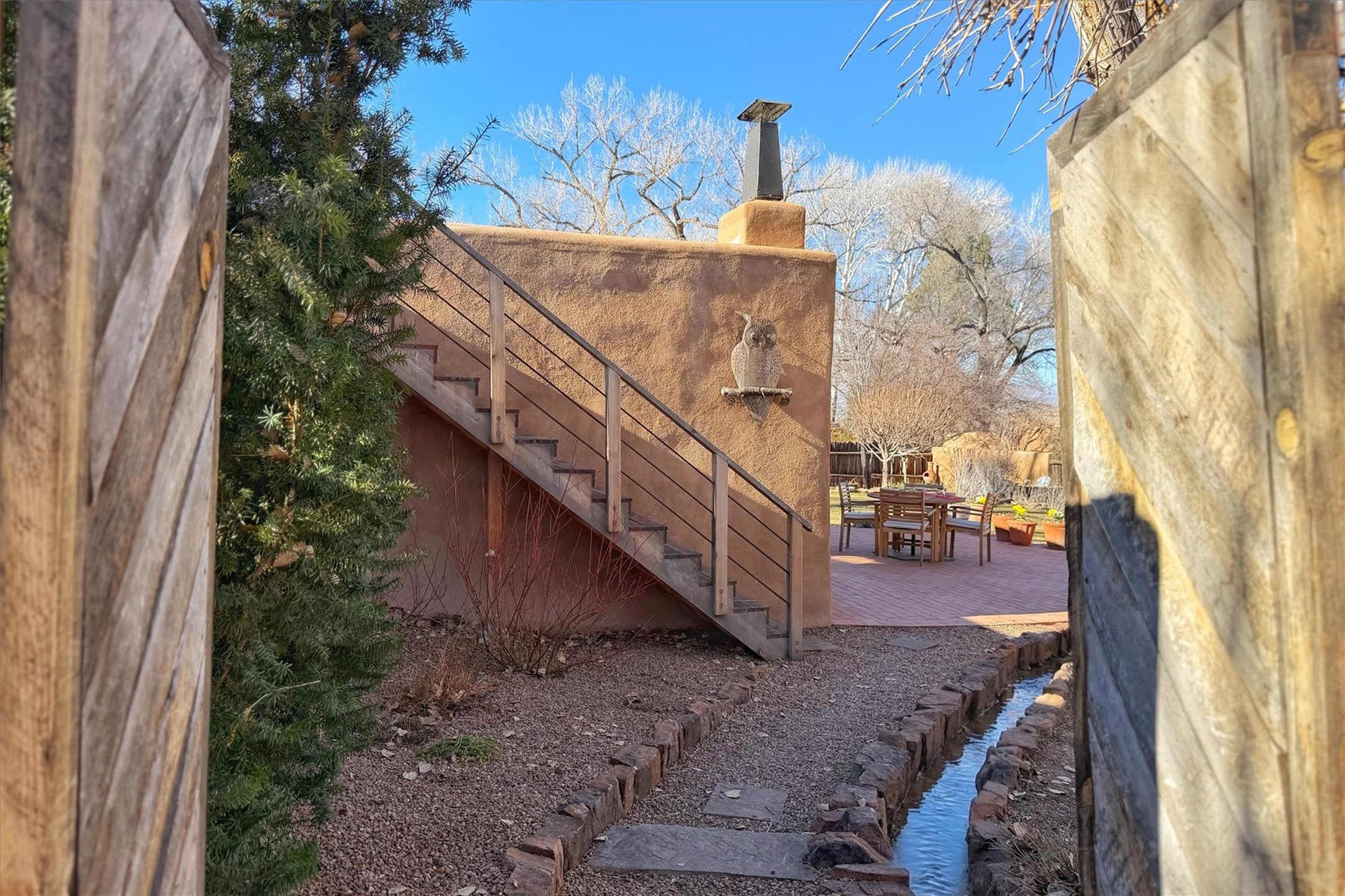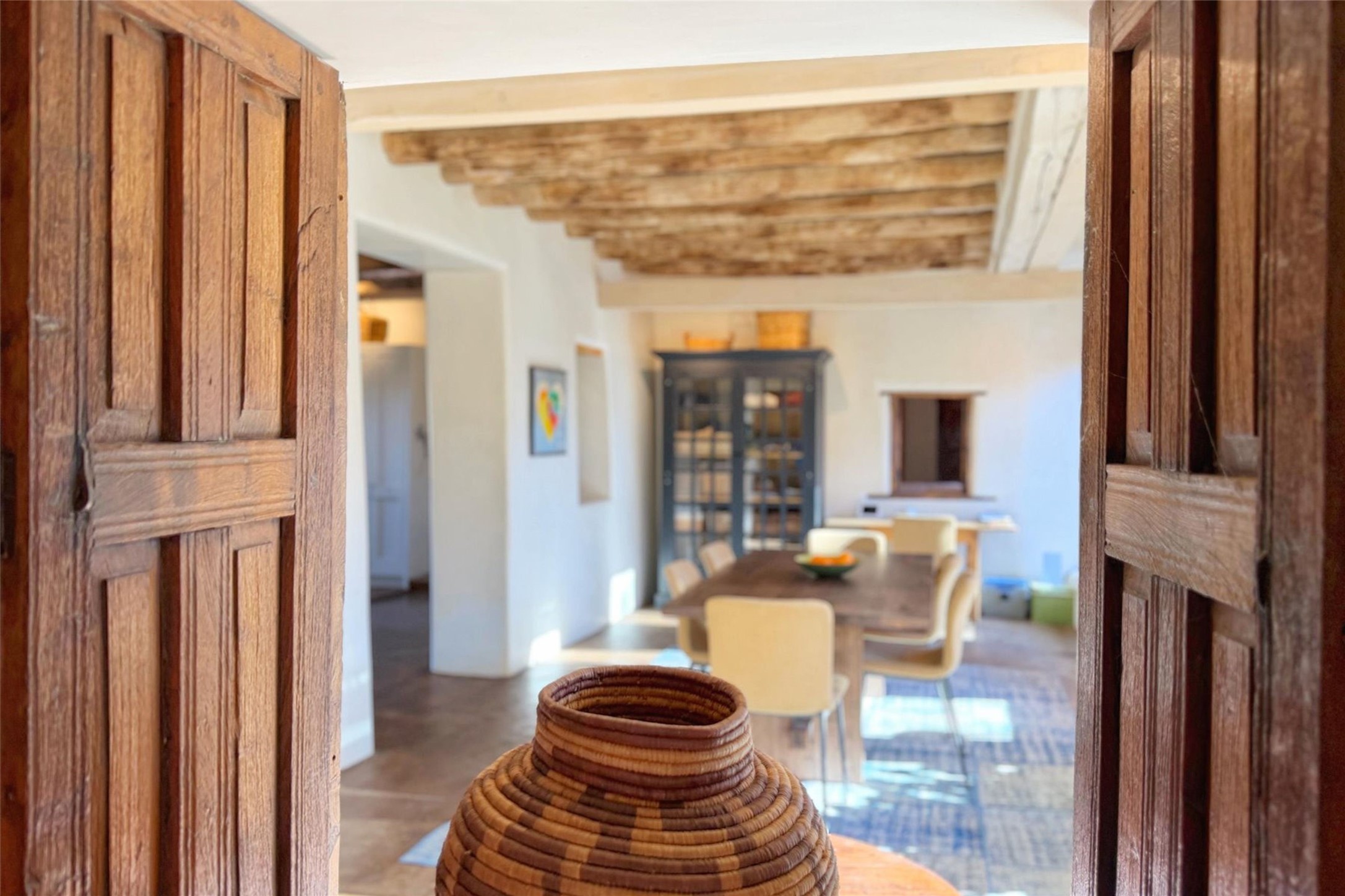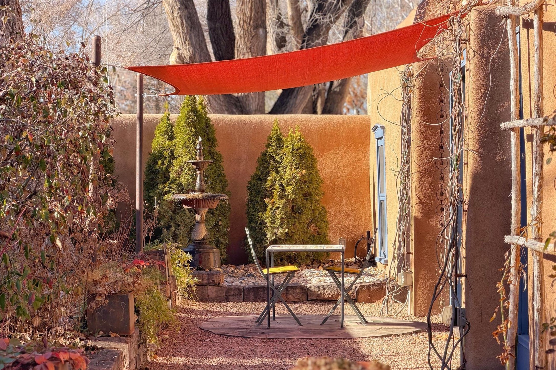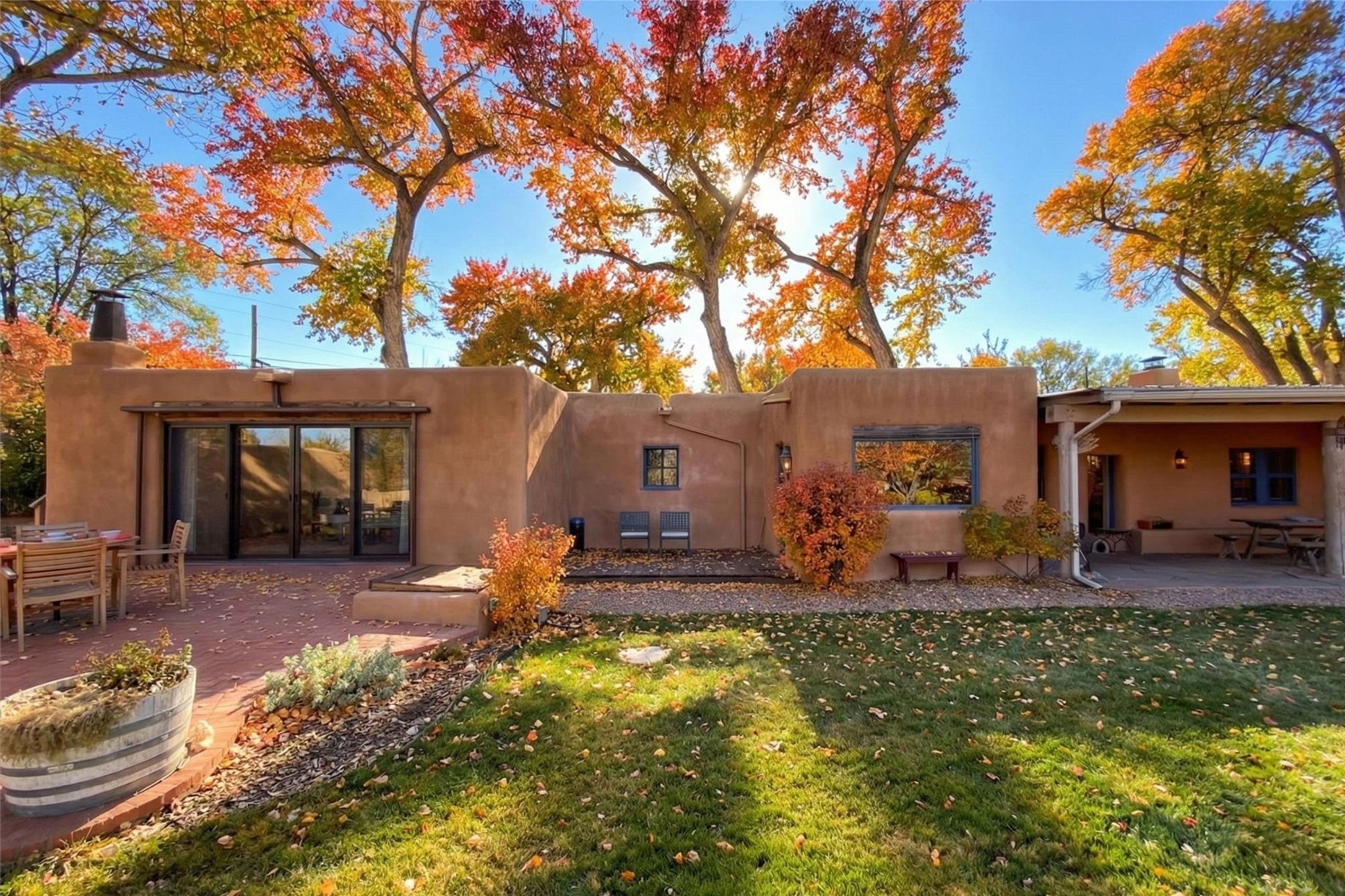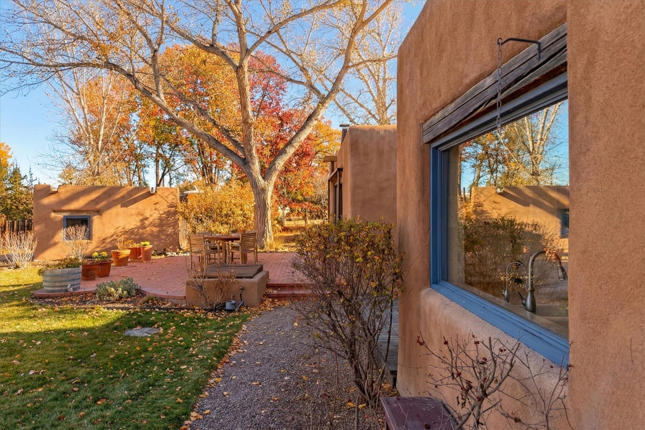 Located in the historic Jacona Plaza set in the verdant river valley is a rare Northern New Mexico retreat where history, artistry, and modern comfort converge. Although the setting feels peaceful and timeless, the property is ideally located just 20 minutes from Santa Fe and 15 minutes from Los Alamos, offering easy access to culture, dining, and employment while preserving a true sense of escape. The approximately 3,047 sq. ft. adobe home reflects generations of craftsmanship, with portions of the original structure thoughtfully preserved and enhanced through extensive restoration. Historic water rights, an active acequia system dating back to the 1700s, and a 2,000-gallon rainwater catchment system underscore the property's enduring relationship with the land and its sustainable traditions. Inside, abundant natural light fills the home through expansive windows, French doors, and skylights, illuminating authentic architectural details such as hand-carved vigas, wood, brick, mud floors, and multiple fireplaces. The flowing layout connects a spacious living room to a well-appointed cook's kitchen and gathering area, anchored by a striking dining room ideal for both intimate meals and larger celebrations. Three bedrooms and three bathrooms are thoughtfully arranged to provide comfort and privacy. Outdoor spaces are equally inviting, beginning with a traditional enclosed courtyard accented by fountains. Mature landscaping surrounds an elegant patio, raised-bed vegetable gardens, and a small fruit orchard, all set against sweeping views of the Barrancas. Completing the property is a newly constructed 381 sq. ft. art studio--an inspiring space for creative work, a private office, or quiet retreat. Set on approximately .815 acres, this property offers the tranquility of a historic river valley setting with the convenience of being minutes from Highway 502, Highway 285, Santa Fe, Los Alamos, and Taos--an uncommon opportunity to enjoy the best of Northern New Mexico living.