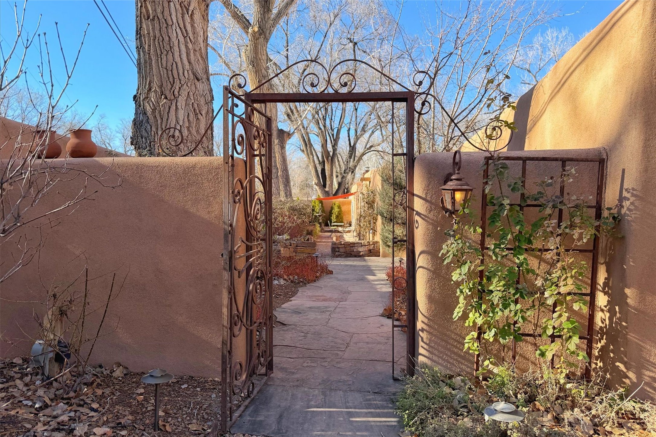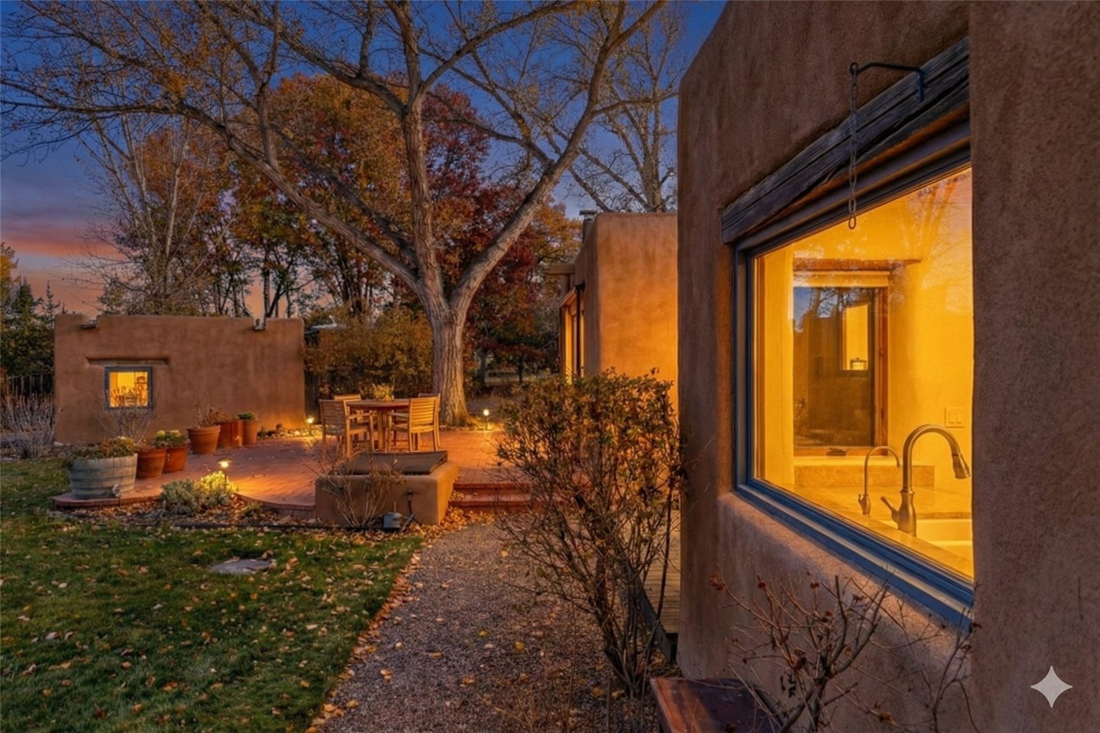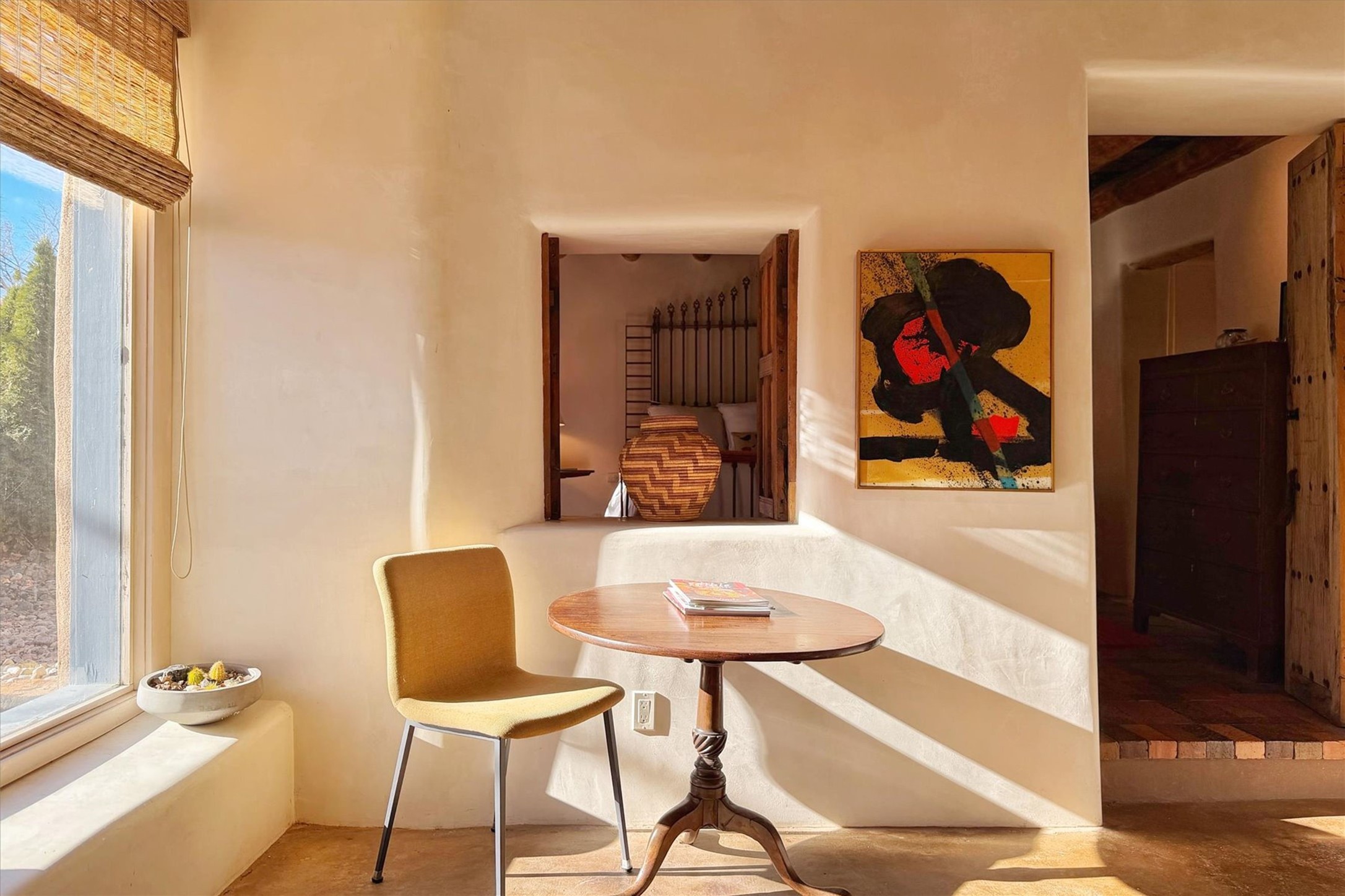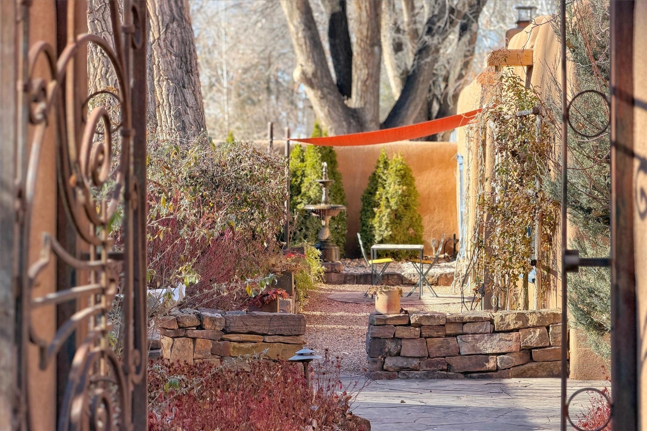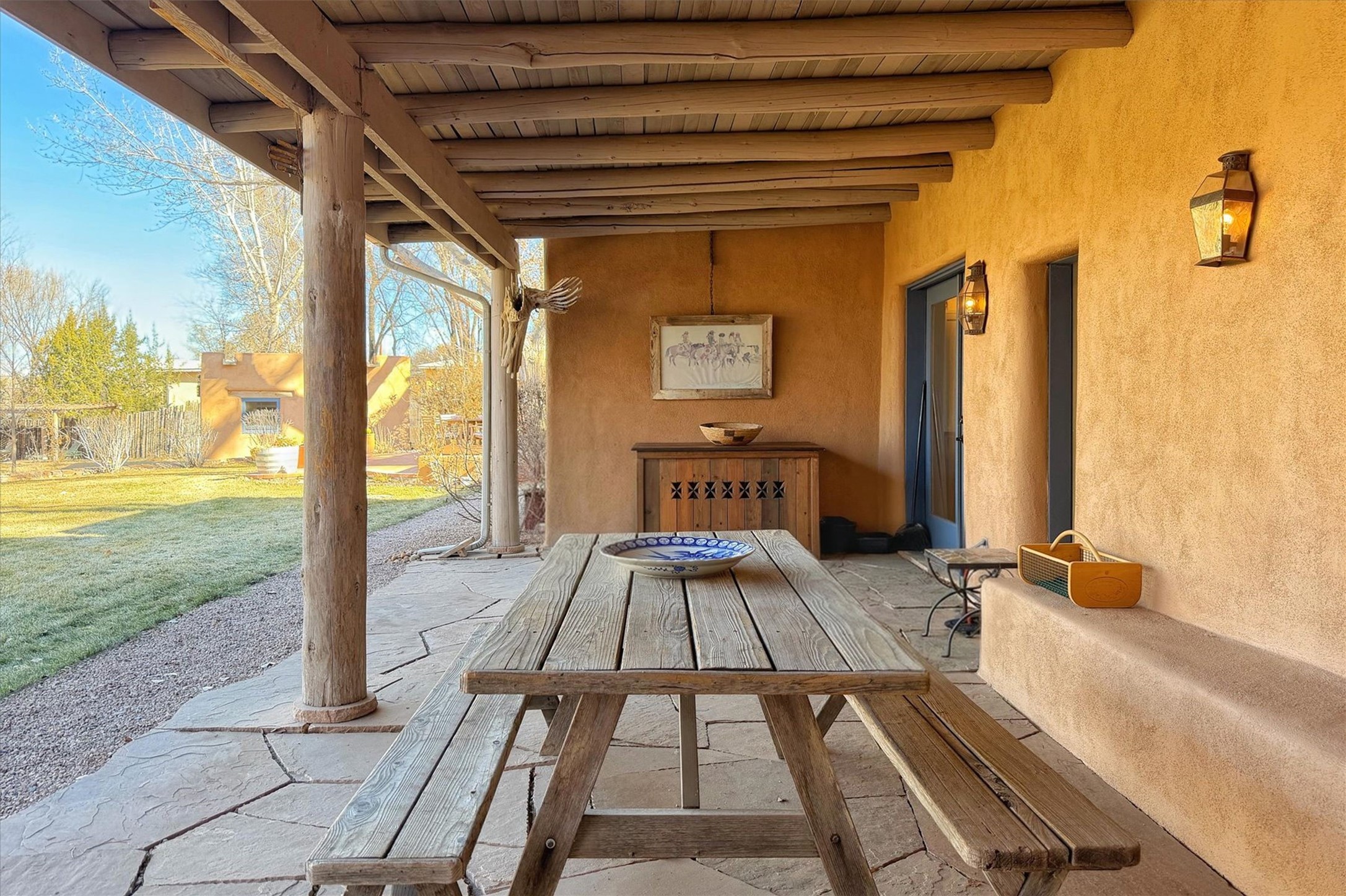 Located in the historic Jacona Plaza set in the verdant river valley is a rare Northern New Mexico retreat where history, artistry, and modern comfort converge. Although the setting feels peaceful and timeless, the property is ideally located just 20 minutes from Santa Fe and 15 minutes from Los Alamos, offering easy access to culture, dining, and employment while preserving a true sense of escape. The approximately 3,047 sq. ft. adobe home reflects generations of craftsmanship, with portions of the original structure thoughtfully preserved and enhanced through extensive restoration. Historic water rights, an active acequia system dating back to the 1700s, and a 2,000-gallon rainwater catchment system underscore the property's enduring relationship with the land and its sustainable traditions. Inside, abundant natural light fills the home through expansive windows, French doors, and skylights, illuminating authentic architectural details such as hand-carved vigas, wood, brick, mud floors, and multiple fireplaces. The flowing layout connects a spacious living room to a well-appointed cook's kitchen and gathering area, anchored by a striking dining room ideal for both intimate meals and larger celebrations. Three bedrooms and three bathrooms are thoughtfully arranged to provide comfort and privacy. Outdoor spaces are equally inviting, beginning with a traditional enclosed courtyard accented by fountains. Mature landscaping surrounds an elegant patio, raised-bed vegetable gardens, and a small fruit orchard, all set against sweeping views of the Barrancas. Completing the property is a newly constructed 381 sq. ft. art studio--an inspiring space for creative work, a private office, or quiet retreat. Set on approximately .815 acres, this property offers the tranquility of a historic river valley setting with the convenience of being minutes from Highway 502, Highway 285, Santa Fe, Los Alamos, and Taos--an uncommon opportunity to enjoy the best of Northern New Mexico living.