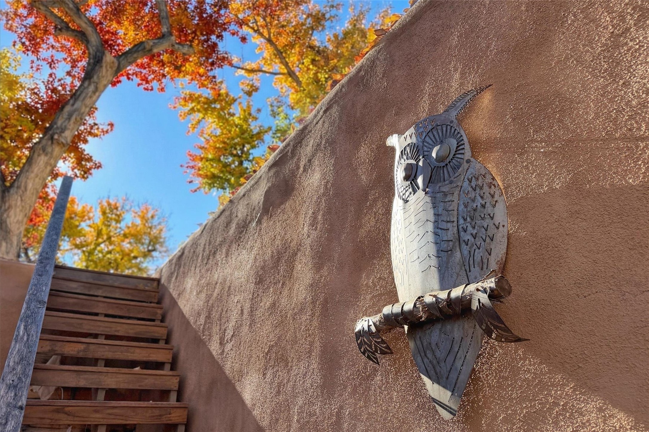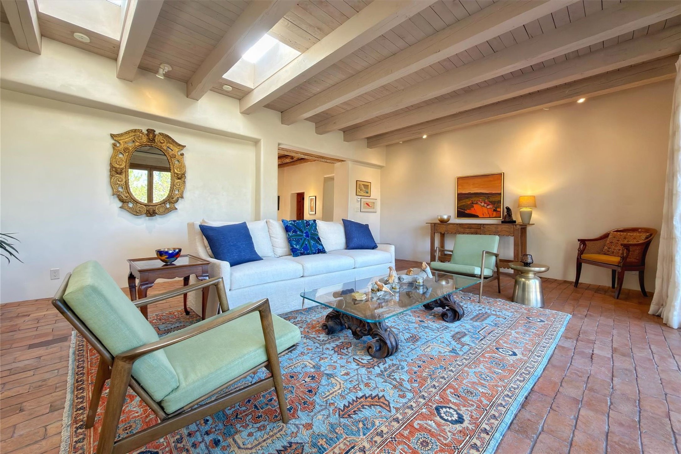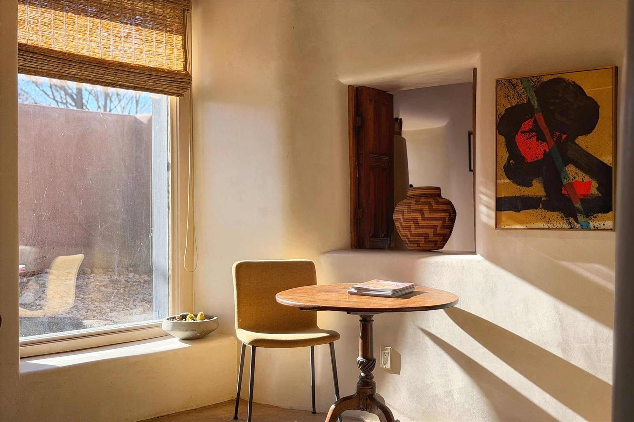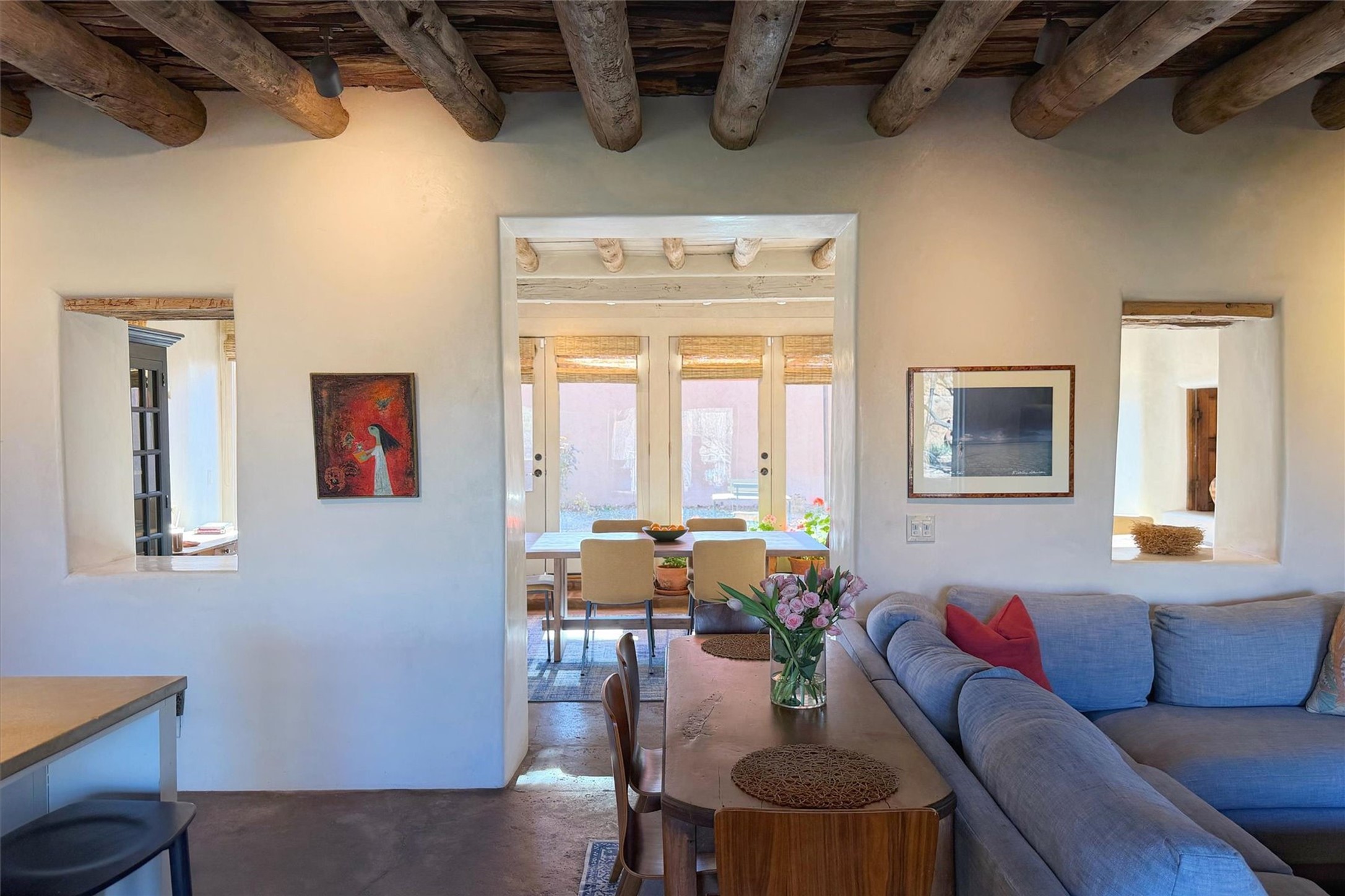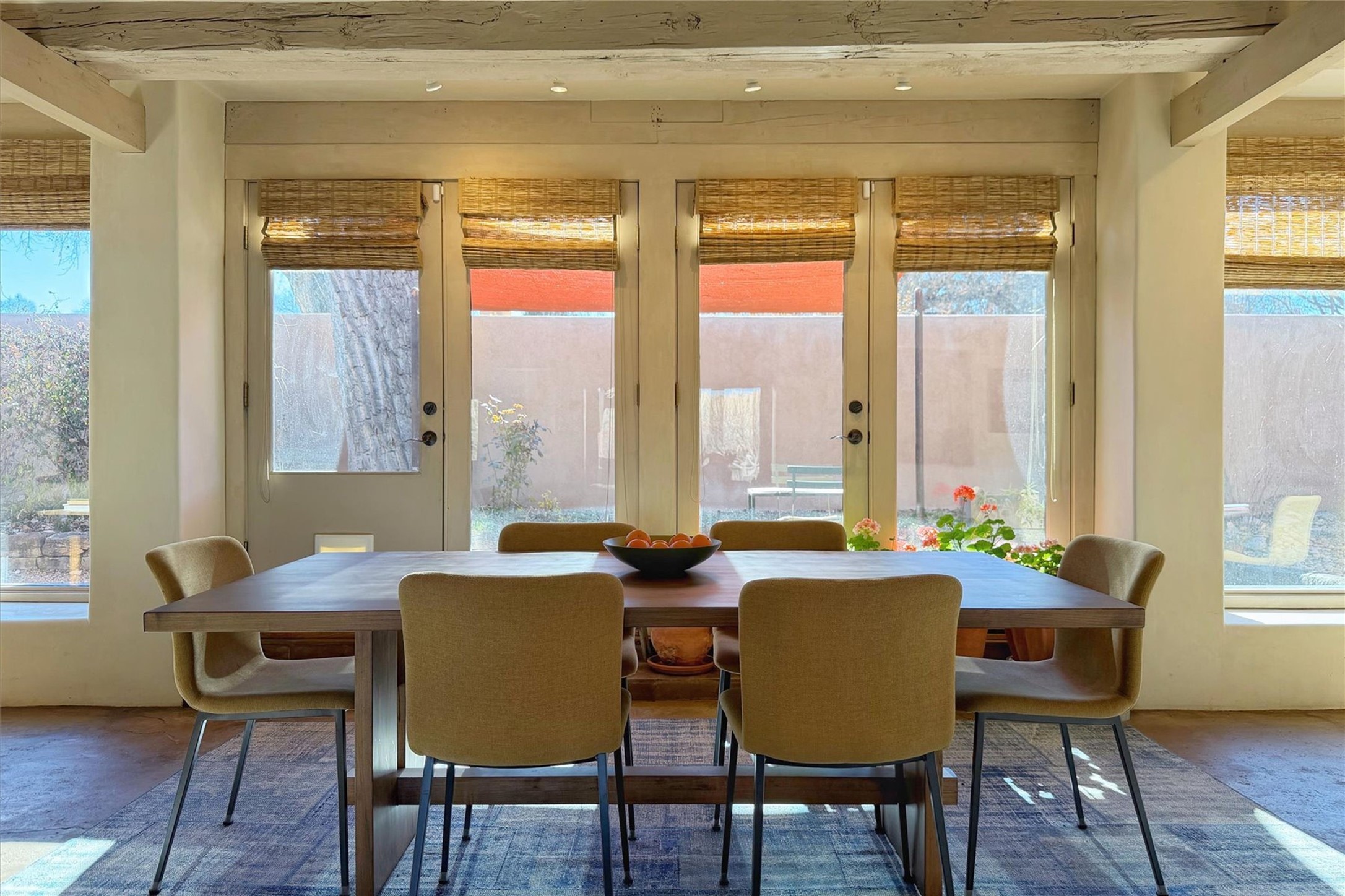 Located in the historic Jacona Plaza set in the verdant river valley is a rare Northern New Mexico retreat where history, artistry, and modern comfort converge. Although the setting feels peaceful and timeless, the property is ideally located just 20 minutes from Santa Fe and 15 minutes from Los Alamos, offering easy access to culture, dining, and employment while preserving a true sense of escape. The approximately 3,047 sq. ft. adobe home reflects generations of craftsmanship, with portions of the original structure thoughtfully preserved and enhanced through extensive restoration. Historic water rights, an active acequia system dating back to the 1700s, and a 2,000-gallon rainwater catchment system underscore the property's enduring relationship with the land and its sustainable traditions. Inside, abundant natural light fills the home through expansive windows, French doors, and skylights, illuminating authentic architectural details such as hand-carved vigas, wood, brick, mud floors, and multiple fireplaces. The flowing layout connects a spacious living room to a well-appointed cook's kitchen and gathering area, anchored by a striking dining room ideal for both intimate meals and larger celebrations. Three bedrooms and three bathrooms are thoughtfully arranged to provide comfort and privacy. Outdoor spaces are equally inviting, beginning with a traditional enclosed courtyard accented by fountains. Mature landscaping surrounds an elegant patio, raised-bed vegetable gardens, and a small fruit orchard, all set against sweeping views of the Barrancas. Completing the property is a newly constructed 381 sq. ft. art studio--an inspiring space for creative work, a private office, or quiet retreat. Set on approximately .815 acres, this property offers the tranquility of a historic river valley setting with the convenience of being minutes from Highway 502, Highway 285, Santa Fe, Los Alamos, and Taos--an uncommon opportunity to enjoy the best of Northern New Mexico living.