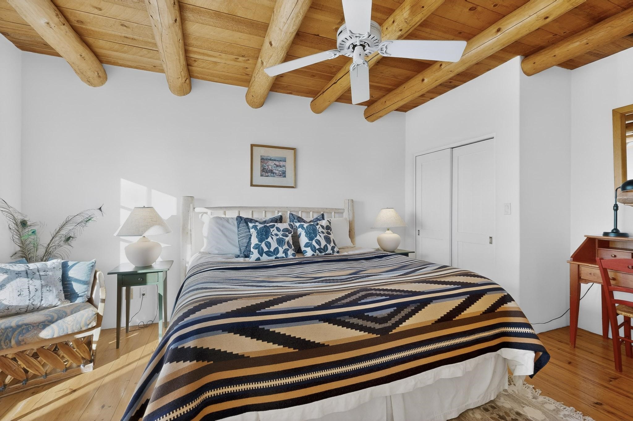 Santa Fe architectural details plus management to tend to every detail inside and out of this quarterownership property. Very nice two story condo, two bedrooms, each with private bath. Especially well situated on the property, this home enjoys sunset and city lights views from the upstairs deck. Walk through a handcrafted gate at the front entry courtyard and into a wel furnished and impeccably maintained home, completely cared for by the condominium owners association staff. Inside are smooth plastered wals, kiva fireplaces in the living room and both bedrooms, ceiling vigas throughout, Saltillo tile and wide plank pine floors, and Talavera tile kitchen and baths. There's a completely enclosed landscaped back yard with gas grill and patio furnishings for outdoor dining and quiet relaxation. The HOA provides dedicated on-site management, all building and equipment maintenance, furnishings, landscaping, cleaning, and an established rental program. Quarter-share interest available in unit 11 of Campanilla Compound.