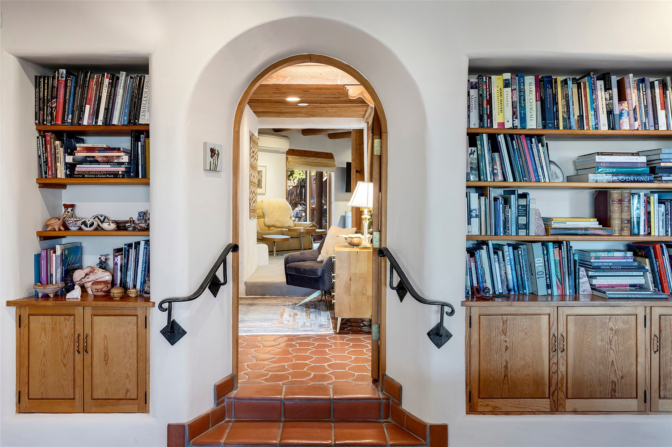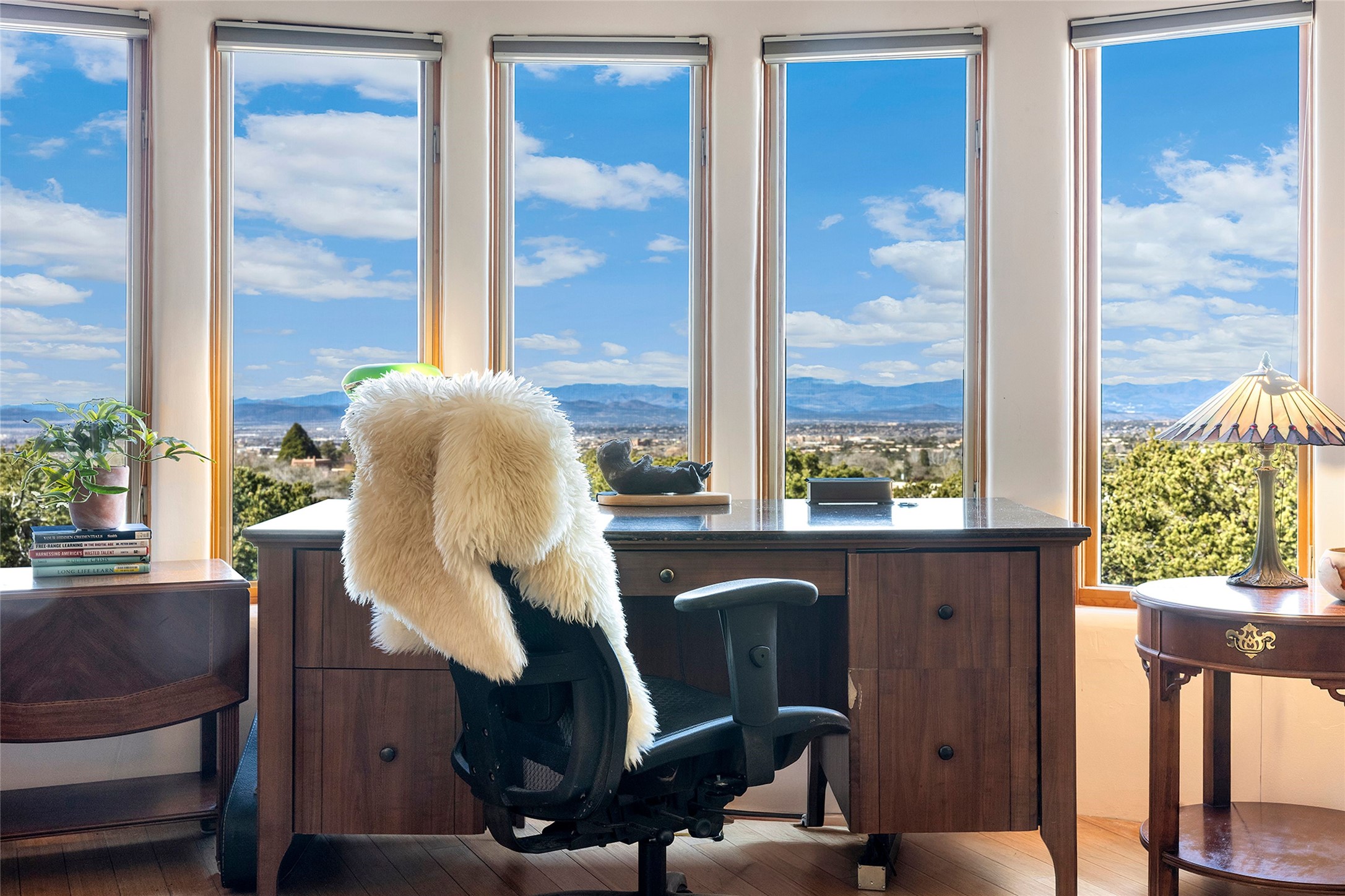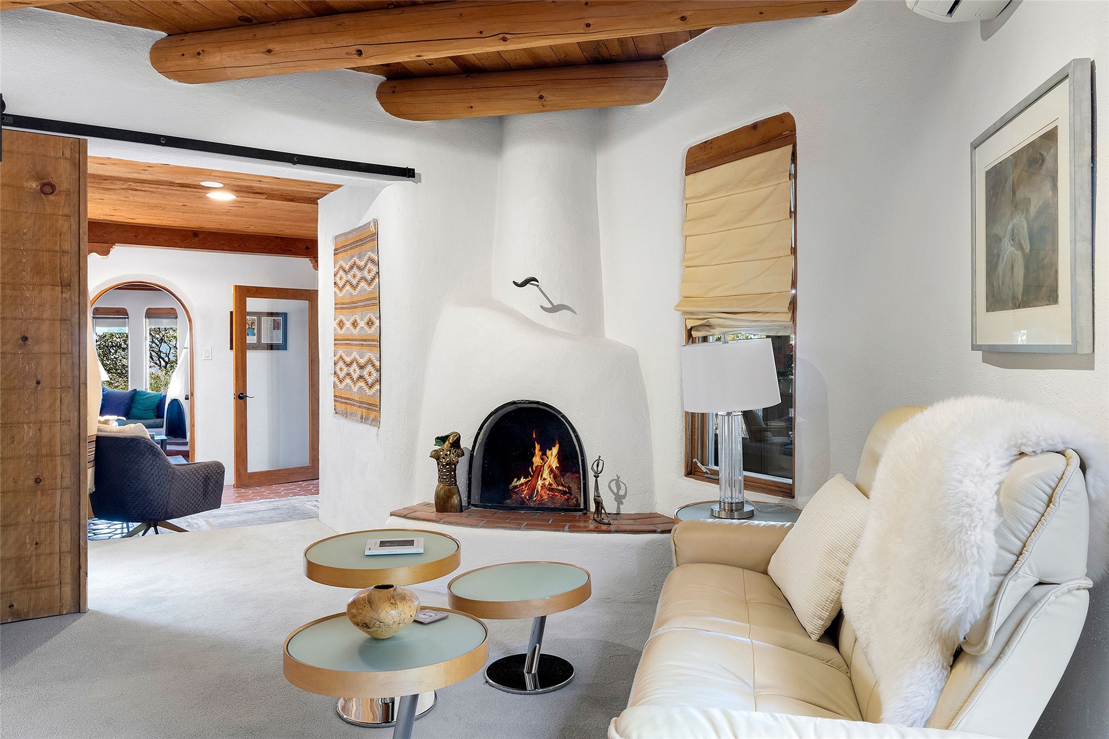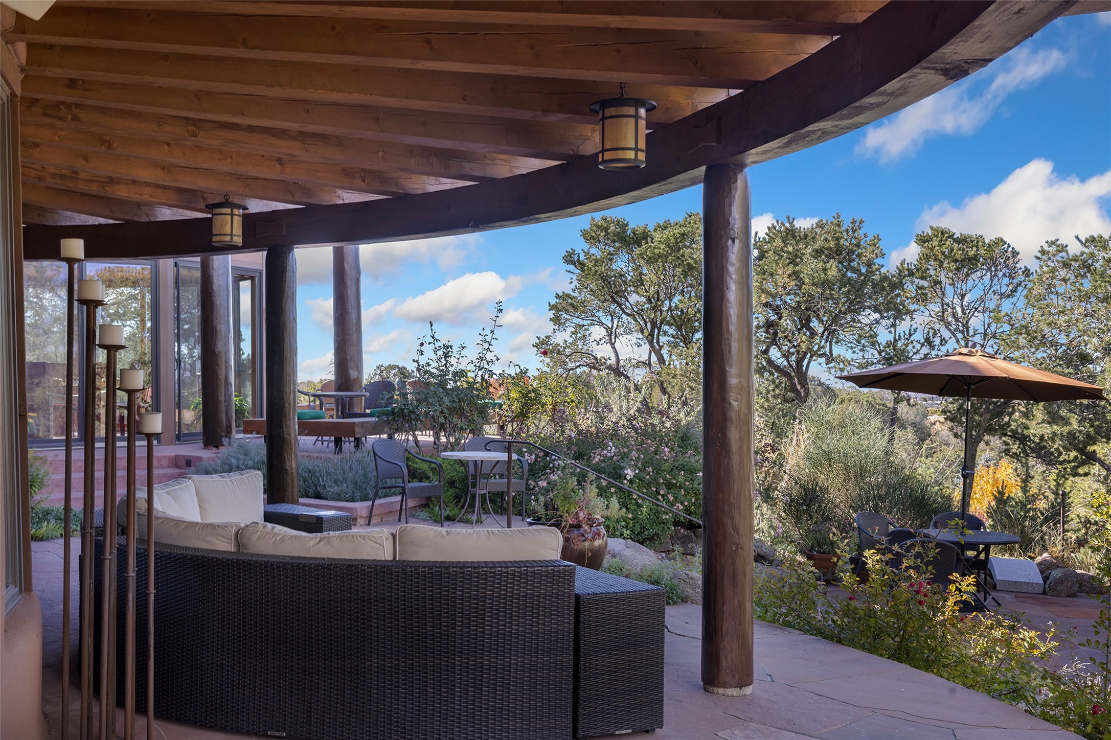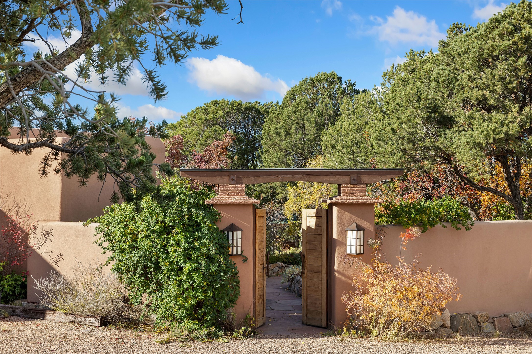 The Rocky Mountains stretch for 3,000 miles from Canada to New Mexico, taking their final shape in the Santa Fe foothills. 2022 Foothills Road is a fitting property to encapsulate the significance of this terminus, where the great mountains meet the special character of our town. The property comprises a 2-bedroom main house, a 2 bedroom casita, and an additional studio casita on 1.6 acres overlooking City lights below. The main house blends traditional puebloan design -- substantial rounded plaster walls, wooden vigas and latillas, and kiva fireplaces with modern proportions and touches of calming Japanese accents. The main level has a large primary suite with an updated bathroom, formal and informal sitting rooms, a secluded sunroom with a backdrop of a lush pond, and an indoor therapy pool room. Also on the main level is a light-filled kitchen wrapped with windows and featuring custom wooden cabinetry, a farmhouse sink, stone and wood countertops, and open display shelving that add warmth and architectural character. The showpiece of the main house is the glass-walled dining room that sits like a peninsula on the western edge, capturing expansive views of Santa Fe and the plains beyond to the Sandia Mountains in the south and sunsets atop the Jemez Mountains in the west. On the second level, exceptional views are further elevated. This upper story includes two rooms sharing a full bathroom, lending themselves as bedrooms or offices. On both levels, there is a powder room for guests. Regardless of the use, these rooms frame open skies as far as the eyes can see. Separate from the main house is the sized casita with 2 bedroom suites, and living area. Attached to this casita is the studio casita, an open and high-ceilinged room inviting the owner's creativity. The space can be used as an art studio, private work space, or a rentable living space as it features a kitchenette and bathroom. Finishing off the improvements is a large 2-car garage with extra storage space.