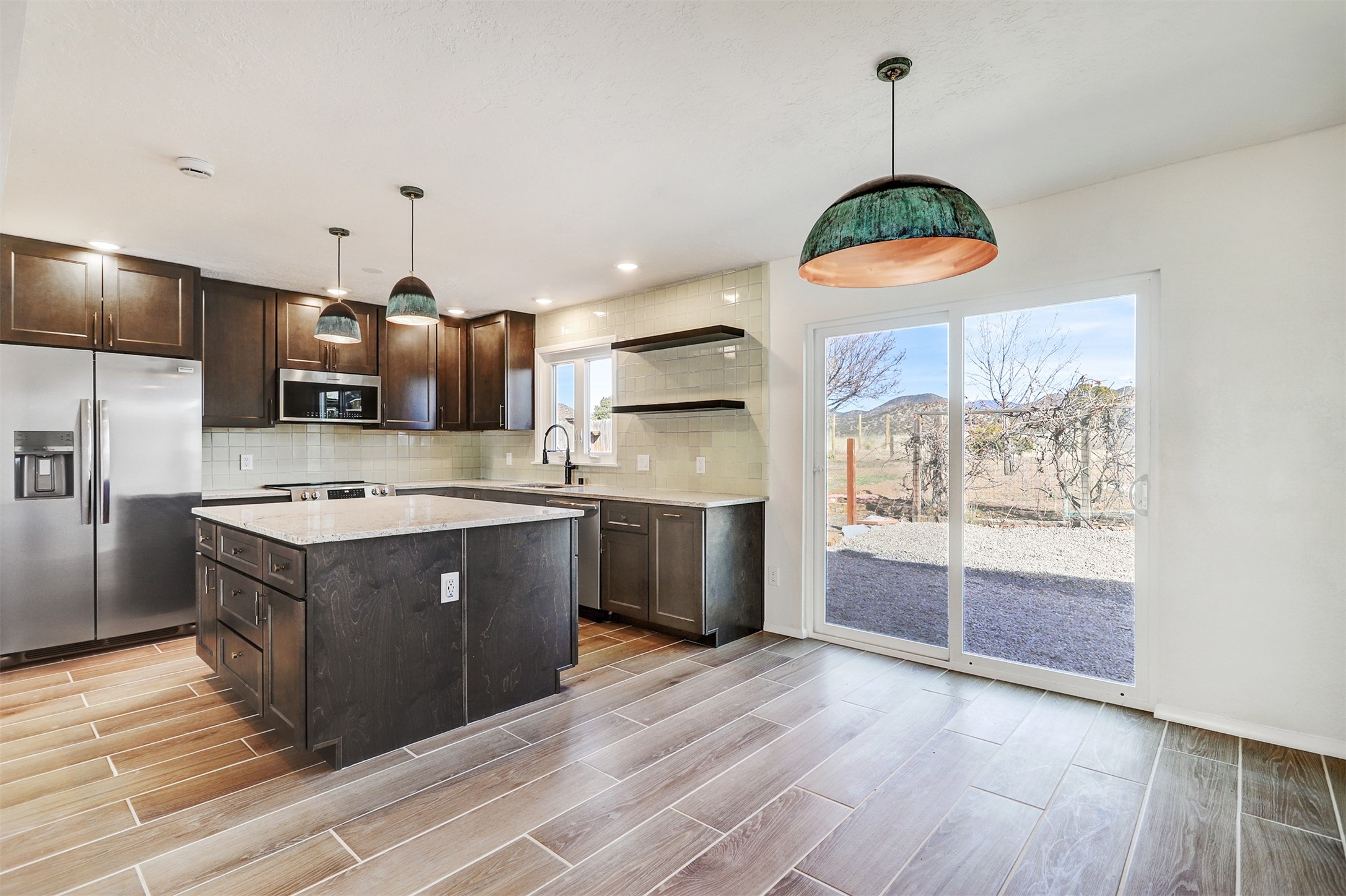 Step into this beautifully updated Eldorado home, where modern improvements blend seamlessly with classic Southwestern style. Completely move-in ready, the home offers comfortable indoor-outdoor living in one of Santa Fe's most sought-after communities. An open, light-filled floor plan welcomes you in, showcasing thoughtful updates and inviting spaces designed for everyday living. The remodeled kitchen serves as the heart of the home, featuring new cabinetry, new countertops, new stainless steel appliances, and a huge island--perfect for casual meals, entertaining, or gathering with family and friends. The living room is warm and welcoming, anchored by a traditional kiva fireplace that adds character and charm. Throughout the home, tasteful finishes, updated flooring, and custom lighting enhance the overall sense of comfort and cohesion. The bathrooms have been attractively updated. Generously sized bedrooms provide comfortable private spaces, while the flowing layout allows for easy movement between living areas. Recent upgrades provide convenience and peace of mind, including a new central downdraft swamp cooler, new water heater, serviced boiler, roof tune-up, brand-new septic tank, and new garage door. A professionally painted interior adds a fresh feel throughout. Outside, enjoy the peaceful setting Eldorado is known for, with space to relax and take in the surrounding natural beauty. Eldorado residents enjoy access to hiking and biking trails, art and cultural attractions, and a variety of dining and shopping options, with only a short drive to downtown Santa Fe. This well-maintained home offers a comfortable, stylish place to settle in and enjoy the relaxed Eldorado lifestyle.