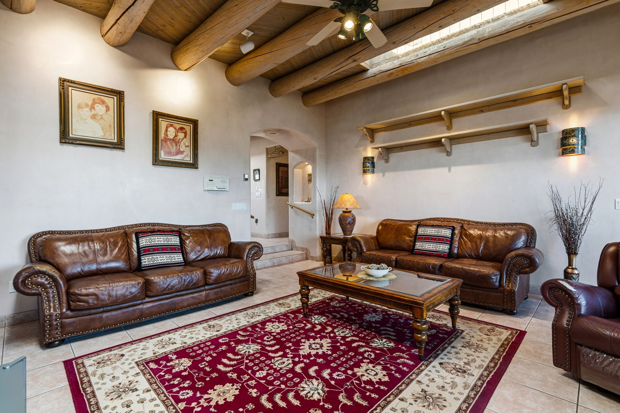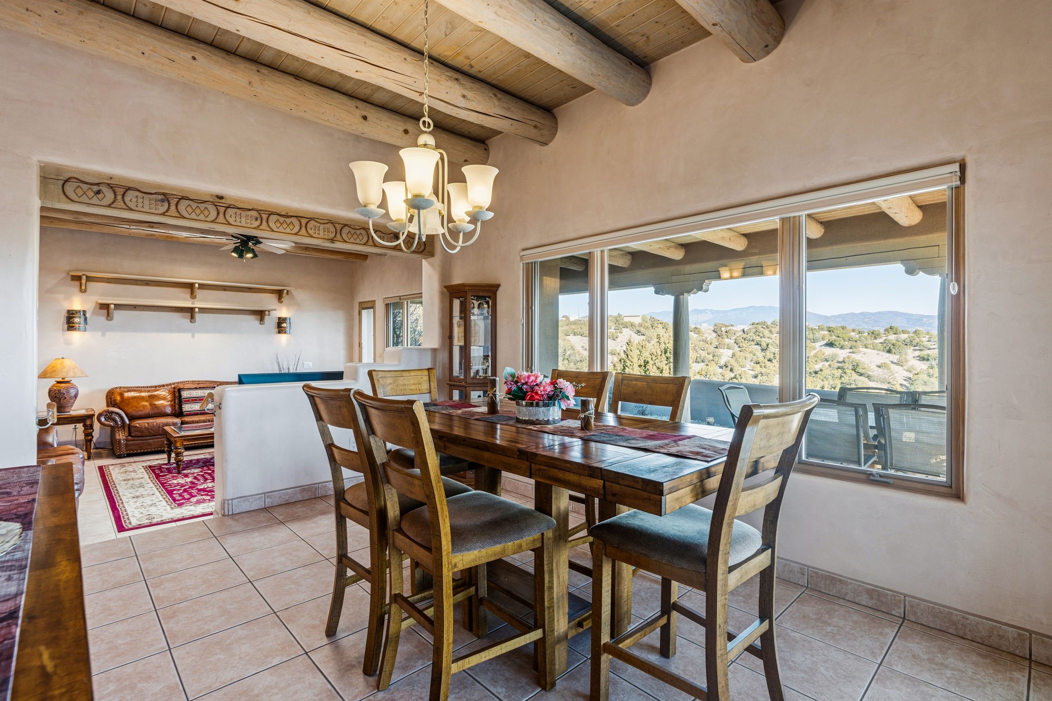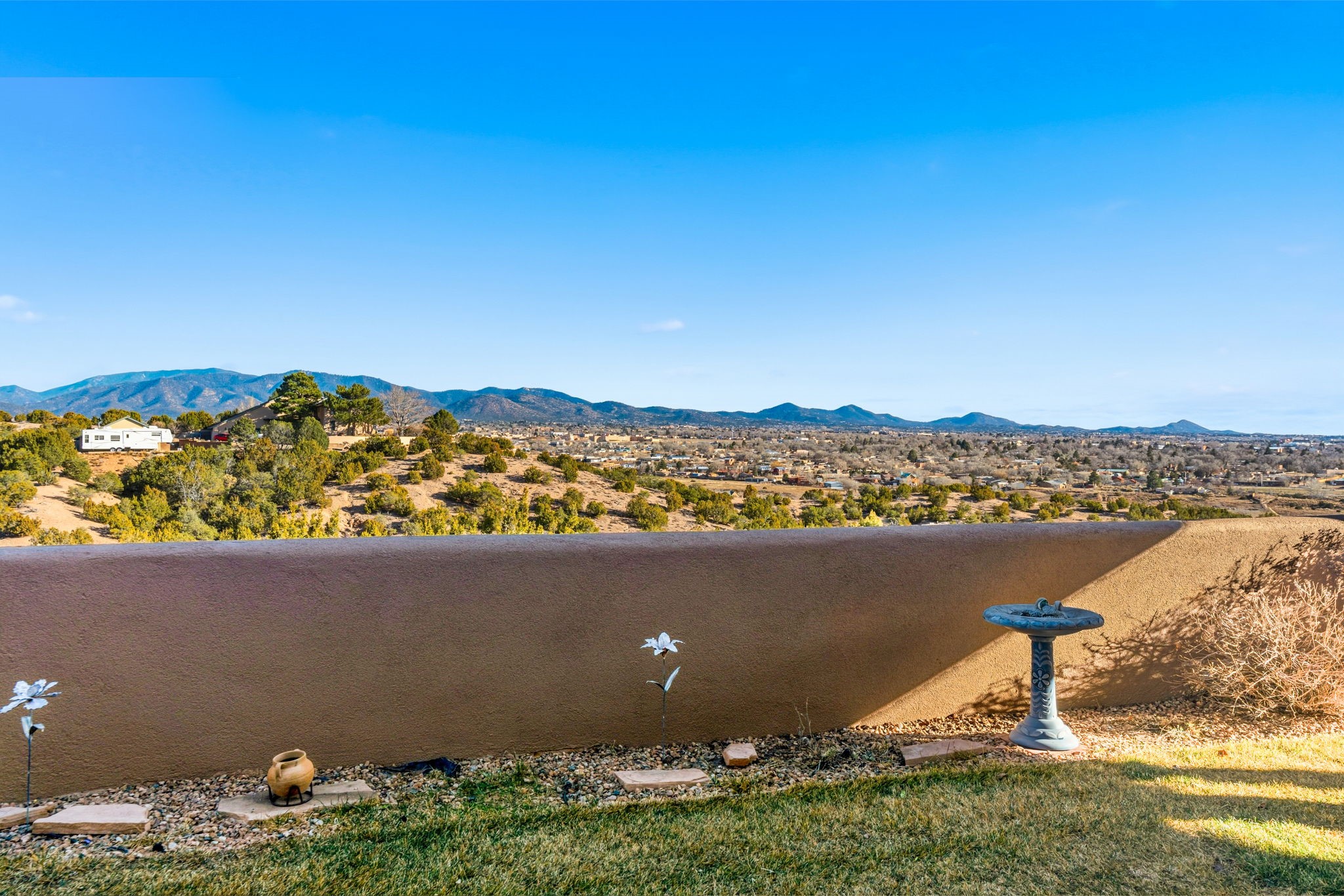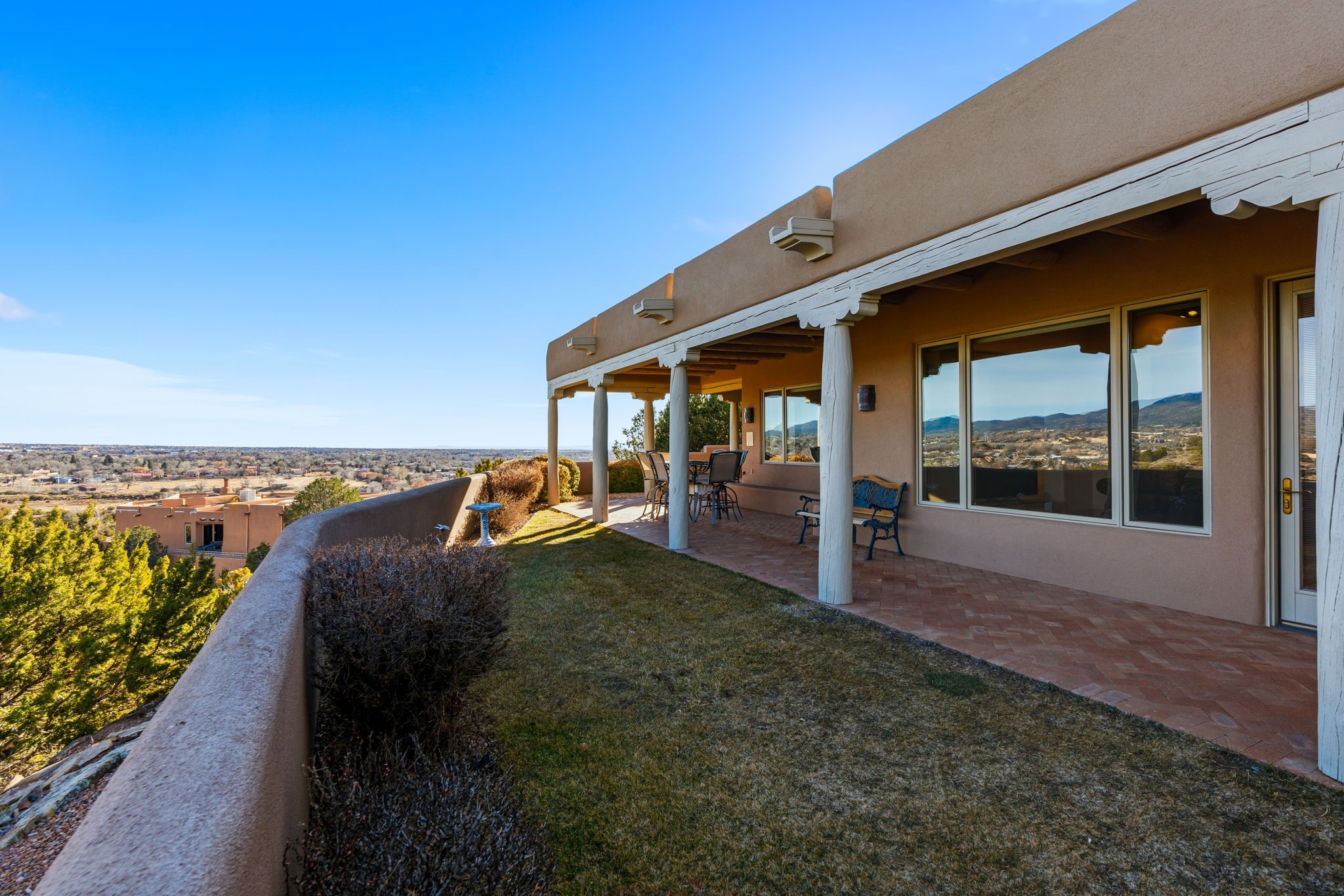 Perched atop a 1.51 acre ridgetop lot overlooking the sparkling lights of Santa Fe and views of the majestic Sangre de Cristo mountain range, this stunning Pueblo style residence captures the best of northern New Mexico living. Thoughtfully crafted with exquisite attention to detail and enhanced by recent upgrades, this 3-bedroom 2.5 bath home offers both timeless elegance and modern comfort. Step inside to discover diamond finish plastered interior walls, blue spruce tongue and groove ceilings with vigas, hand carved pine beams, and warm Italian tile floors that flow throughout the light filled interior. The spacious living room is graced by soaring 12-foot-high ceilings and a traditional kiva fireplace that opens to a formal dining room showcasing spectacular views. The chef's kitchen features custom maple cabinetry, built in appliances including a cooktop, oven and microwave, recessed lighting and Italian tile countertops is perfect for entertaining or quiet evenings at home. The primary suite offers serene privacy with dual sinks, a linen closet and a luxurious whirlpool tub while each closet in the house boasts custom built shelving. Distinctive architectural touches such as wood carved beams, lighted niches, copper wall sconces and pendants, solid brass bathroom fixtures, and knotty pine doors add rich texture and authenticity throughout. Enjoy the ambiance of two kiva fireplaces including one in the main living area and one on the covered outdoor patio. Outside, beautifully designed front and rear walled courtyards frame a fully landscaped yard accented with colorful shrubs, mature trees and lush grass nourished by a full sprinkler and drip irrigation system. Expansive covered brick porches provide the perfect space to relax and soak in sunset vistas. Additional highlights include new exterior stucco, aluminum wood clad Pella windows and exterior doors, a central radio and intercom system, custom wrought iron security screen doors, a new front gate, a finished and insulated 2 car garage with a cedar door, and numerous skylights that invite natural light into every space. Excellent midtown location in the highly sought after Sierra del Sol subdivision - an area of custom homes with paved roads and easy access to all of Santa Fe's amenities. From its refined craftsmanship to its breathtaking views, 817 Camino Vistas Encantada embodies the quintessential Santa Fe lifestyle - warm, inviting and undeniably enchanting.