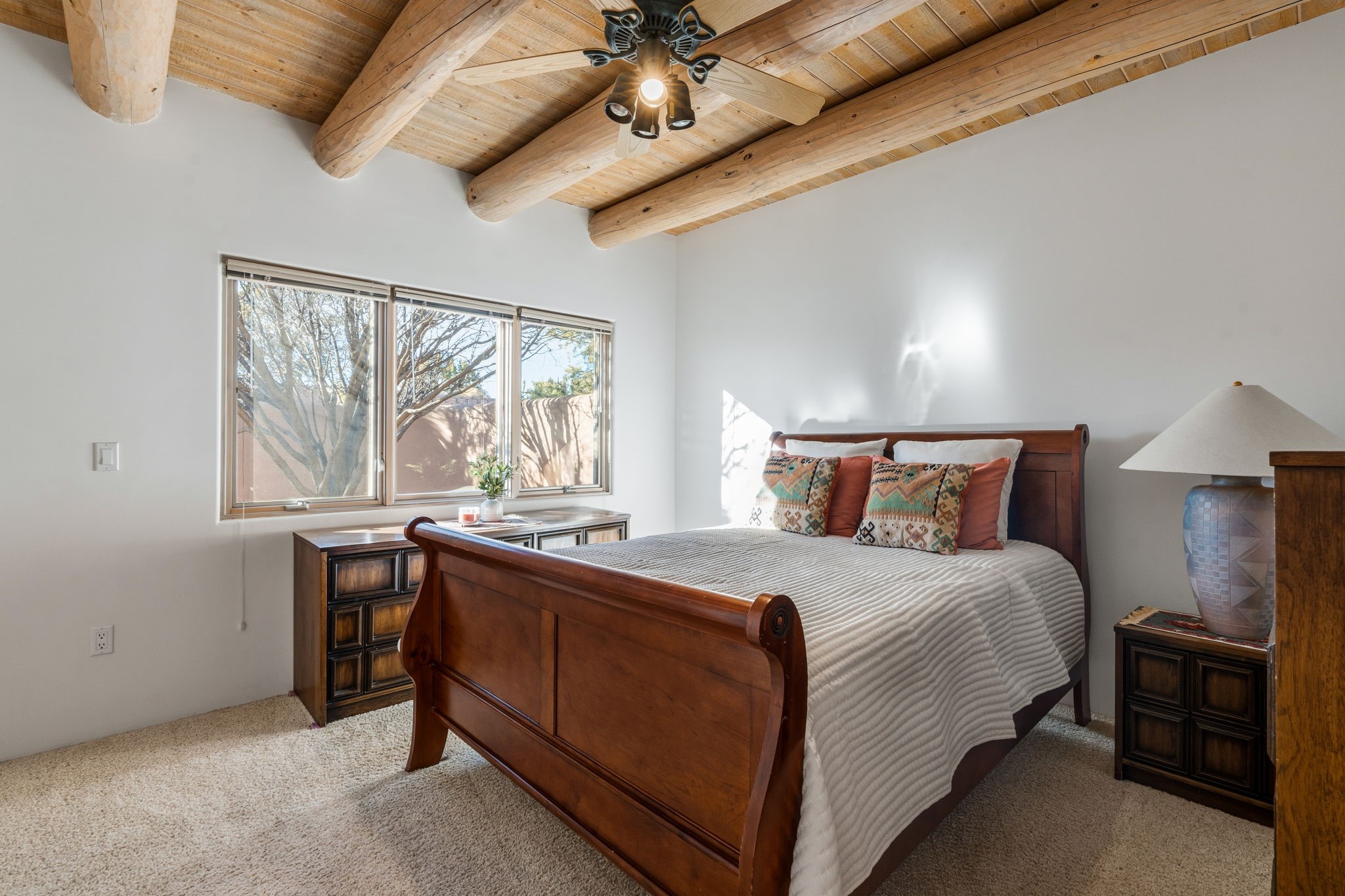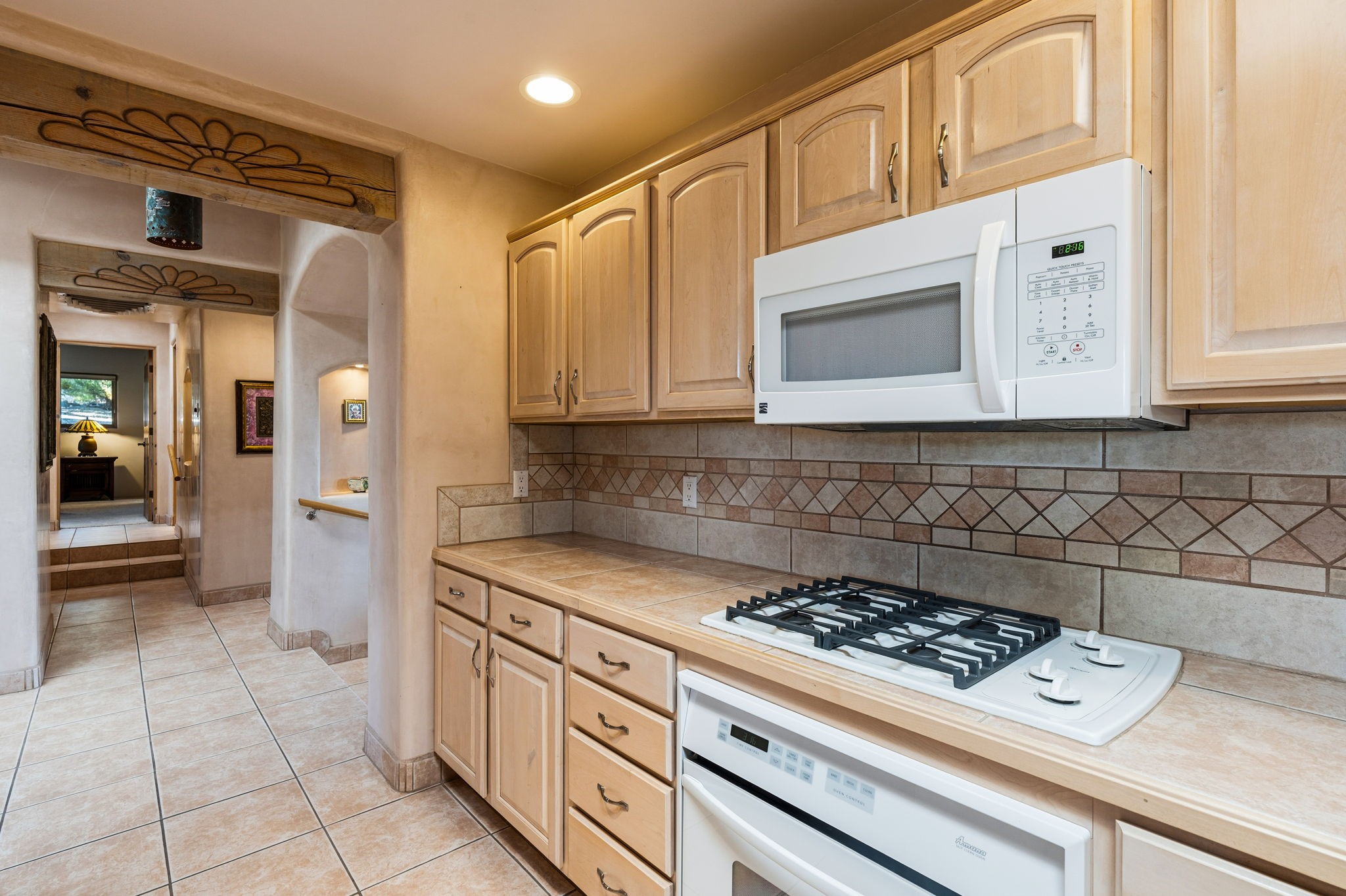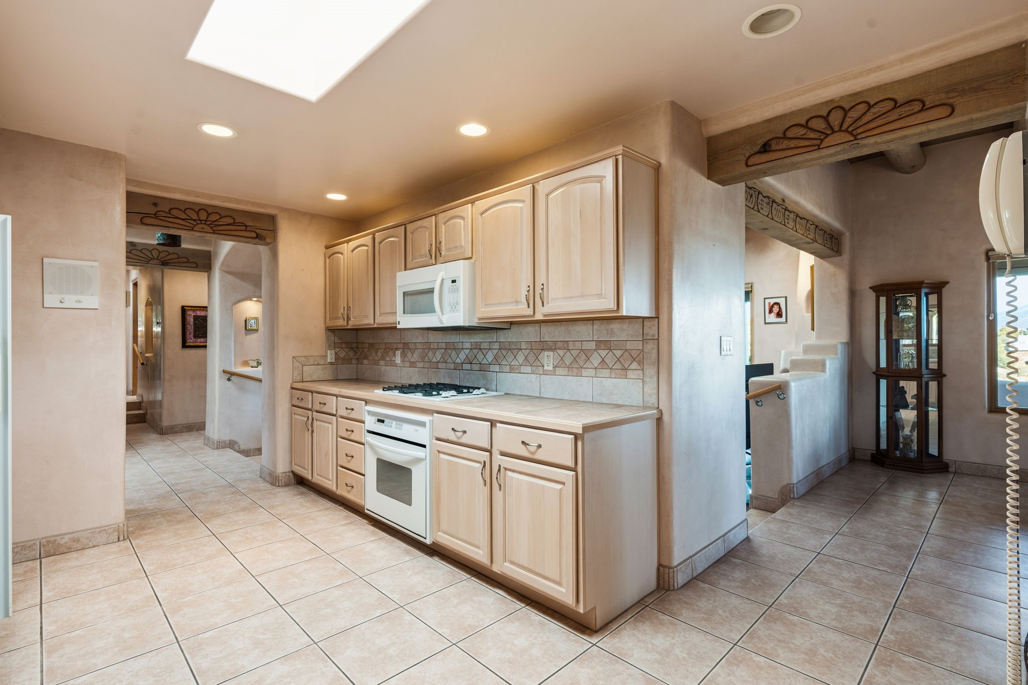 Perched atop a 1.51 acre ridgetop lot overlooking the sparkling lights of Santa Fe and views of the majestic Sangre de Cristo mountain range, this stunning Pueblo style residence captures the best of northern New Mexico living. Thoughtfully crafted with exquisite attention to detail and enhanced by recent upgrades, this 3-bedroom 2.5 bath home offers both timeless elegance and modern comfort. Step inside to discover diamond finish plastered interior walls, blue spruce tongue and groove ceilings with vigas, hand carved pine beams, and warm Italian tile floors that flow throughout the light filled interior. The spacious living room is graced by soaring 12-foot-high ceilings and a traditional kiva fireplace that opens to a formal dining room showcasing spectacular views. The chef's kitchen features custom maple cabinetry, built in appliances including a cooktop, oven and microwave, recessed lighting and Italian tile countertops is perfect for entertaining or quiet evenings at home. The primary suite offers serene privacy with dual sinks, a linen closet and a luxurious whirlpool tub while each closet in the house boasts custom built shelving. Distinctive architectural touches such as wood carved beams, lighted niches, copper wall sconces and pendants, solid brass bathroom fixtures, and knotty pine doors add rich texture and authenticity throughout. Enjoy the ambiance of two kiva fireplaces including one in the main living area and one on the covered outdoor patio. Outside, beautifully designed front and rear walled courtyards frame a fully landscaped yard accented with colorful shrubs, mature trees and lush grass nourished by a full sprinkler and drip irrigation system. Expansive covered brick porches provide the perfect space to relax and soak in sunset vistas. Additional highlights include new exterior stucco, aluminum wood clad Pella windows and exterior doors, a central radio and intercom system, custom wrought iron security screen doors, a new front gate, a finished and insulated 2 car garage with a cedar door, and numerous skylights that invite natural light into every space. Excellent midtown location in the highly sought after Sierra del Sol subdivision - an area of custom homes with paved roads and easy access to all of Santa Fe's amenities. From its refined craftsmanship to its breathtaking views, 817 Camino Vistas Encantada embodies the quintessential Santa Fe lifestyle - warm, inviting and undeniably enchanting.
