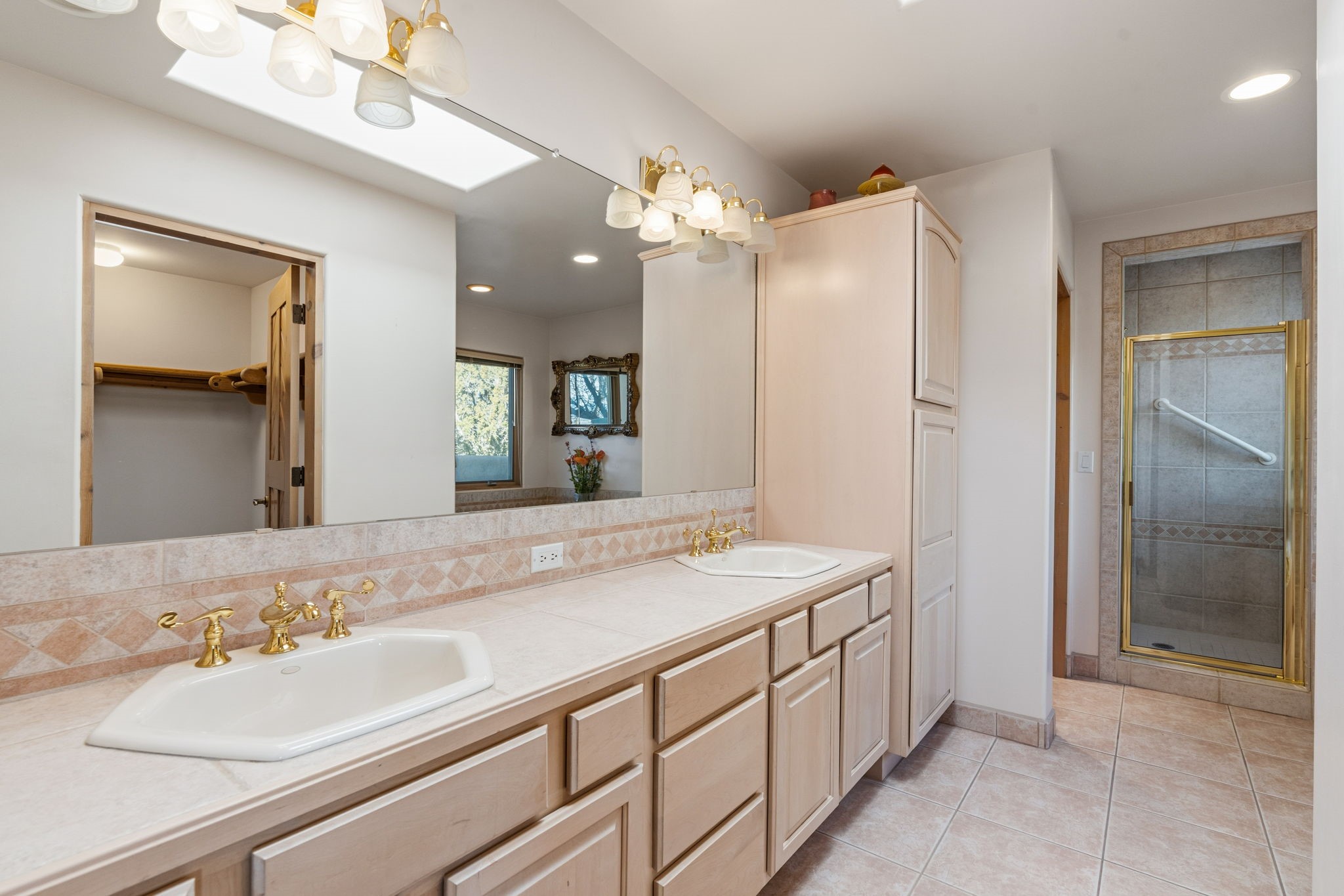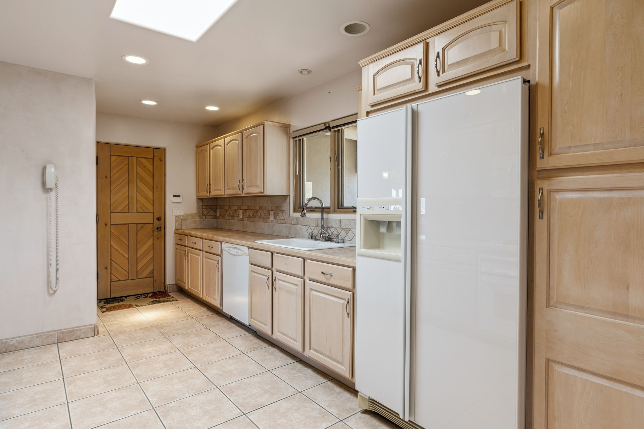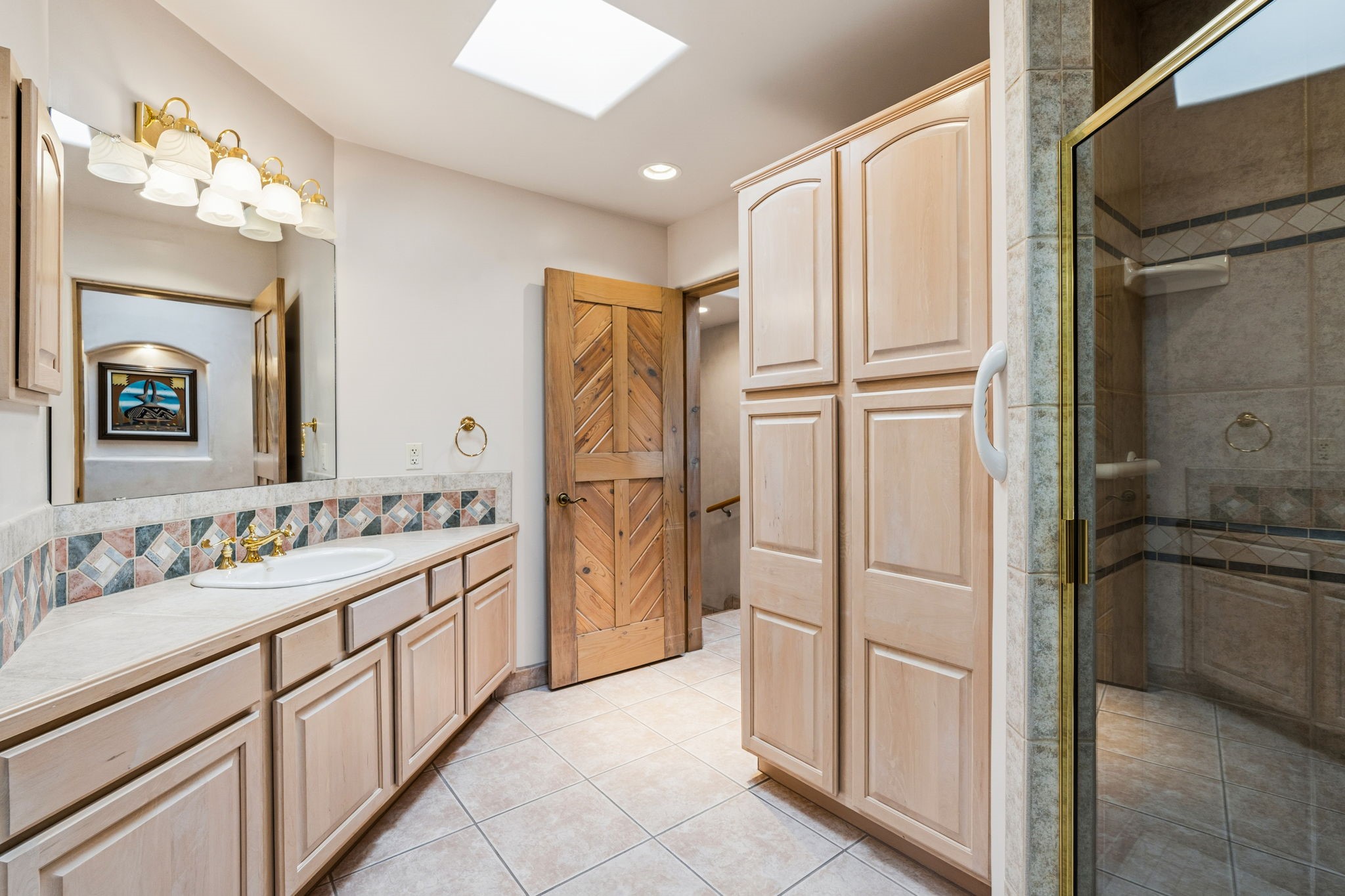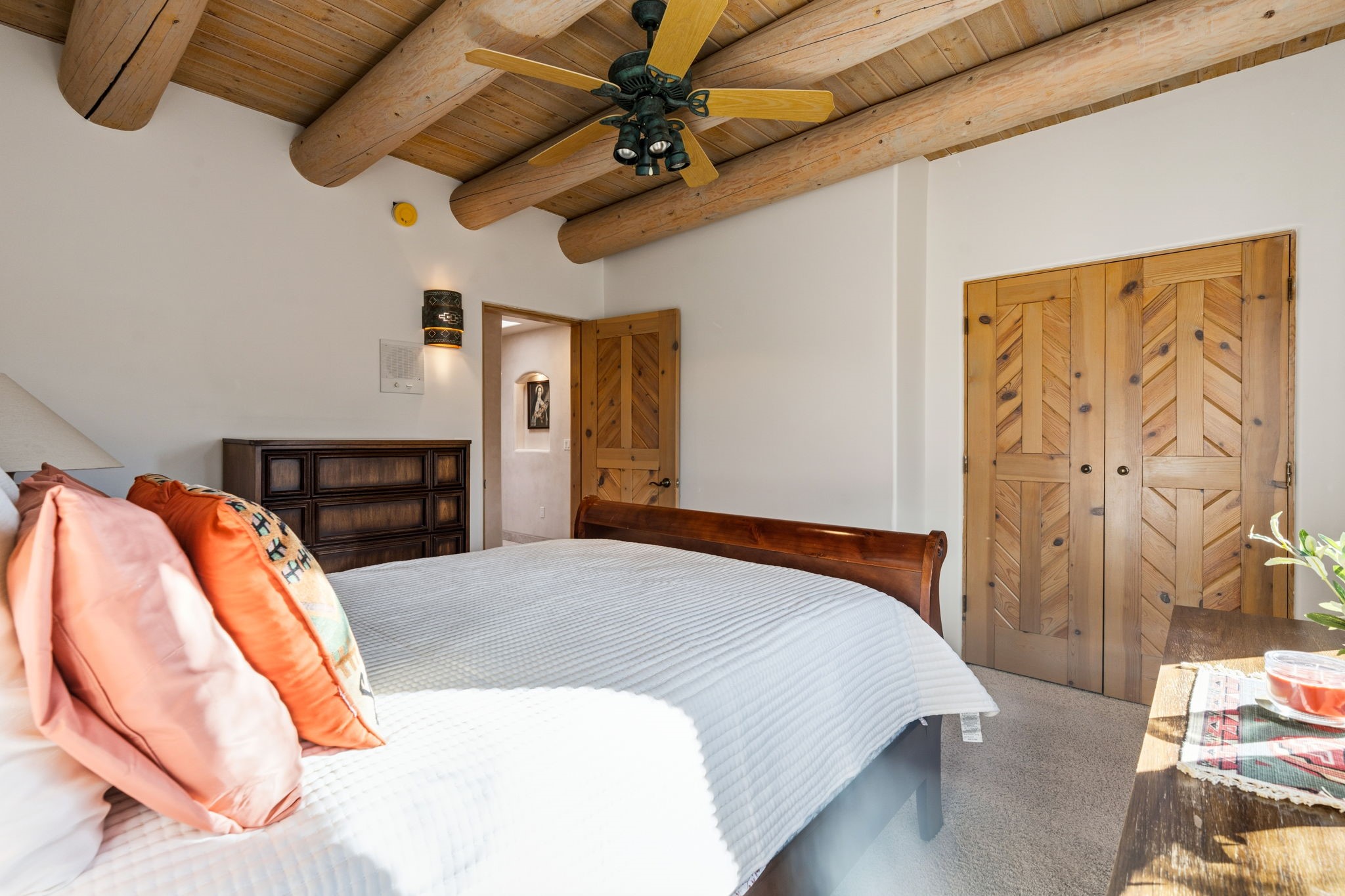Perched atop a 1.51 acre ridgetop lot overlooking the sparkling lights of Santa Fe and views of the majestic Sangre de Cristo mountain range, this stunning Pueblo style residence captures the best of northern New Mexico living. Thoughtfully crafted with exquisite attention to detail and enhanced by recent upgrades, this 3-bedroom 2.5 bath home offers both timeless elegance and modern comfort. Step inside to discover diamond finish plastered interior walls, blue spruce tongue and groove ceilings with vigas, hand carved pine beams, and warm Italian tile floors that flow throughout the light filled interior. The spacious living room is graced by soaring 12-foot-high ceilings and a traditional kiva fireplace that opens to a formal dining room showcasing spectacular views. The chef's kitchen features custom maple cabinetry, built in appliances including a cooktop, oven and microwave, recessed lighting and Italian tile countertops is perfect for entertaining or quiet evenings at home. The primary suite offers serene privacy with dual sinks, a linen closet and a luxurious whirlpool tub while each closet in the house boasts custom built shelving. Distinctive architectural touches such as wood carved beams, lighted niches, copper wall sconces and pendants, solid brass bathroom fixtures, and knotty pine doors add rich texture and authenticity throughout. Enjoy the ambiance of two kiva fireplaces including one in the main living area and one on the covered outdoor patio. Outside, beautifully designed front and rear walled courtyards frame a fully landscaped yard accented with colorful shrubs, mature trees and lush grass nourished by a full sprinkler and drip irrigation system. Expansive covered brick porches provide the perfect space to relax and soak in sunset vistas. Additional highlights include new exterior stucco, aluminum wood clad Pella windows and exterior doors, a central radio and intercom system, custom wrought iron security screen doors, a new front gate, a finished and insulated 2 car garage with a cedar door, and numerous skylights that invite natural light into every space. Excellent midtown location in the highly sought after Sierra del Sol subdivision - an area of custom homes with paved roads and easy access to all of Santa Fe's amenities. From its refined craftsmanship to its breathtaking views, 817 Camino Vistas Encantada embodies the quintessential Santa Fe lifestyle - warm, inviting and undeniably enchanting.