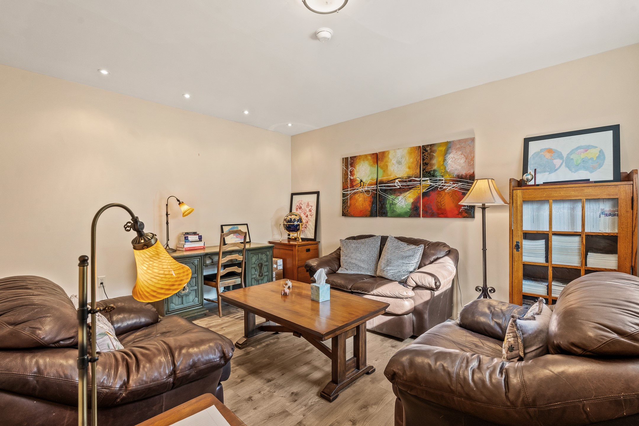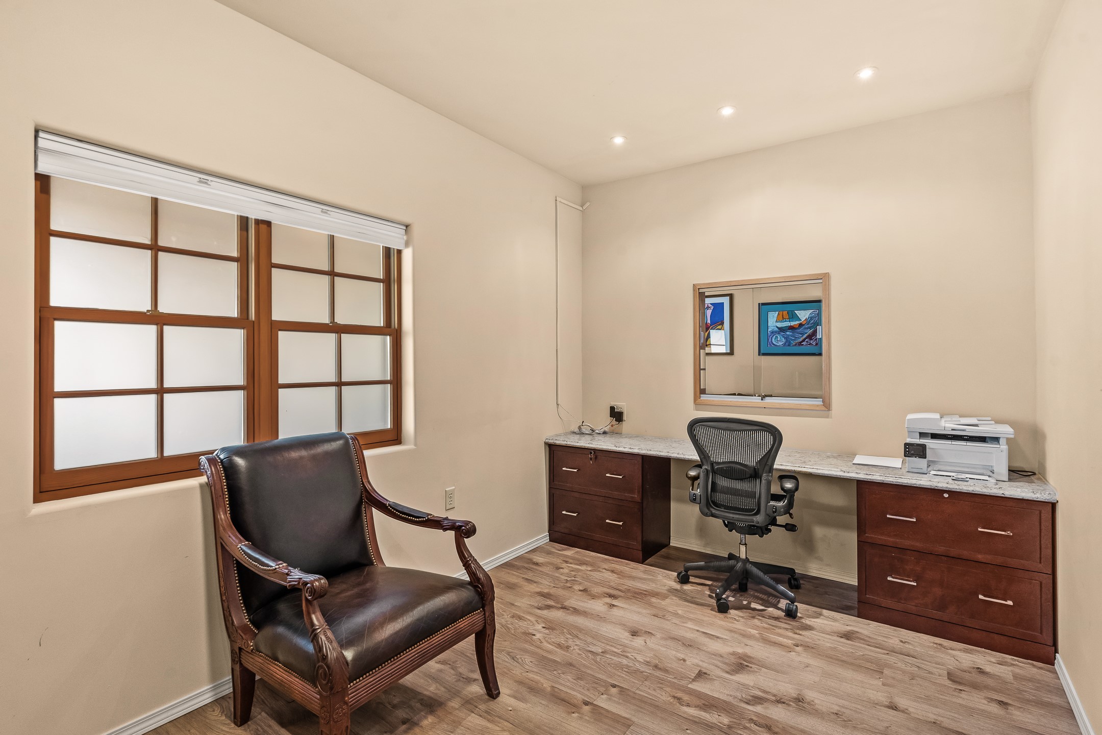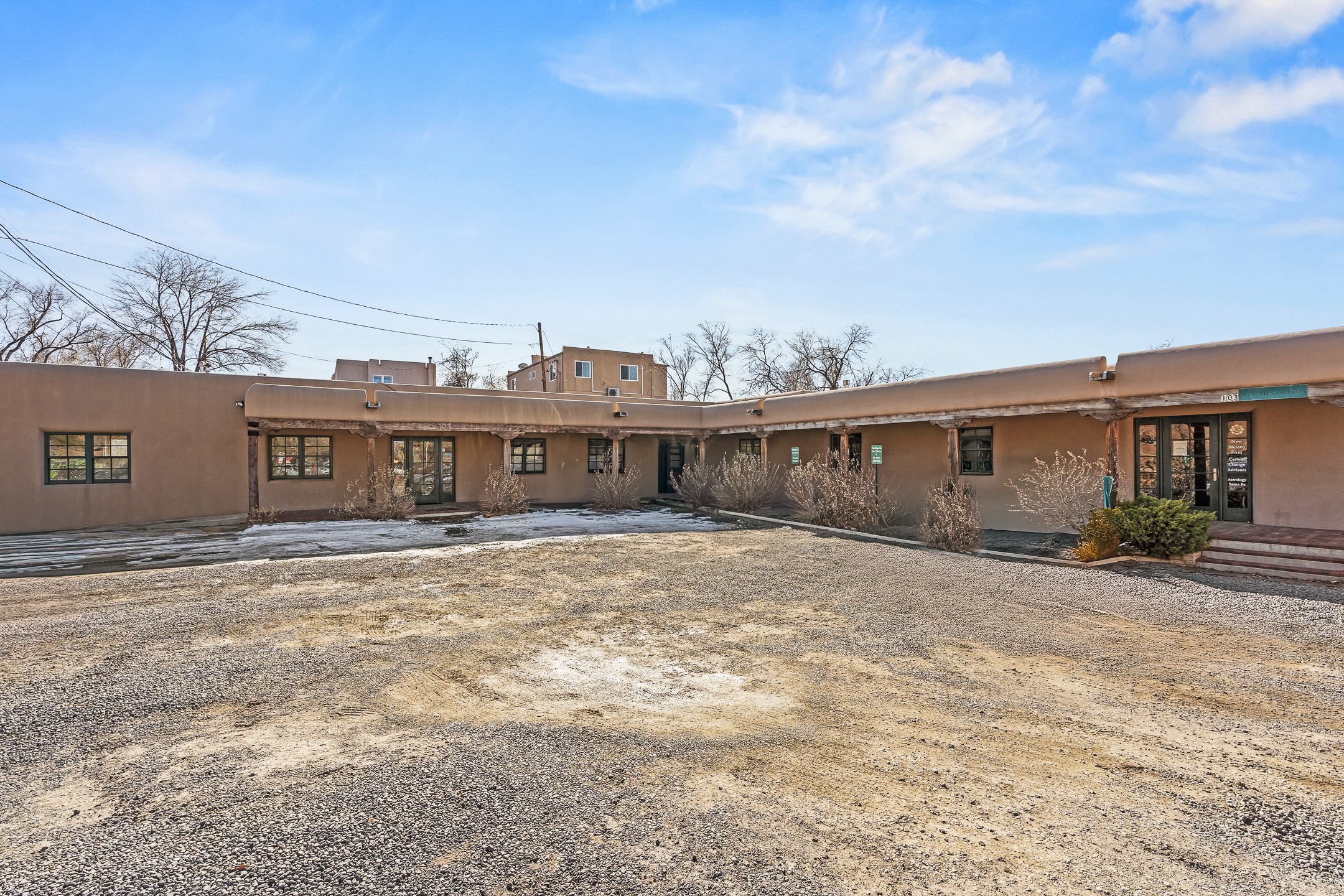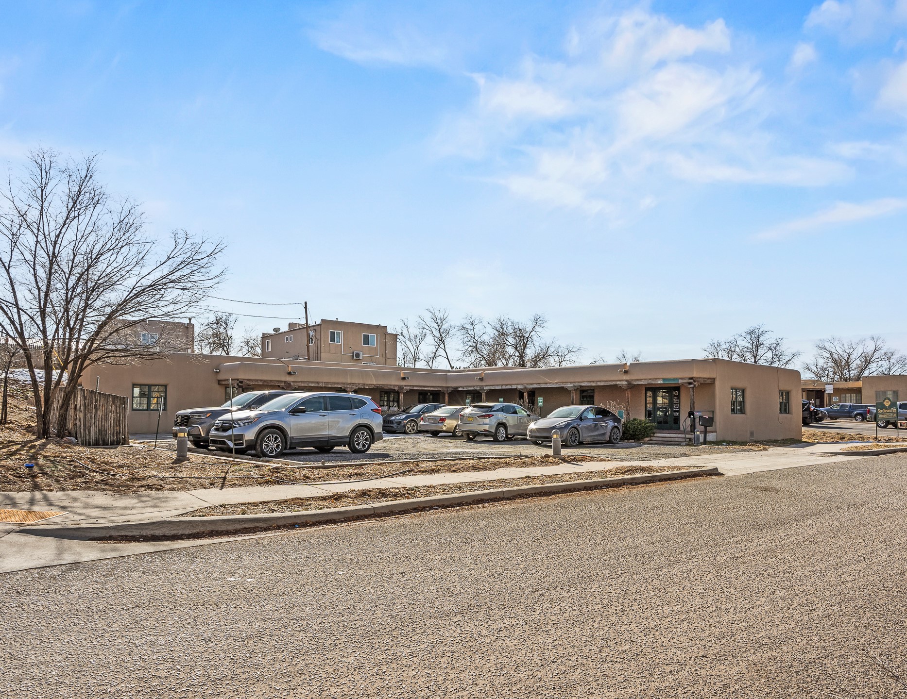Discover a rare opportunity to own a professional office condo in one of Santa Fe's most convenient and high-traffic locations, along the Santa Fe River and just moments from the intersection of St. Francis Drive and West Alameda. This middle unit, in a three-unit complex, is filled with natural light from multiple windows, creating a bright, welcoming environment for clients and staff alike. The flexible floor plan easily accommodates four private offices plus a reception area, making it ideal for businesses such as medical, legal, therapy, healing arts, or general professional use. The space also includes a kitchenette, private bathroom, and charming covered brick walkways that enhance both curb appeal and accessibility. Parking is a major asset here, with 11 total spaces in the complex and three of which are designated for Unit B, one ADA space for shared use, and an additional shared space for all three units. Enjoy exceptional proximity to DeVargas Center and easy access to Santa Fe's main traffic corridors: St. Francis Drive, Cerrillos Road, Alameda, and Paseo de Peralta, ensuring strong visibility and convenience for clients coming from any direction.